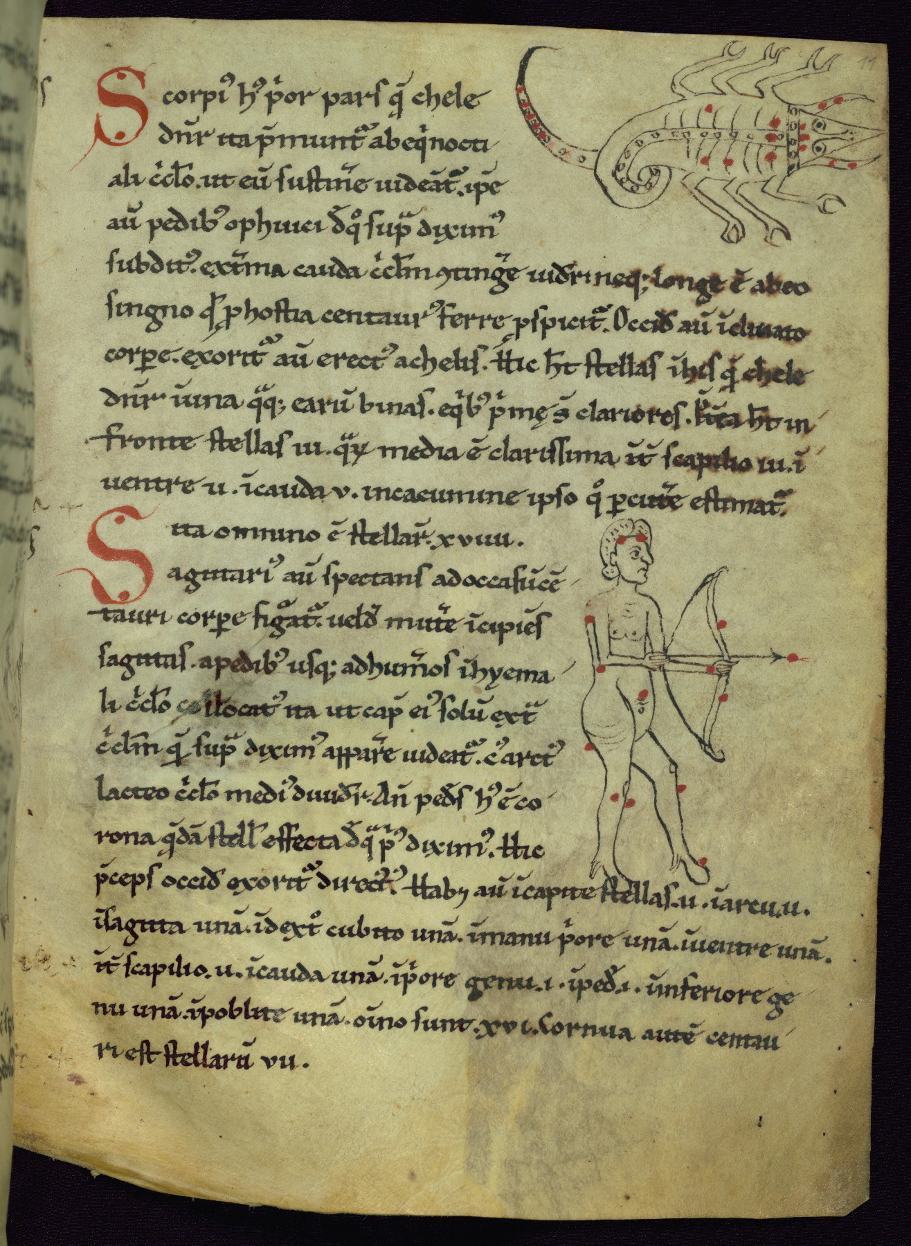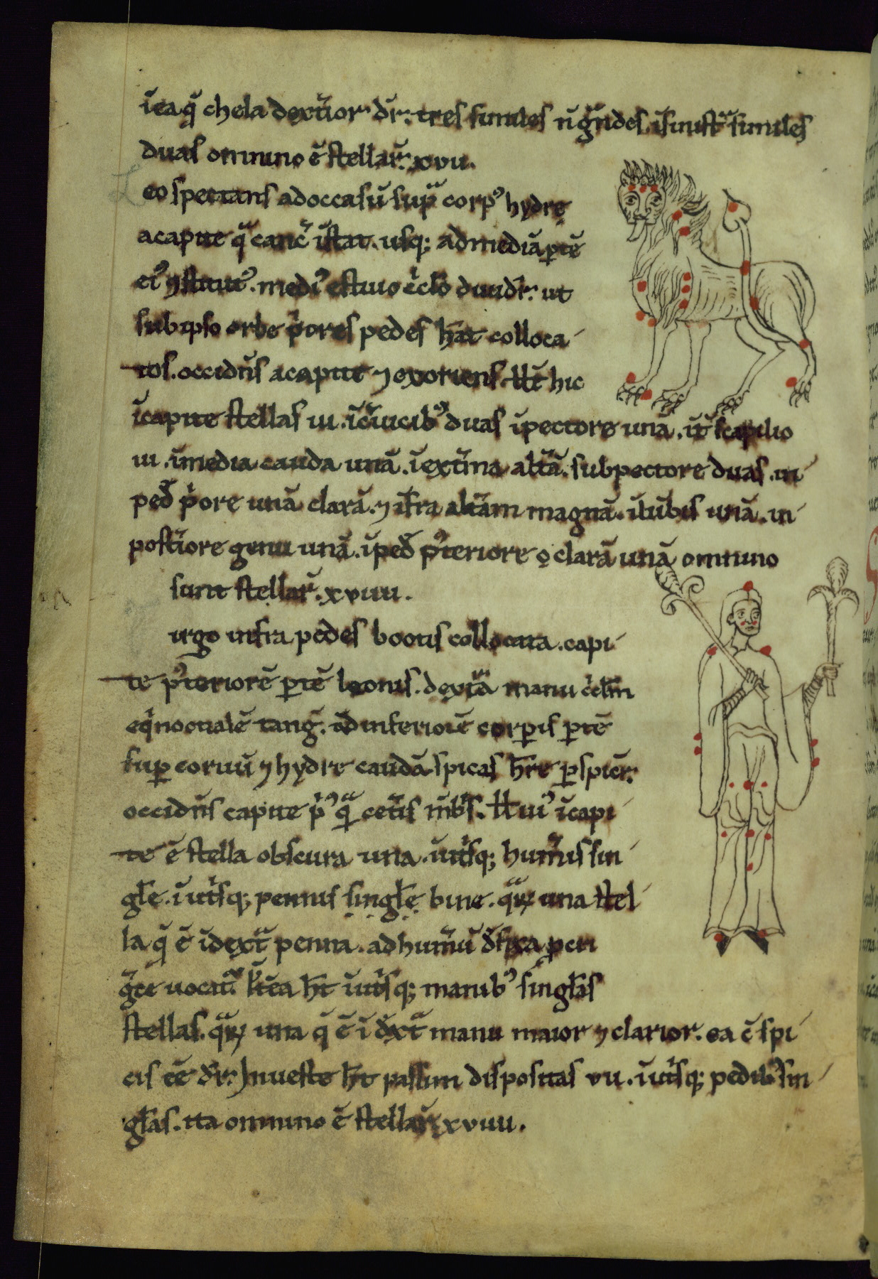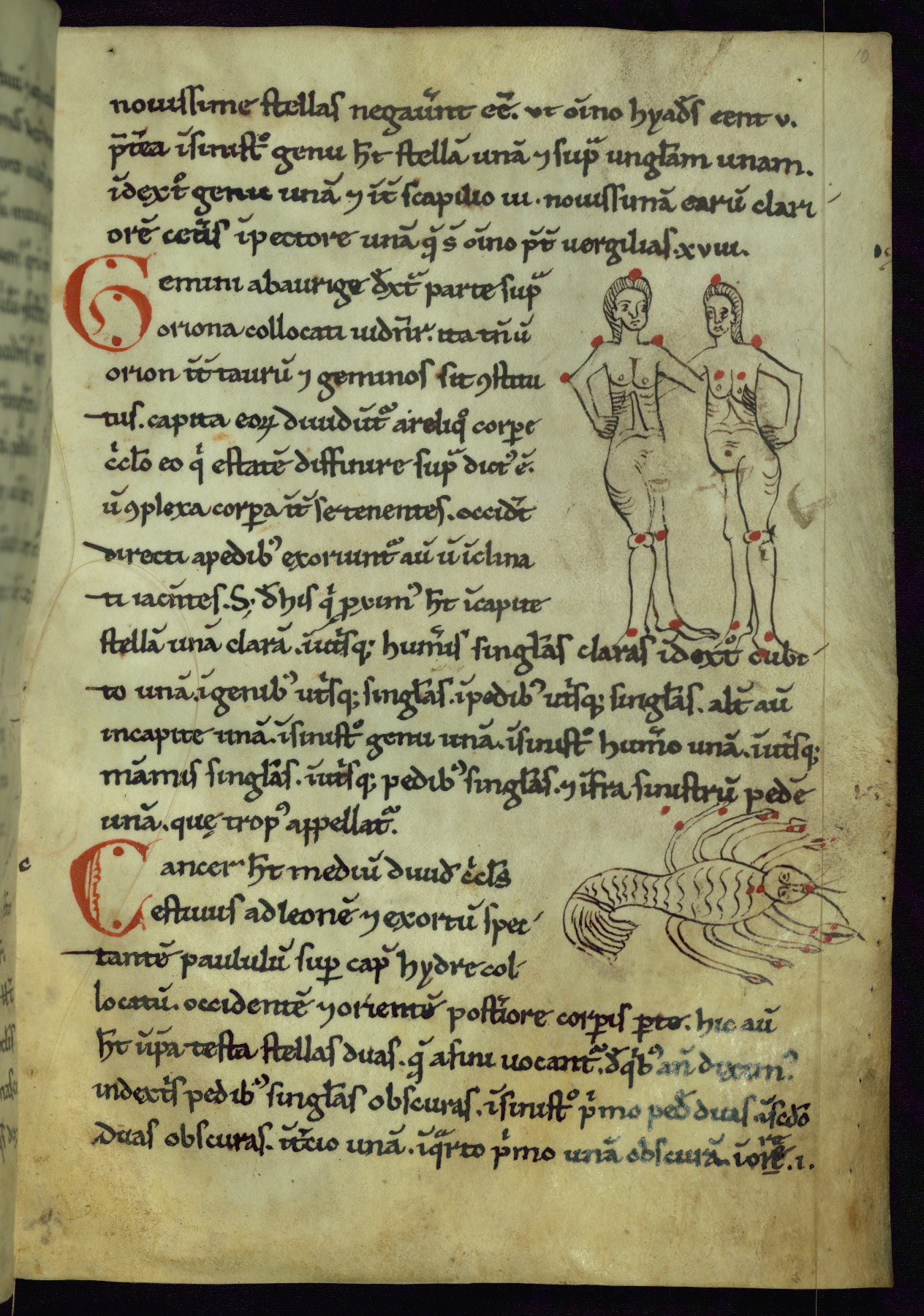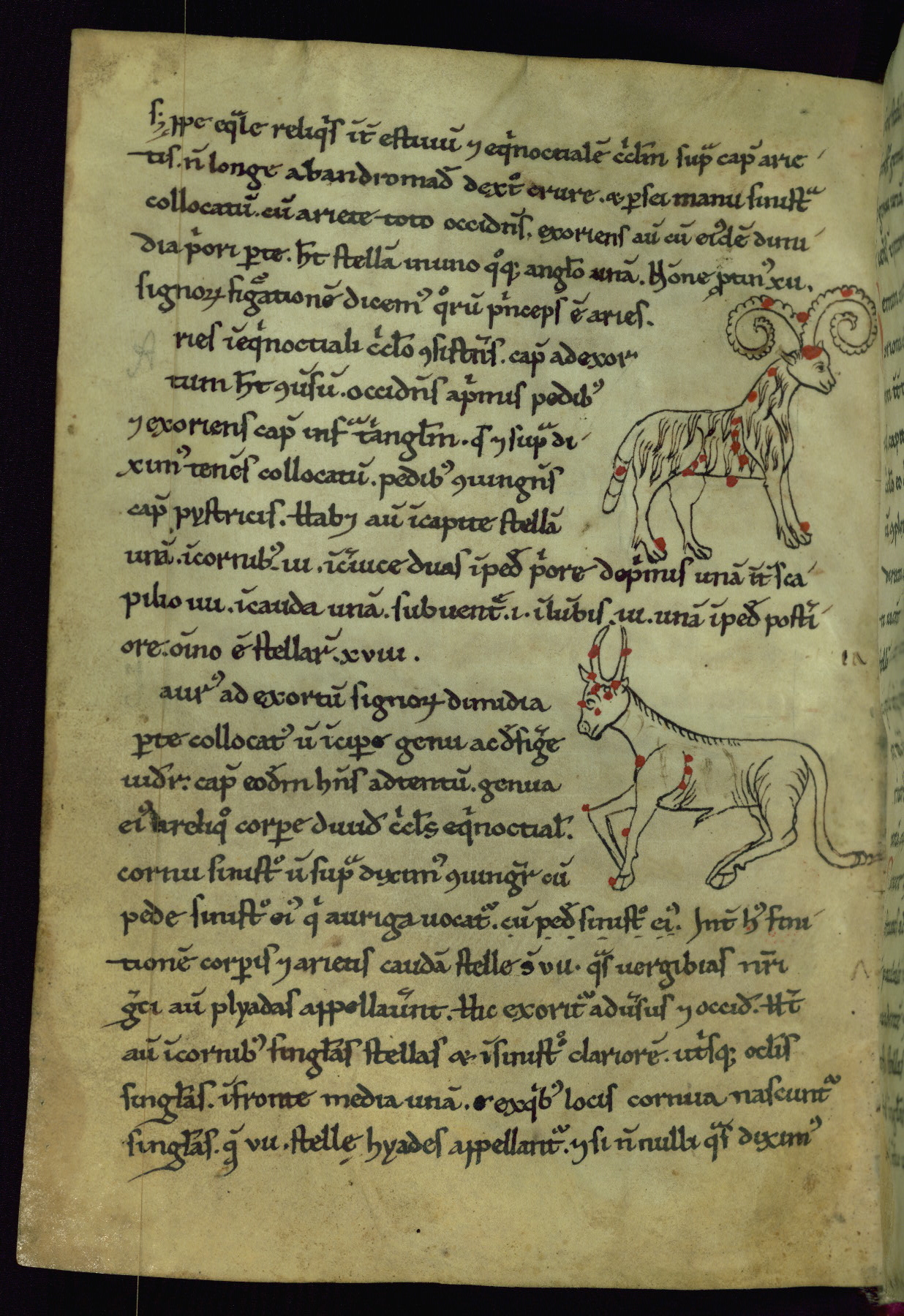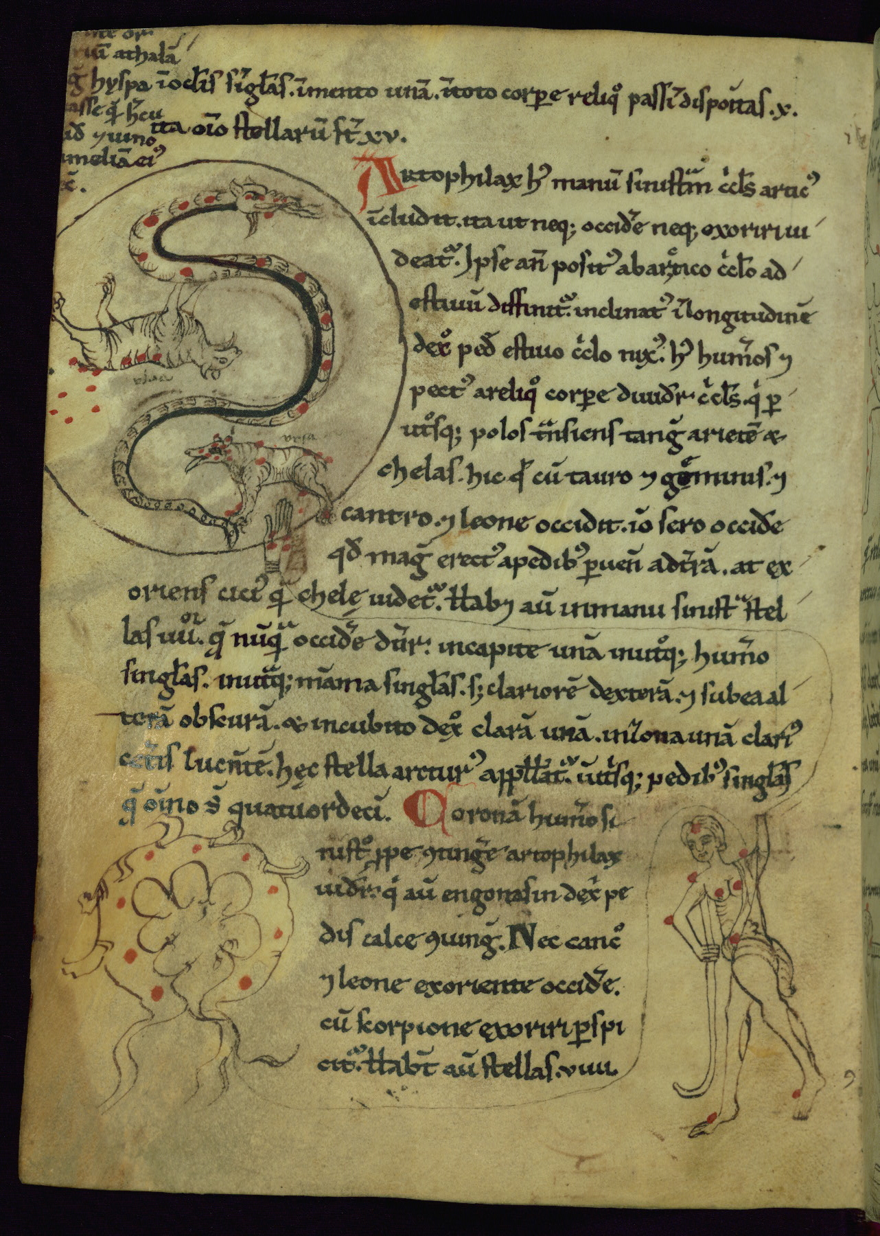 This manuscript, W. 734, is a thirteenth-century copy of an astronomical treatise, Astronomica, attributed to the first century Roman scholar Gaius Julius Hyginus. There is some question as to whether or not the unpolished Latin prose of the Astronomica was in fact by the learned scholar Hyginus. Regardless, this text was in circulation in western Europe along with other astronomical and astrological works by the ninth century. Illustrated Carolingian versions of the texts often faithfully imitated classical models in both style and detail. No illustrated Carolingian examples of Hyginus still survive, however a manuscript of Hyginus from 988 by Ademar, a monk at Saint-Martial of Limoges, seems to be faithfully copied from a Carolingian model. The most distinctive feature of the iconography of W.734 is the miniature of the two stars of Cancer, the “Aselli,” drinking from a trough. This image type recalls a very small collection of ninth century manuscripts (cf. Madrid Bibl. Nacional, cod. 3307) dating between ca. 820-828, and W.734 is reminiscent of Carolingian style as well. The text of the Astronomica itself addresses various cosmographical topics including the Earth and the spheres, the mythological legends connected with the constellations, the planets, the arrangement of the stars in the constellations, the circles of the celestial sphere and the movements of the planets, the sun and the moon, and their appearance. This copy likely dates to ca. 1200, however pinpointing its place of creation has proven more complicated, with its parchment and script having been linked to Italy, while France or Spain have also been suggested as a place of origin.