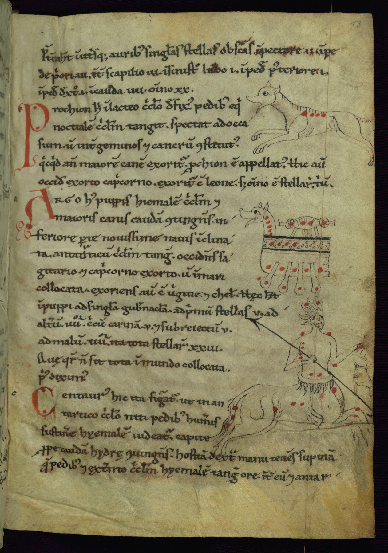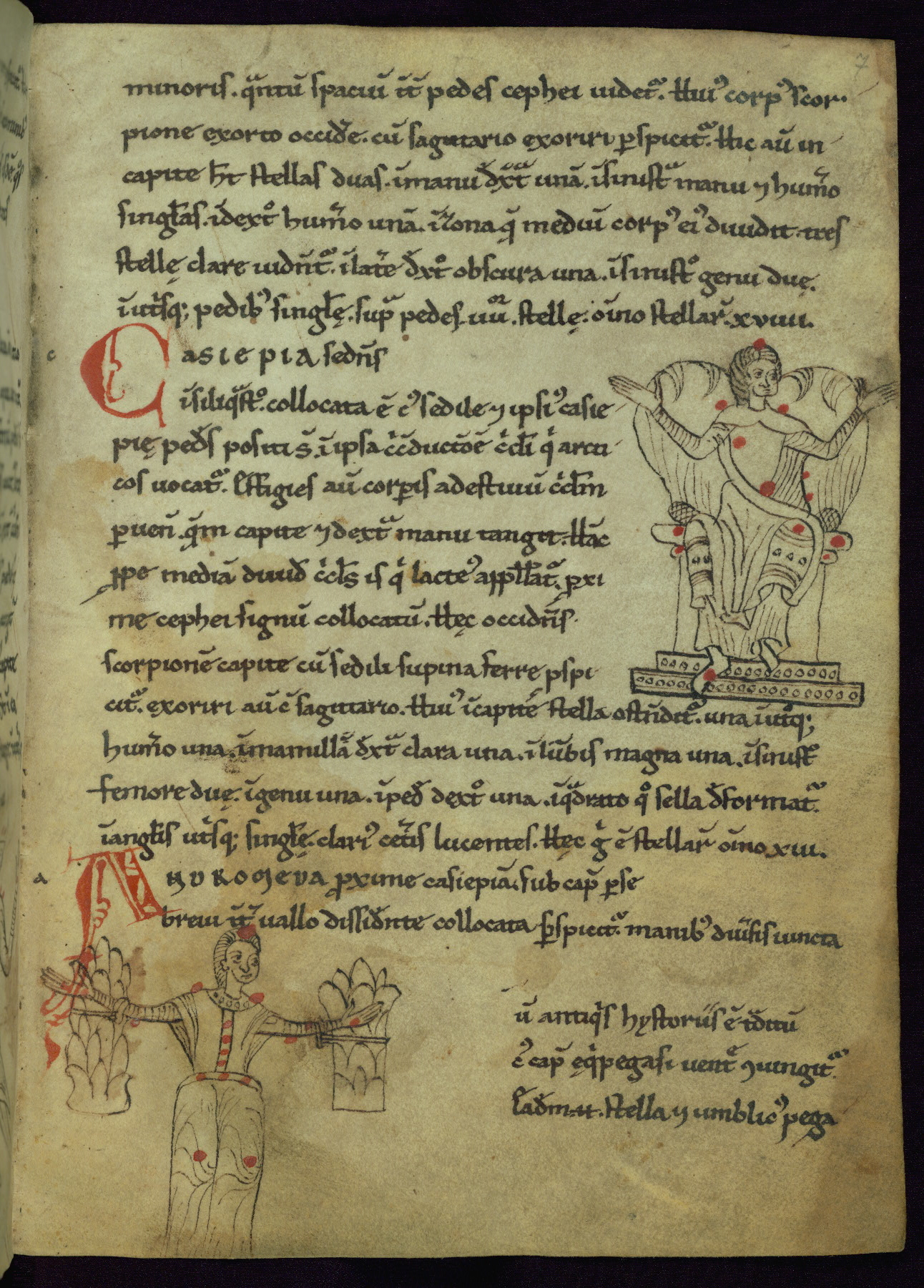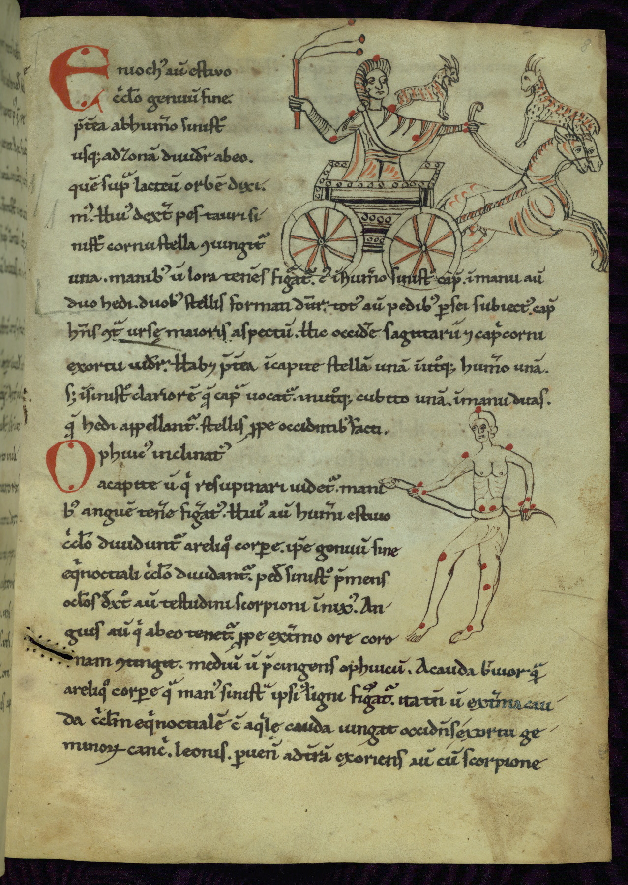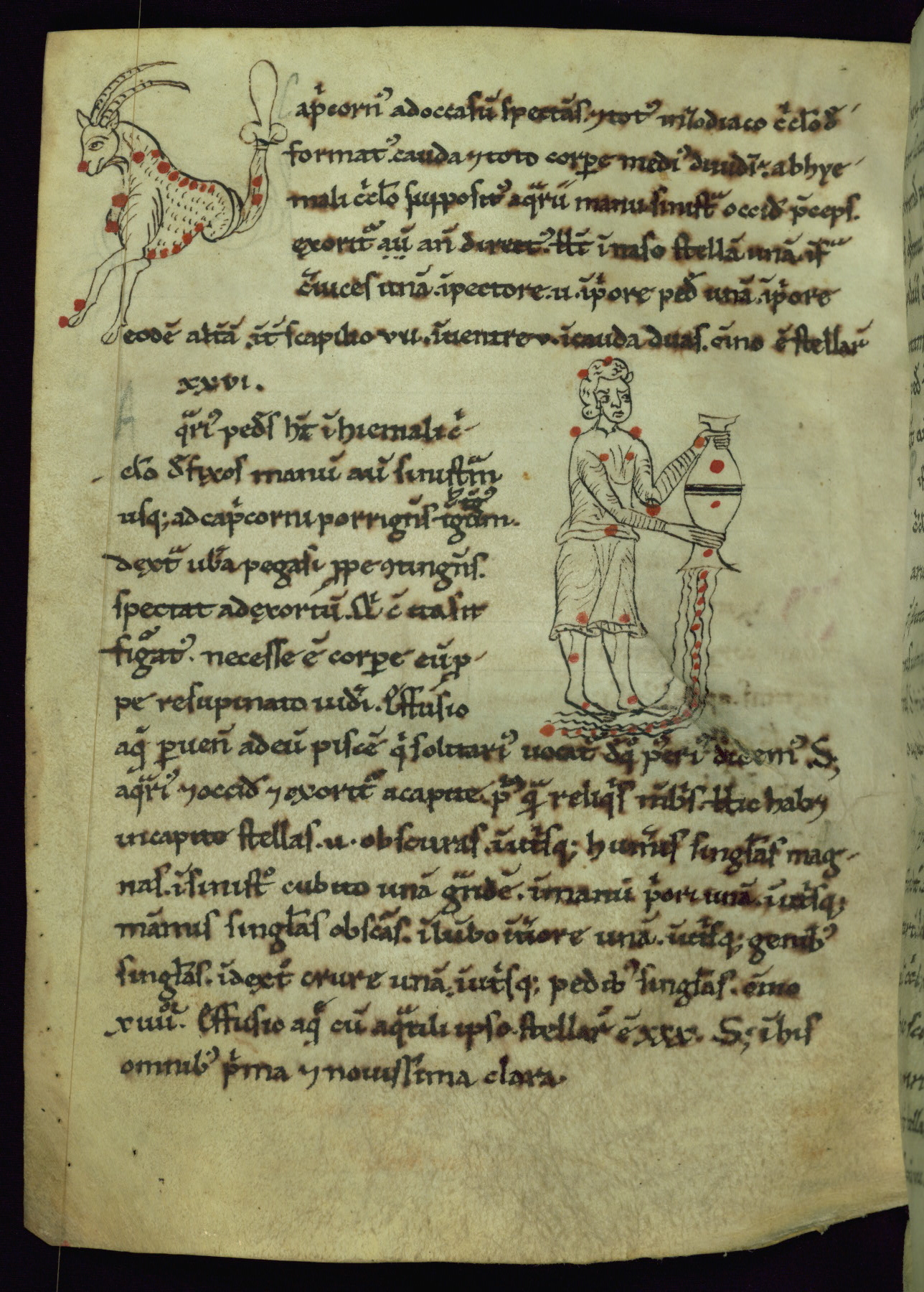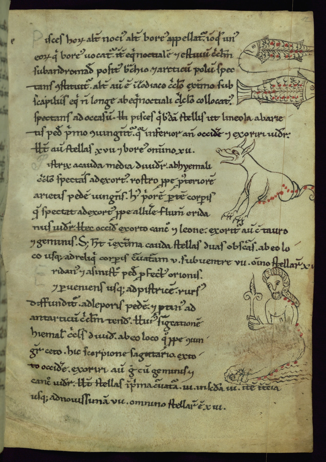 This manuscript, W. 734, is a thirteenth-century copy of an astronomical treatise, Astronomica, attributed to the first century Roman scholar Gaius Julius Hyginus. There is some question as to whether or not the unpolished Latin prose of the Astronomica was in fact by the learned scholar Hyginus. Regardless, this text was in circulation in western Europe along with other astronomical and astrological works by the ninth century. Illustrated Carolingian versions of the texts often faithfully imitated classical models in both style and detail. No illustrated Carolingian examples of Hyginus still survive, however a manuscript of Hyginus from 988 by Ademar, a monk at Saint-Martial of Limoges, seems to be faithfully copied from a Carolingian model. The most distinctive feature of the iconography of W.734 is the miniature of the two stars of Cancer, the “Aselli,” drinking from a trough. This image type recalls a very small collection of ninth century manuscripts (cf. Madrid Bibl. Nacional, cod. 3307) dating between ca. 820-828, and W.734 is reminiscent of Carolingian style as well. The text of the Astronomica itself addresses various cosmographical topics including the Earth and the spheres, the mythological legends connected with the constellations, the planets, the arrangement of the stars in the constellations, the circles of the celestial sphere and the movements of the planets, the sun and the moon, and their appearance. This copy likely dates to ca. 1200, however pinpointing its place of creation has proven more complicated, with its parchment and script having been linked to Italy, while France or Spain have also been suggested as a place of origin.