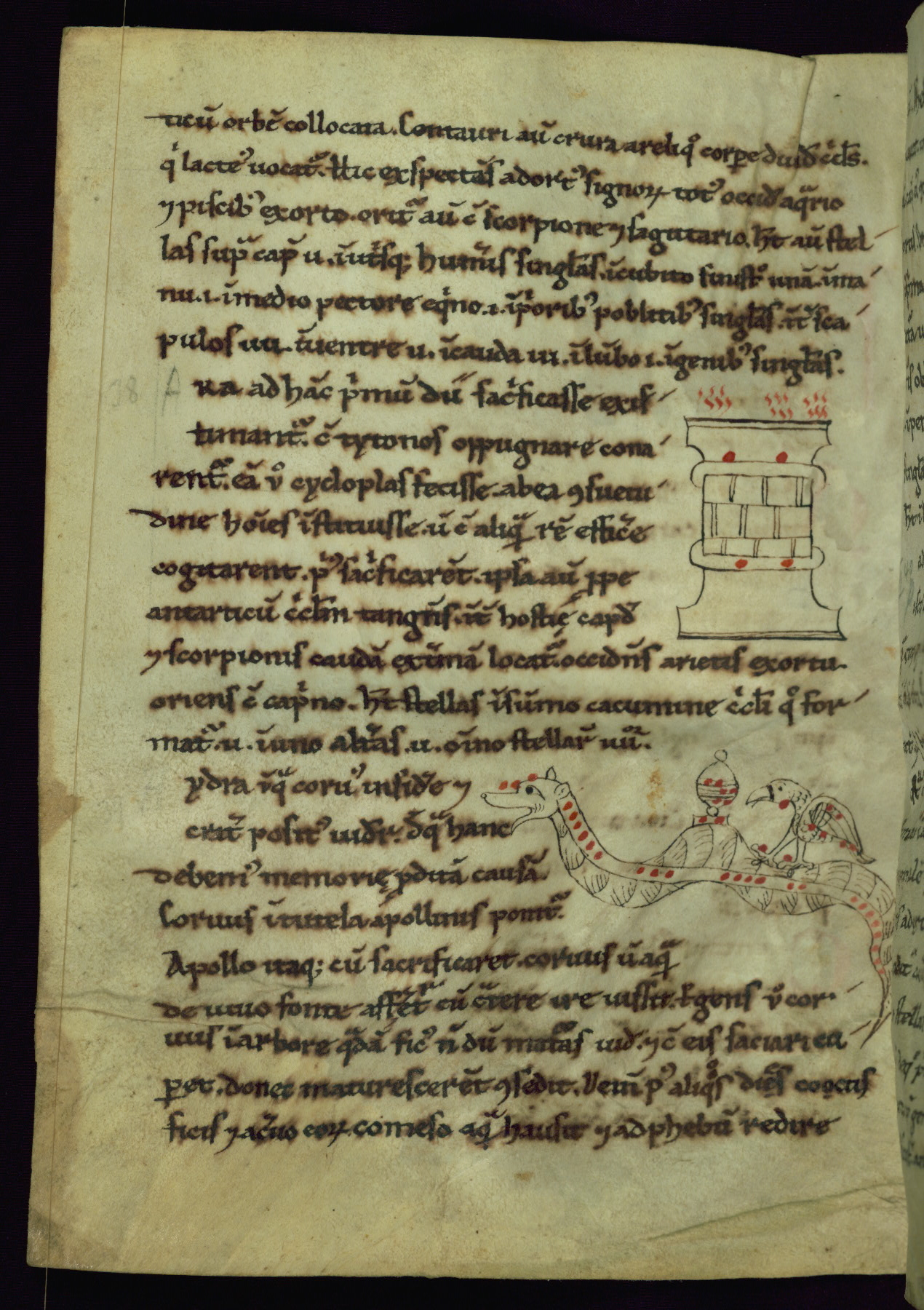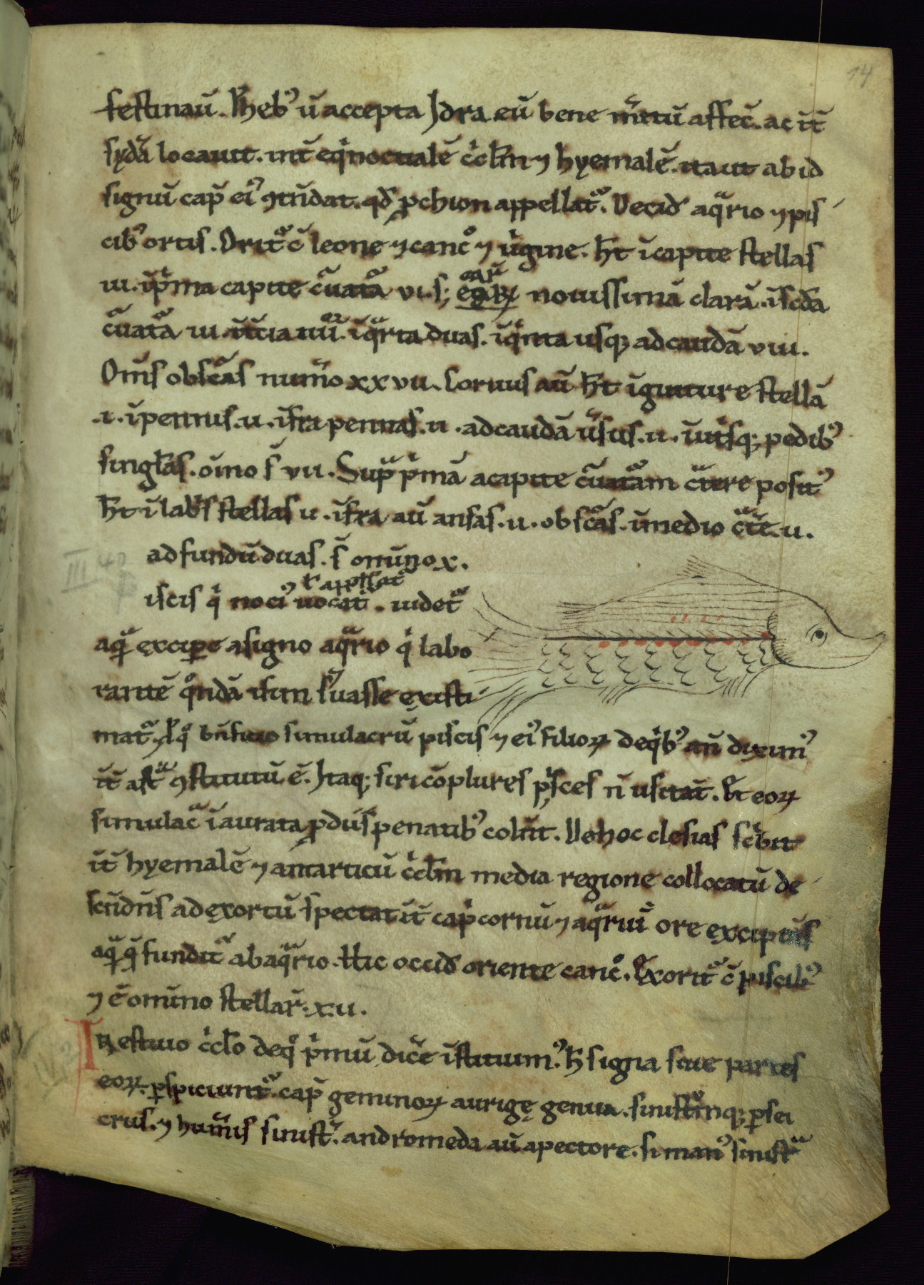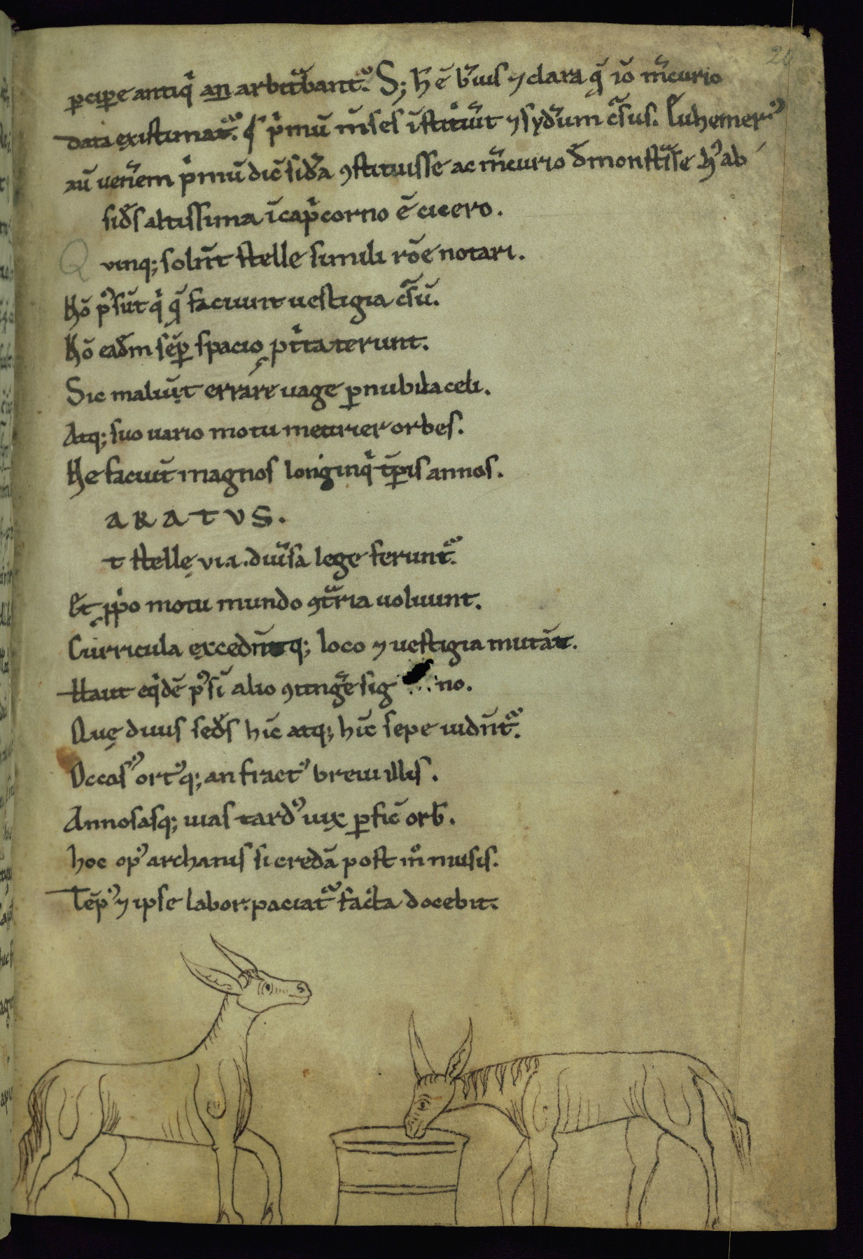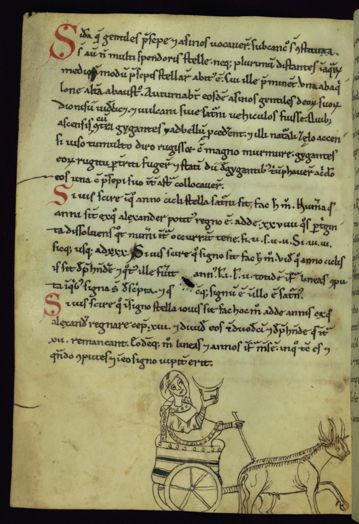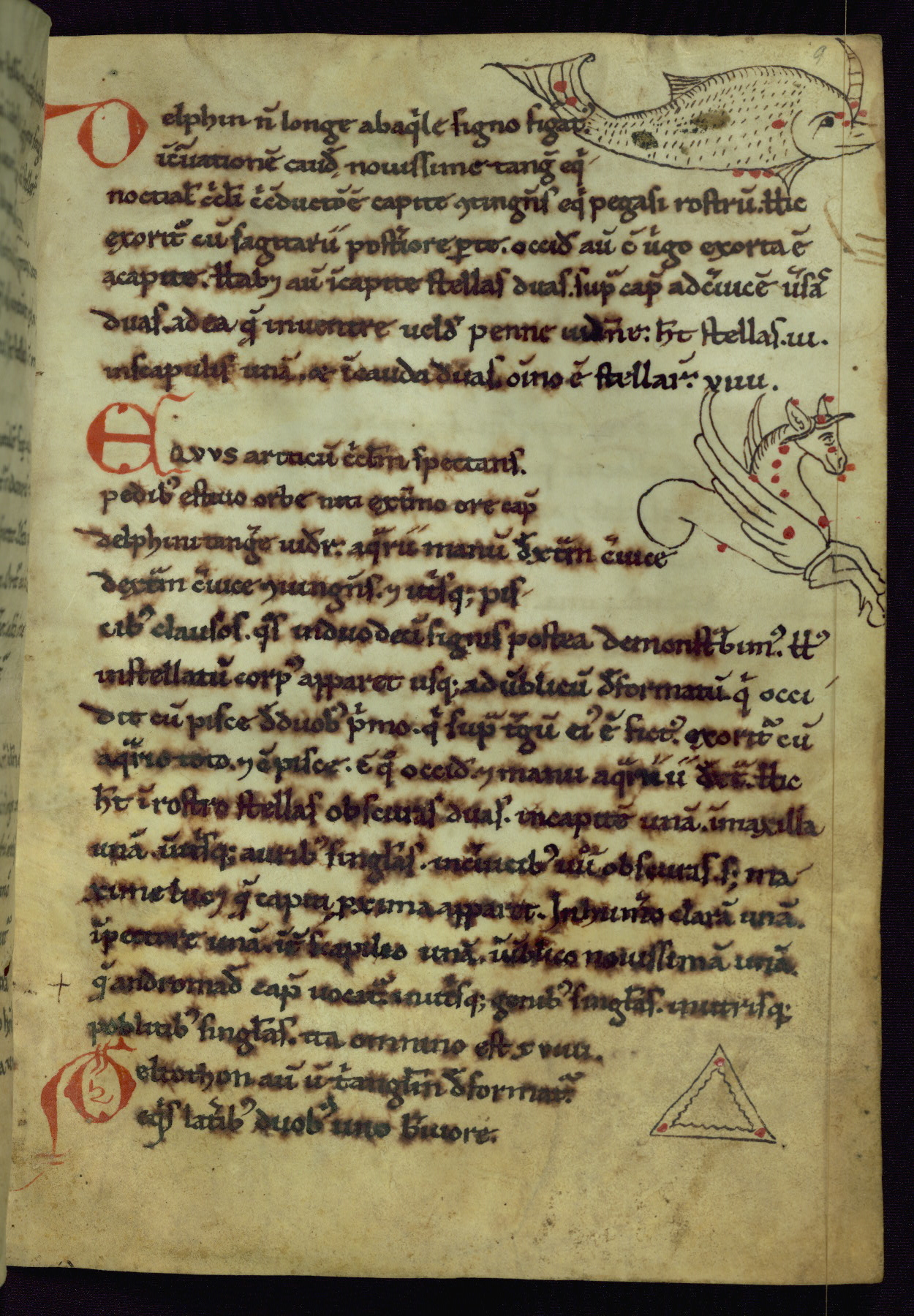 This manuscript, W. 734, is a thirteenth-century copy of an astronomical treatise, Astronomica, attributed to the first century Roman scholar Gaius Julius Hyginus. There is some question as to whether or not the unpolished Latin prose of the Astronomica was in fact by the learned scholar Hyginus. Regardless, this text was in circulation in western Europe along with other astronomical and astrological works by the ninth century. Illustrated Carolingian versions of the texts often faithfully imitated classical models in both style and detail. No illustrated Carolingian examples of Hyginus still survive, however a manuscript of Hyginus from 988 by Ademar, a monk at Saint-Martial of Limoges, seems to be faithfully copied from a Carolingian model. The most distinctive feature of the iconography of W.734 is the miniature of the two stars of Cancer, the “Aselli,” drinking from a trough. This image type recalls a very small collection of ninth century manuscripts (cf. Madrid Bibl. Nacional, cod. 3307) dating between ca. 820-828, and W.734 is reminiscent of Carolingian style as well. The text of the Astronomica itself addresses various cosmographical topics including the Earth and the spheres, the mythological legends connected with the constellations, the planets, the arrangement of the stars in the constellations, the circles of the celestial sphere and the movements of the planets, the sun and the moon, and their appearance. This copy likely dates to ca. 1200, however pinpointing its place of creation has proven more complicated, with its parchment and script having been linked to Italy, while France or Spain have also been suggested as a place of origin.