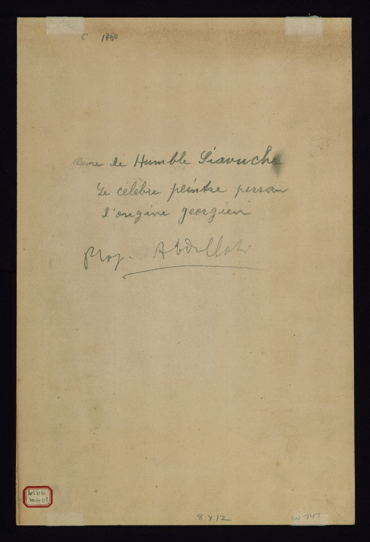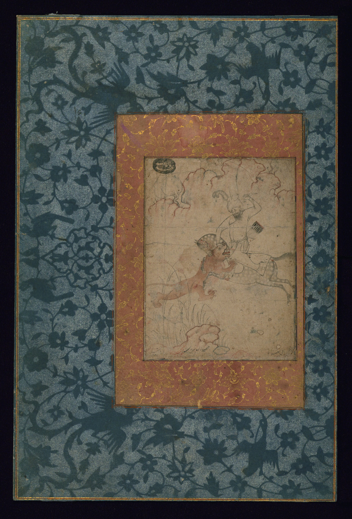 - Label: This drawing, tinted with red, dates to the mid tenth century AH / sixteenth CE and was executed in Safavid Iran. It depicts a man on horseback wearing early Safavid headgear. There are four inscriptions at the bottom of the page, three of which are legible. Two name well-known Persian artists. The inscription on the far right attributes the work to Bihzād, in reference to Kamāl al-Dīn Bihzād (d. 942 AH / 1536-7 CE), the most celebrated Persian painter. The one inscribed in red mentions the Safavid artist Siyāvush (d. ca. 1025 AH / 1616 CE), an enslaved Georgian man who became boon companion to Shāh Ṭahmāsp (r. 930-984 AH / 1524-1576 CE). The seal at the top of the page is dated 1126 AH / 1714 CE.