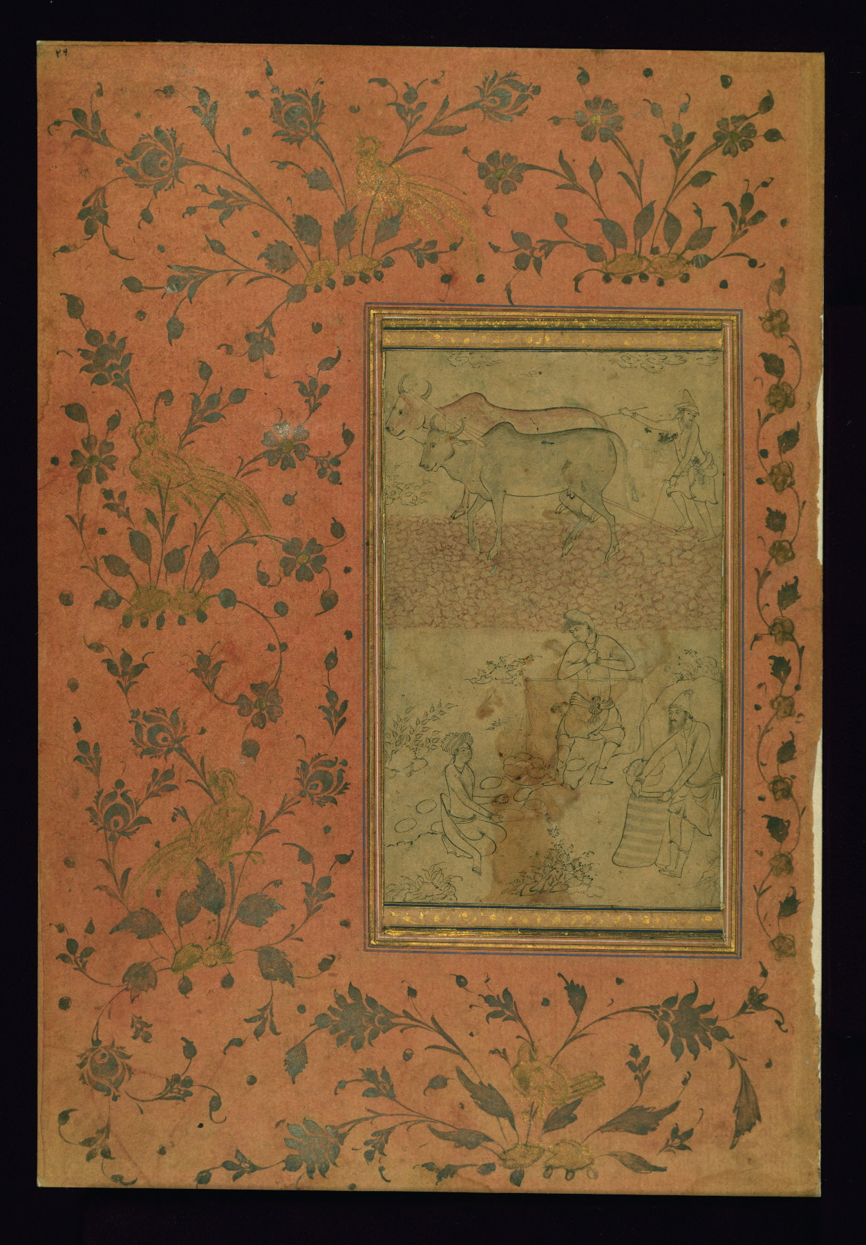This drawing was executed in Safavid Iran, most probably in the late tenth century AH / sixteenth CE, in Qazvin or Isfahan. Above, a farmer plows; below, a seated young man watches a produce seller weigh his purchase. On the rocks in the center foreground is inscribed the name of one of the most famous painters in Iran in the eleventh century AH / seventeenth CE, Riẓā ʿAbbāsī (fl. 1001-1044 AH / 1591-2 to 1634 CE). As the handwriting does not match that of the artist, an admirer of Riẓā’s work seems to have attributed the drawing to him. The execution and the bucolic subject matter of this drawing relate closely to the oeuvre of the Persian artist Muḥammadi Haravī (fl. late tenth century AH / sixteenth CE), who worked in Qazvin. It is possible that this composition was conceived as a manuscript page.