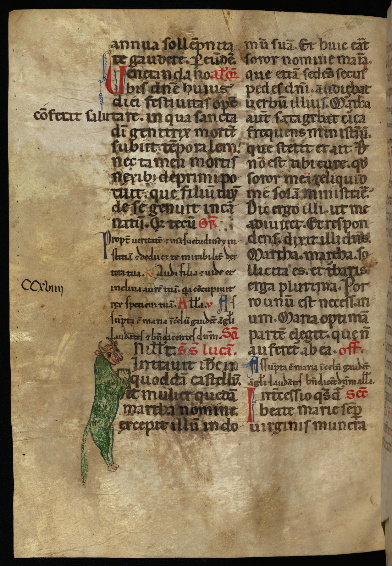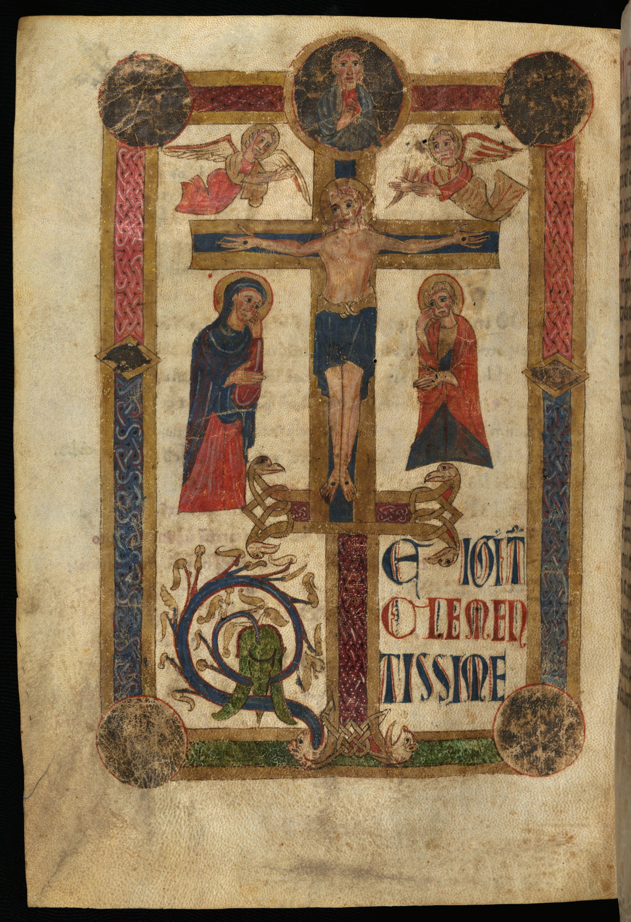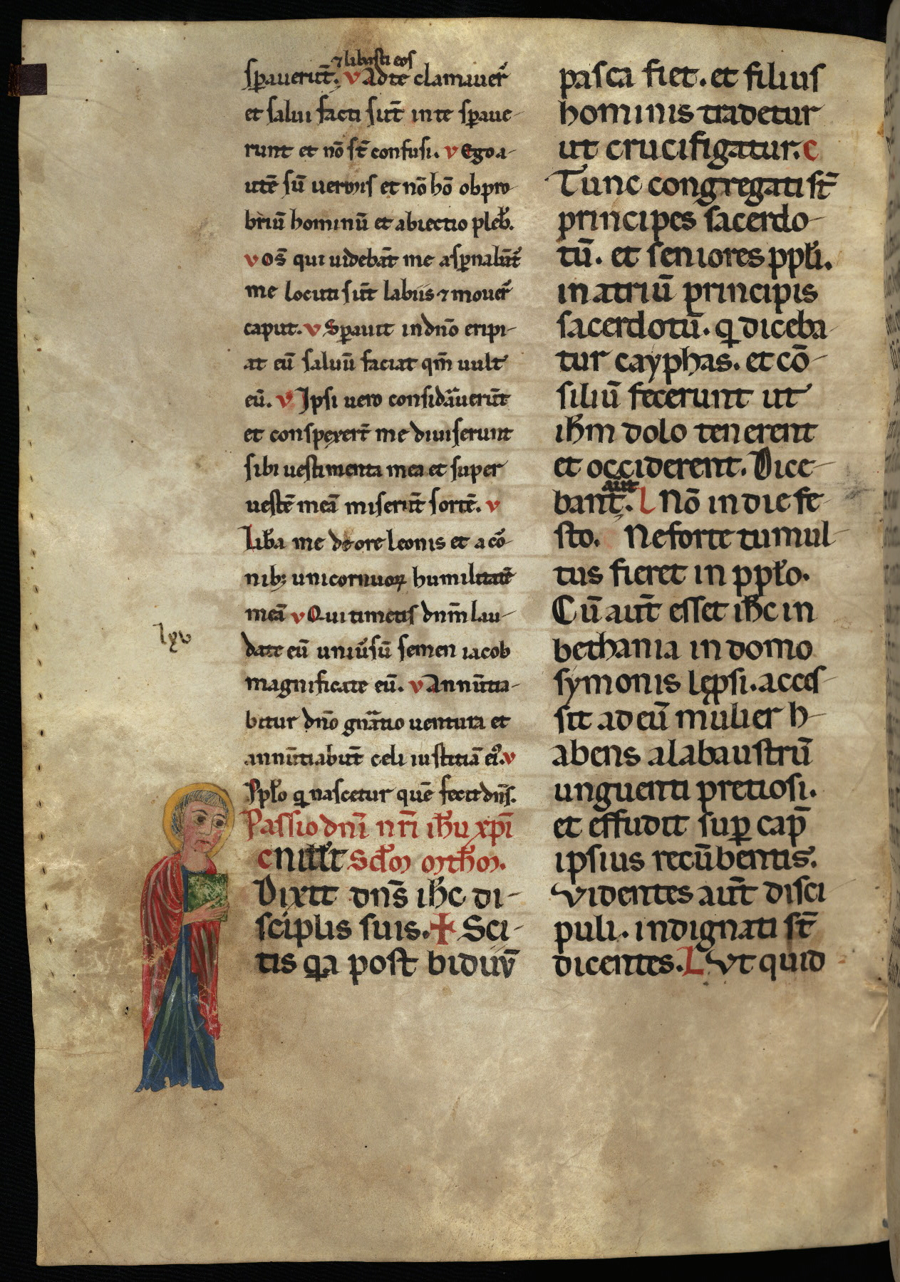 - Decoration note: One full-page miniature of Crucifixion doubling as "T" initial, two large half- to full-page illuminated initials, and nine decorated initials (six are figurative, averaging 9-12 lines) in pigments including orpiment, ultramarine, and some very oxidized silver; initials throughout in alternating red and blue (1-2 lines); rubrics in red; text in dark brown to black ink