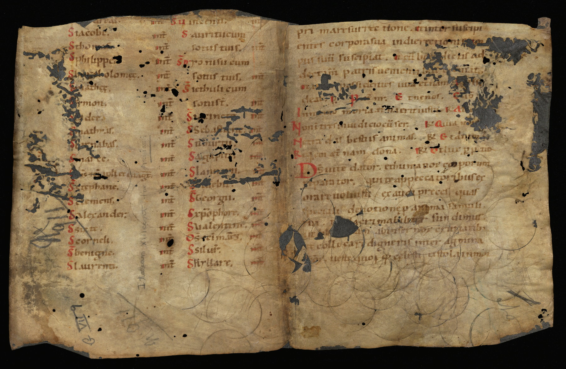 - Contents: Calendar half-full on average, graded in red and black ink; saints of note include St. Nicolas (translation, May 9), St. Rufinus (Aug. 11); many names added, and some later erased but visible through UV light - each page had about a dozen erasures, with most commemorating the dates of deaths of members of the parish in Assisi; added names include St. Clare (Aug. 12) and Obit. for Bishop Guido (d. July 30, 1228); St. Francis (Oct. 4) added but later erased