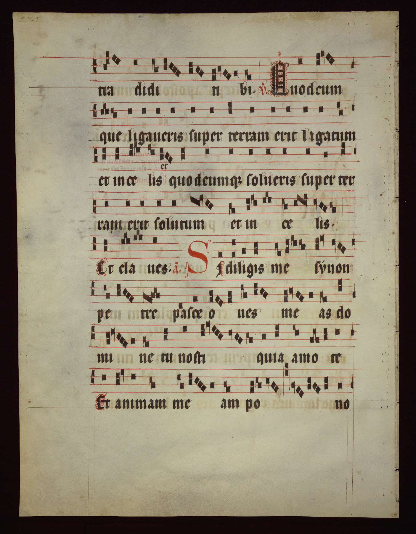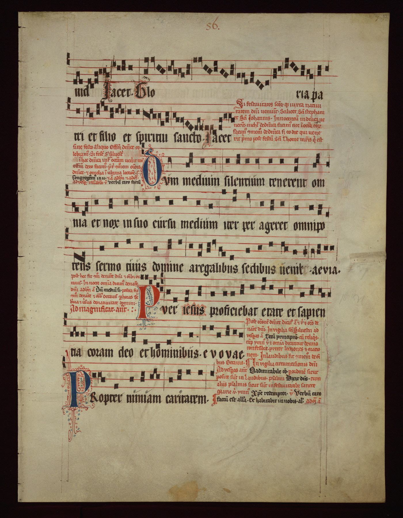 Originally part of an Antiphonary created in Germany in the early fourteenth century, these two nonconsecutive folios were saved for their large and ornate historiated initials. Stylistically, the images are close to the "Legendarium" of the Abbey of Heiligen Kreuz in Regensburg, and these leaves have therefore been attributed to that region as well. Other folios from this same manuscript survive in several collections: New York, Pierpont Morgan Library, Ms. M.870 (1-3), the Los Angeles County Museum (no manuscript information on file), Stockholm, National Museum (Erickson Foundation, Med. 1-4), and in the collection of Philippe Verdier in Montreal. One of the New York leaves has the name "Gerwich" inscribed beneath a historiated initial, and this has been understood by scholars to be the name of the artist. As all of the surviving initials are by the same hand, the Walters initials may be attributed to Gerwich as well.