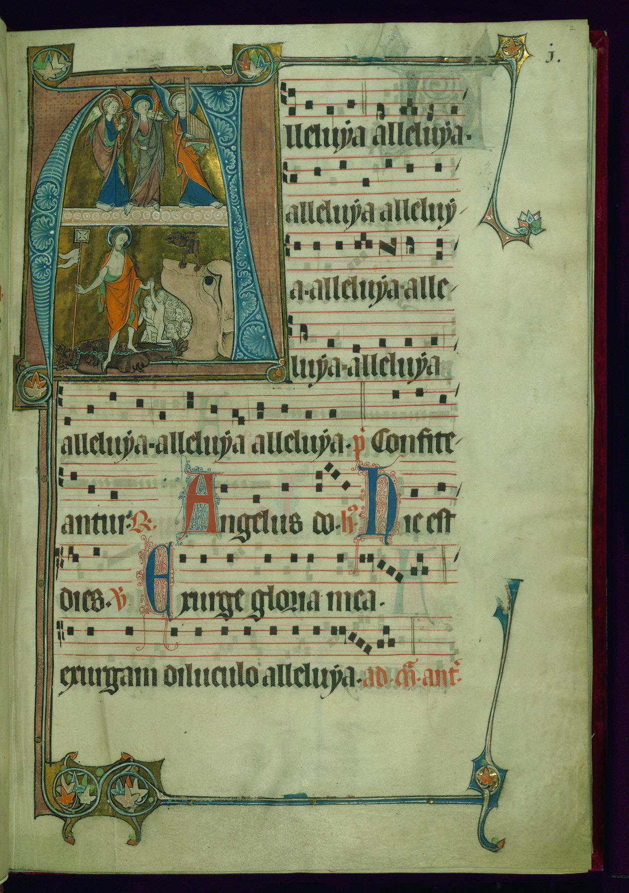 - Title: Initial "A" with Harrowing of Hell and three angel-musicians