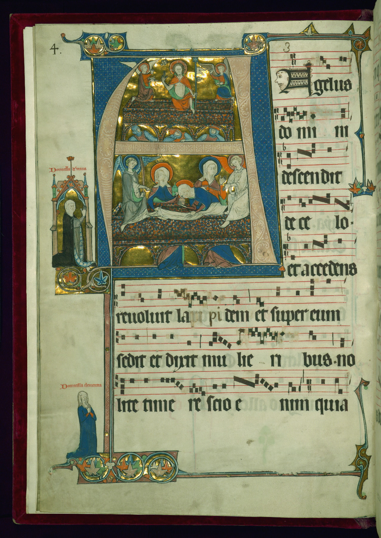 - Title: Initial "A" with the Resurrection and three Marys at the tomb