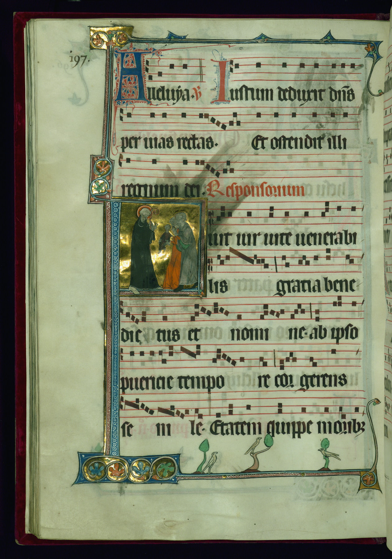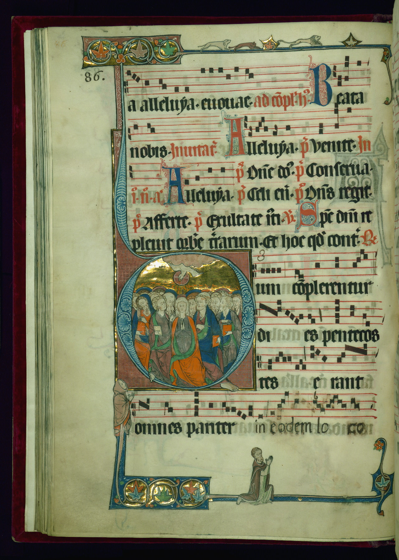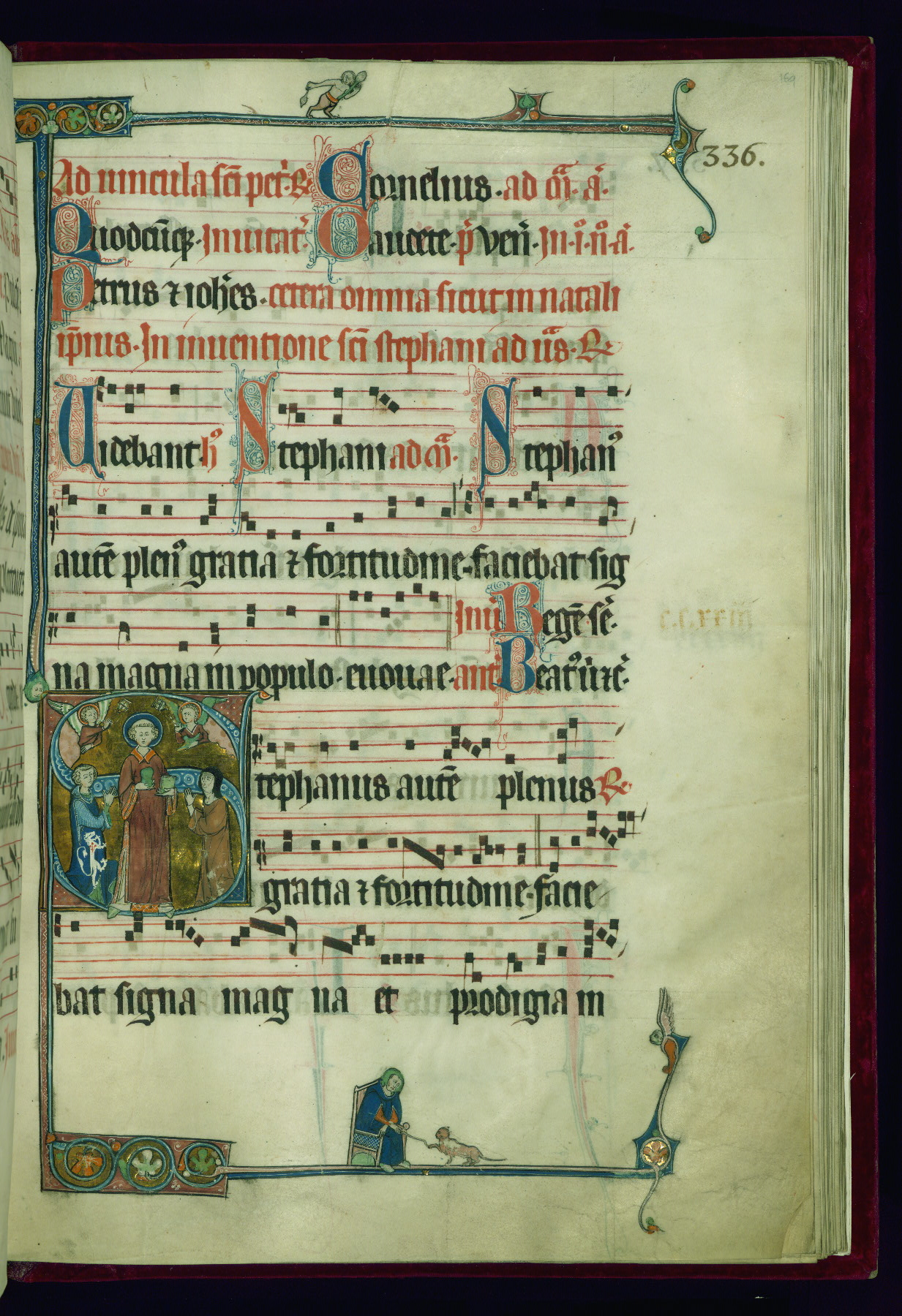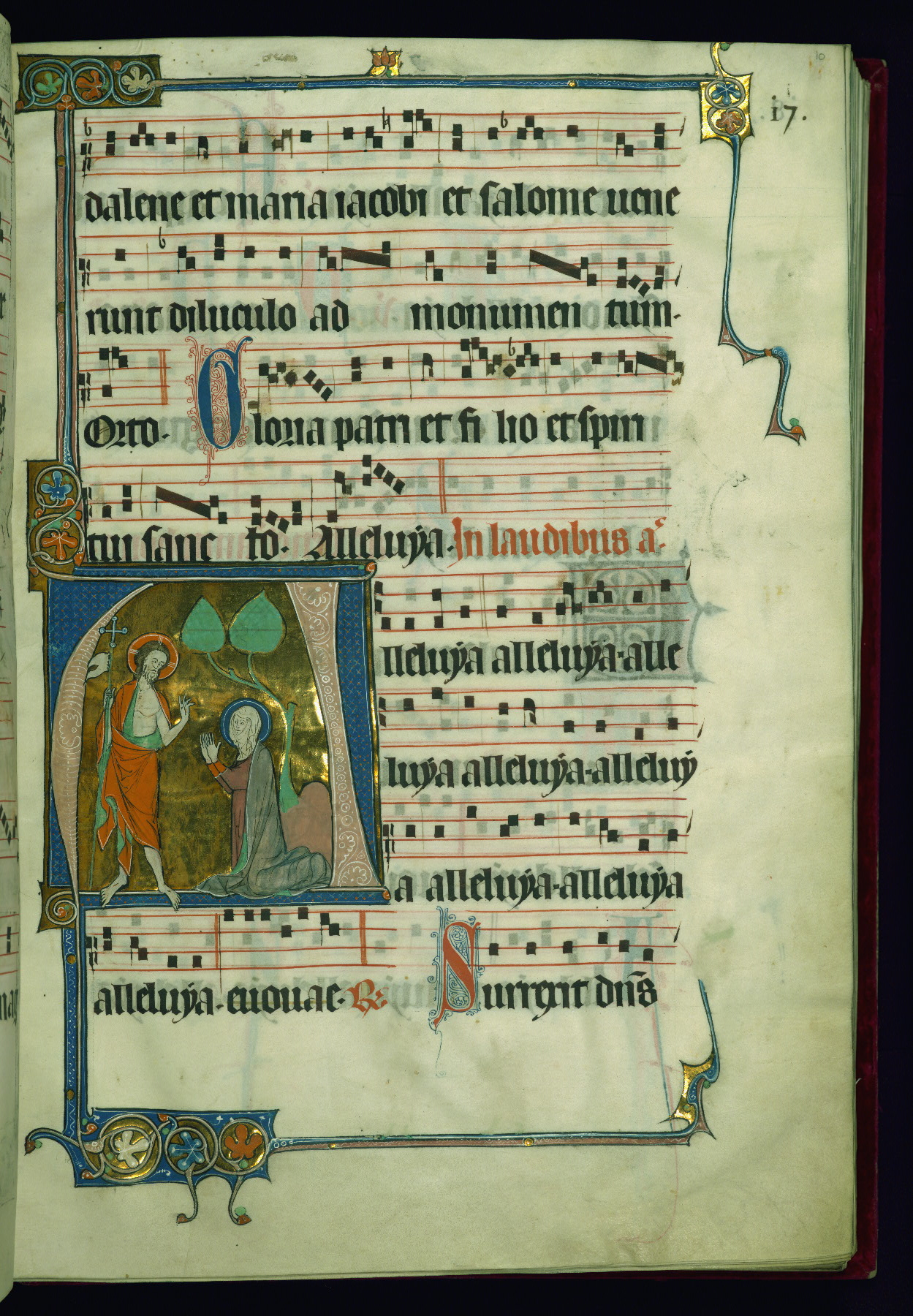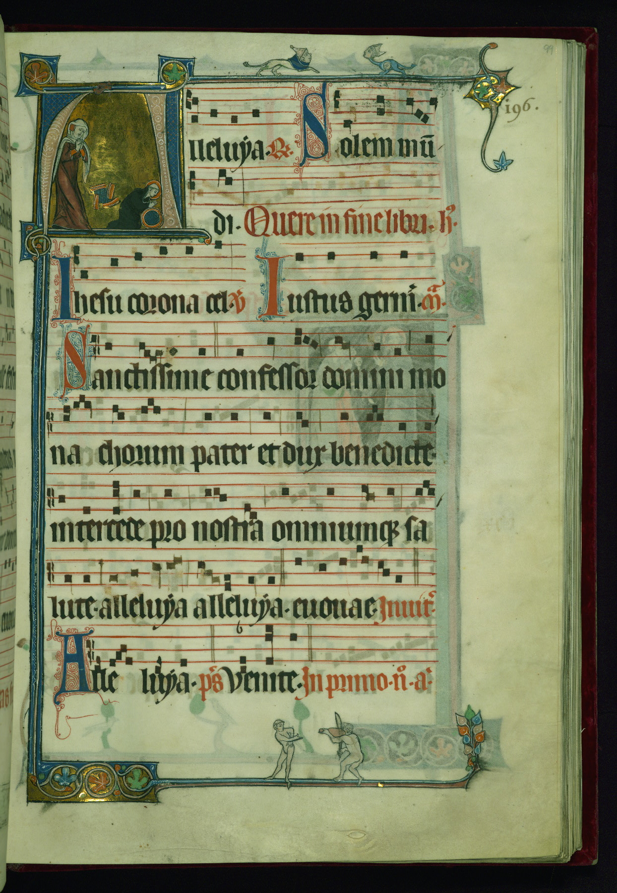 - Decoration note: Eighteen extant historiated initials (varying in height from 2 staves and 2 lines of text to 5 staves and 5 lines of text); gold decorated initials at sixteen text-openings (1 stave and 1 line of text): two in ownership inscription (fol. 1v), antiphon in Office of Holy Saturday (fol. 2v), six in Easter Sunday Office responsories (fols. 5r, 6r, 7v, 8v, 9r-v), two in Office for Easter Monday antiphons (fols. 10v and 12r), one in vigils of Ascension (fol. 31v), two in Office of Pentecost antiphons (fols. 44r, 52v), one in Office of Trinity Sunday antiphon (fol. 58r), one in fragmentary Office of octave of Nativity of St. John Baptist antiphon (fol. 141r, Matins Magnificat); twelve flourished initials: some large (2 staves and 2 lines of text) featuring geometric or foliate motif, occasional fluer-dis-lis, colored in red and blue, emphasizing the openings in the Offices of Easter, Easter Octave, Pentecost octave, second Sunday after Pentecost (Benedictus antiphon), St. Mark, Commemoration of St. Peter, and in Common of Saints for apostles, one martyr (also Vespers antiphon), several martyrs, one confessor bishop, one confessor non-bishop (fols. 19r, 26r, 71r, 76v, 81v, 118v, 125r, 184r, 194r, 202v, 210r, 217r); other flourished initials colored in red and blue (1 stave and 1 line of text) found at beginning of most antiphons, responsories, and fifteenth-century additions at beginning of antiphons, hymns; plain colored initials (1 stave and 1 line of text) of red and blue ink in quires added in the fifteenth century at beginning of antiphons, responsories, and versicles; borders present at text openings featuring historiated initials, bracket-shape, of note are human and beast heads that form terminals at outer ends and junctures above and below historiated initials; drolleries varying in character and motif on pages with historiated initials, principally focused on centered bas-de-page; musical notation in dark brown ink, staves in red; rubrics and headings in red; text in dark brown ink