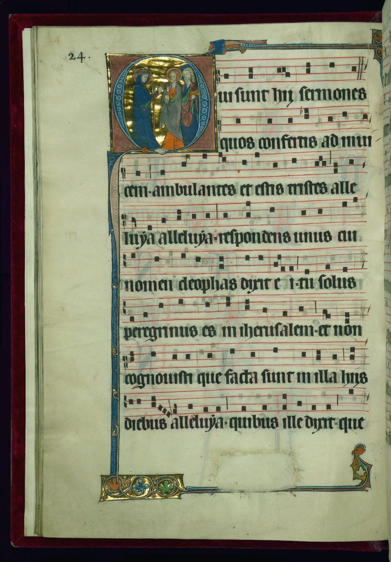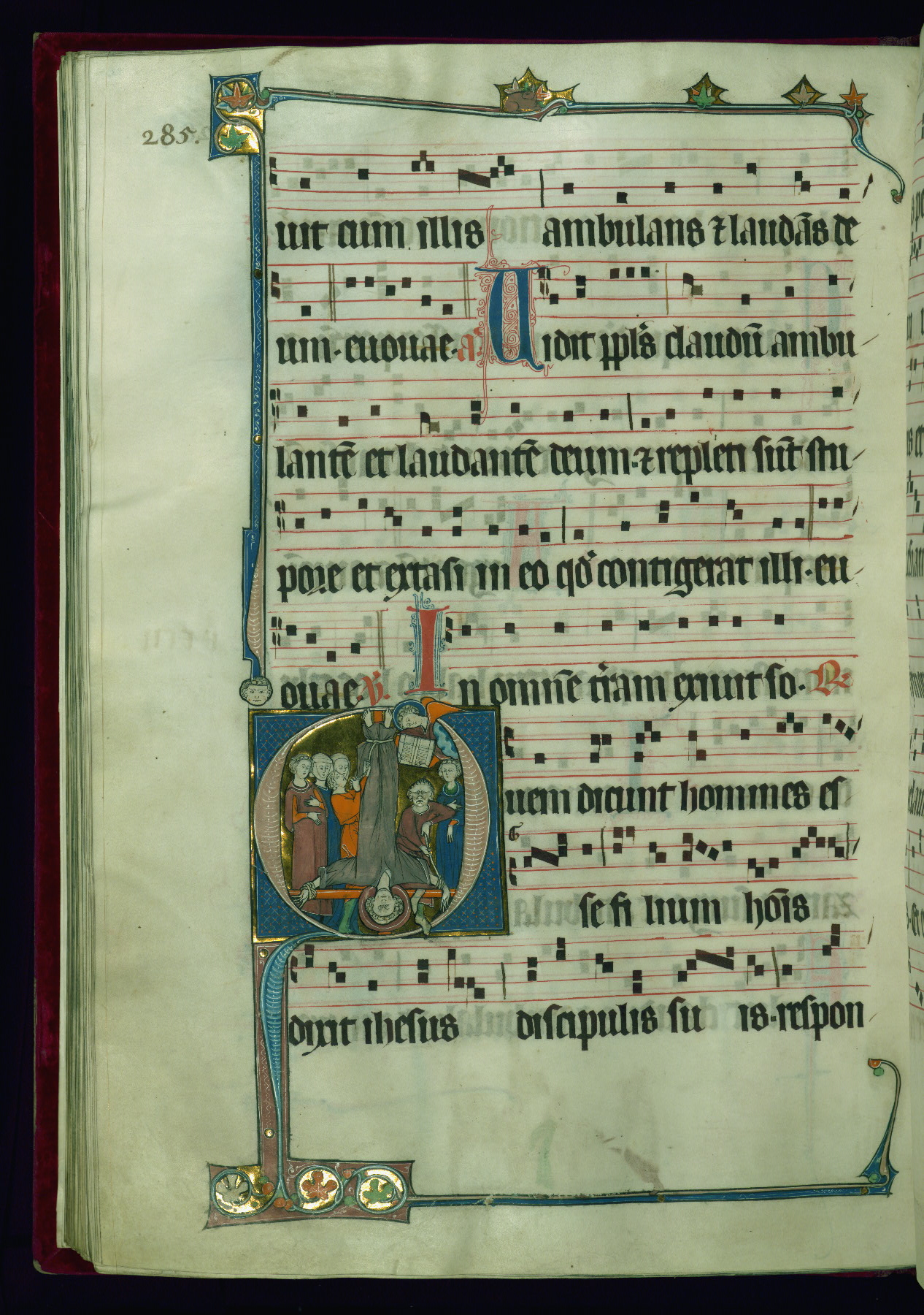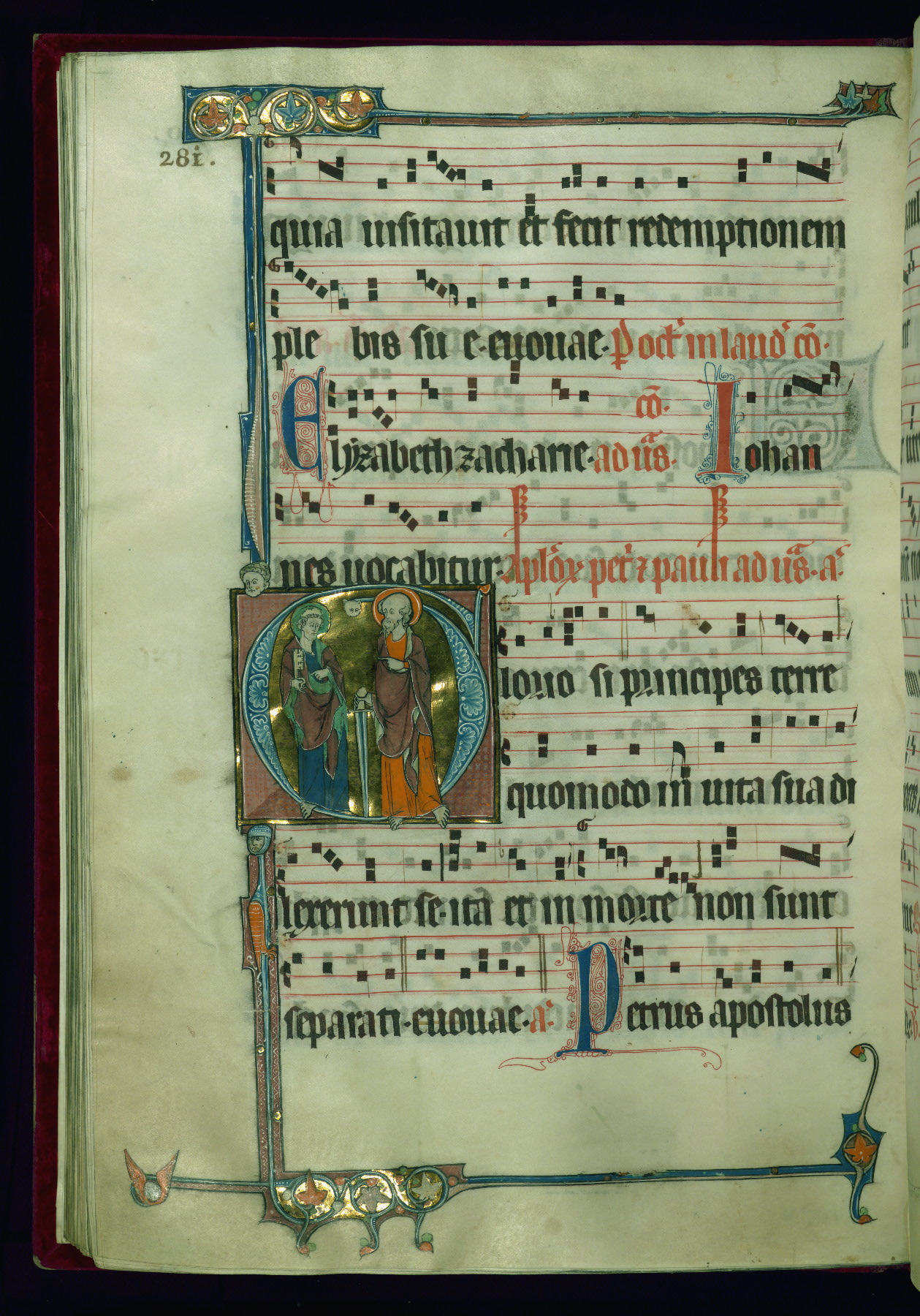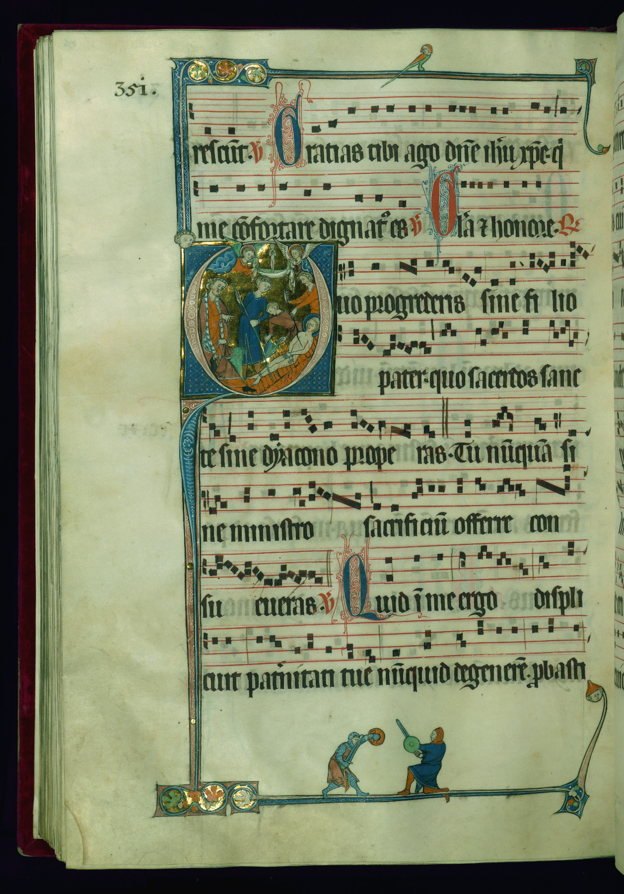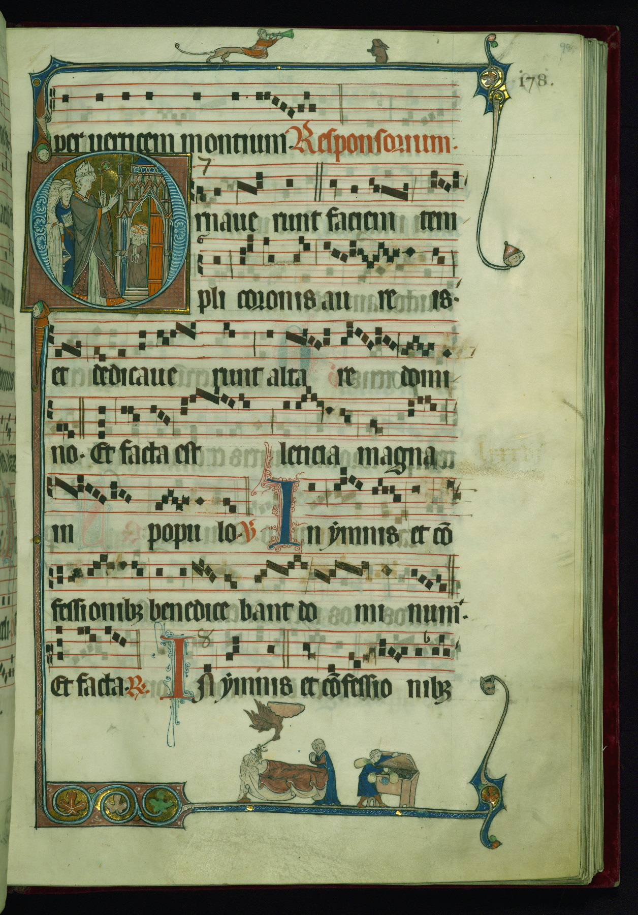 - Decoration note: Eighteen extant historiated initials (varying in height from 2 staves and 2 lines of text to 5 staves and 5 lines of text); gold decorated initials at sixteen text-openings (1 stave and 1 line of text): two in ownership inscription (fol. 1v), antiphon in Office of Holy Saturday (fol. 2v), six in Easter Sunday Office responsories (fols. 5r, 6r, 7v, 8v, 9r-v), two in Office for Easter Monday antiphons (fols. 10v and 12r), one in vigils of Ascension (fol. 31v), two in Office of Pentecost antiphons (fols. 44r, 52v), one in Office of Trinity Sunday antiphon (fol. 58r), one in fragmentary Office of octave of Nativity of St. John Baptist antiphon (fol. 141r, Matins Magnificat); twelve flourished initials: some large (2 staves and 2 lines of text) featuring geometric or foliate motif, occasional fluer-dis-lis, colored in red and blue, emphasizing the openings in the Offices of Easter, Easter Octave, Pentecost octave, second Sunday after Pentecost (Benedictus antiphon), St. Mark, Commemoration of St. Peter, and in Common of Saints for apostles, one martyr (also Vespers antiphon), several martyrs, one confessor bishop, one confessor non-bishop (fols. 19r, 26r, 71r, 76v, 81v, 118v, 125r, 184r, 194r, 202v, 210r, 217r); other flourished initials colored in red and blue (1 stave and 1 line of text) found at beginning of most antiphons, responsories, and fifteenth-century additions at beginning of antiphons, hymns; plain colored initials (1 stave and 1 line of text) of red and blue ink in quires added in the fifteenth century at beginning of antiphons, responsories, and versicles; borders present at text openings featuring historiated initials, bracket-shape, of note are human and beast heads that form terminals at outer ends and junctures above and below historiated initials; drolleries varying in character and motif on pages with historiated initials, principally focused on centered bas-de-page; musical notation in dark brown ink, staves in red; rubrics and headings in red; text in dark brown ink