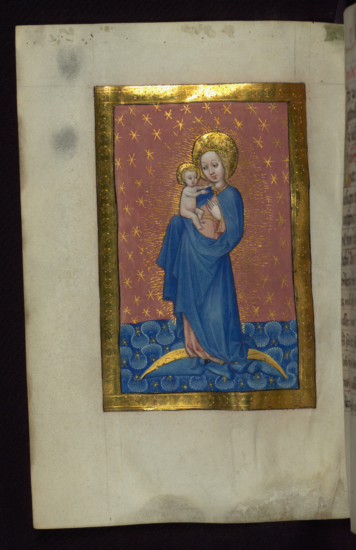 - Decoration note: Thirteen full-page miniatures missing; three extant full-page miniatures; twenty-five large decorated initials (3-7 lines), some with flowering tendrils; KL in calendar in alternating red and blue (3 lines); smaller initials in red and blue throughout the text (1-2 lines); rubrics in red; text in black ink