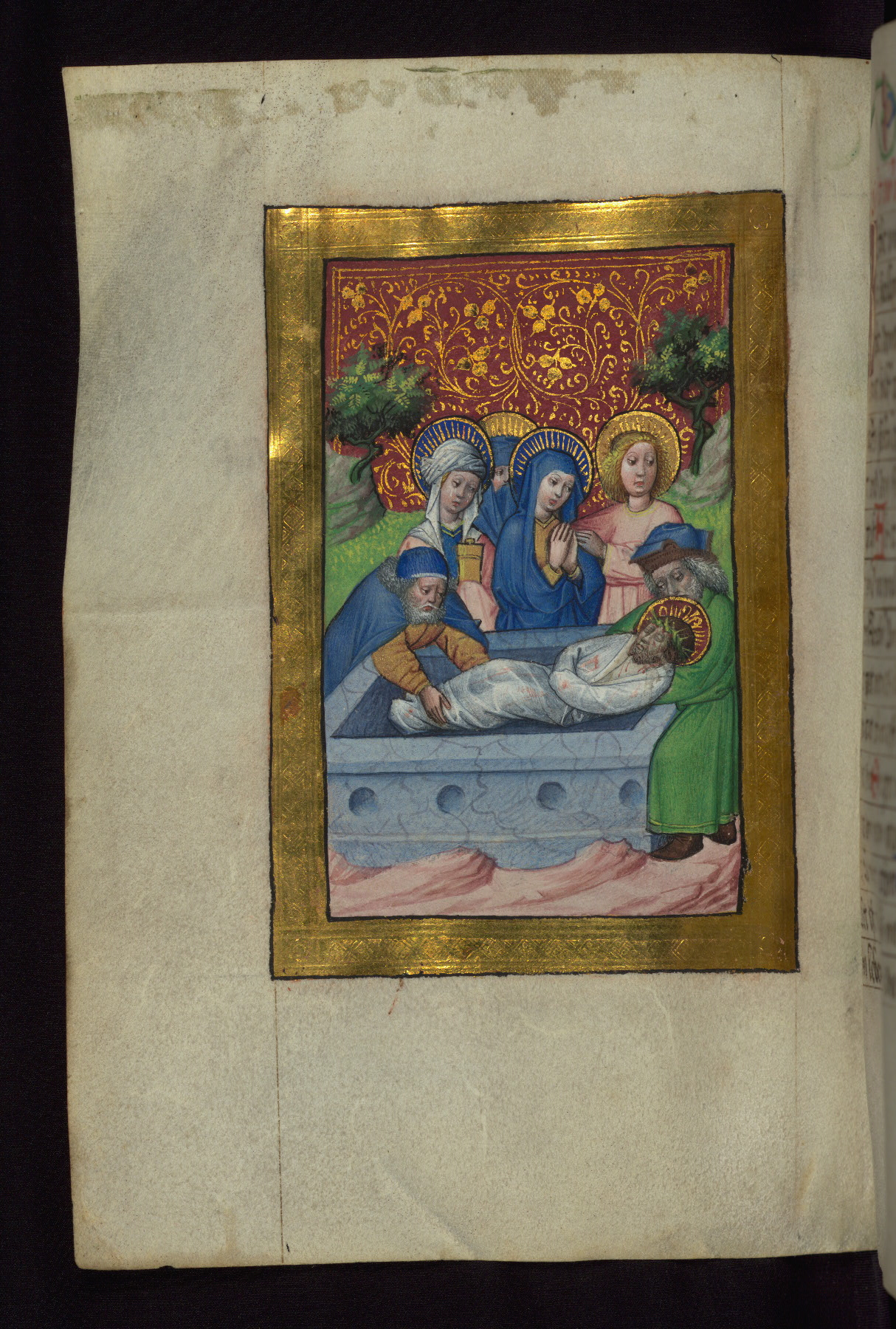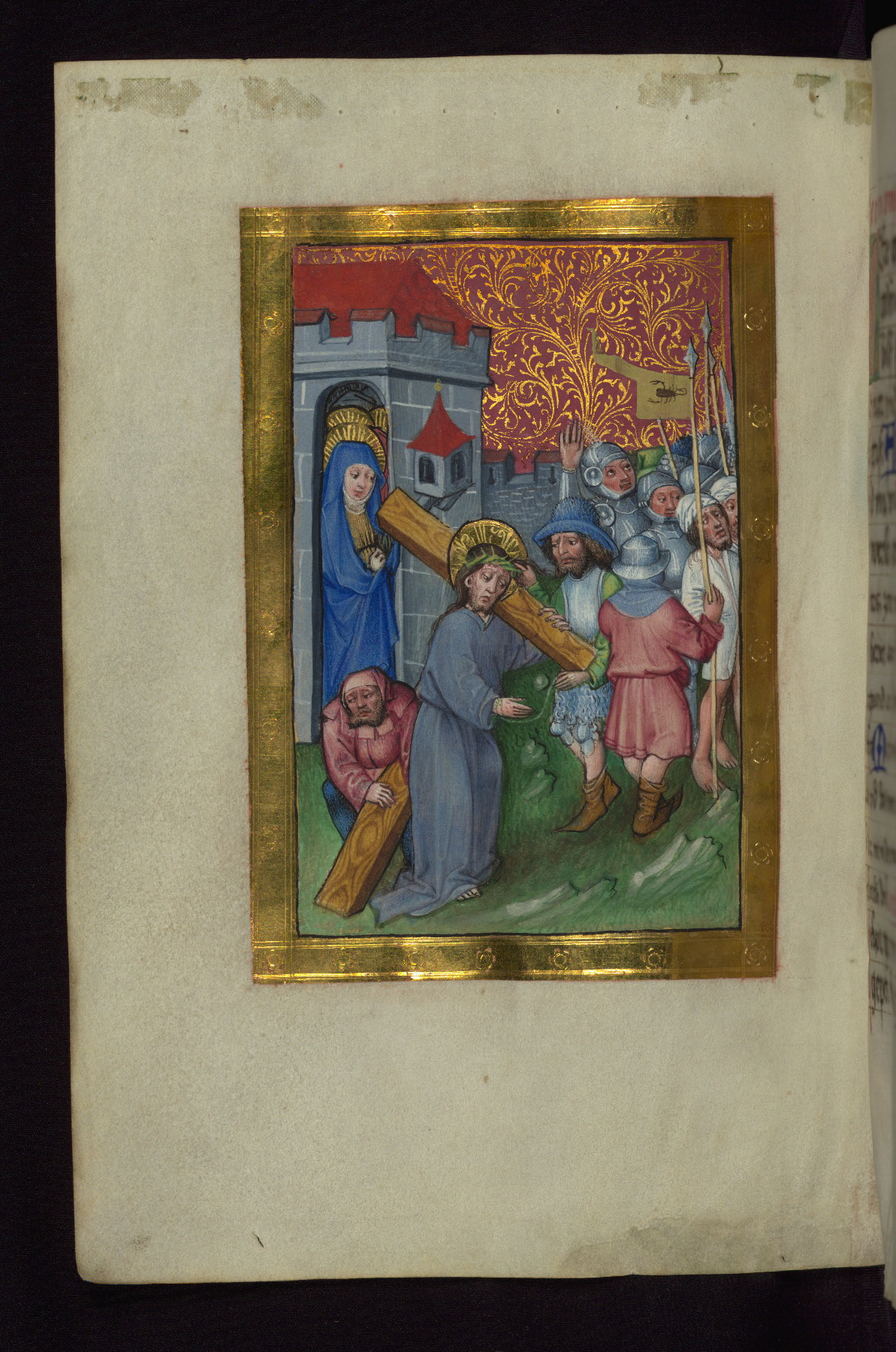 This book of hours was written in German in Vienna, Austria, ca. 1460-65. It is one of a series of manuscripts commissioned at the court of Emperor Frederick III of Austria (1415-1493), some of which were made for his son, Prince Maximilian (1459-1519). The name of the artist is unknown, but due to his connection with these commissions, he is known as the Master of the Maximilian Schoolbooks. Unfortunately, only three of the original sixteen full-page, richly painted miniatures remain in this manuscript, but ten of the missing folios have been identified. Nine cuttings are in the Musée Bonnat, Bayonne, France (inv. nr. 1244-1252), and one cutting is in the Cleveland Museum of Art (Dudley P. Allen Fund Accession 1959.40). Other related manuscripts include Vienna, Nationalbibliothek Codicies 2368, 2617, and 2289.