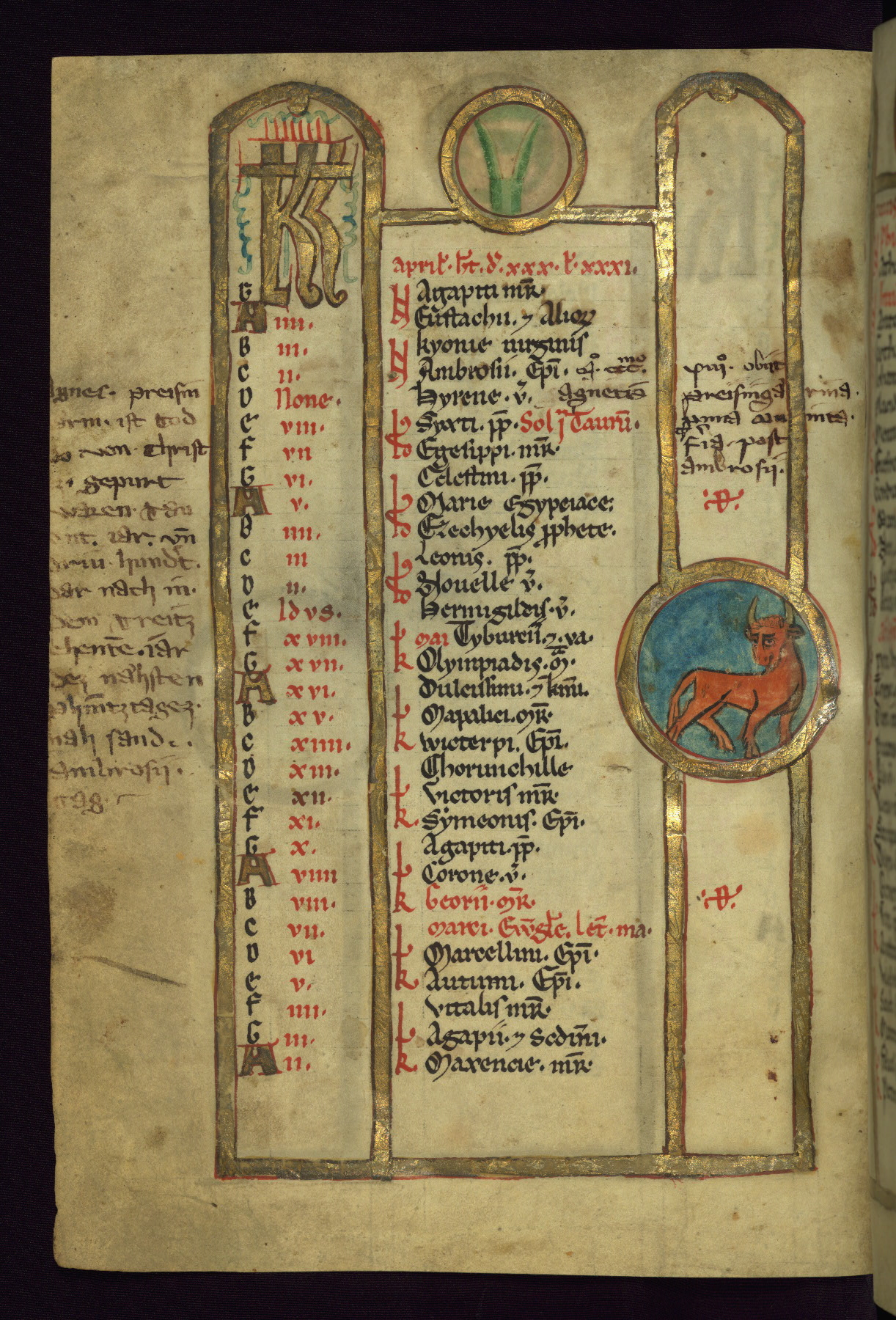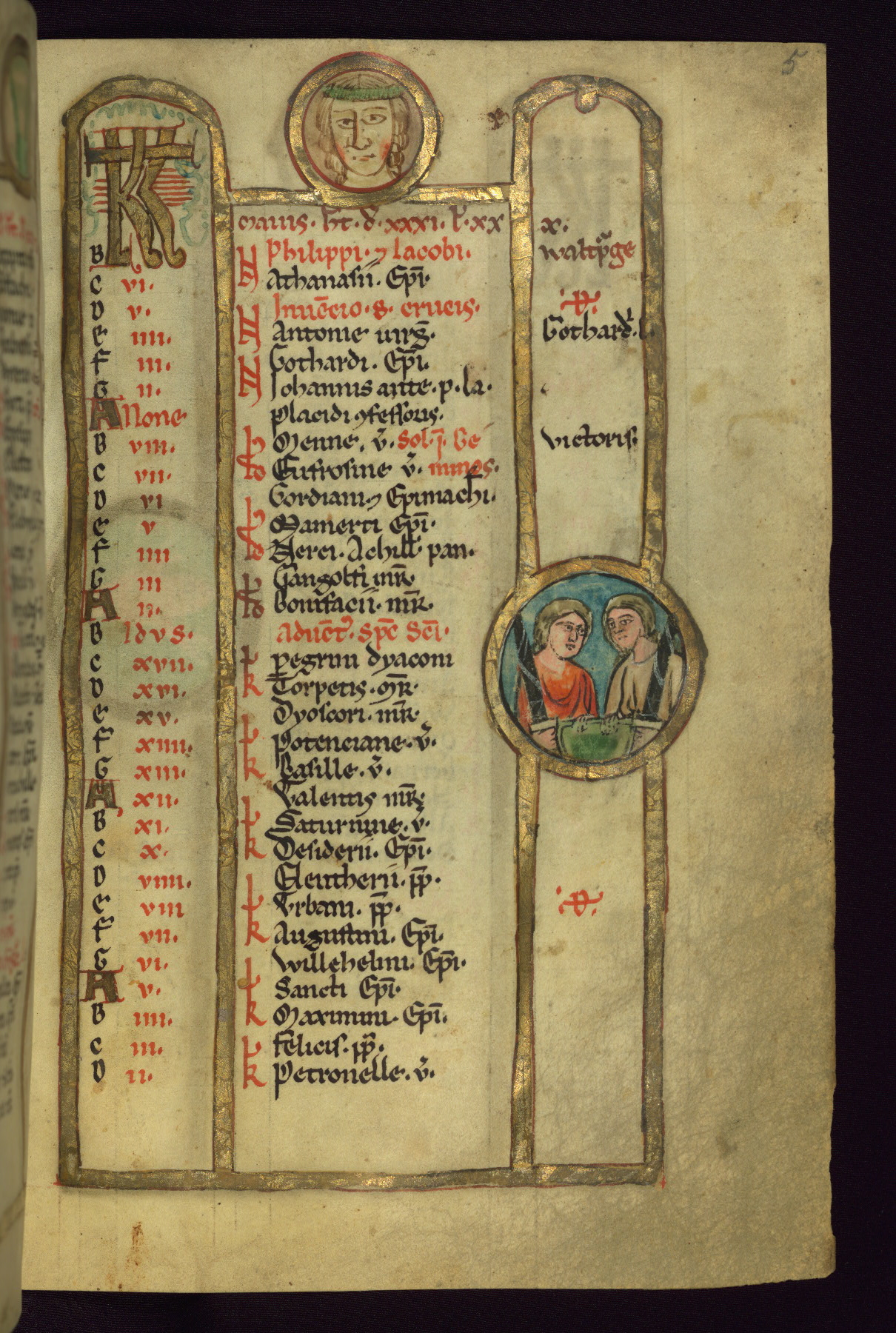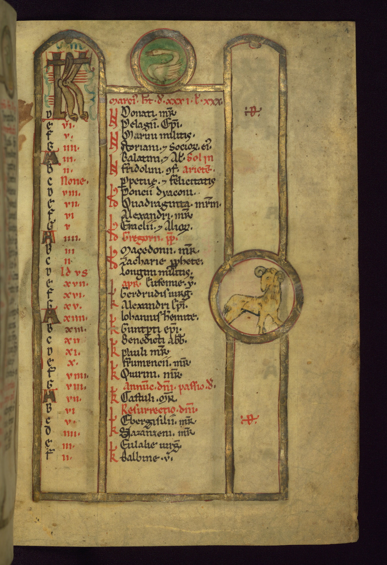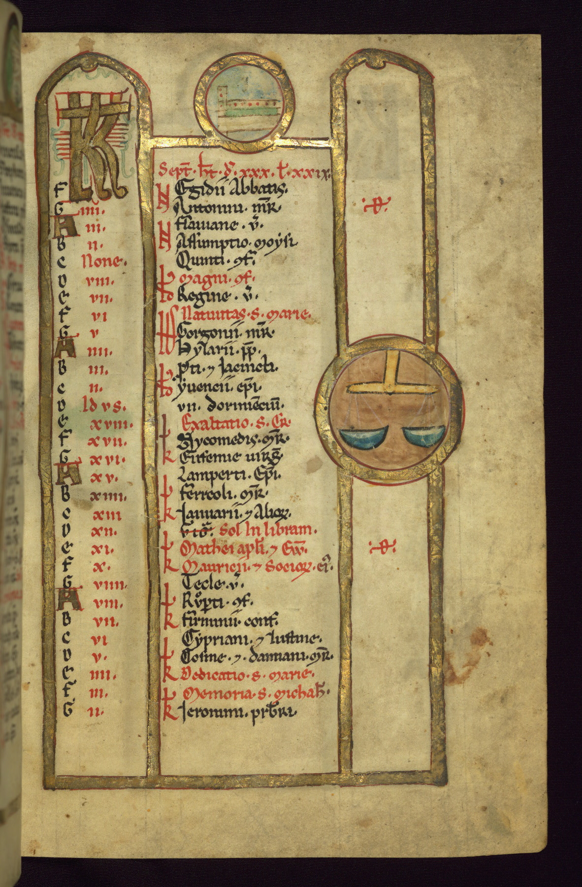 - Contents: Calendar, about 7/8 filled, graded in red and black; Egyptian dates noted with "DE"; contents specific to southern Germany (Augsburg in particular), including Georgius (April 24, specific to Augsburg), feast of church dedication to St. Mary (September 28), St. Othmar (November 16), and St. Afra (August 7); many later additions and necrologies