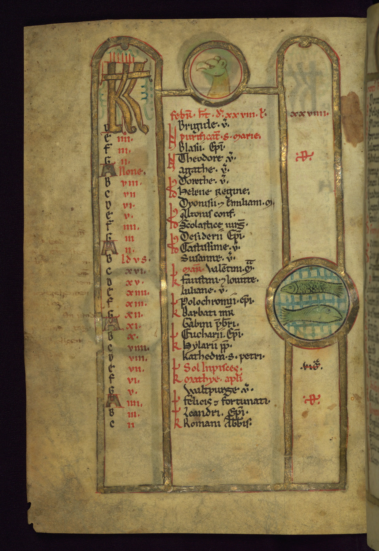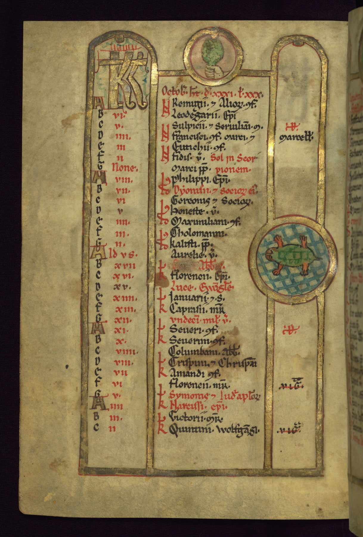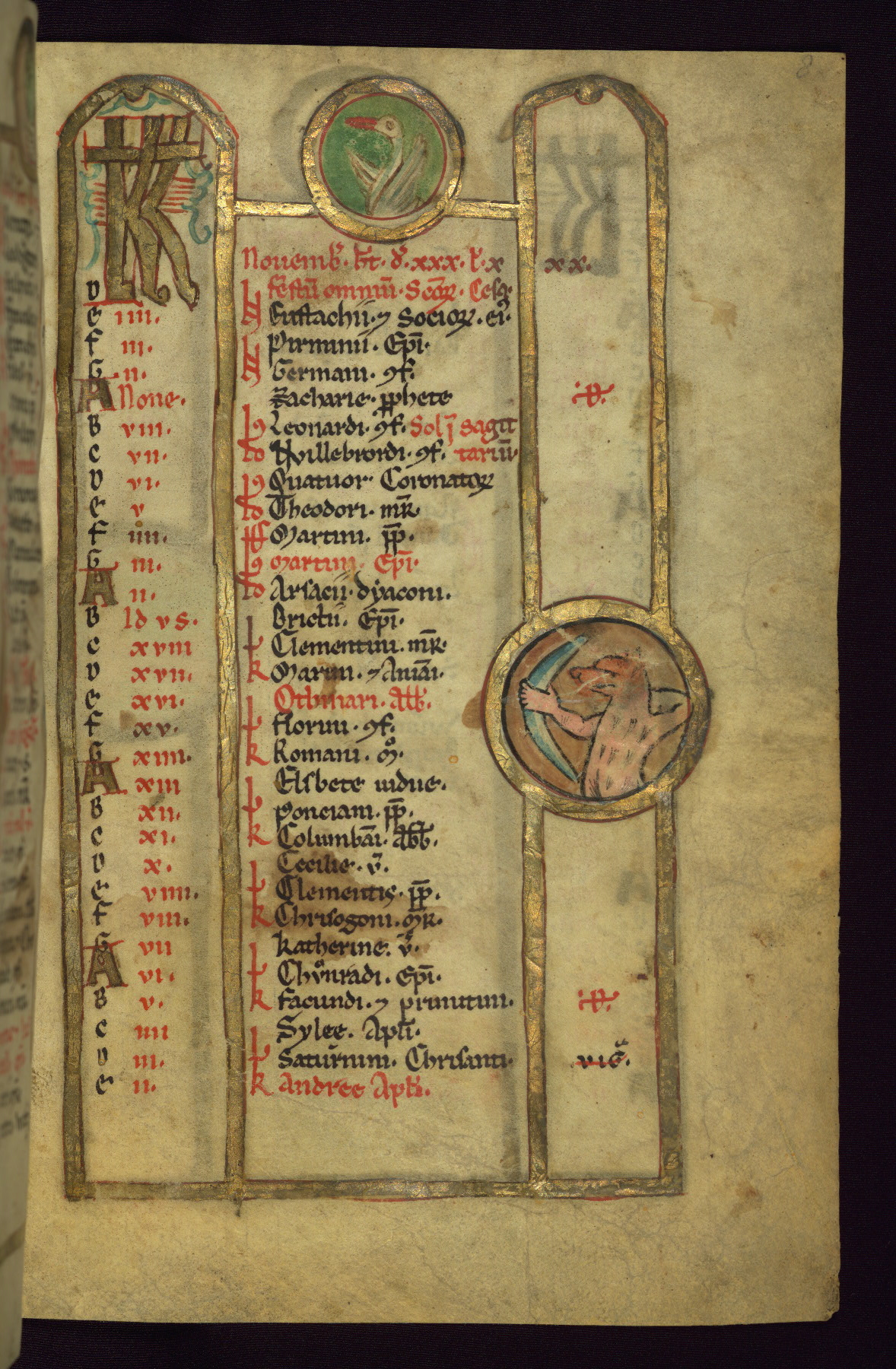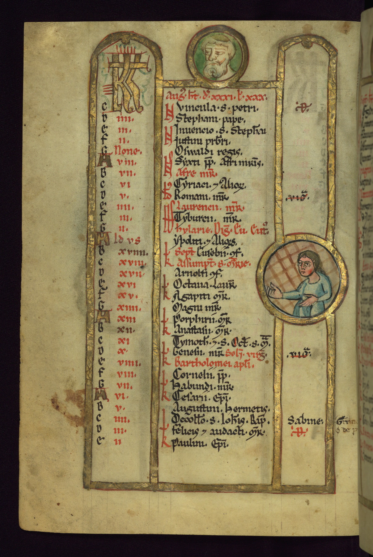 - Contents: Calendar, about 7/8 filled, graded in red and black; Egyptian dates noted with "DE"; contents specific to southern Germany (Augsburg in particular), including Georgius (April 24, specific to Augsburg), feast of church dedication to St. Mary (September 28), St. Othmar (November 16), and St. Afra (August 7); many later additions and necrologies