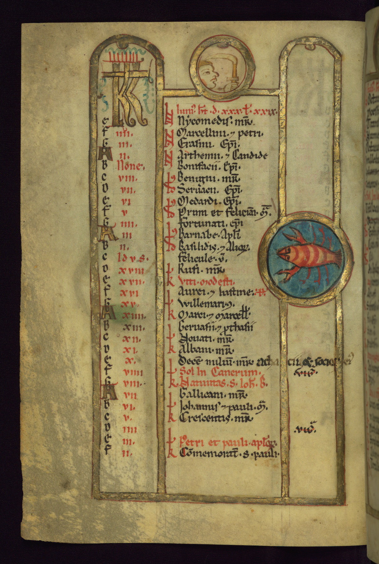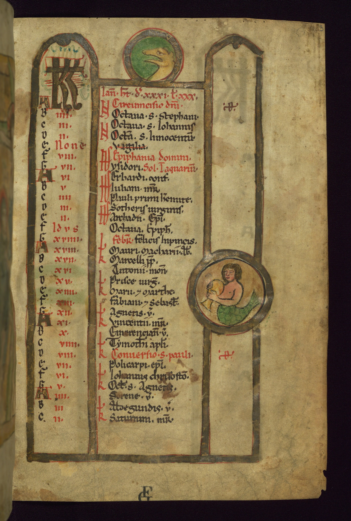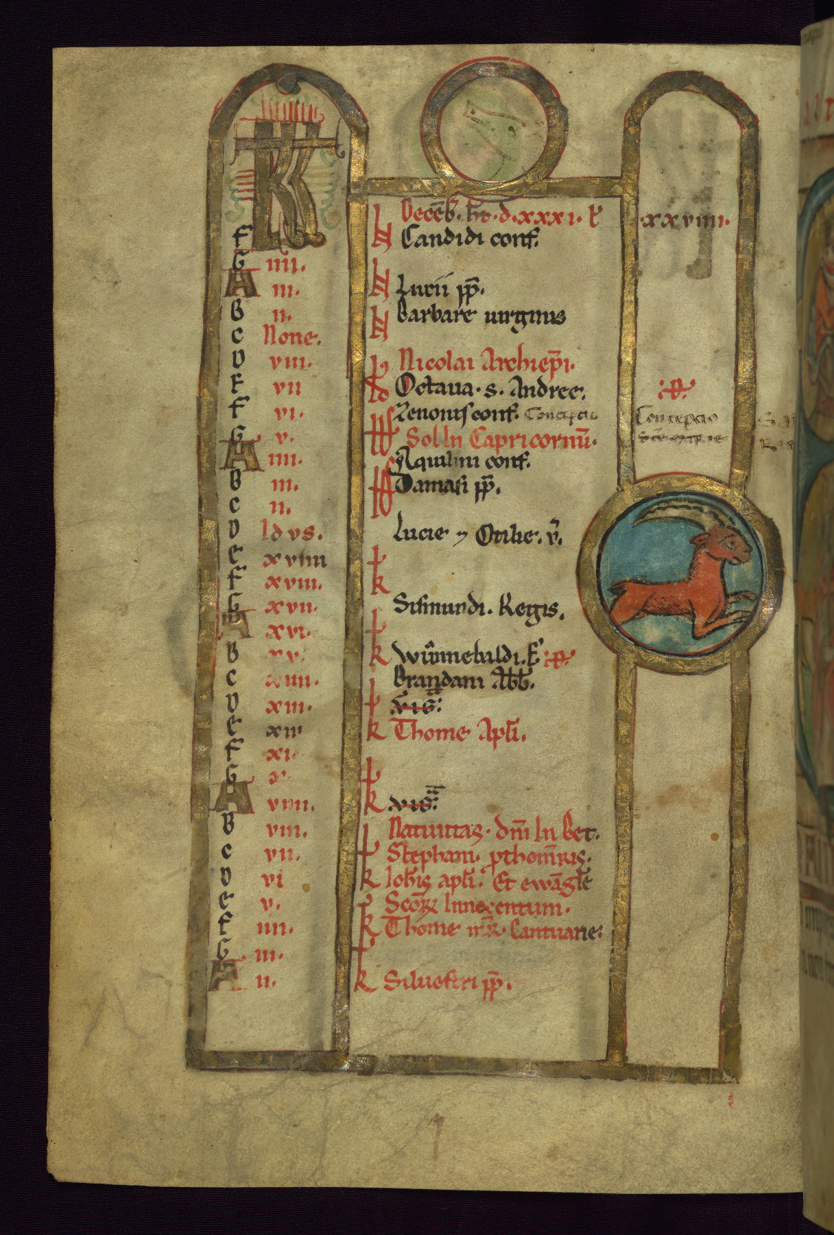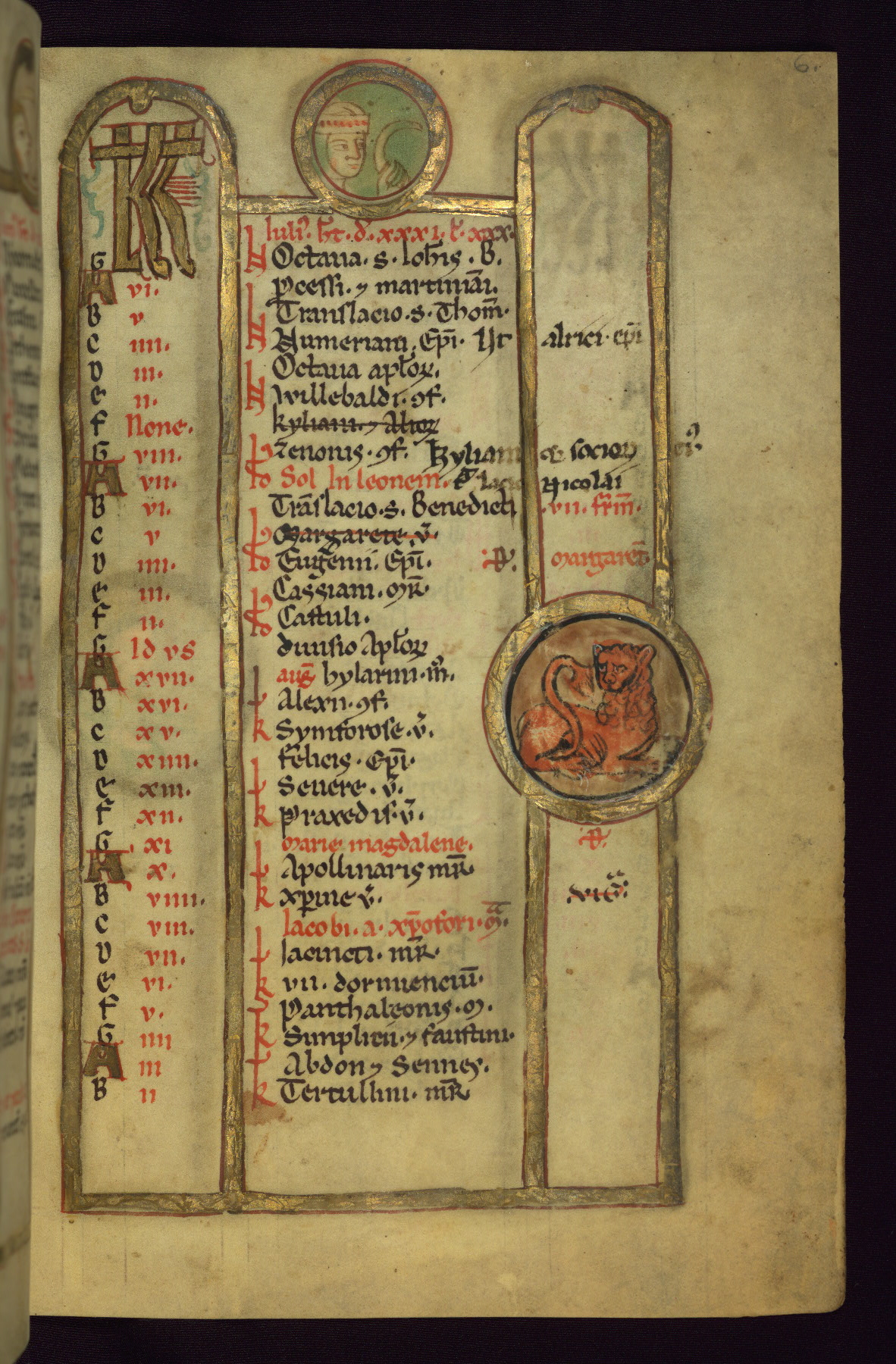 - Contents: Calendar, about 7/8 filled, graded in red and black; Egyptian dates noted with "DE"; contents specific to southern Germany (Augsburg in particular), including Georgius (April 24, specific to Augsburg), feast of church dedication to St. Mary (September 28), St. Othmar (November 16), and St. Afra (August 7); many later additions and necrologies