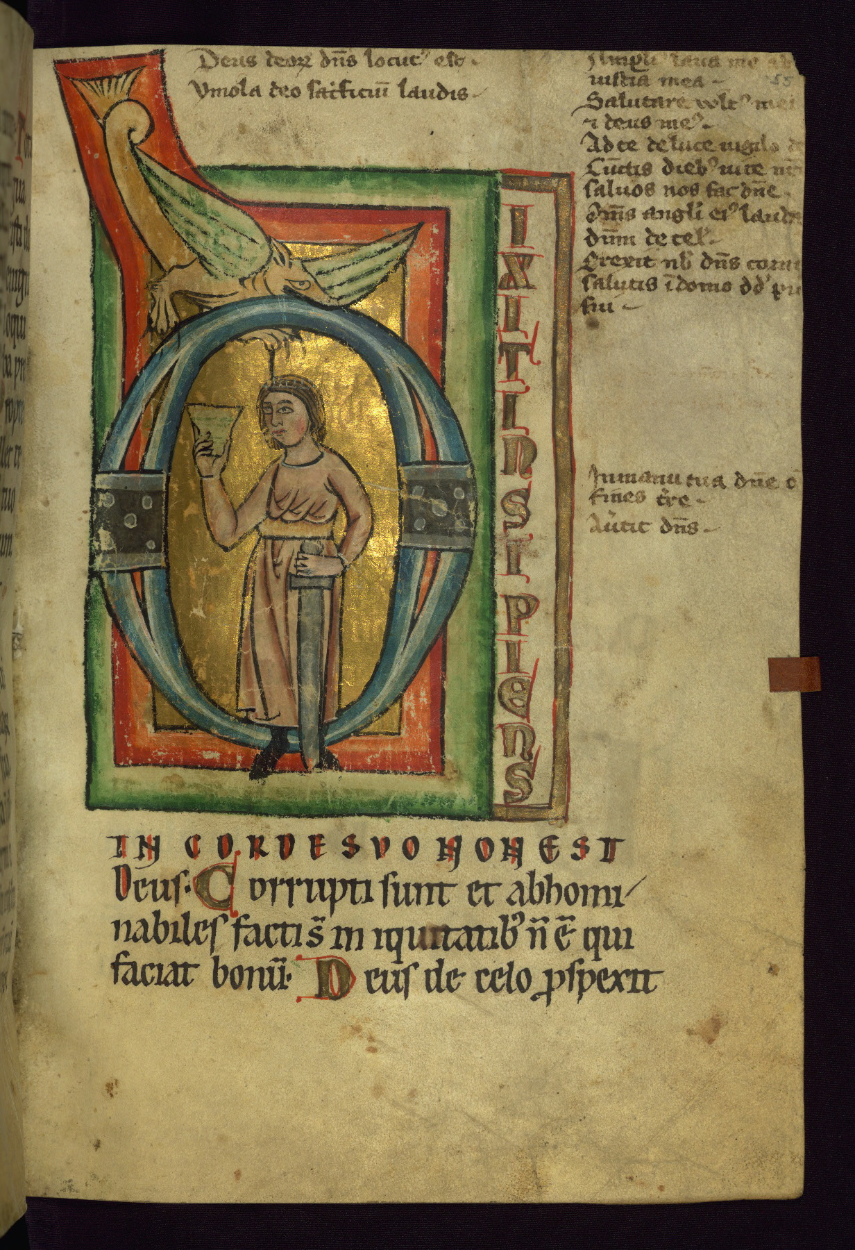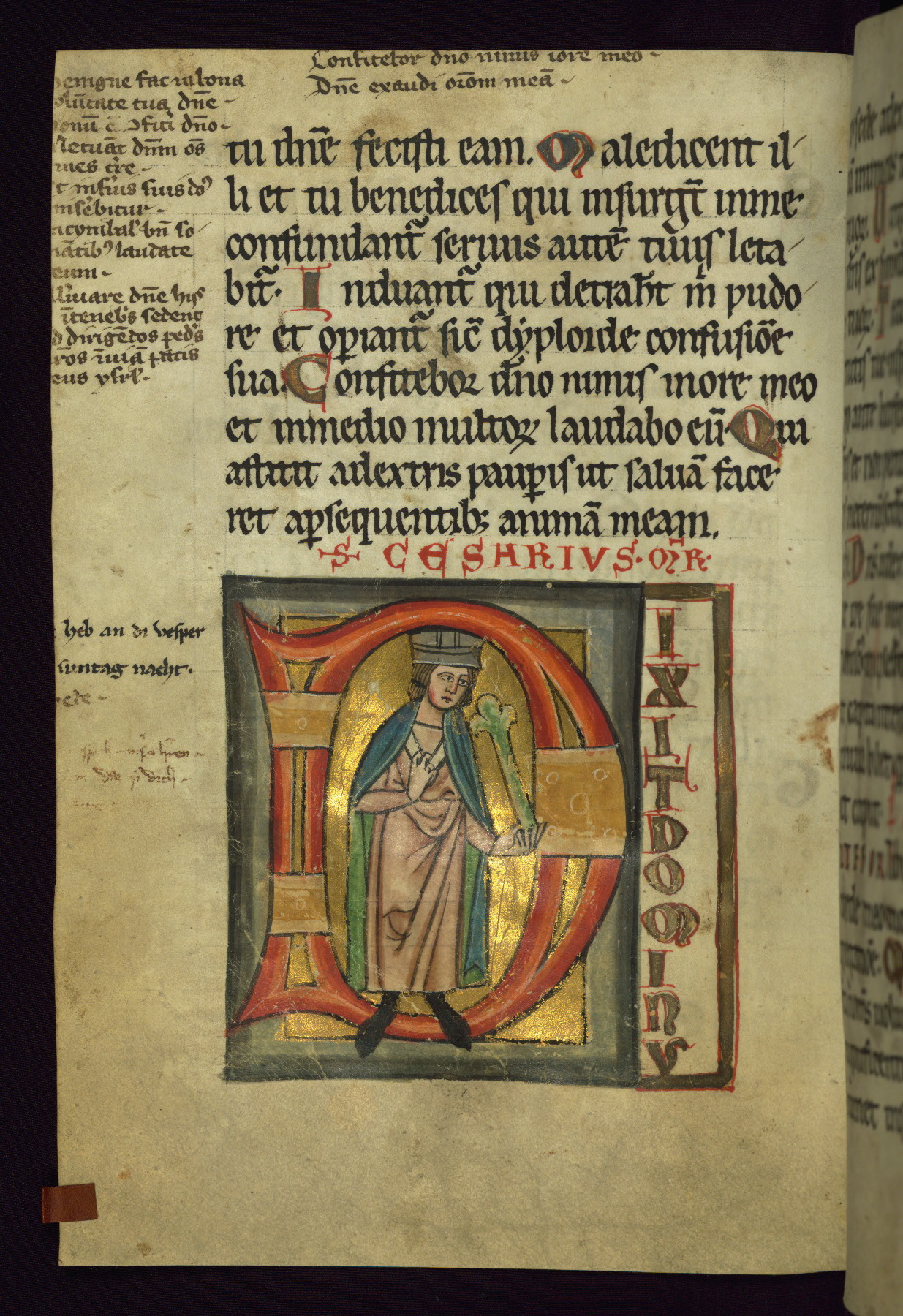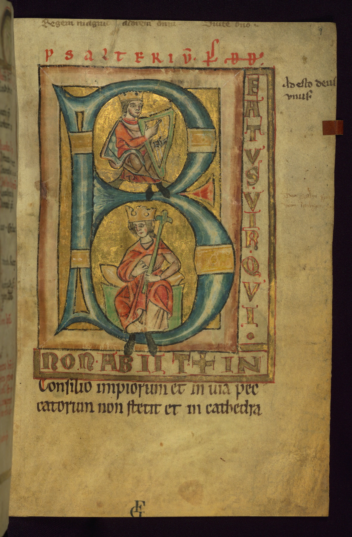 - Title: Initial "B" with David harping and enthroned
