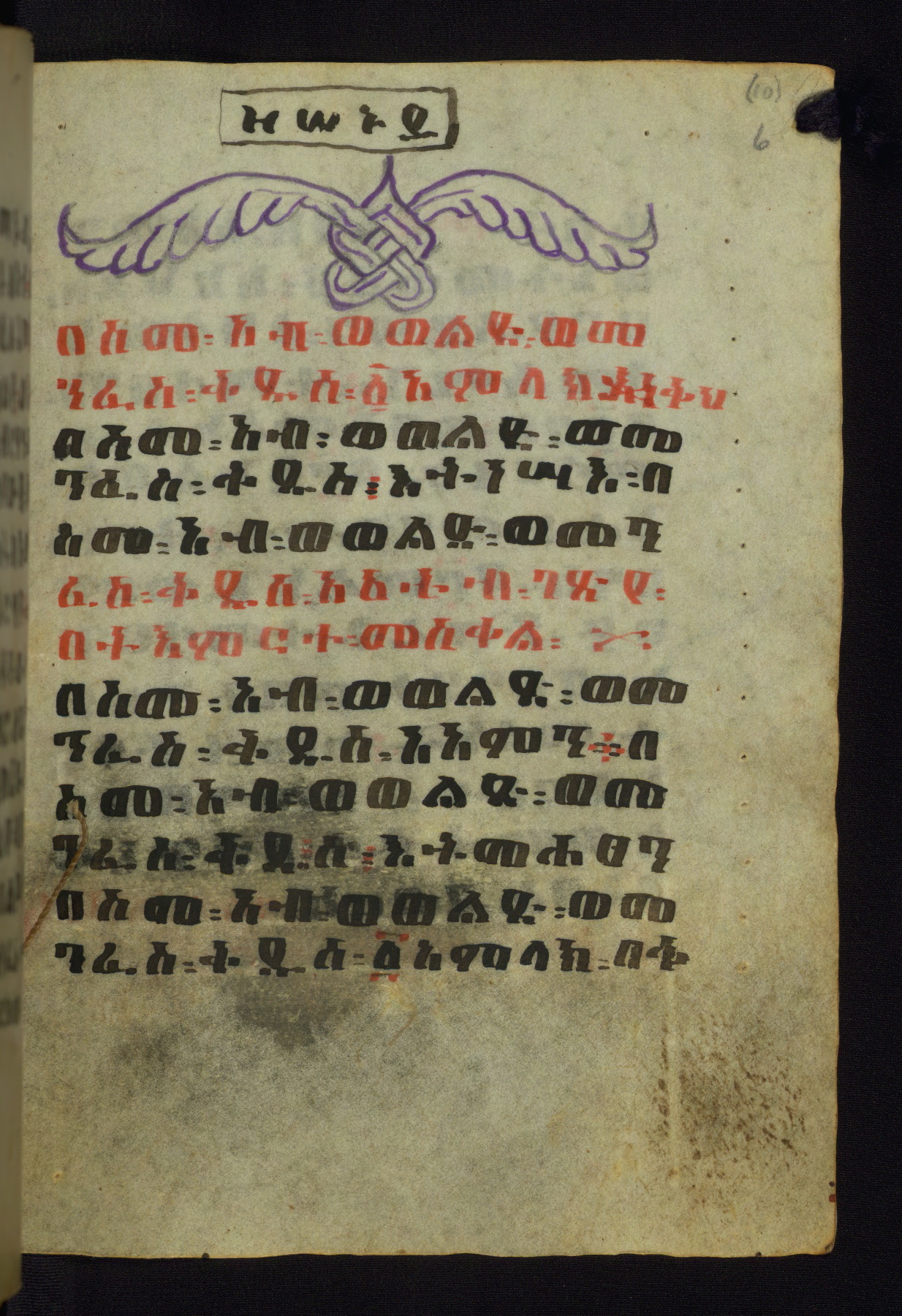 - Incipit: በስመ፡ አብ፡ . . . እነቅህ፡ በስመ፡ አብ፡ . . .እትነሣእ፡ በስመ፡ አብ፡ . . . አአትብ፡ ገጽየ፡ በትእምርተ፡ መስቀል፡ በስመ፡ አብ፡ . . . አአምን፡ በስመ፡ አብ፡ . . .እትመሐፀን፡ በስመ፡ አብ፡ . . . ፩አምላክ፡ . . . (continued on fol. 6v) ተማኅፀንኩ፡ በ፫ገጽ፡ ወበ፩መለኮት፡