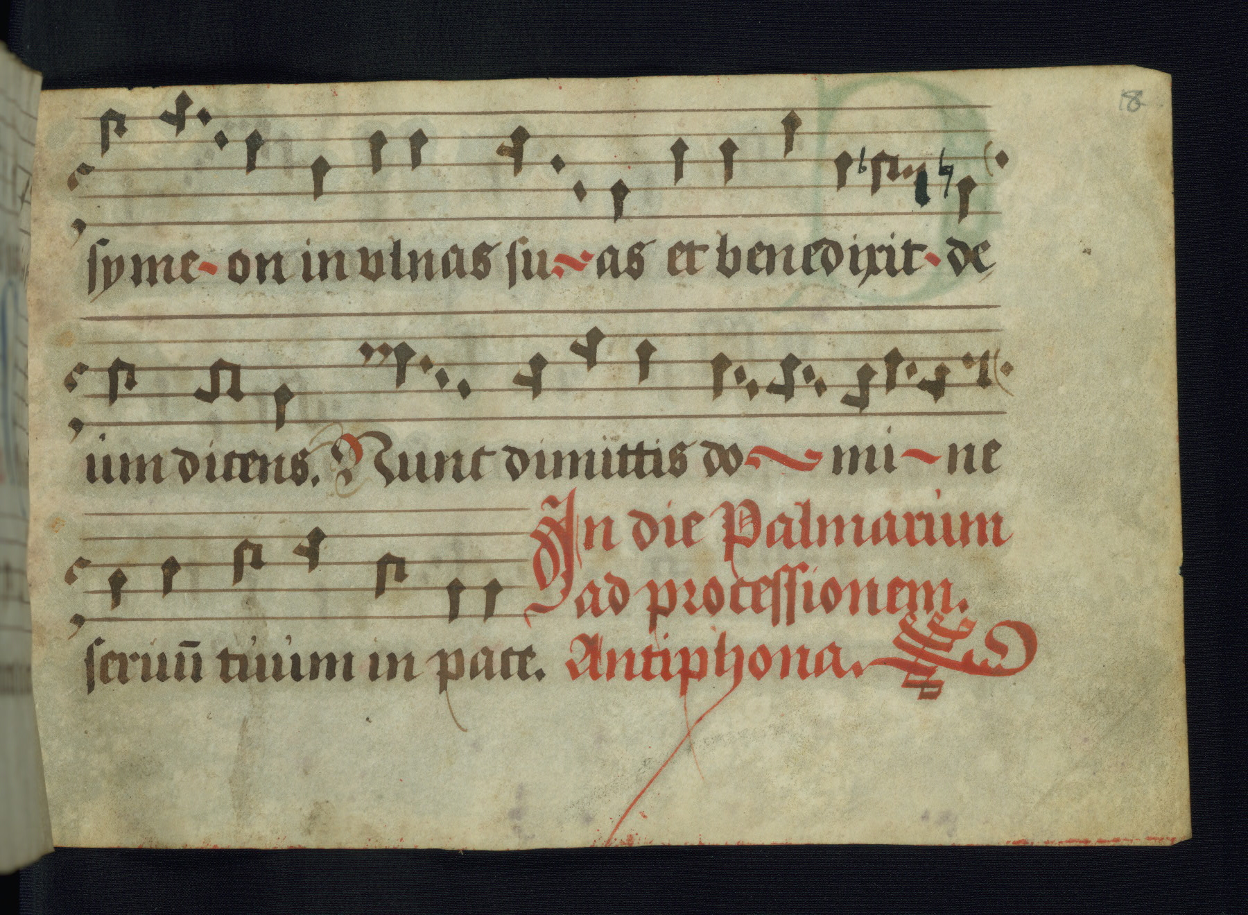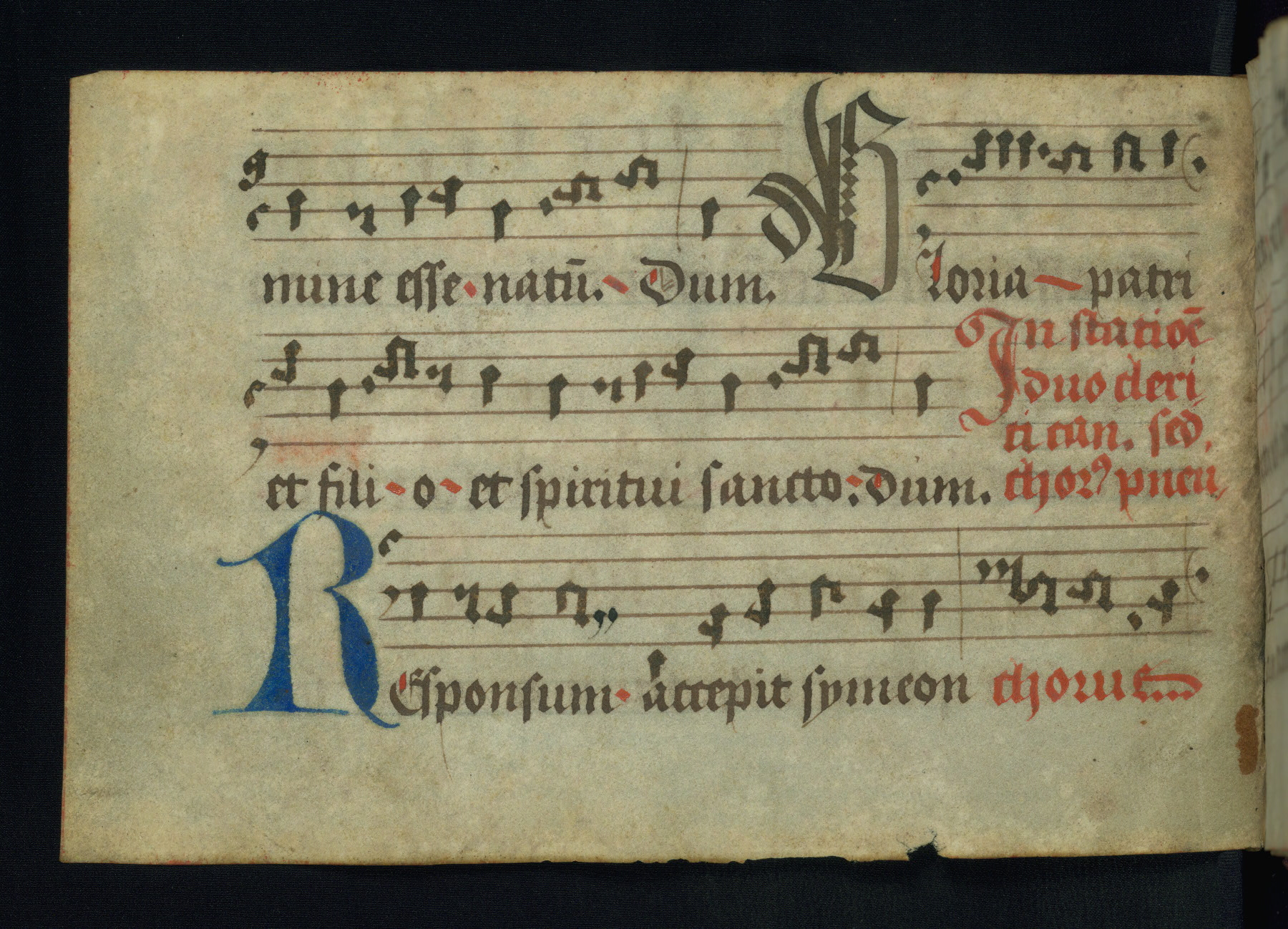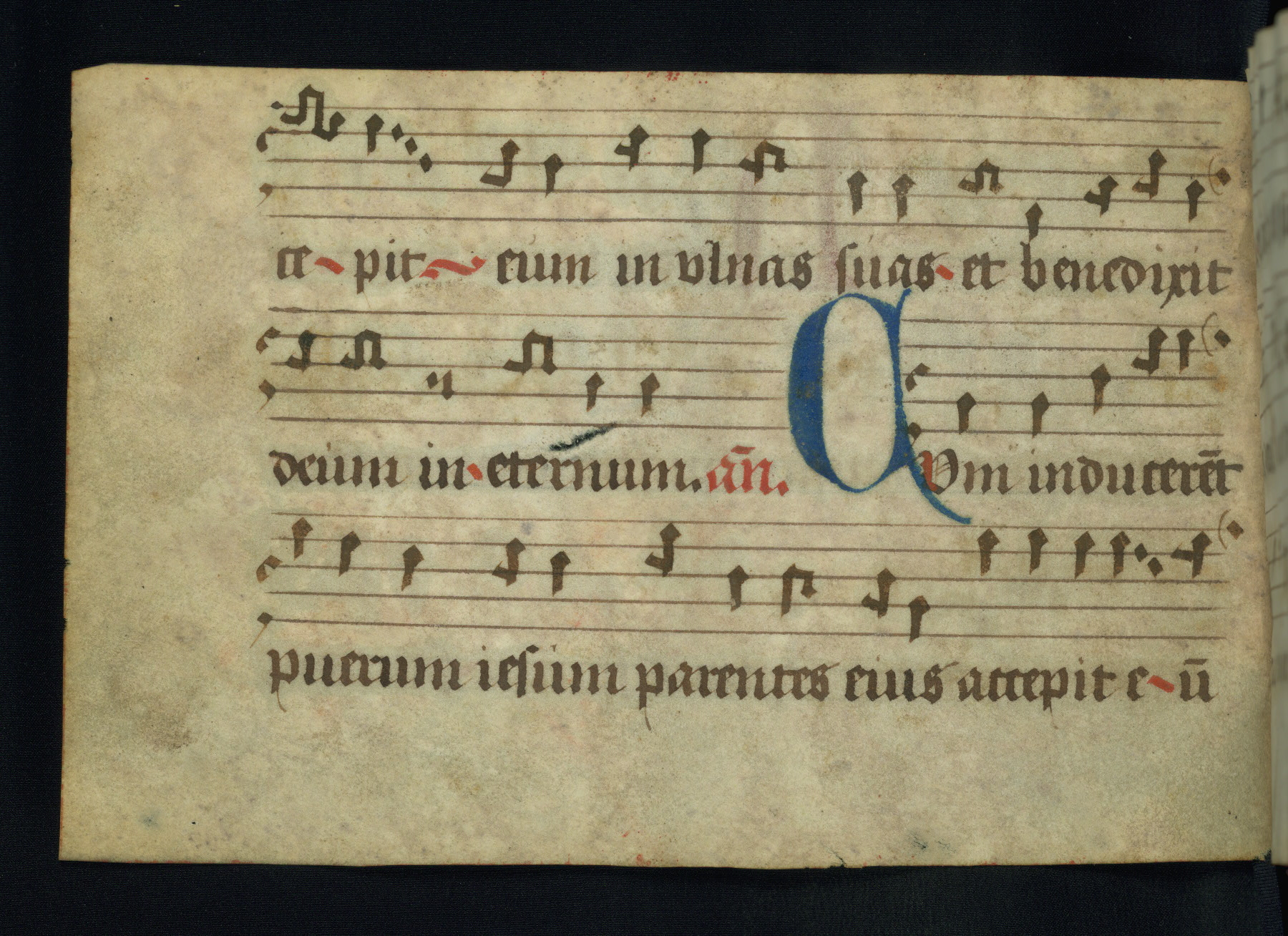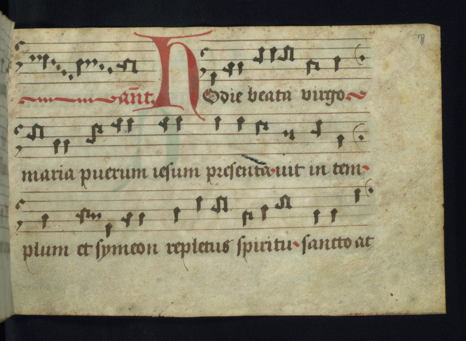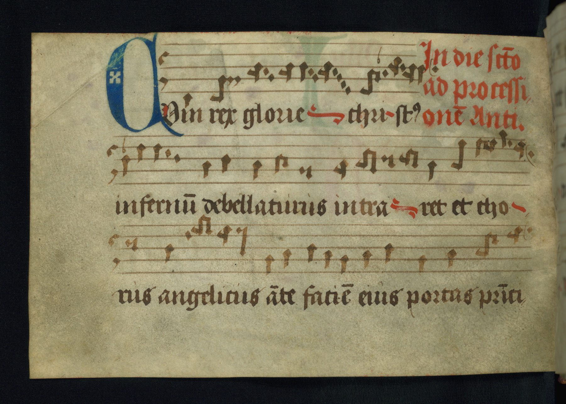 This manuscript contains liturgical music to be sung during processions. It is exceptional because of its "album" format (10 x 14.5 cm), which is in part the result of a severe cropping of the folios. The book was made in the late fifteenth or early sixteenth century in Germany. Its continued use is evident from the seventeenth- or eighteenth-century addition of paper folios containing prayers and music. Music is written in Gothic notation on three five-line staves per folio. The first folio is illuminated with a foliate initial for the Feast of the Purification of the Virgin.