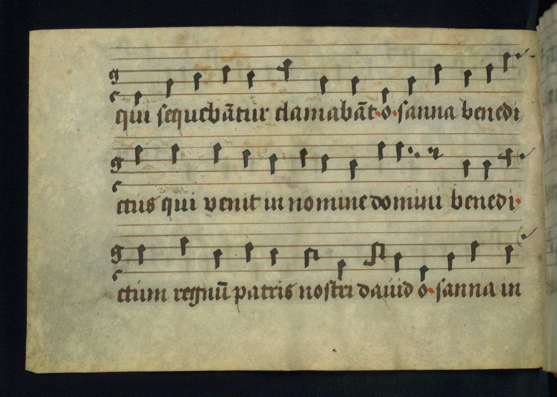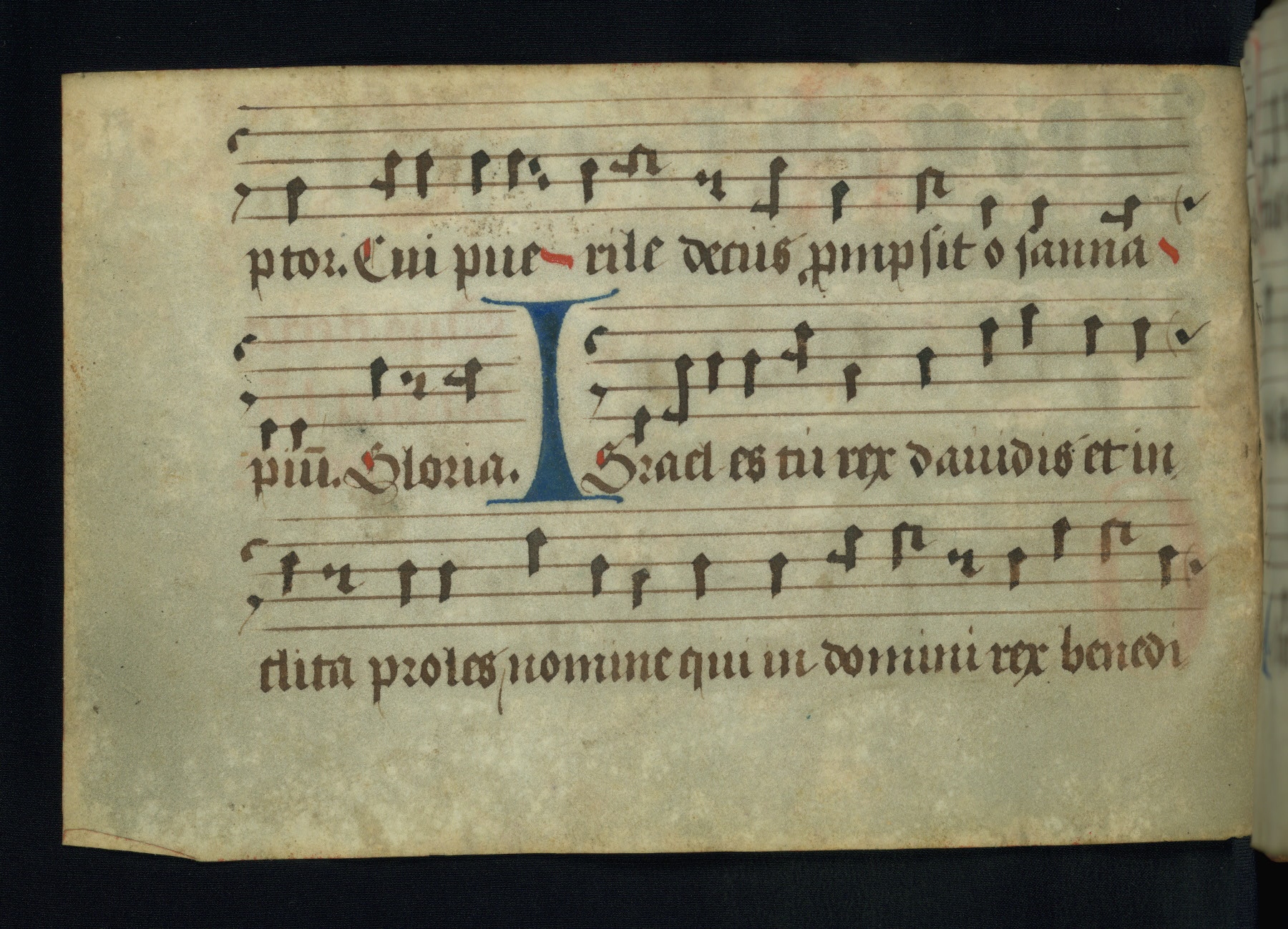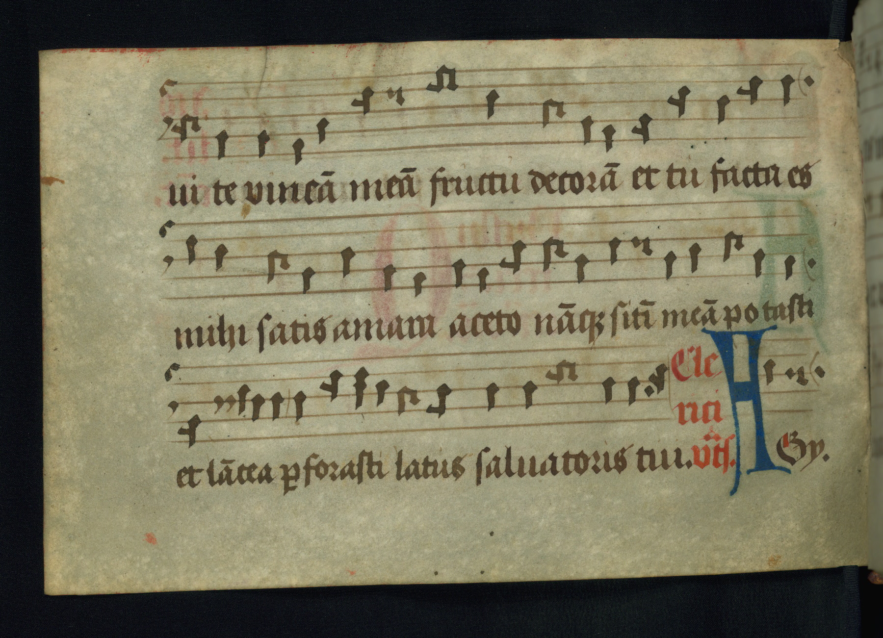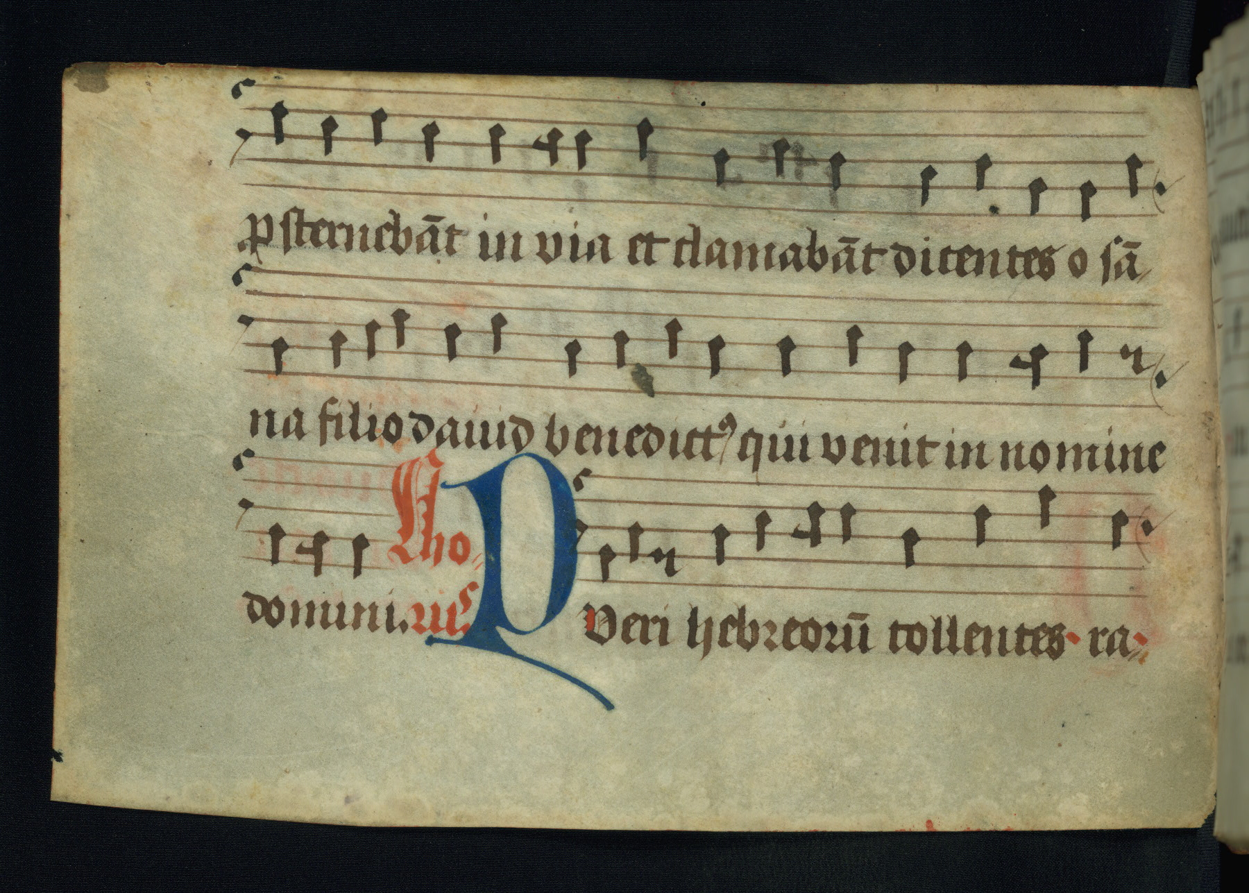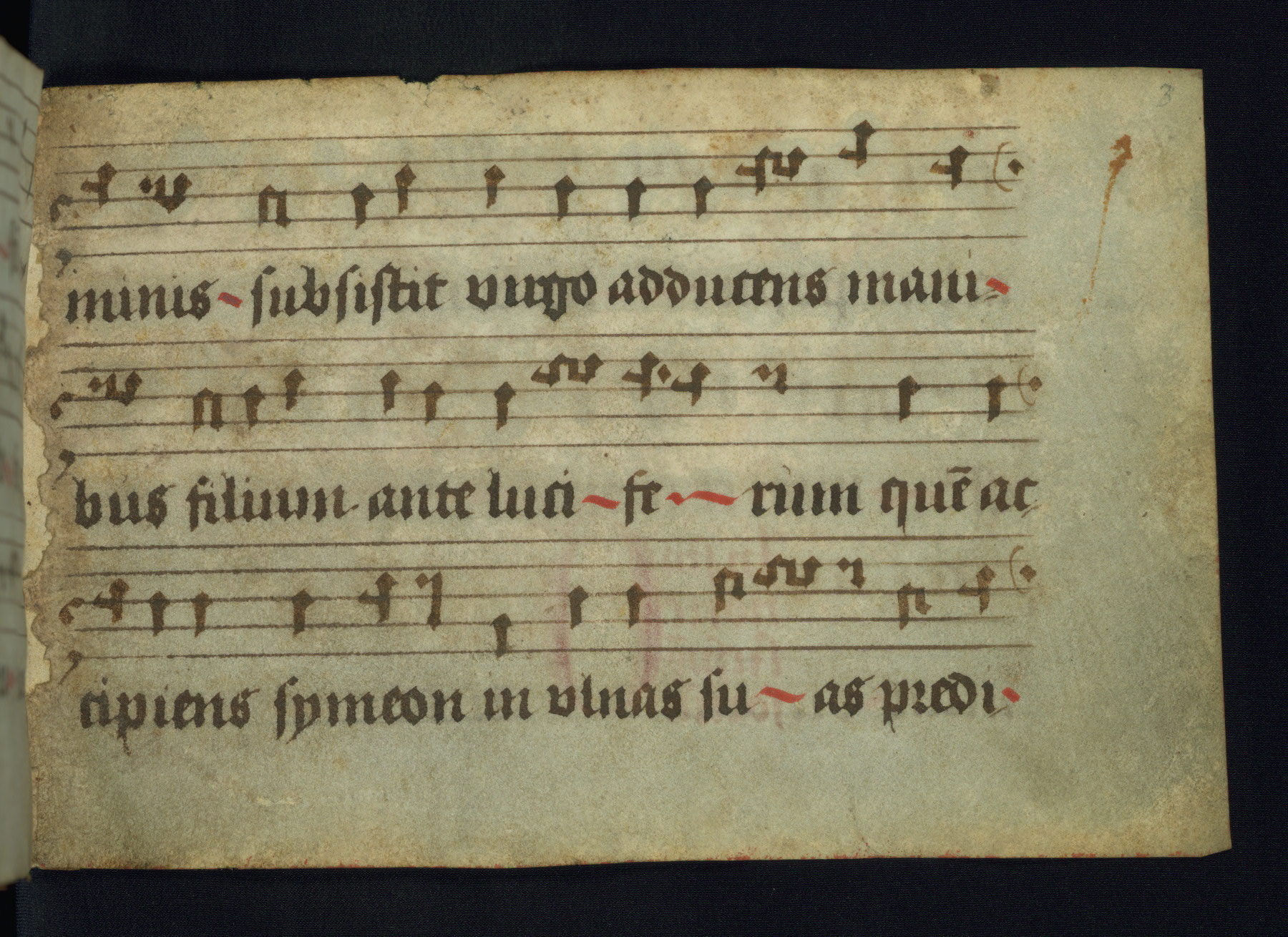 This manuscript contains liturgical music to be sung during processions. It is exceptional because of its "album" format (10 x 14.5 cm), which is in part the result of a severe cropping of the folios. The book was made in the late fifteenth or early sixteenth century in Germany. Its continued use is evident from the seventeenth- or eighteenth-century addition of paper folios containing prayers and music. Music is written in Gothic notation on three five-line staves per folio. The first folio is illuminated with a foliate initial for the Feast of the Purification of the Virgin.