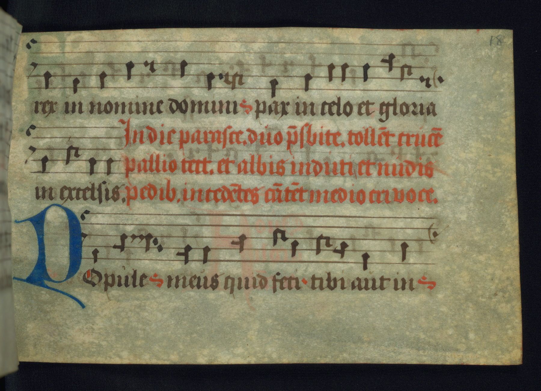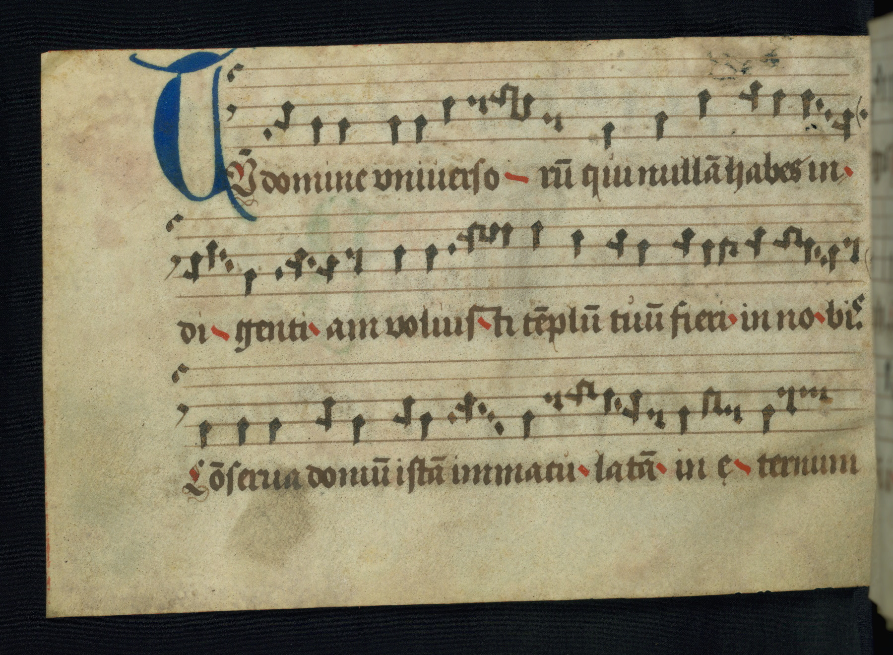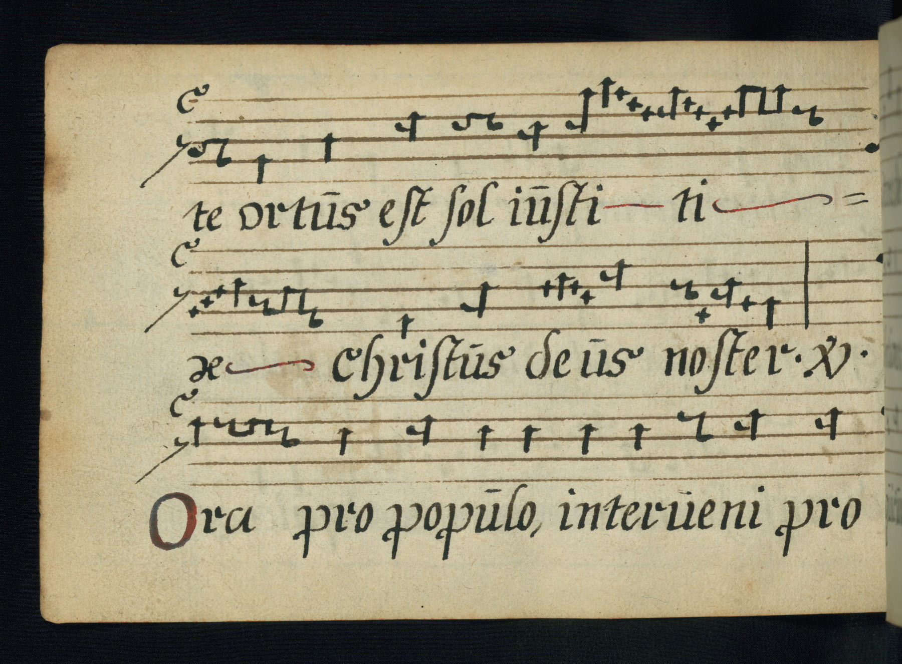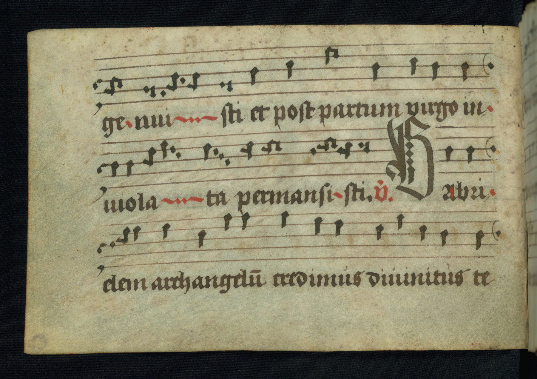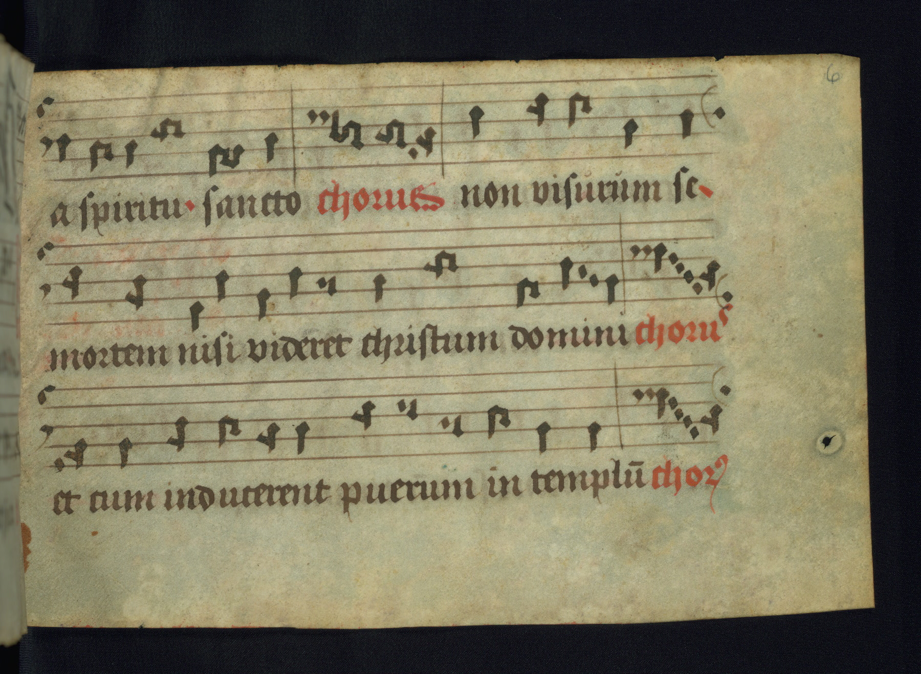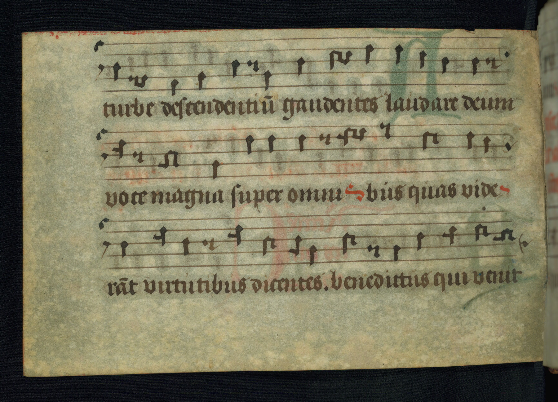 This manuscript contains liturgical music to be sung during processions. It is exceptional because of its "album" format (10 x 14.5 cm), which is in part the result of a severe cropping of the folios. The book was made in the late fifteenth or early sixteenth century in Germany. Its continued use is evident from the seventeenth- or eighteenth-century addition of paper folios containing prayers and music. Music is written in Gothic notation on three five-line staves per folio. The first folio is illuminated with a foliate initial for the Feast of the Purification of the Virgin.