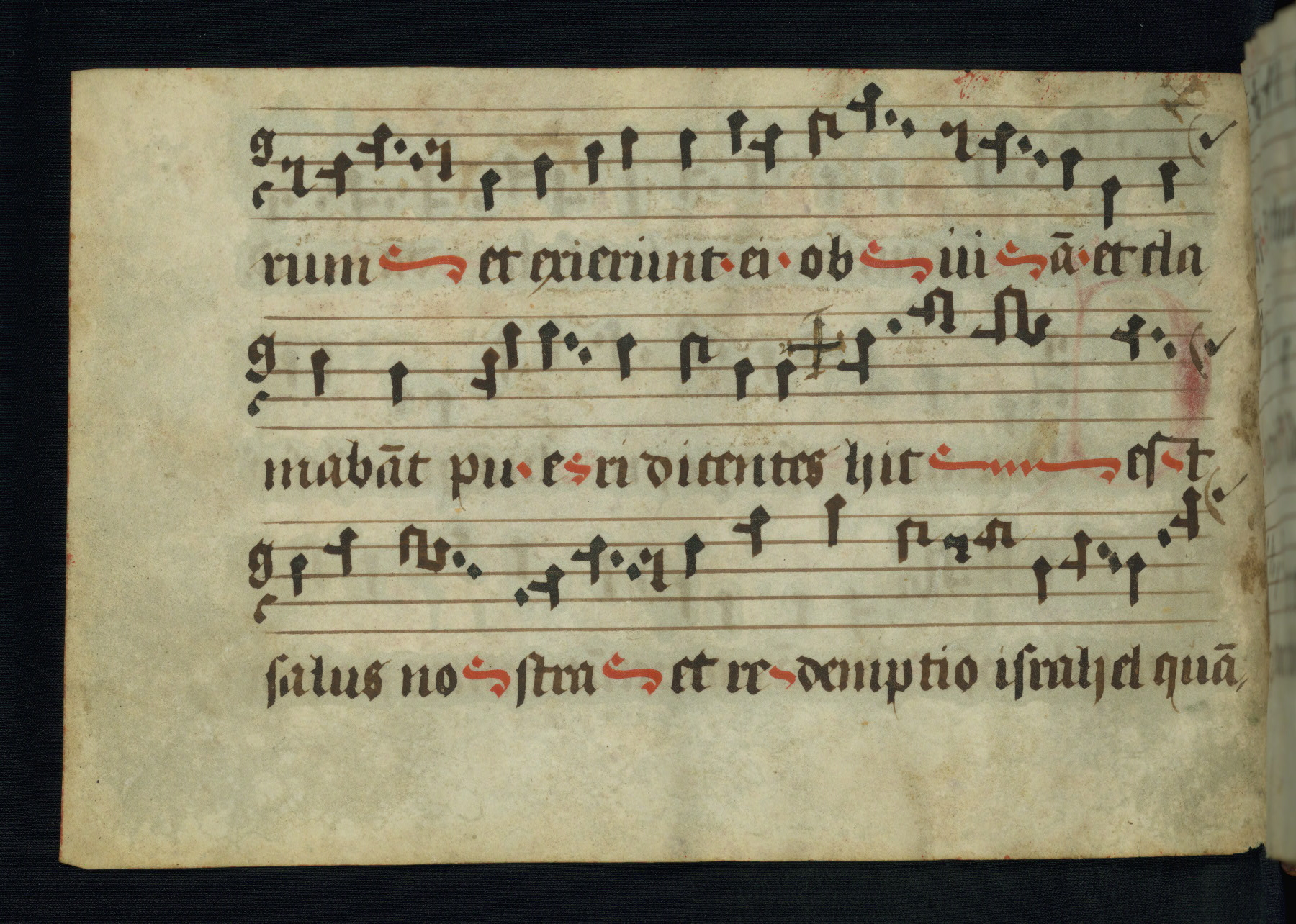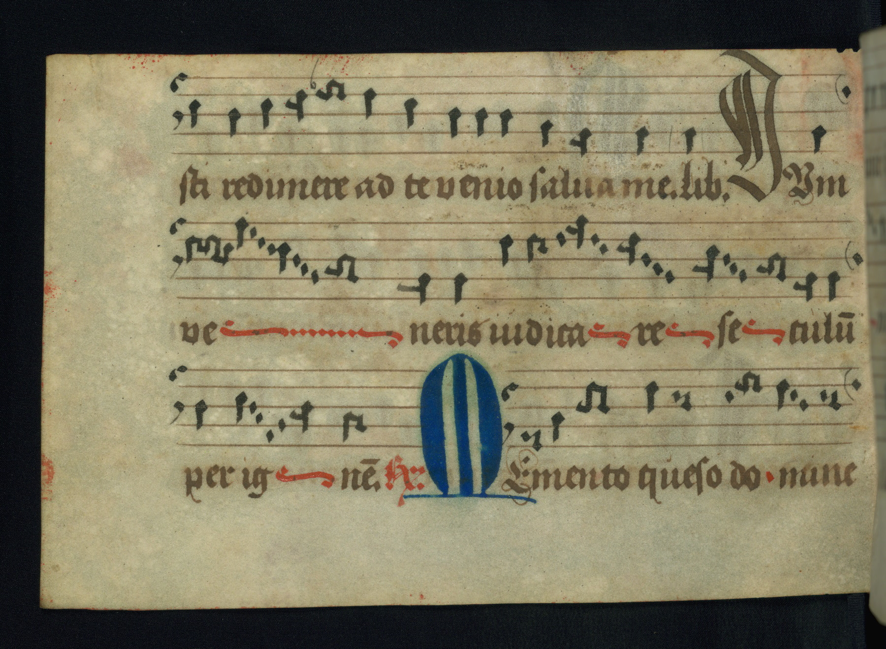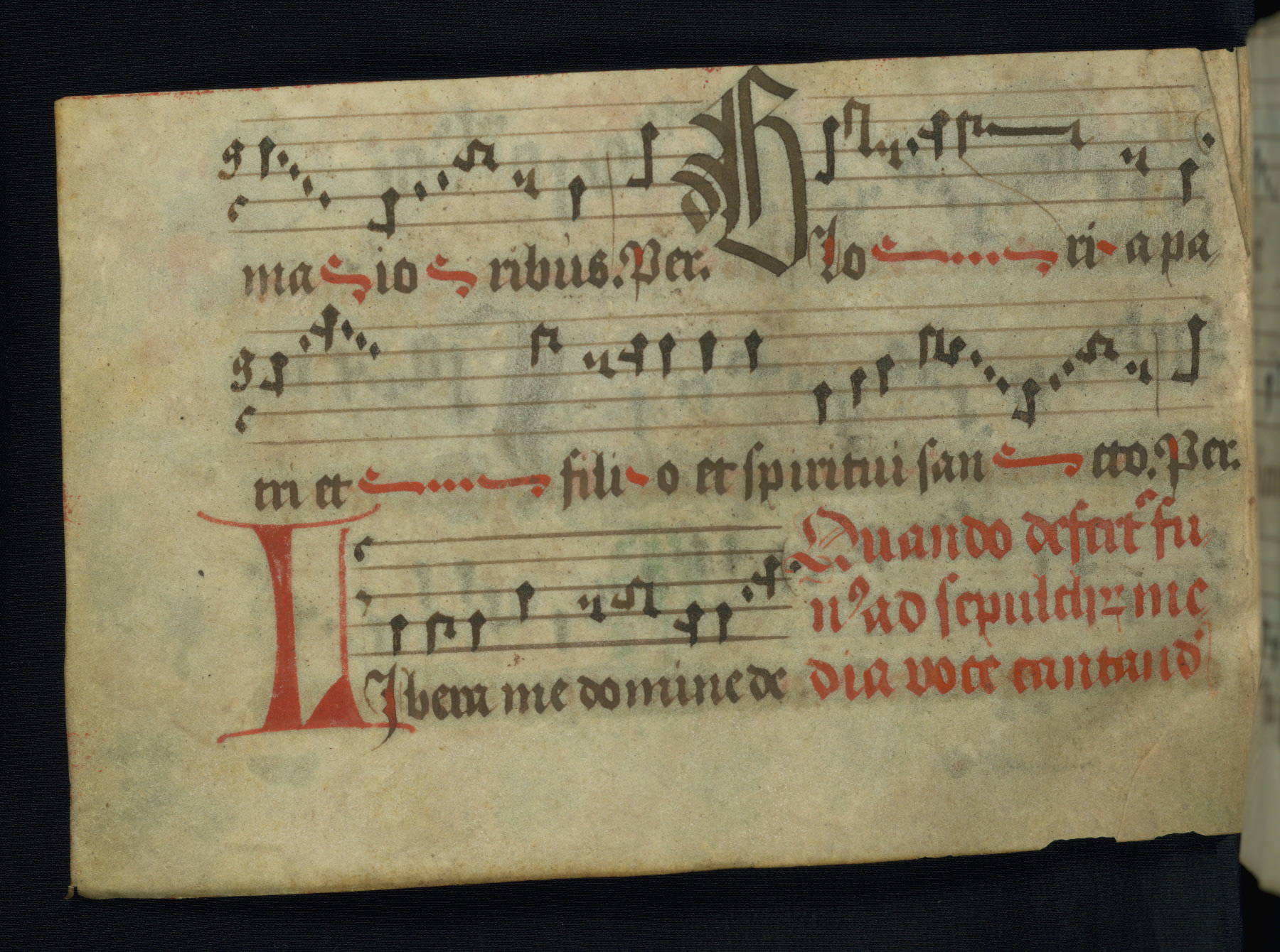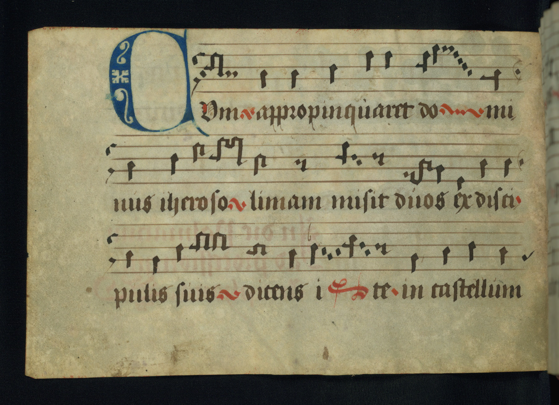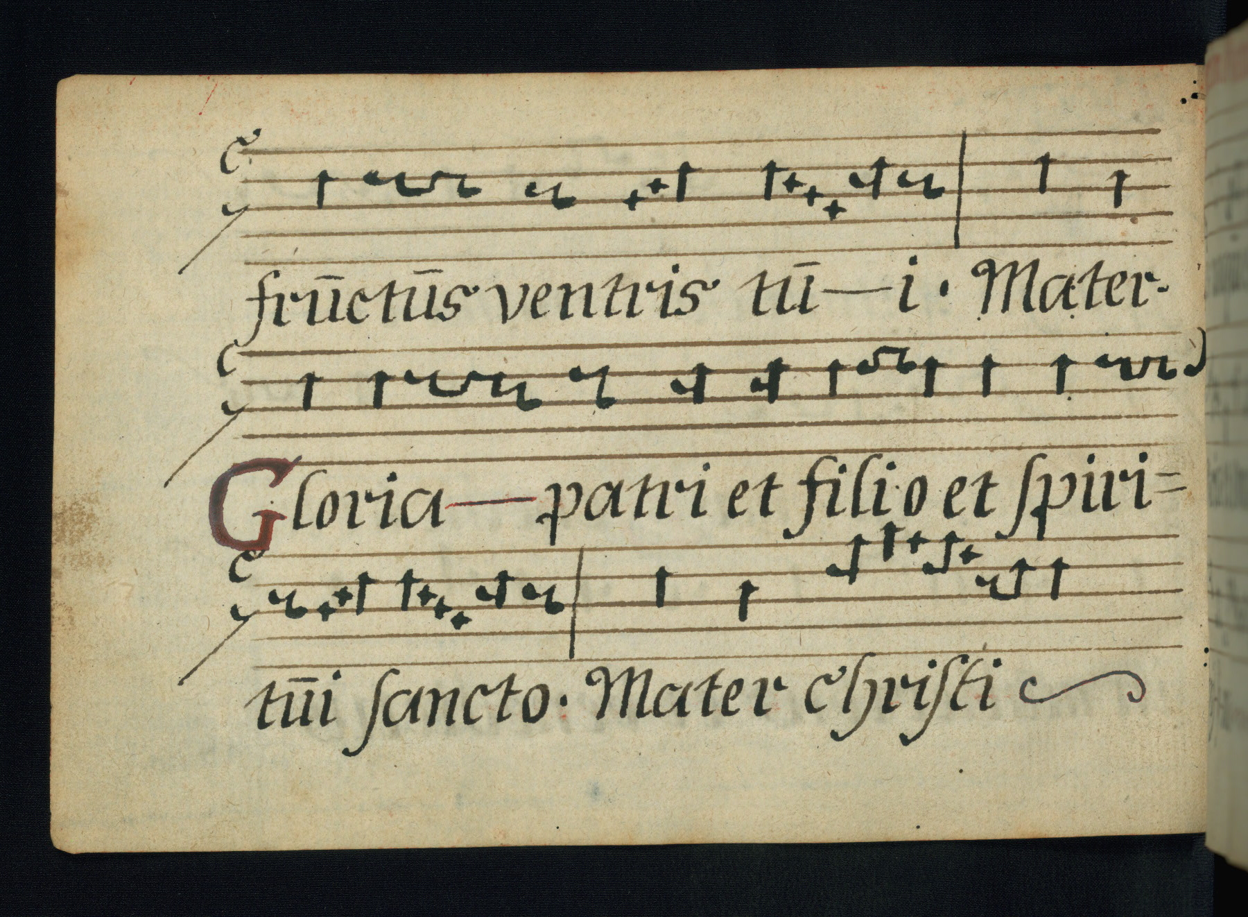This manuscript contains liturgical music to be sung during processions. It is exceptional because of its "album" format (10 x 14.5 cm), which is in part the result of a severe cropping of the folios. The book was made in the late fifteenth or early sixteenth century in Germany. Its continued use is evident from the seventeenth- or eighteenth-century addition of paper folios containing prayers and music. Music is written in Gothic notation on three five-line staves per folio. The first folio is illuminated with a foliate initial for the Feast of the Purification of the Virgin.