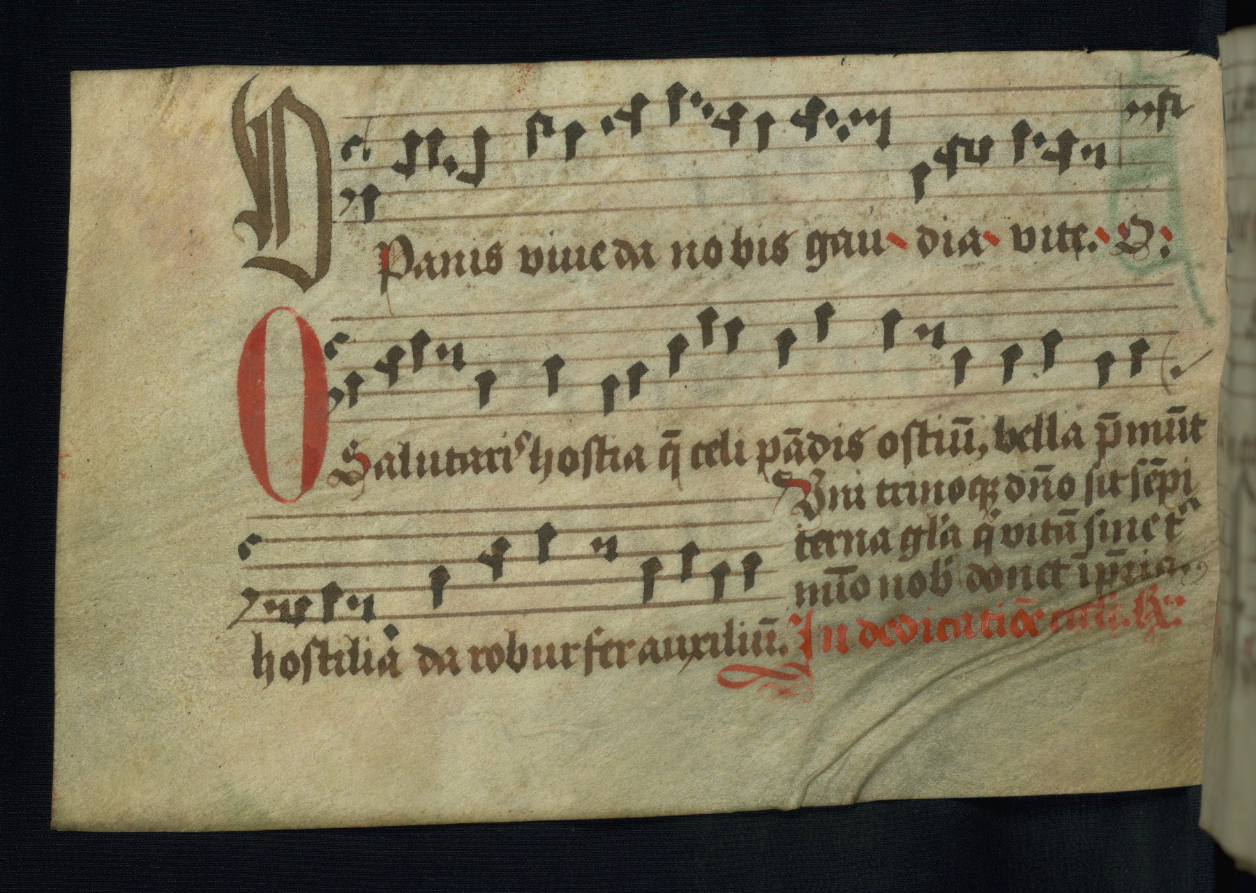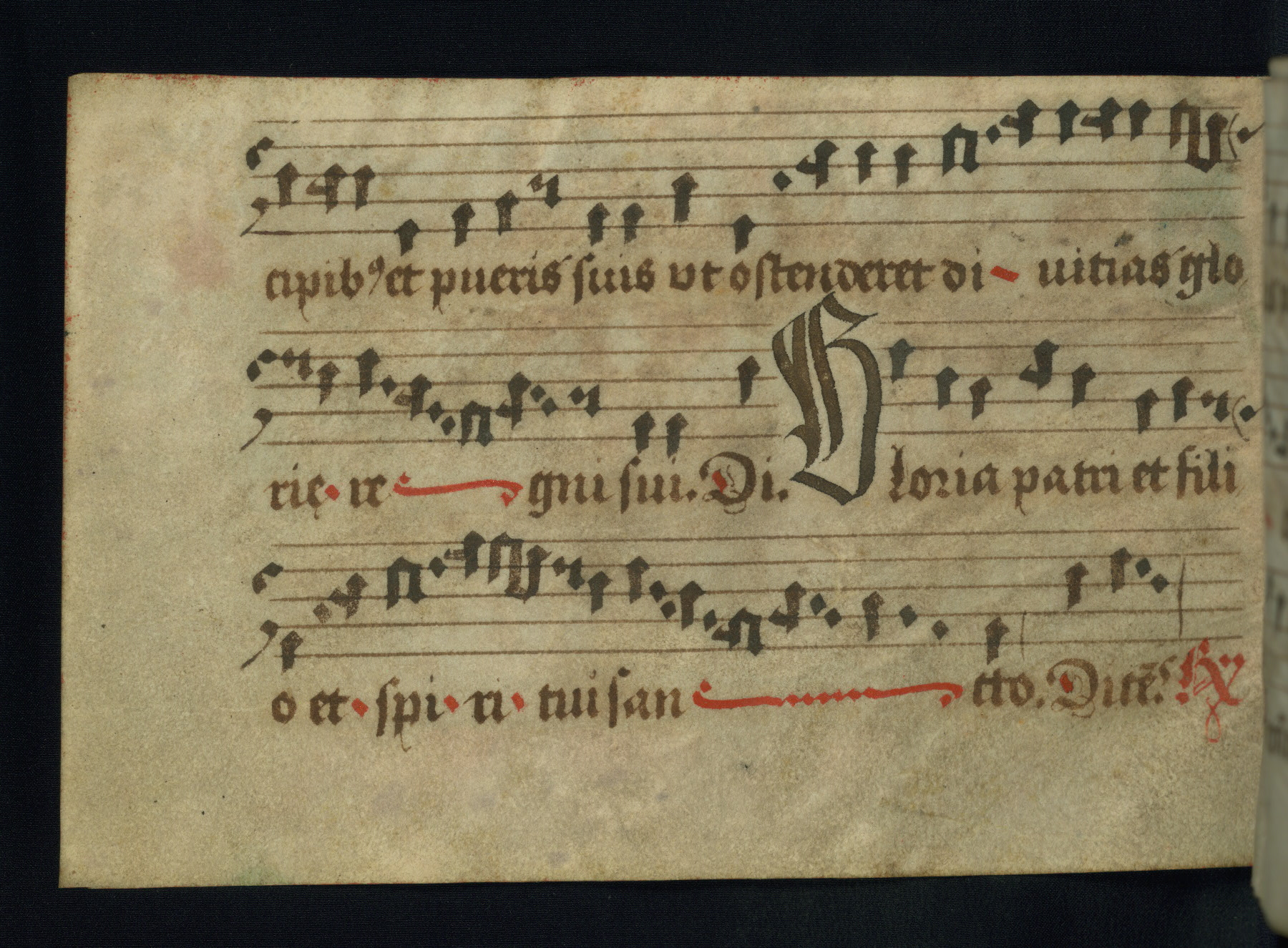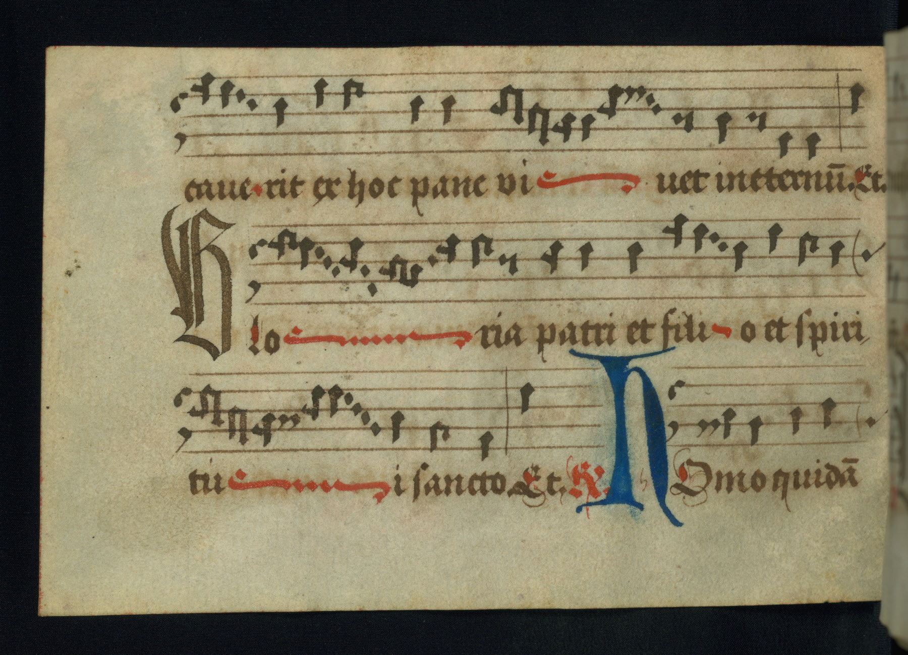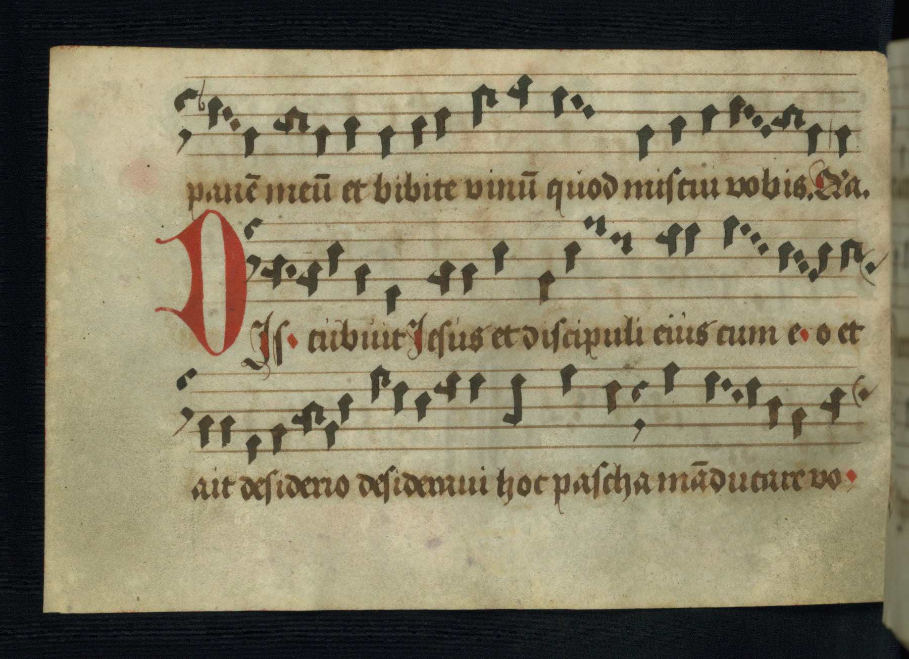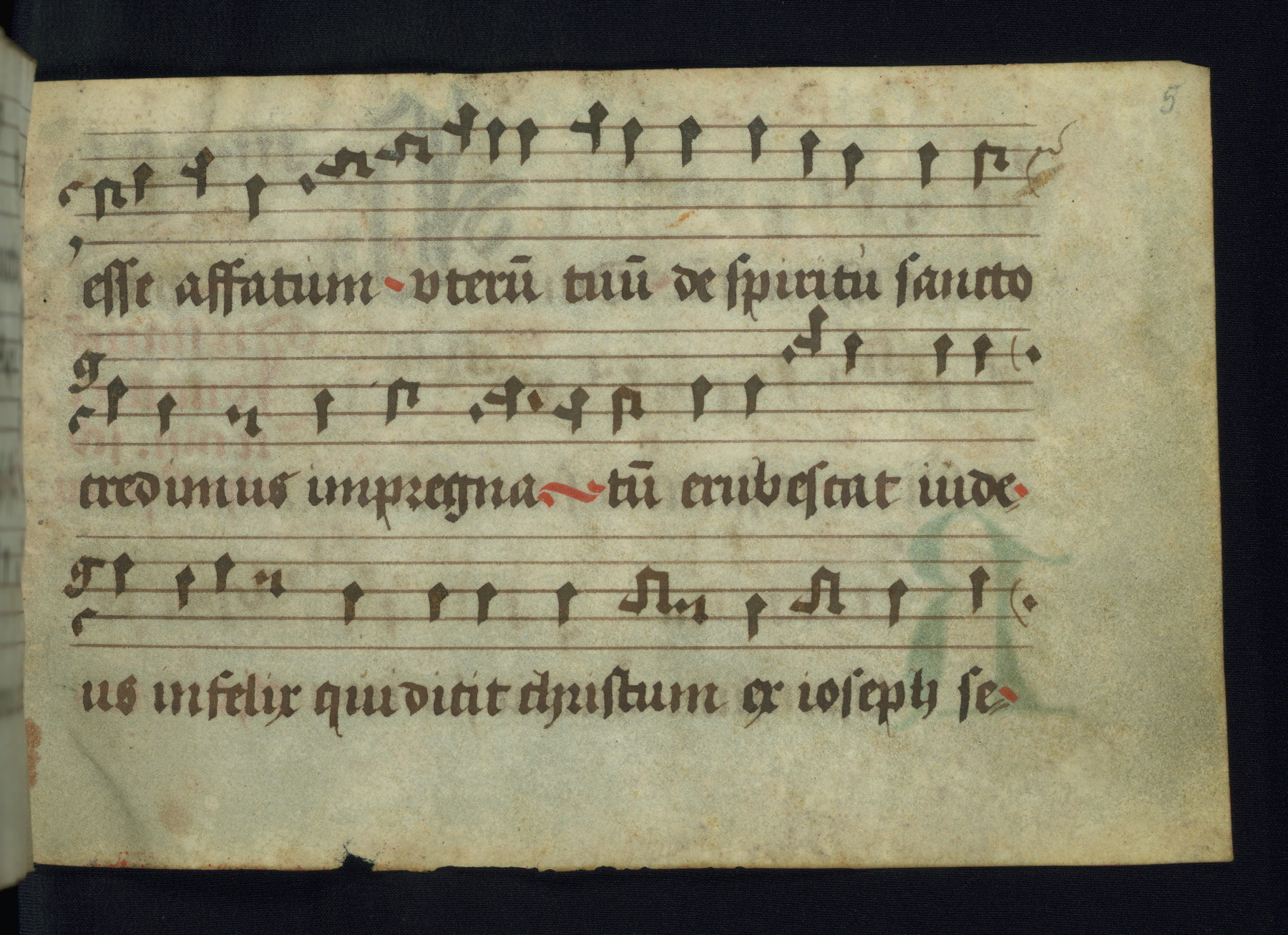 This manuscript contains liturgical music to be sung during processions. It is exceptional because of its "album" format (10 x 14.5 cm), which is in part the result of a severe cropping of the folios. The book was made in the late fifteenth or early sixteenth century in Germany. Its continued use is evident from the seventeenth- or eighteenth-century addition of paper folios containing prayers and music. Music is written in Gothic notation on three five-line staves per folio. The first folio is illuminated with a foliate initial for the Feast of the Purification of the Virgin.