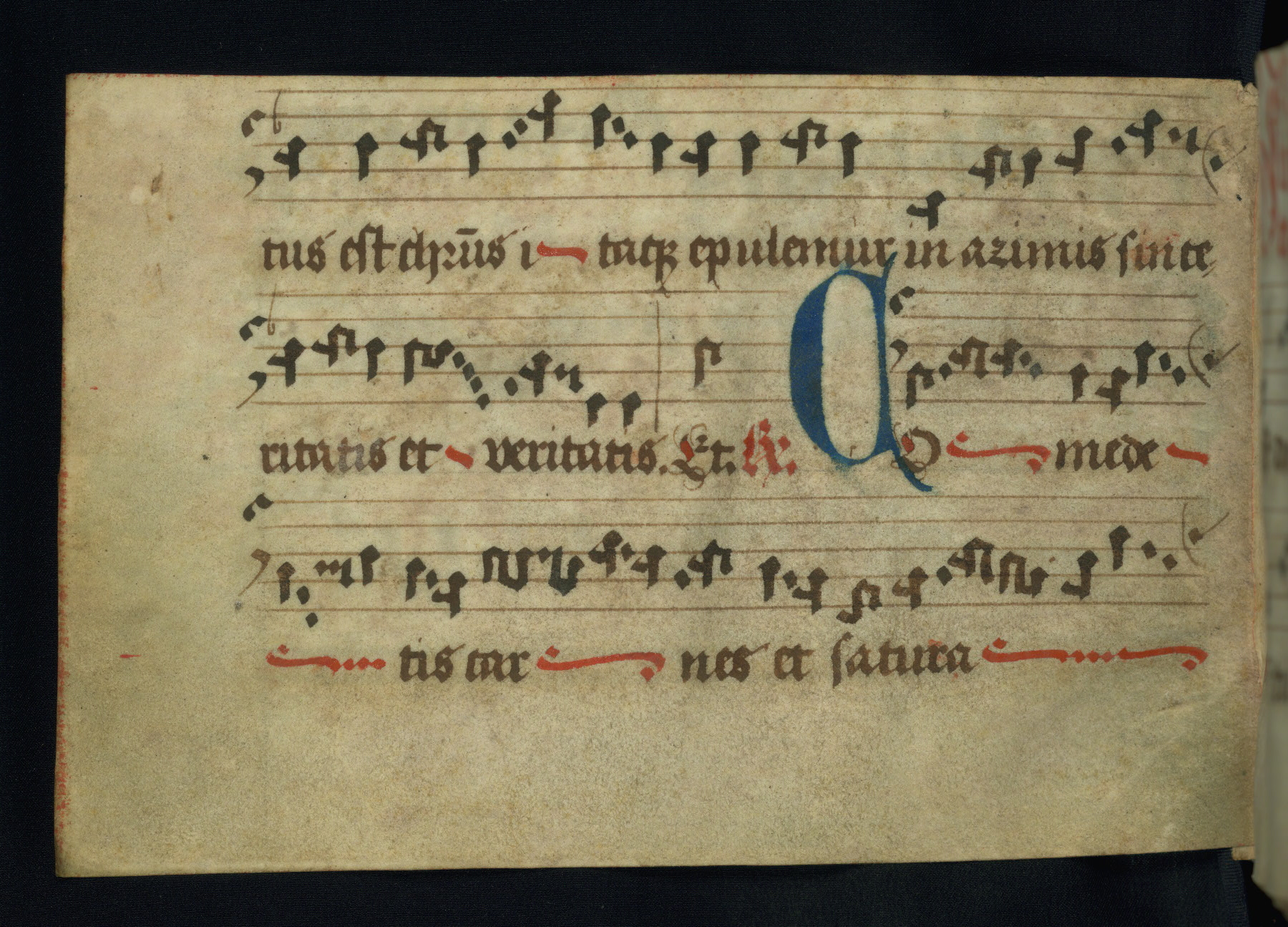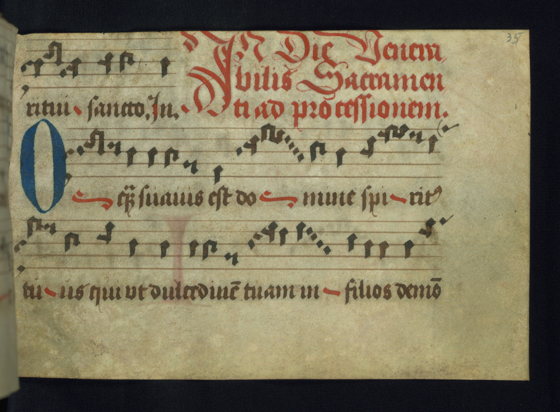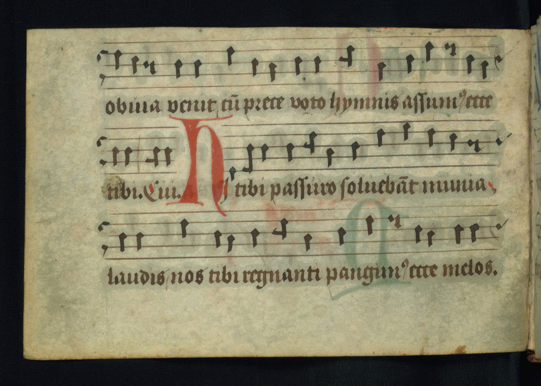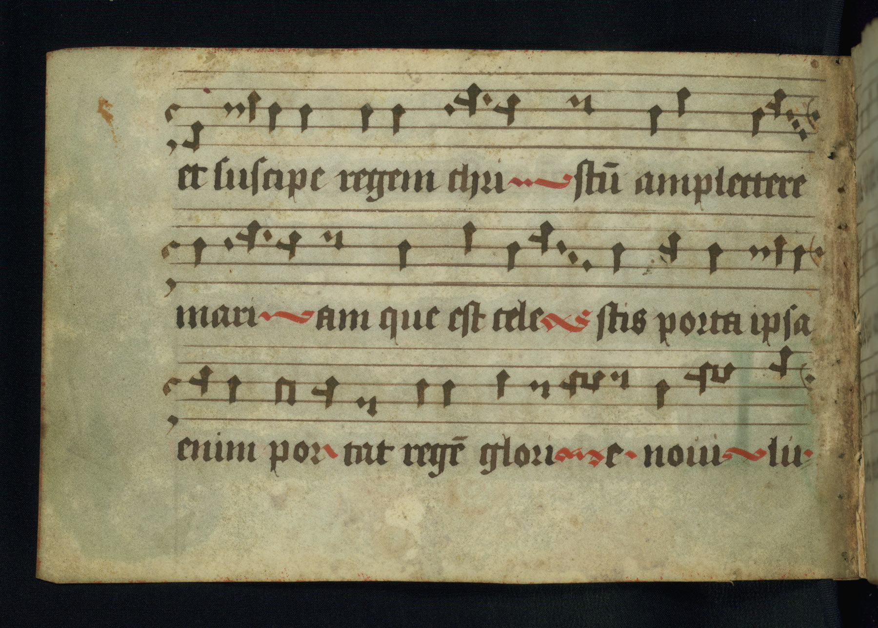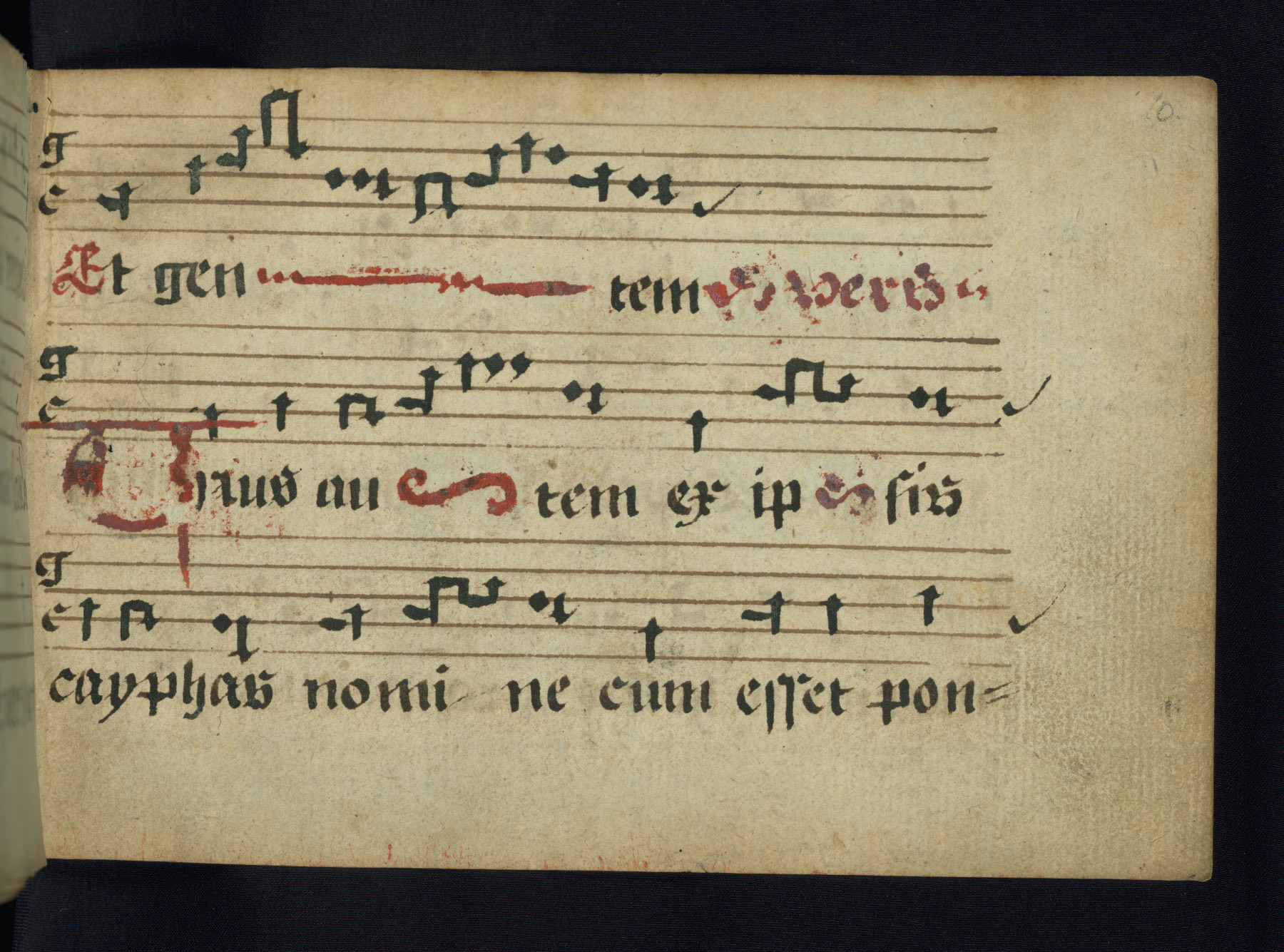 This manuscript contains liturgical music to be sung during processions. It is exceptional because of its "album" format (10 x 14.5 cm), which is in part the result of a severe cropping of the folios. The book was made in the late fifteenth or early sixteenth century in Germany. Its continued use is evident from the seventeenth- or eighteenth-century addition of paper folios containing prayers and music. Music is written in Gothic notation on three five-line staves per folio. The first folio is illuminated with a foliate initial for the Feast of the Purification of the Virgin.