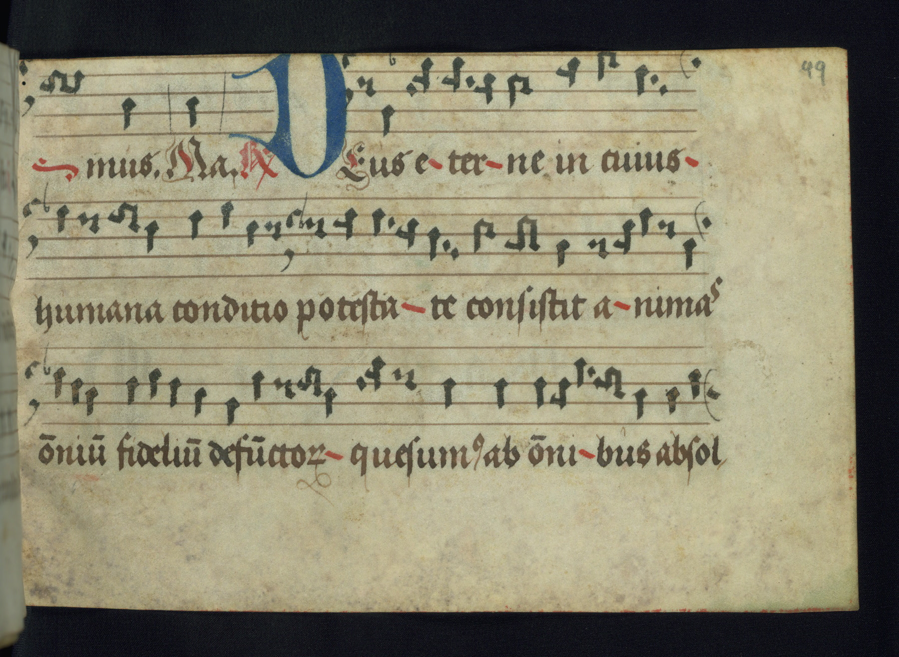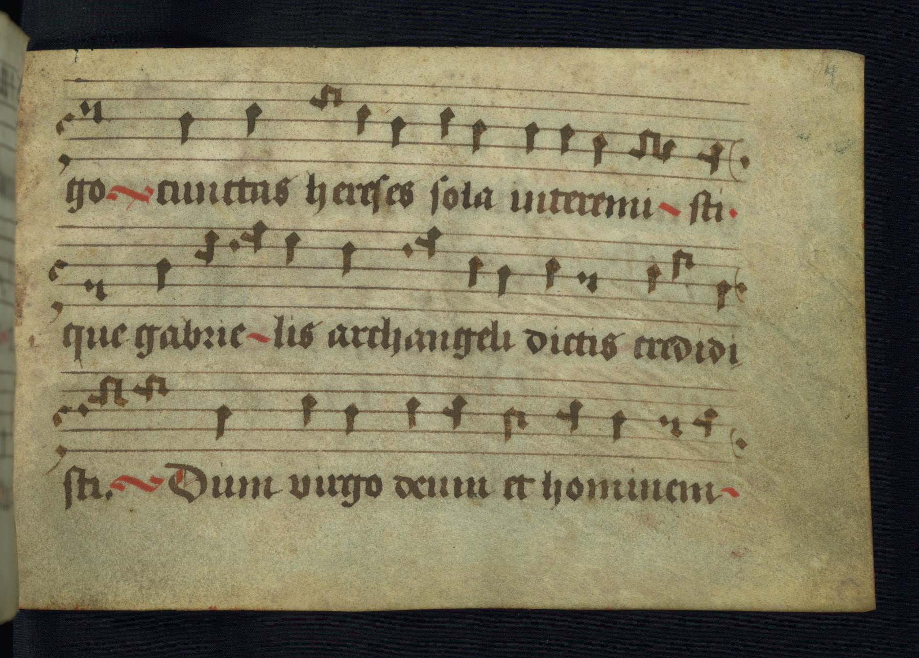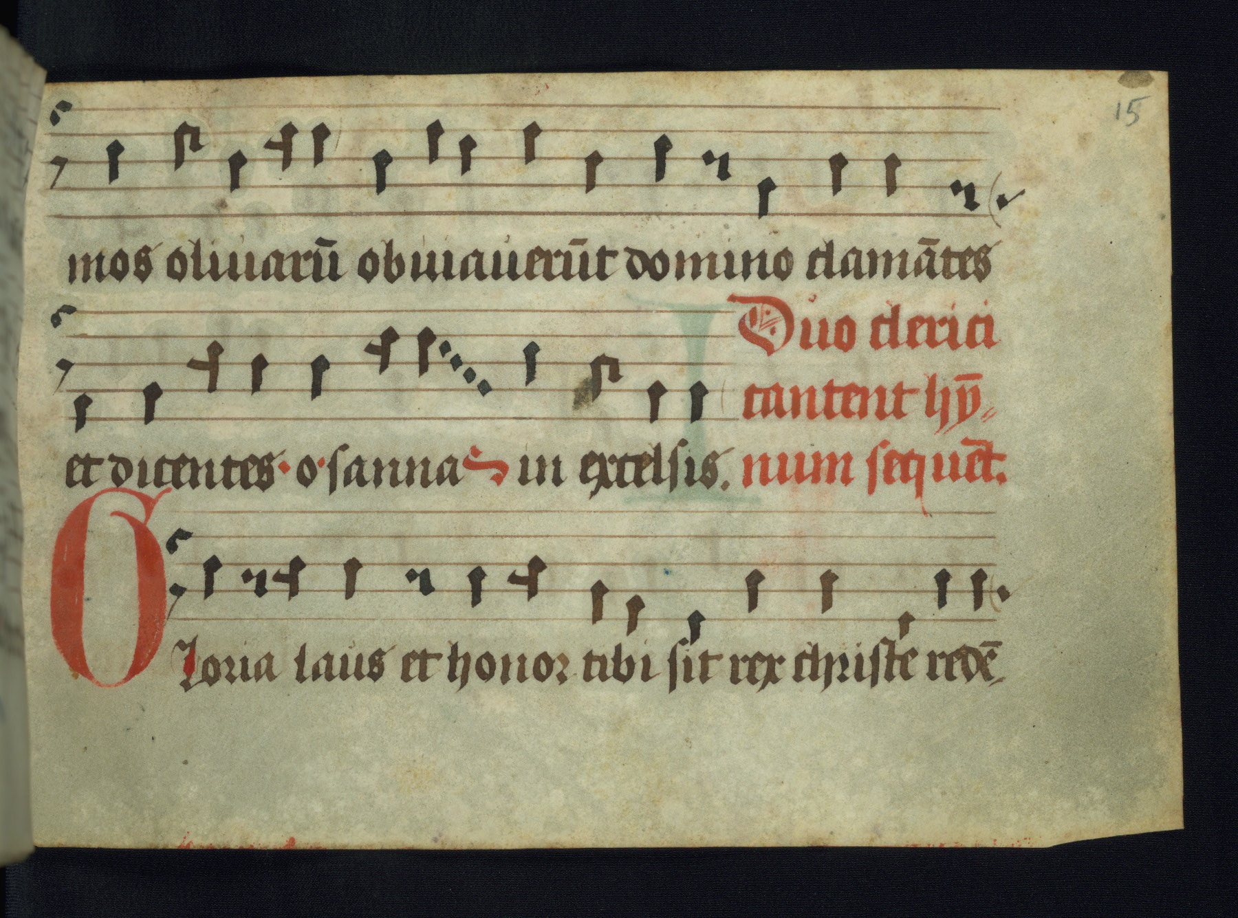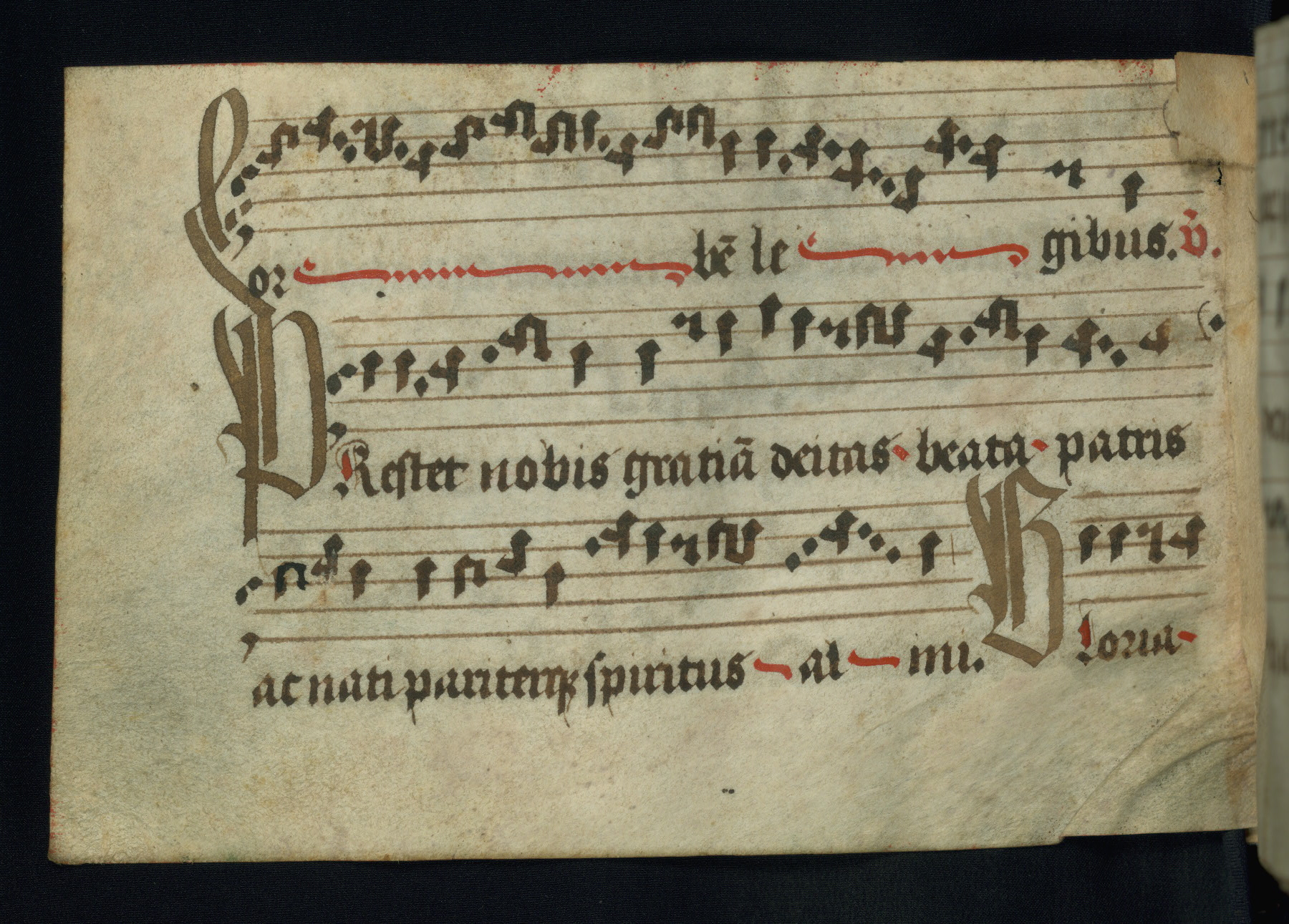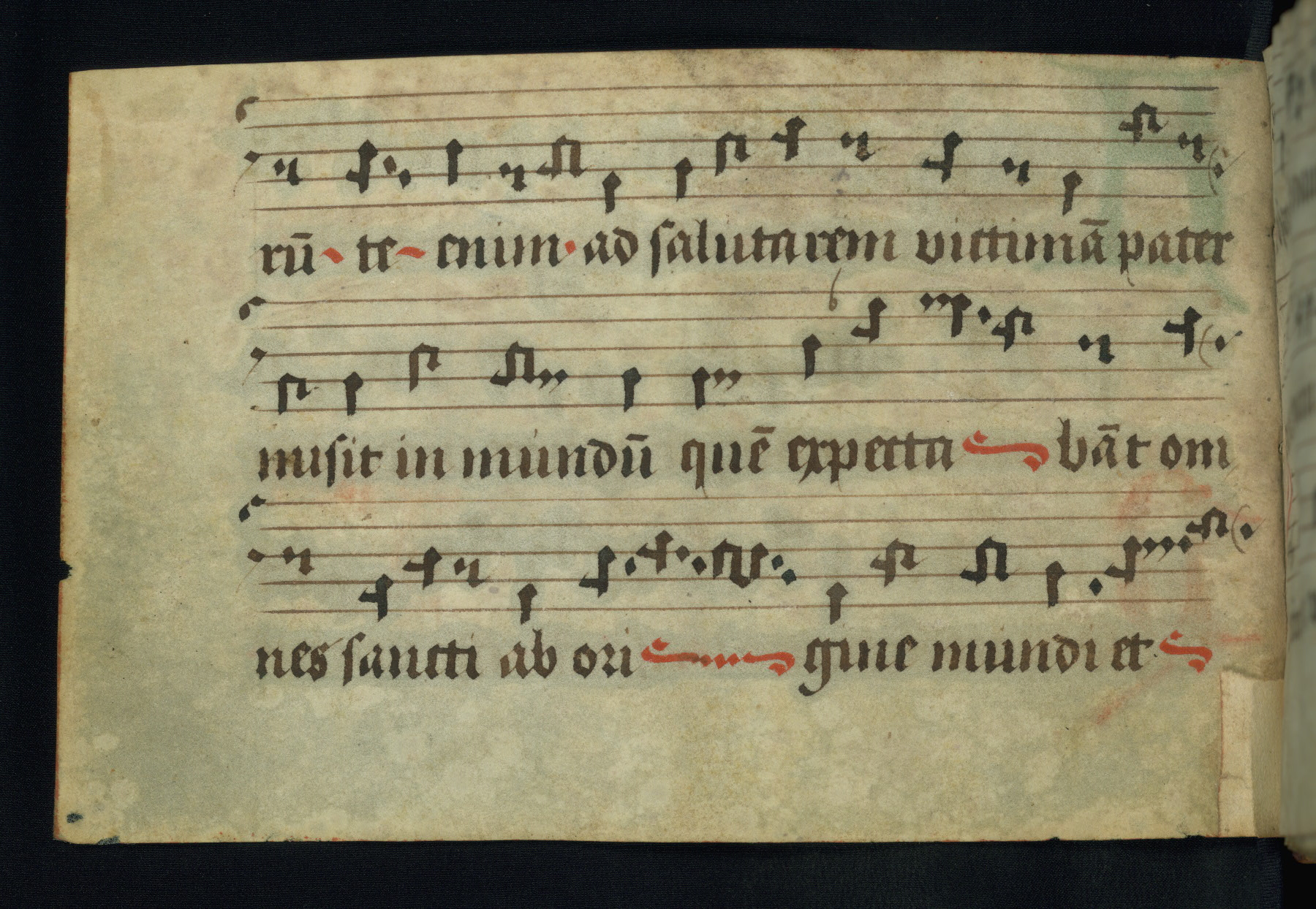 This manuscript contains liturgical music to be sung during processions. It is exceptional because of its "album" format (10 x 14.5 cm), which is in part the result of a severe cropping of the folios. The book was made in the late fifteenth or early sixteenth century in Germany. Its continued use is evident from the seventeenth- or eighteenth-century addition of paper folios containing prayers and music. Music is written in Gothic notation on three five-line staves per folio. The first folio is illuminated with a foliate initial for the Feast of the Purification of the Virgin.