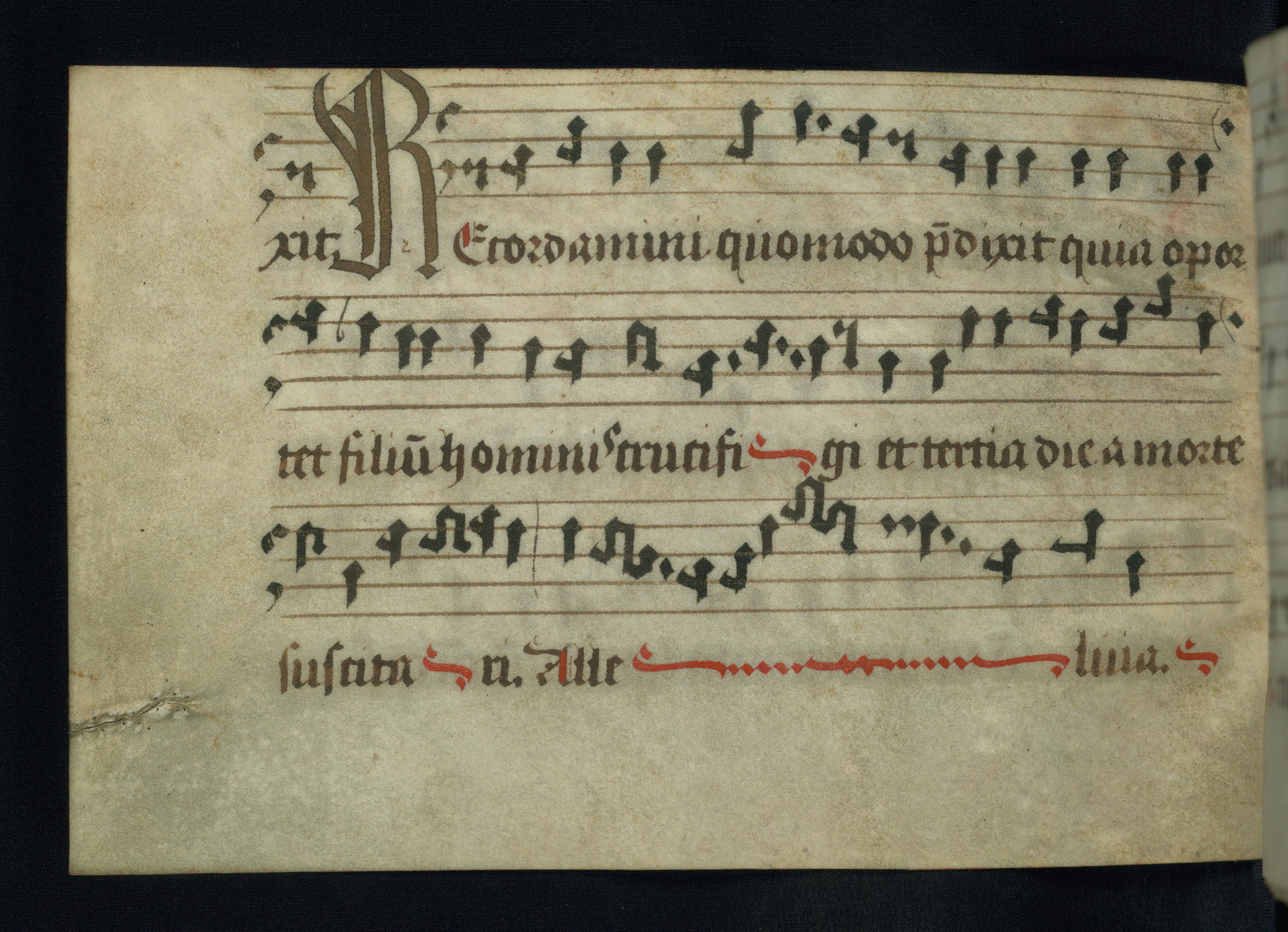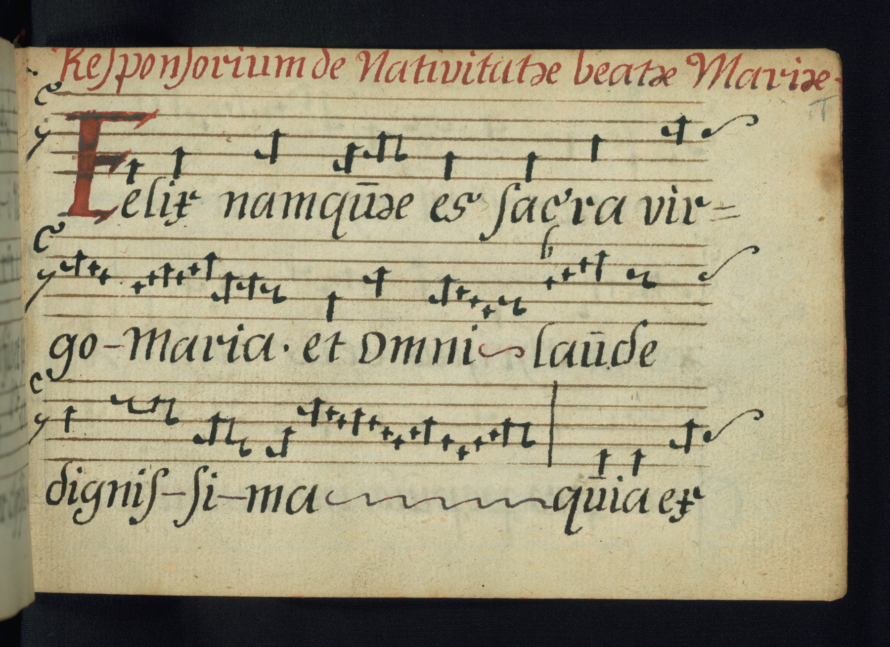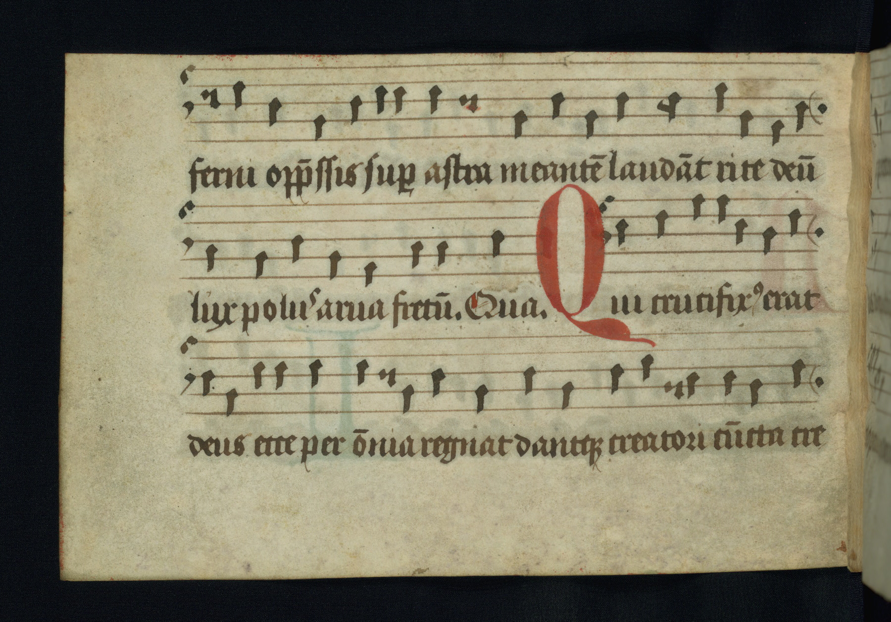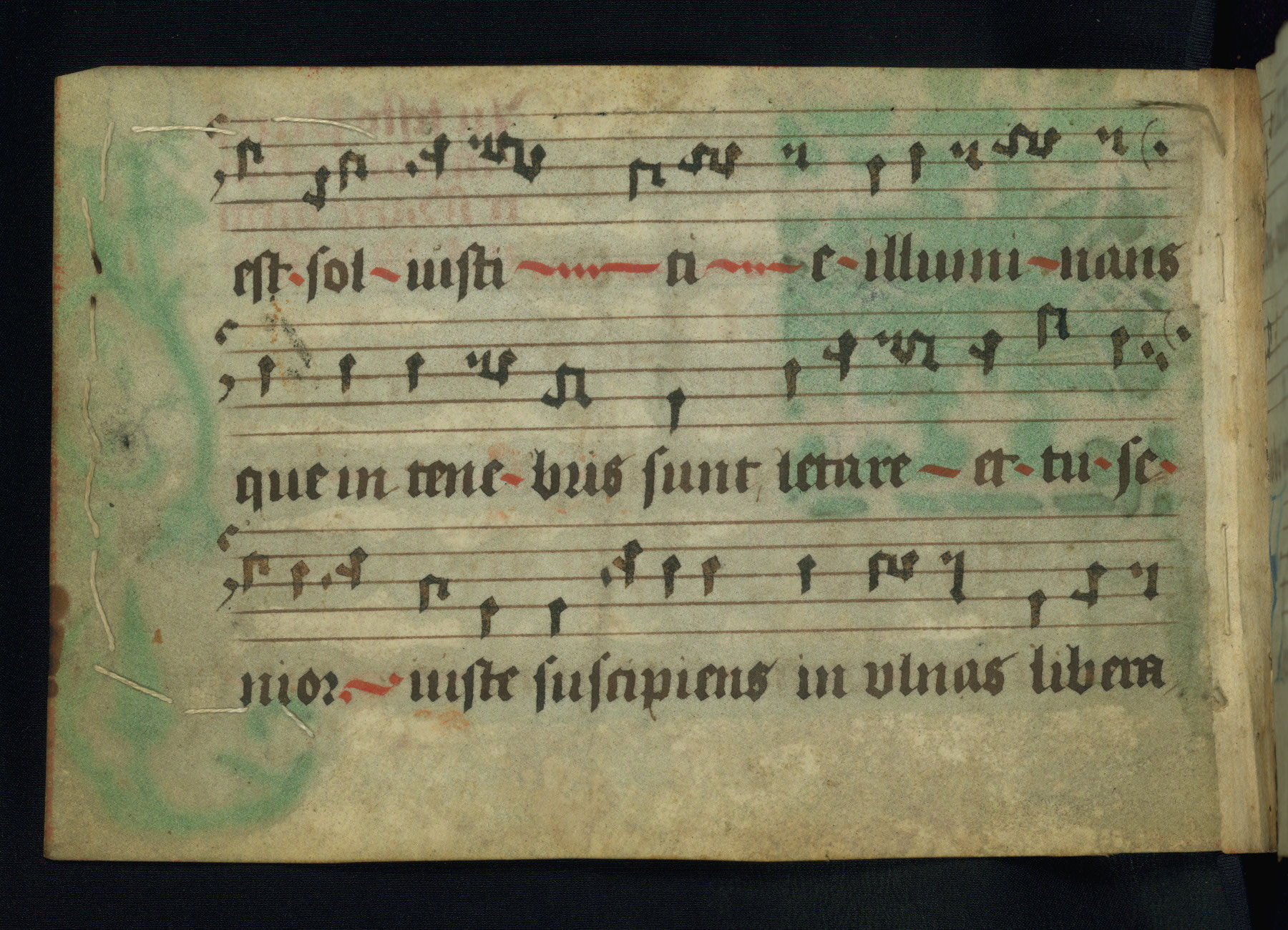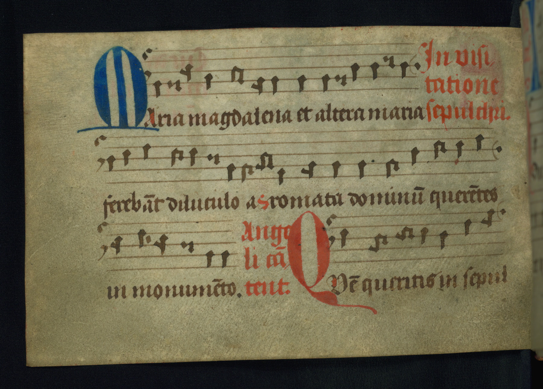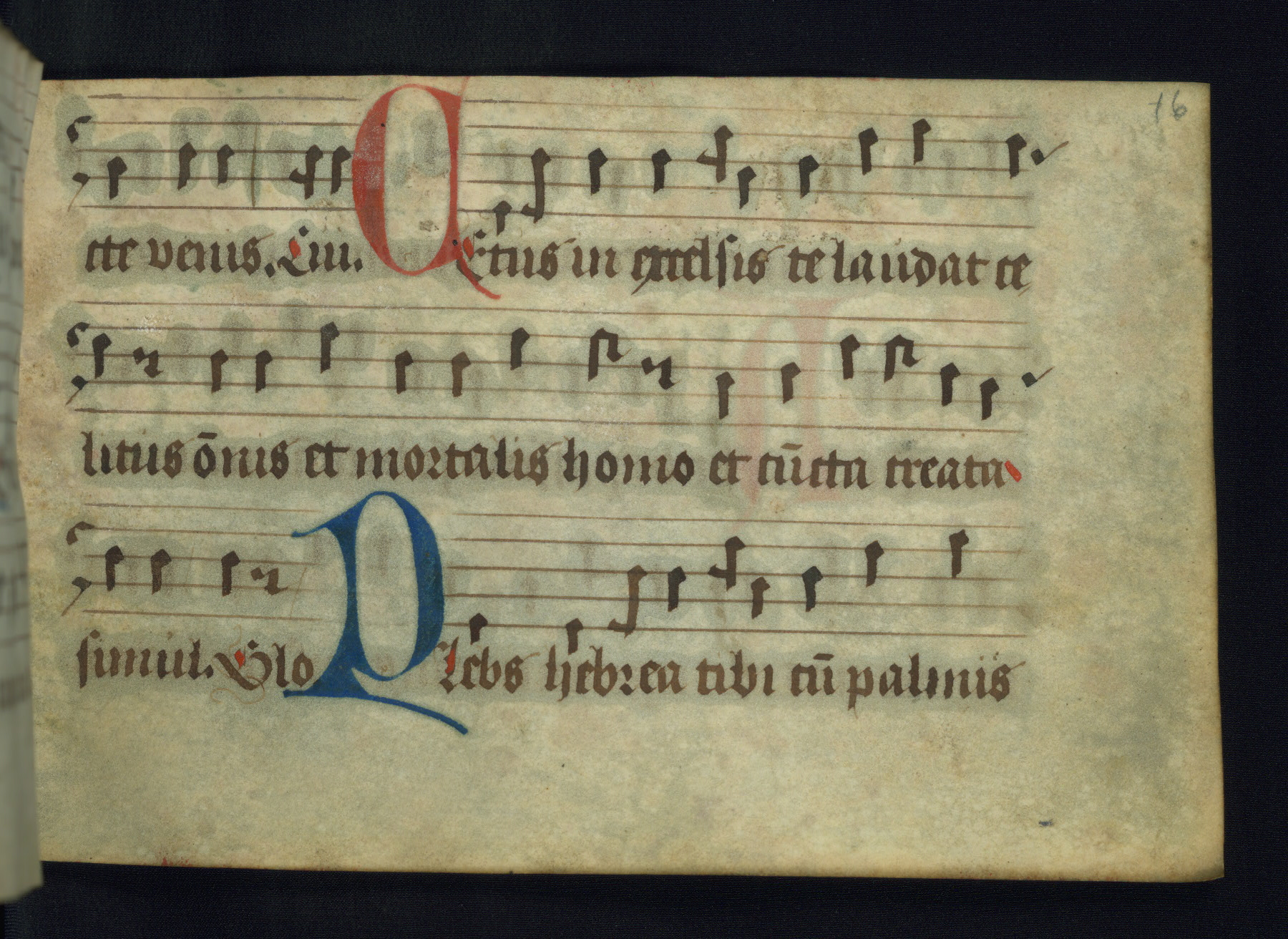 This manuscript contains liturgical music to be sung during processions. It is exceptional because of its "album" format (10 x 14.5 cm), which is in part the result of a severe cropping of the folios. The book was made in the late fifteenth or early sixteenth century in Germany. Its continued use is evident from the seventeenth- or eighteenth-century addition of paper folios containing prayers and music. Music is written in Gothic notation on three five-line staves per folio. The first folio is illuminated with a foliate initial for the Feast of the Purification of the Virgin.