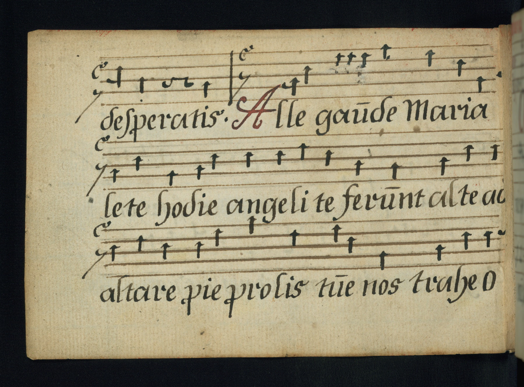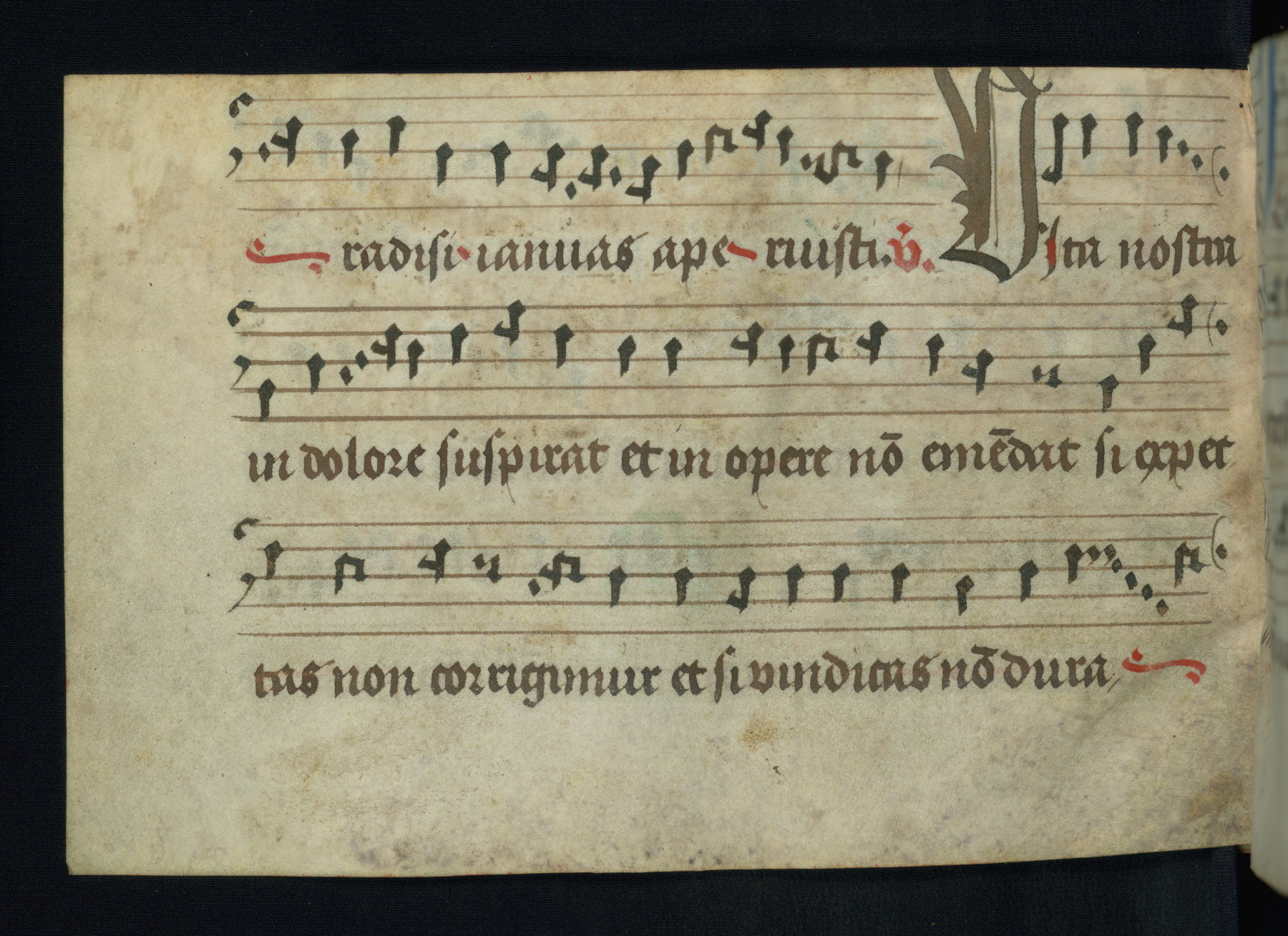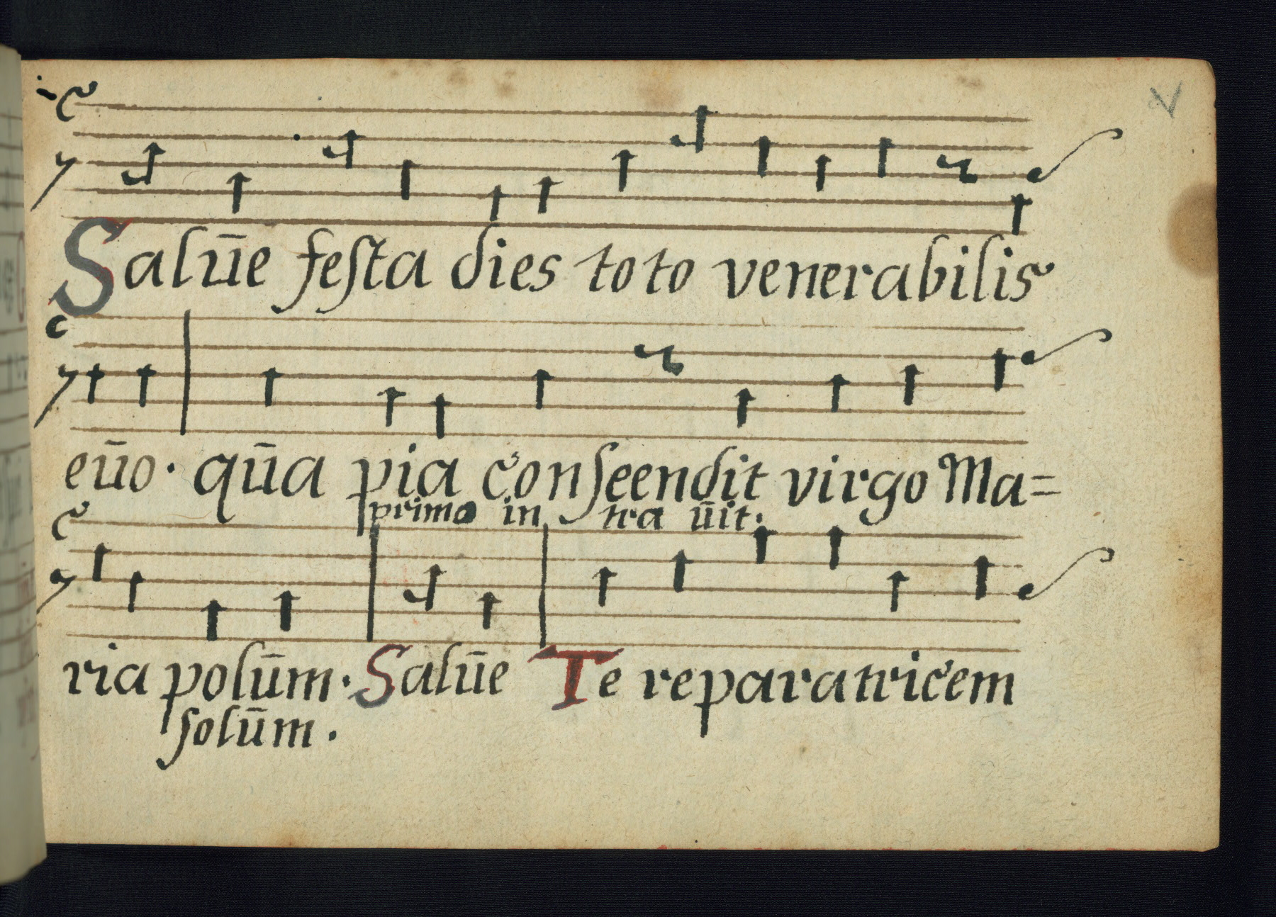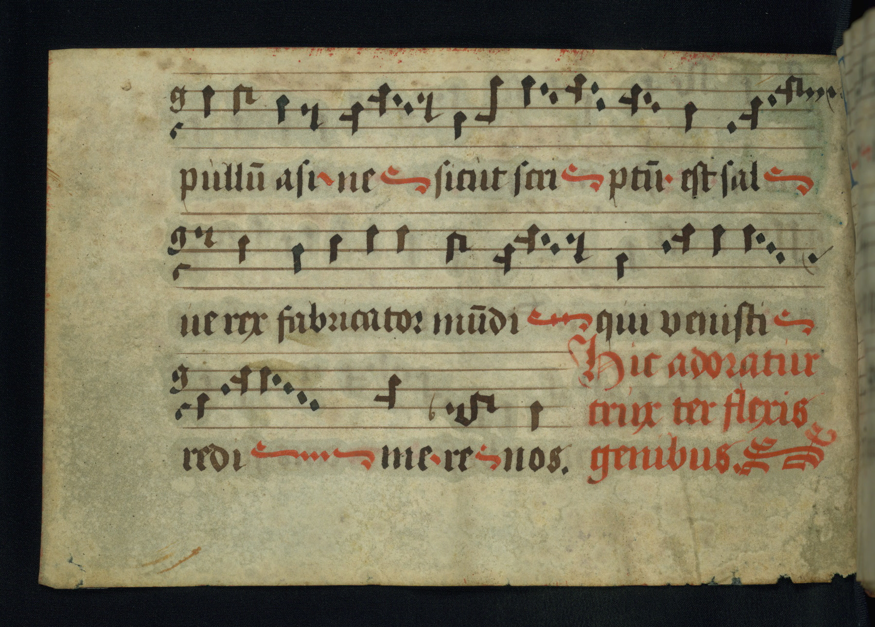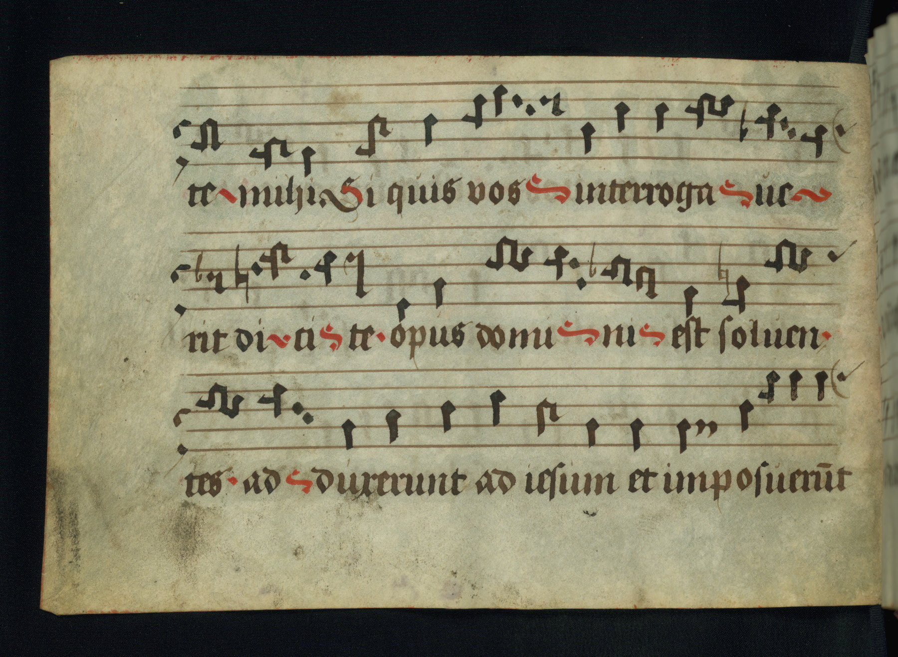 This manuscript contains liturgical music to be sung during processions. It is exceptional because of its "album" format (10 x 14.5 cm), which is in part the result of a severe cropping of the folios. The book was made in the late fifteenth or early sixteenth century in Germany. Its continued use is evident from the seventeenth- or eighteenth-century addition of paper folios containing prayers and music. Music is written in Gothic notation on three five-line staves per folio. The first folio is illuminated with a foliate initial for the Feast of the Purification of the Virgin.