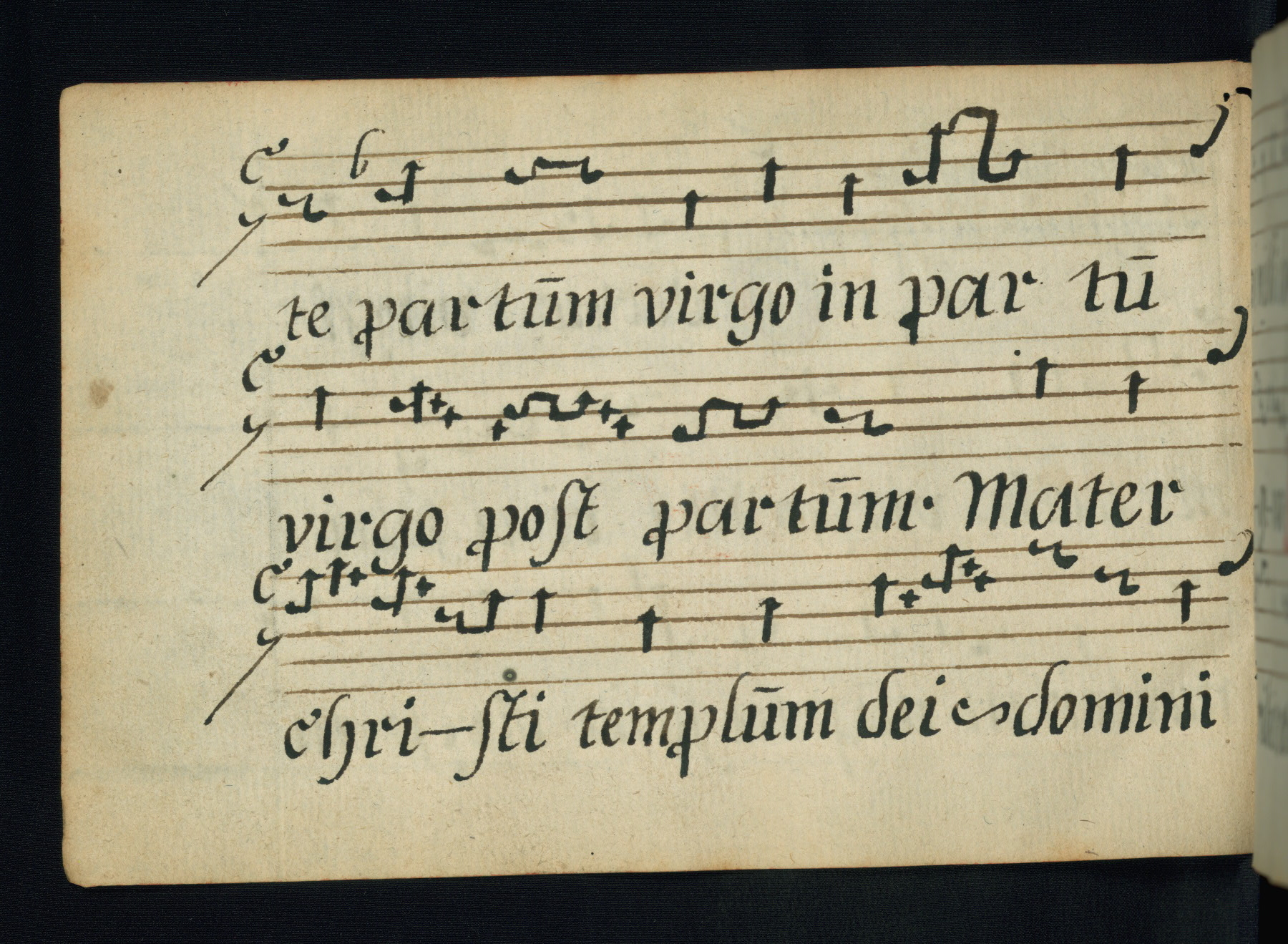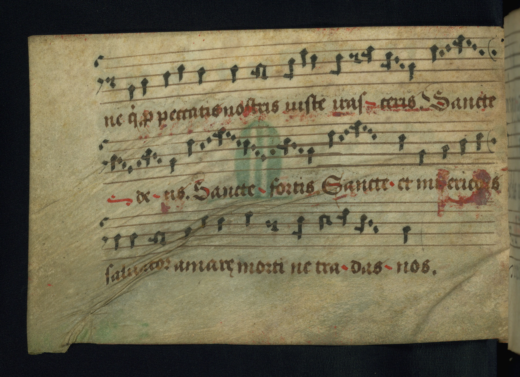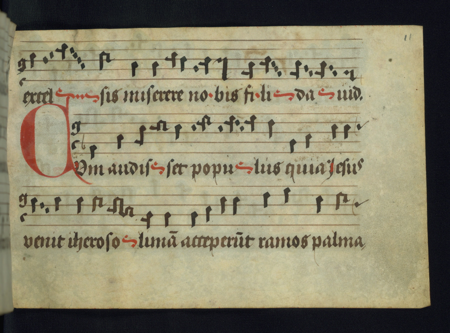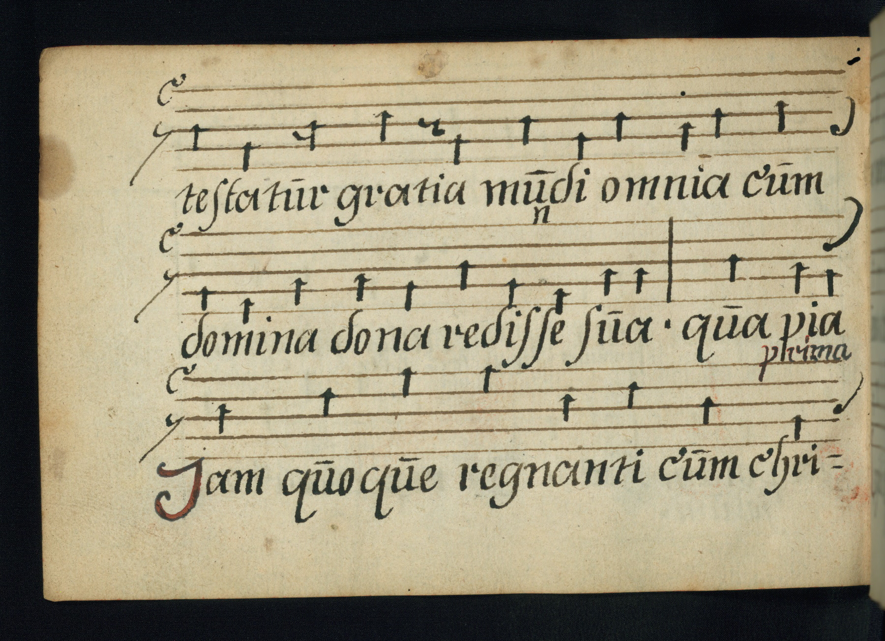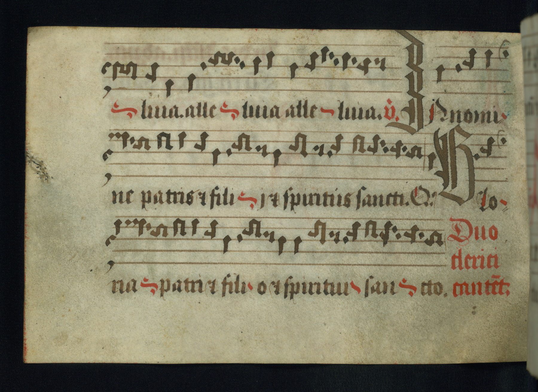 This manuscript contains liturgical music to be sung during processions. It is exceptional because of its "album" format (10 x 14.5 cm), which is in part the result of a severe cropping of the folios. The book was made in the late fifteenth or early sixteenth century in Germany. Its continued use is evident from the seventeenth- or eighteenth-century addition of paper folios containing prayers and music. Music is written in Gothic notation on three five-line staves per folio. The first folio is illuminated with a foliate initial for the Feast of the Purification of the Virgin.