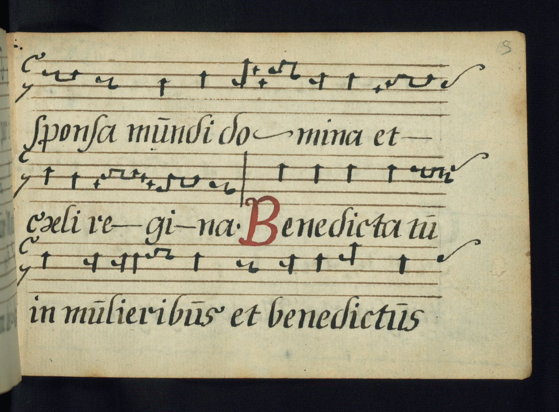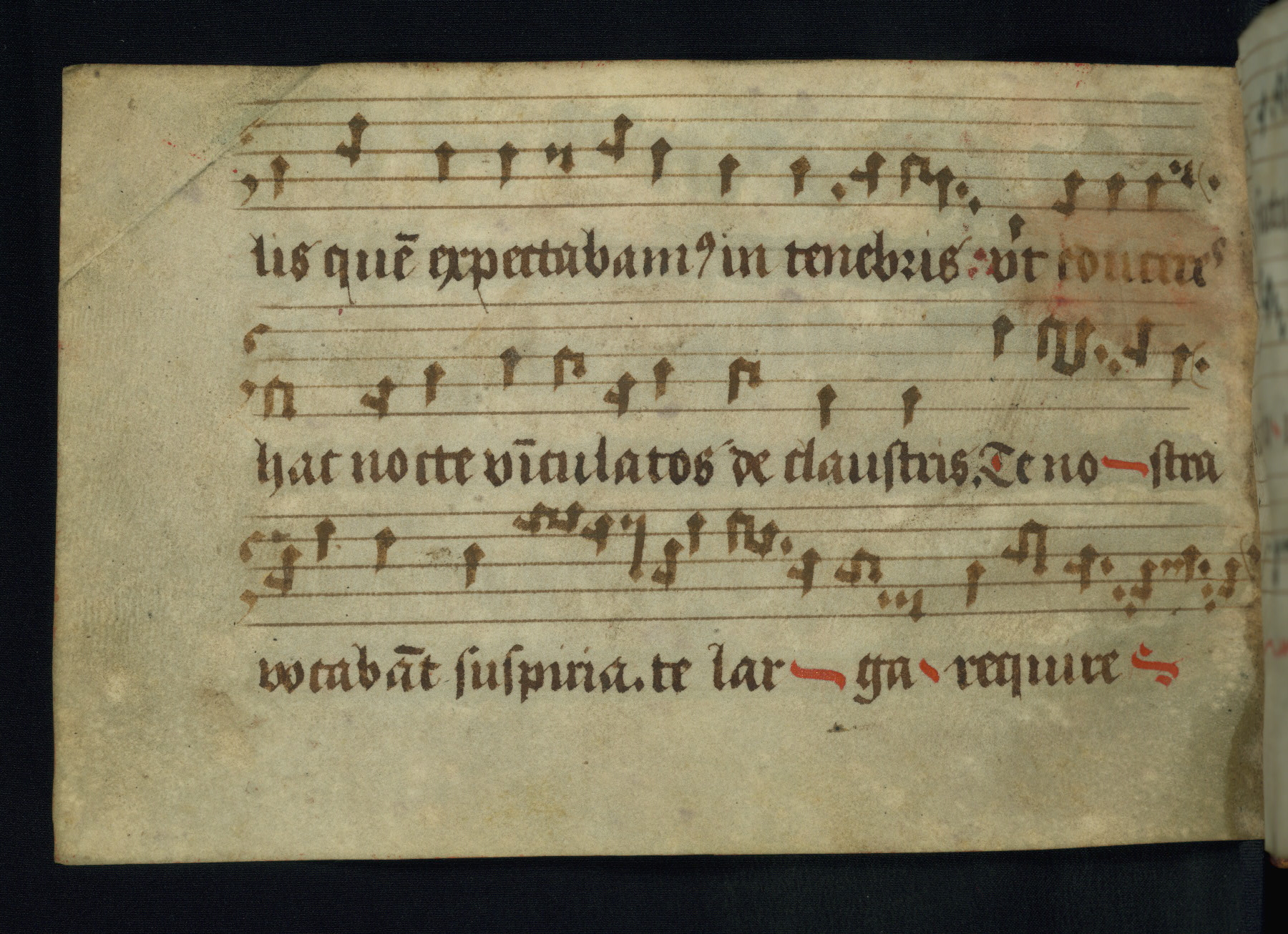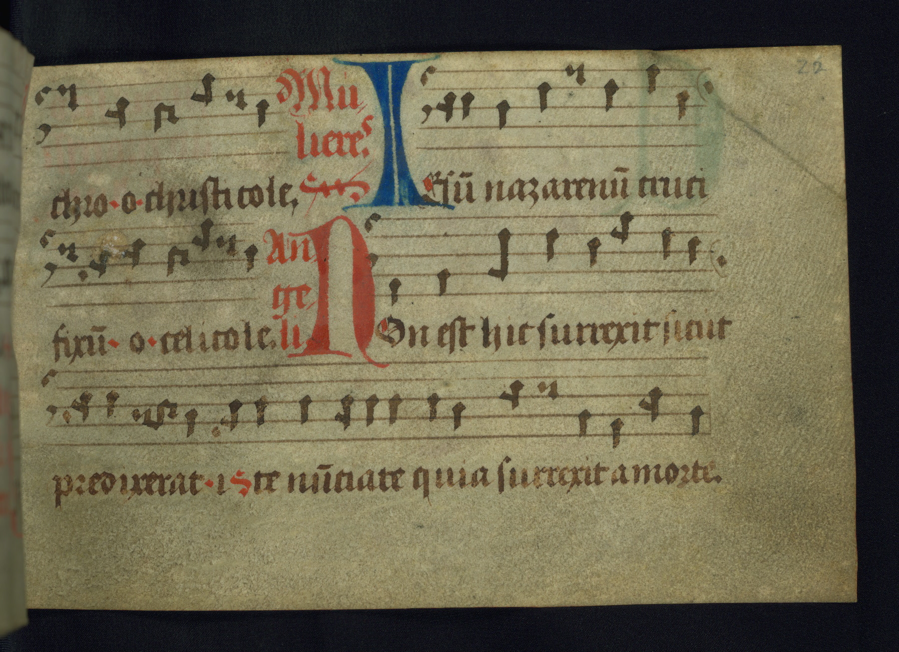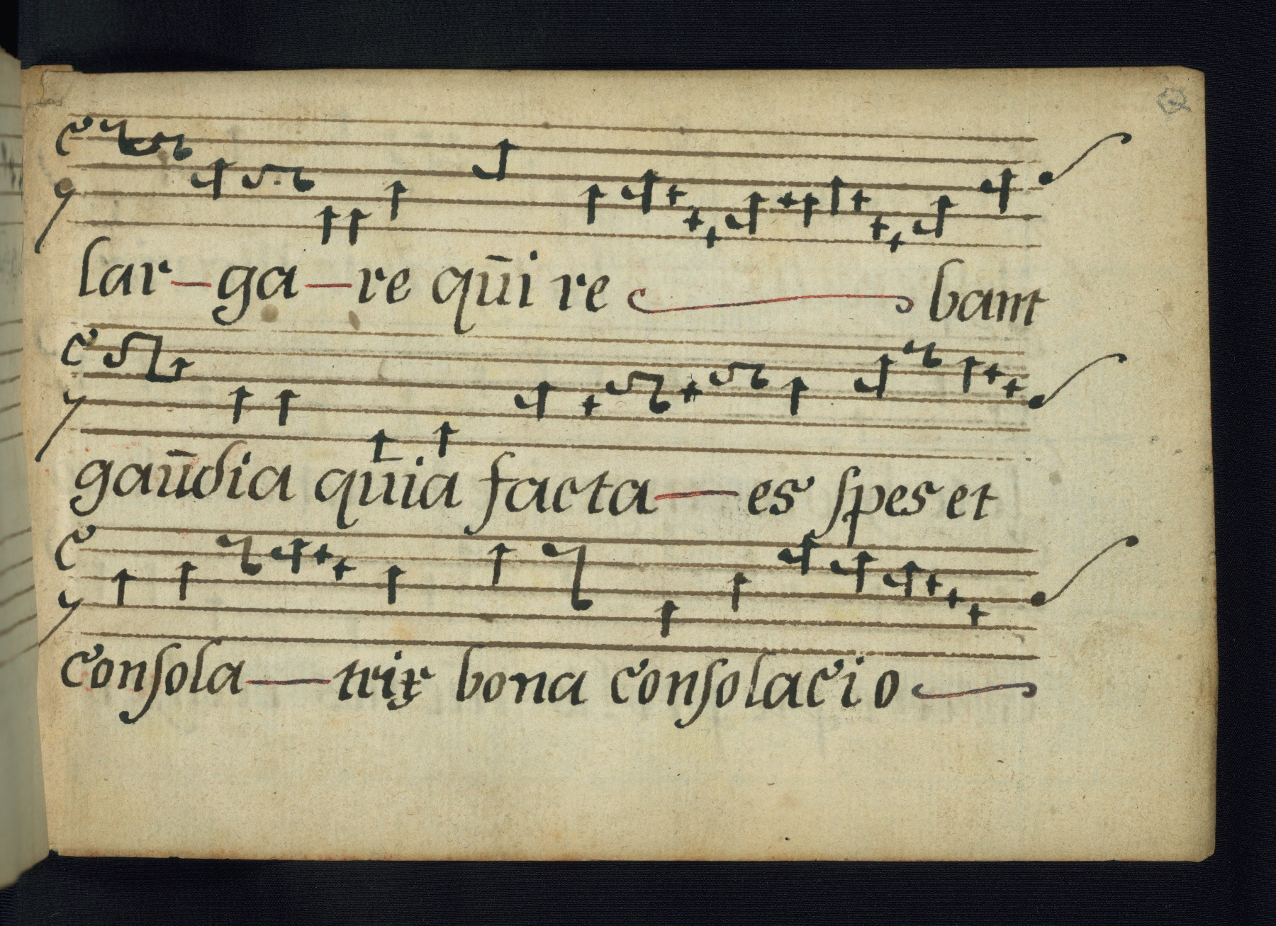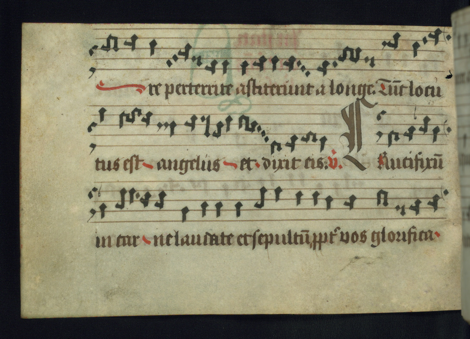 This manuscript contains liturgical music to be sung during processions. It is exceptional because of its "album" format (10 x 14.5 cm), which is in part the result of a severe cropping of the folios. The book was made in the late fifteenth or early sixteenth century in Germany. Its continued use is evident from the seventeenth- or eighteenth-century addition of paper folios containing prayers and music. Music is written in Gothic notation on three five-line staves per folio. The first folio is illuminated with a foliate initial for the Feast of the Purification of the Virgin.
