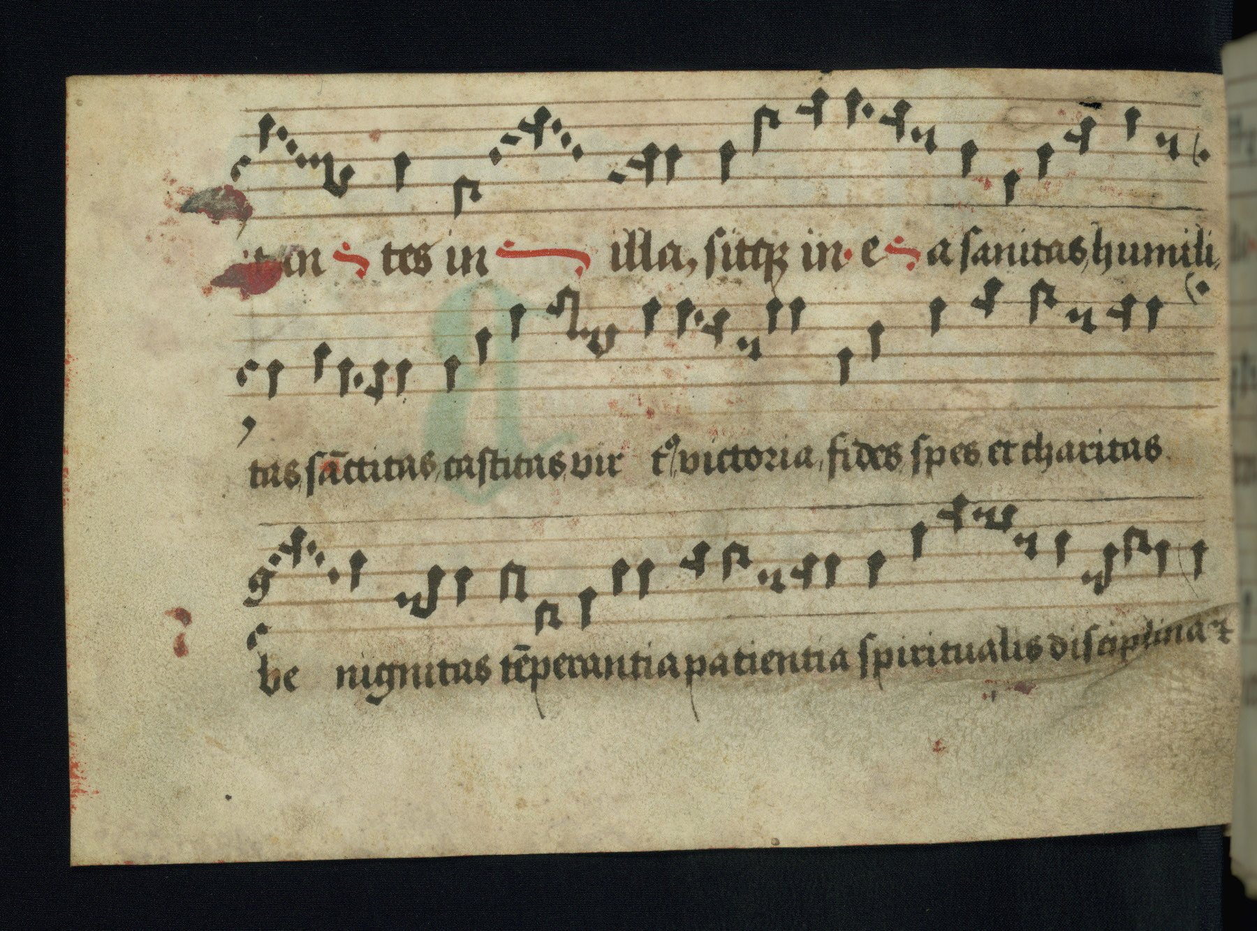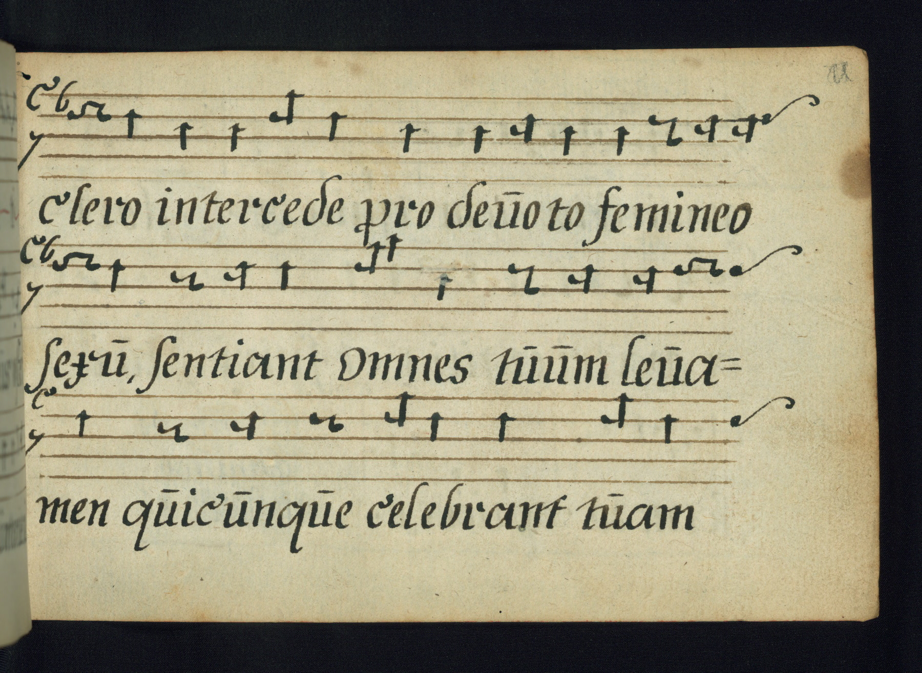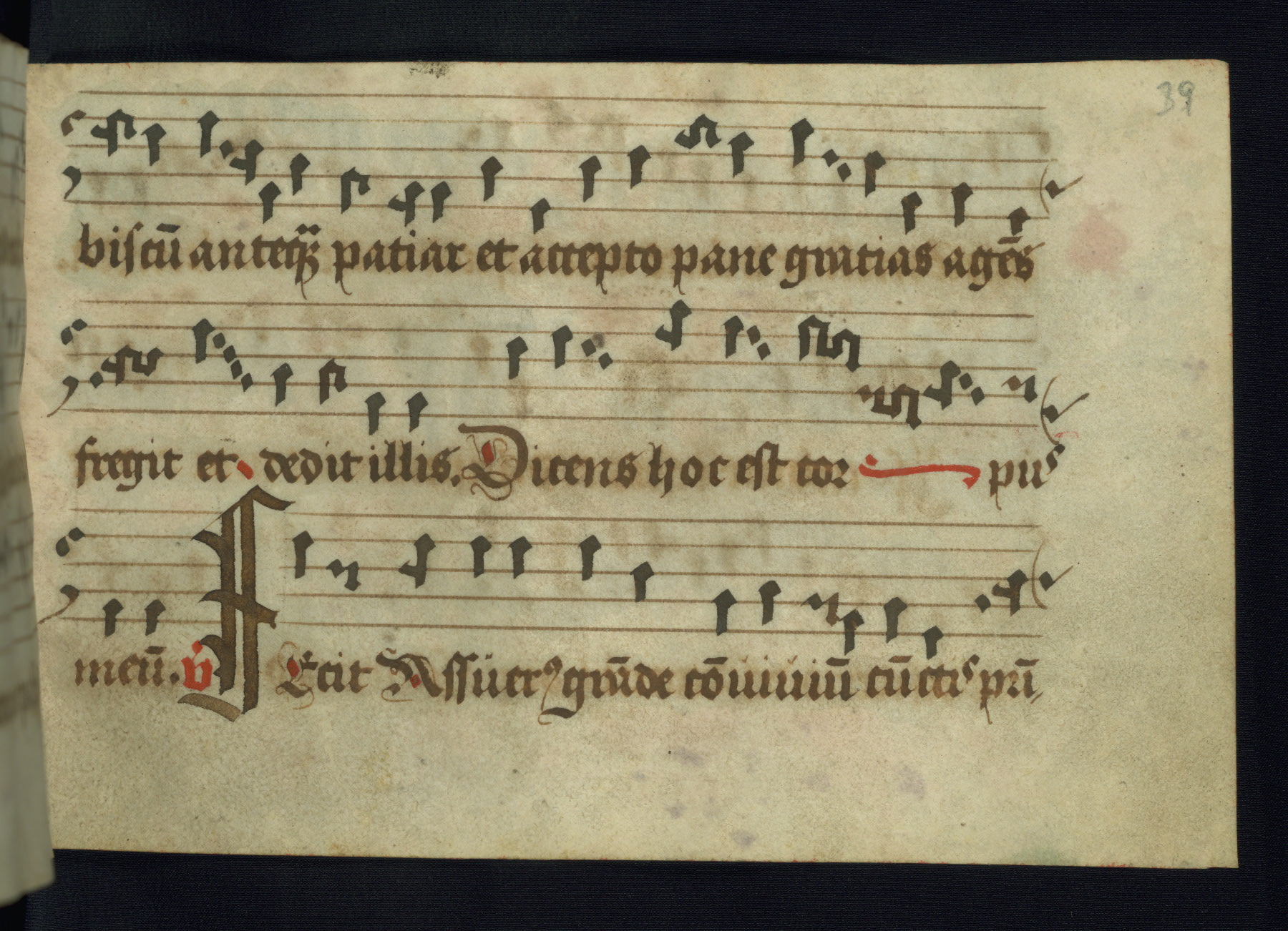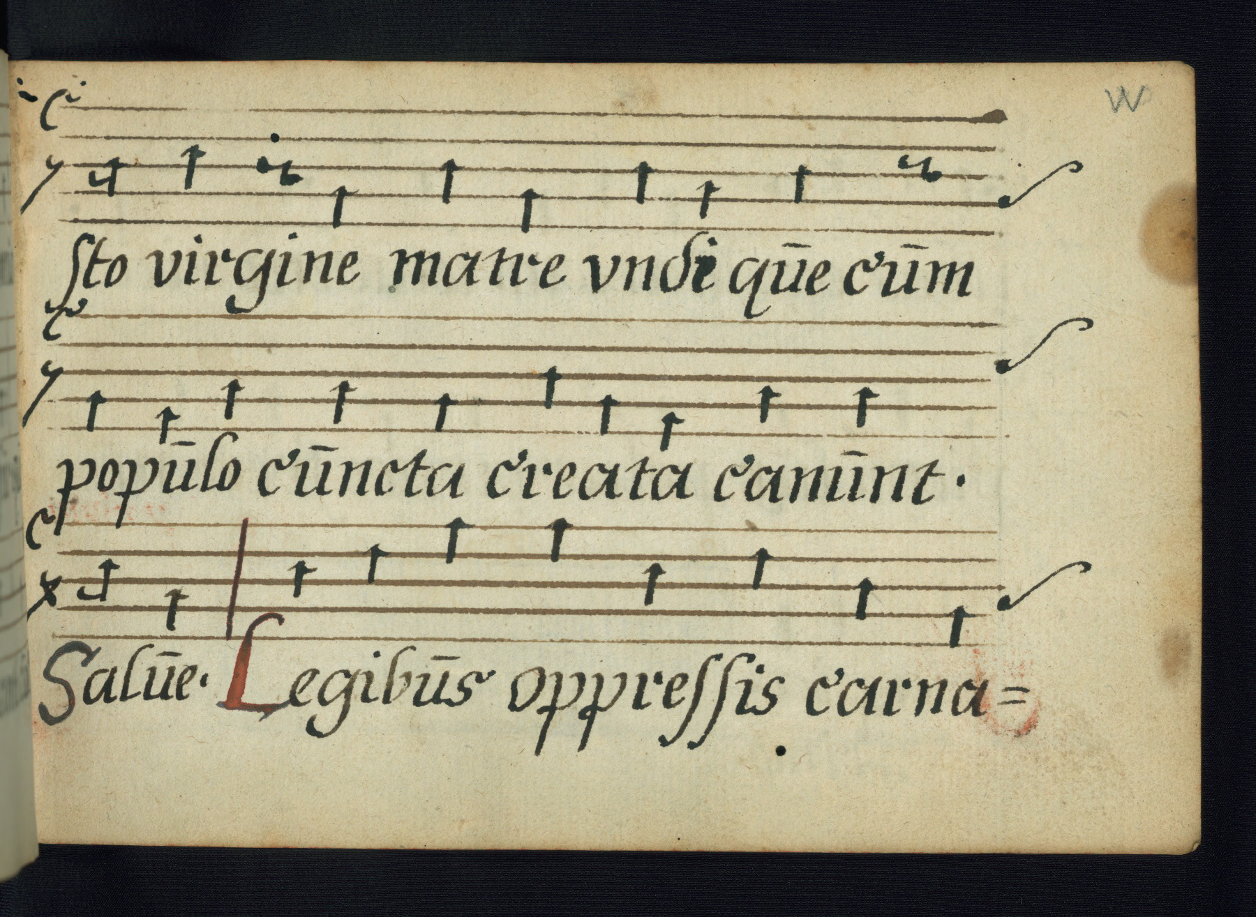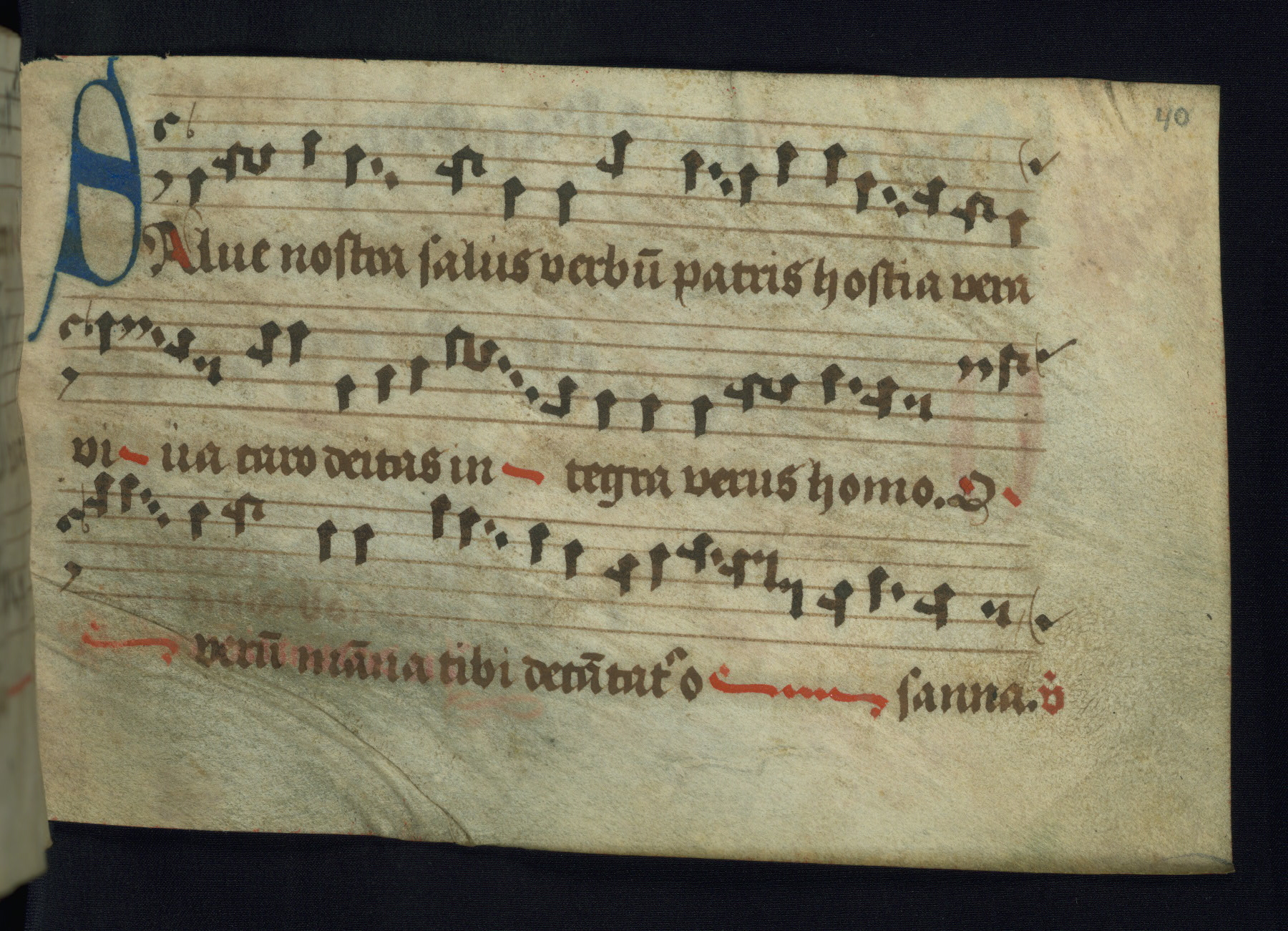 This manuscript contains liturgical music to be sung during processions. It is exceptional because of its "album" format (10 x 14.5 cm), which is in part the result of a severe cropping of the folios. The book was made in the late fifteenth or early sixteenth century in Germany. Its continued use is evident from the seventeenth- or eighteenth-century addition of paper folios containing prayers and music. Music is written in Gothic notation on three five-line staves per folio. The first folio is illuminated with a foliate initial for the Feast of the Purification of the Virgin.