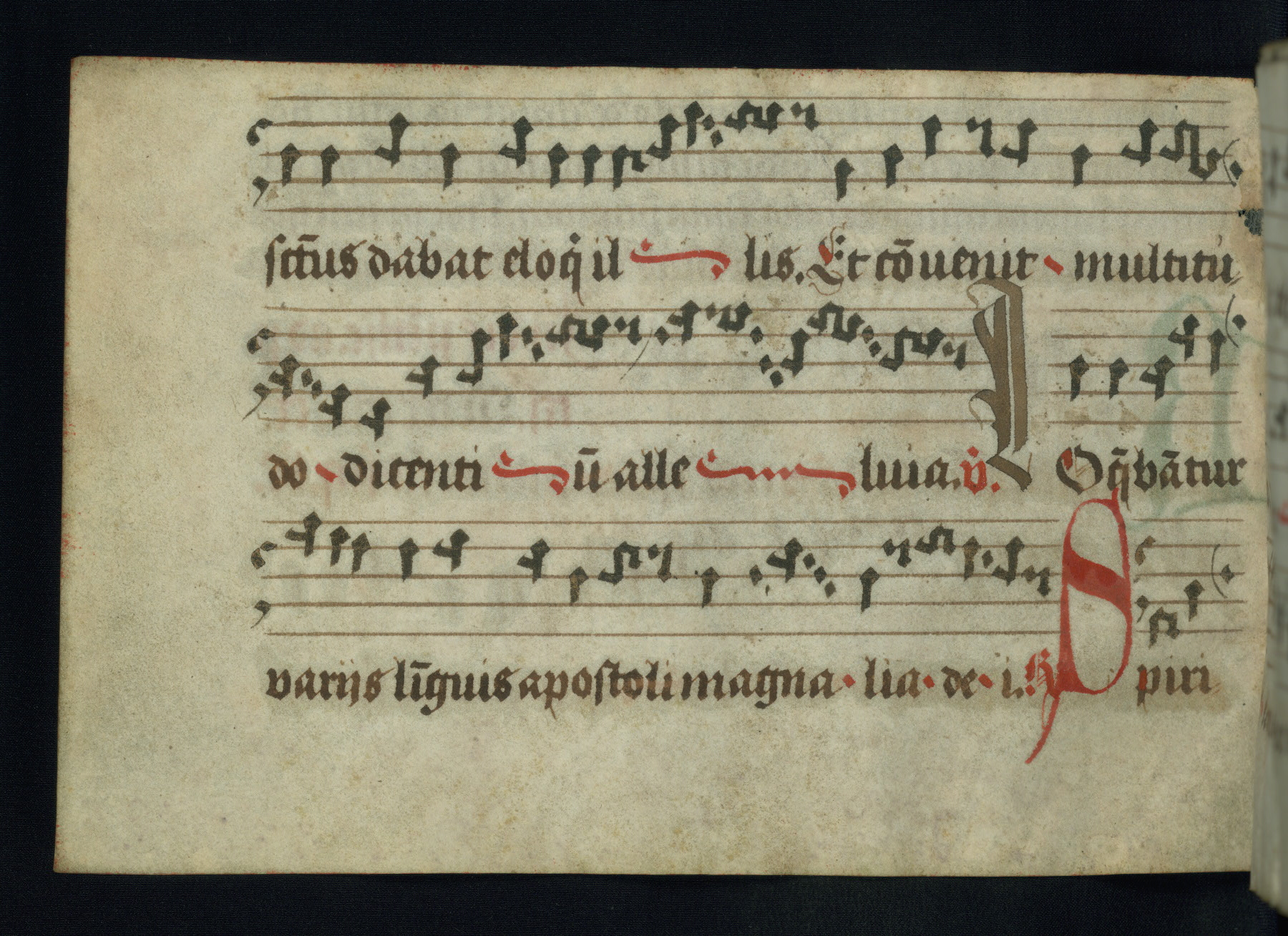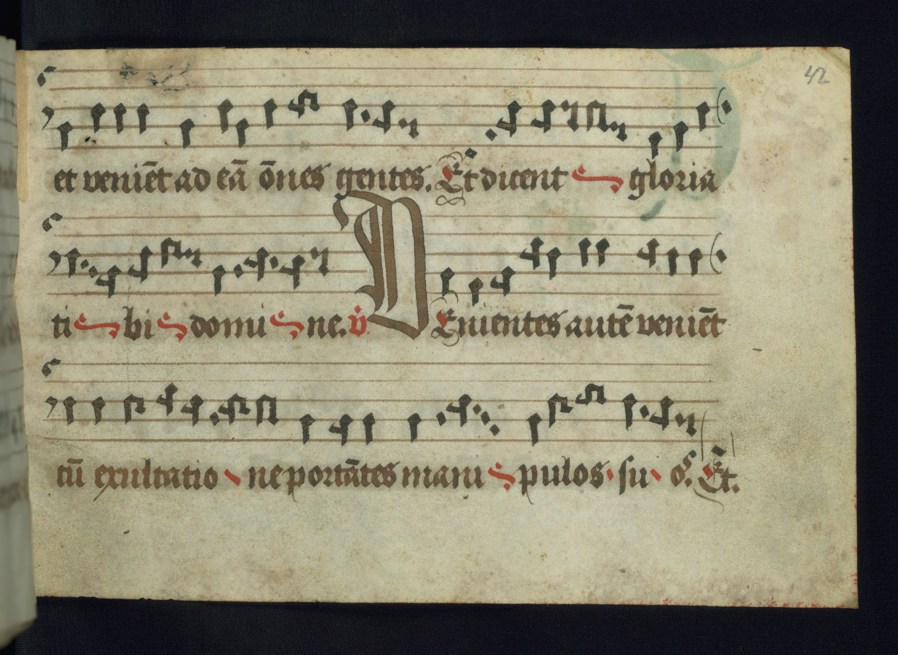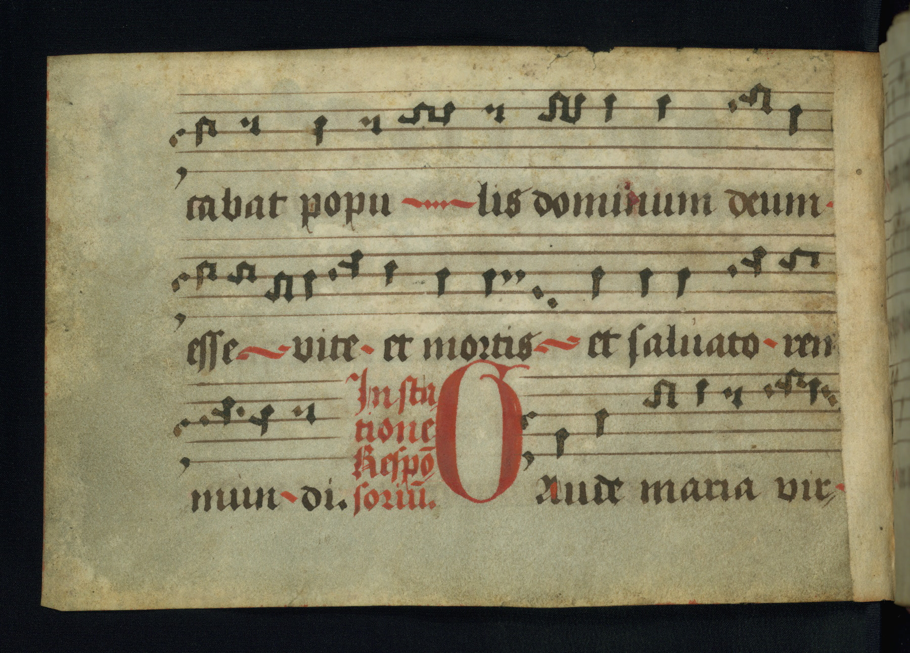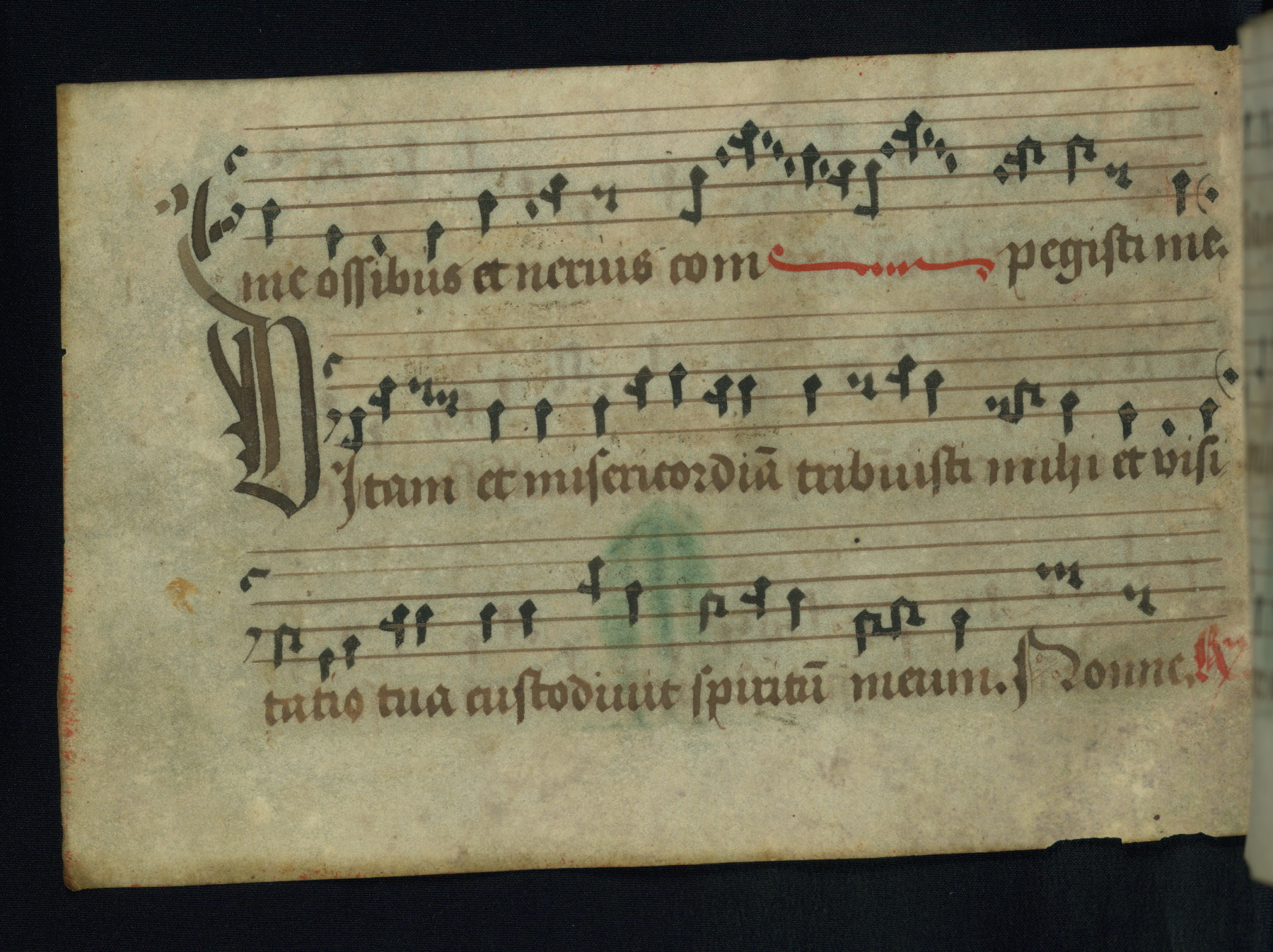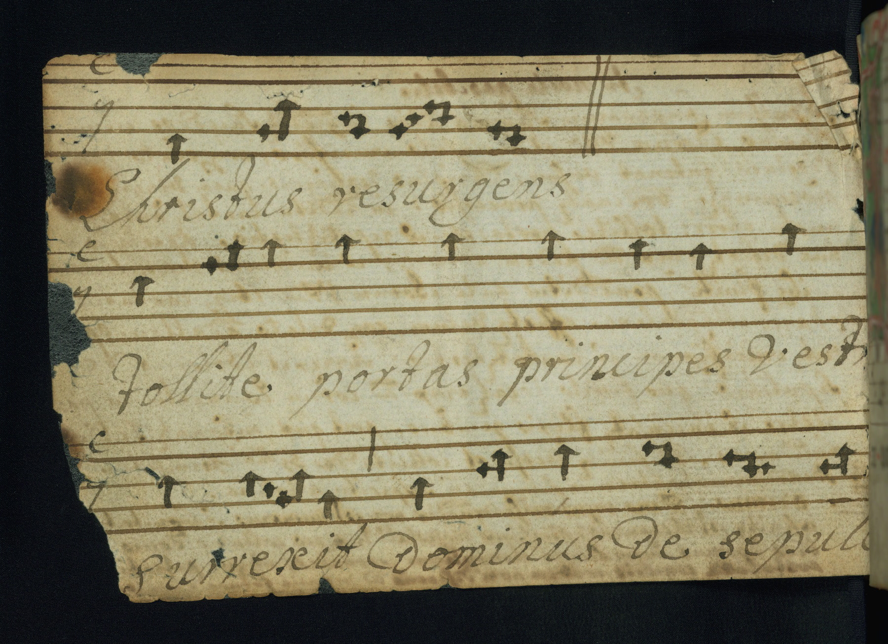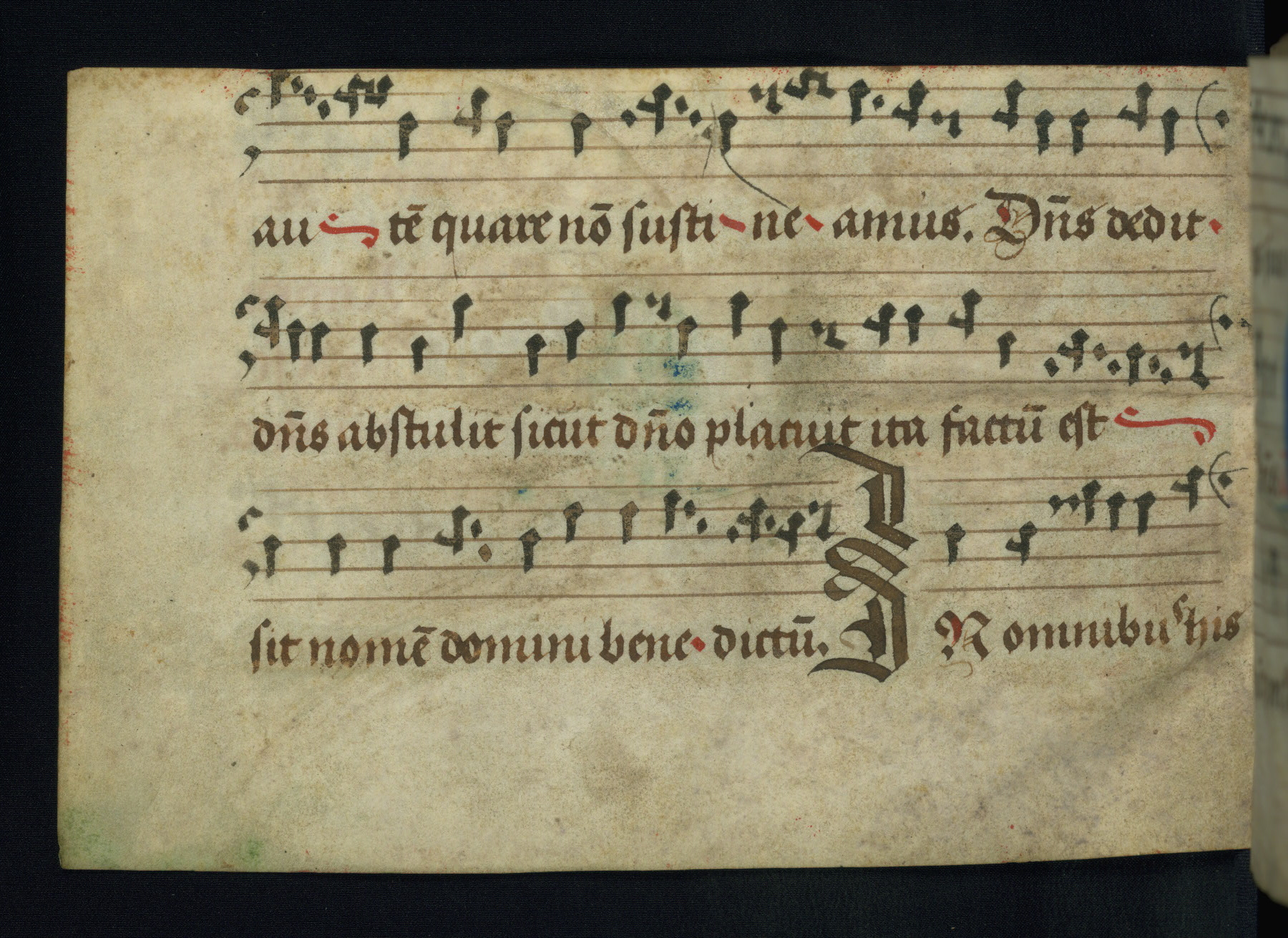 This manuscript contains liturgical music to be sung during processions. It is exceptional because of its "album" format (10 x 14.5 cm), which is in part the result of a severe cropping of the folios. The book was made in the late fifteenth or early sixteenth century in Germany. Its continued use is evident from the seventeenth- or eighteenth-century addition of paper folios containing prayers and music. Music is written in Gothic notation on three five-line staves per folio. The first folio is illuminated with a foliate initial for the Feast of the Purification of the Virgin.