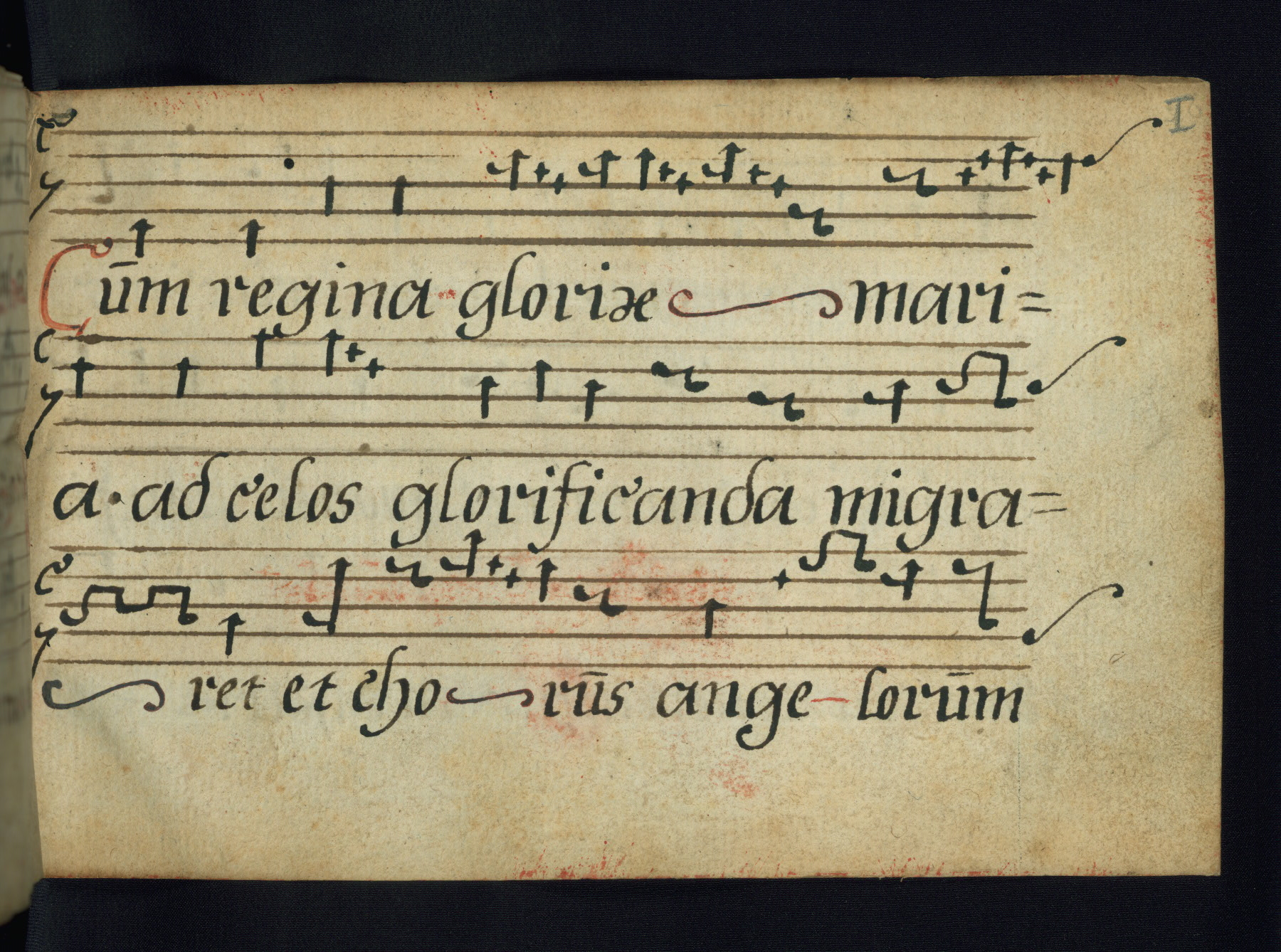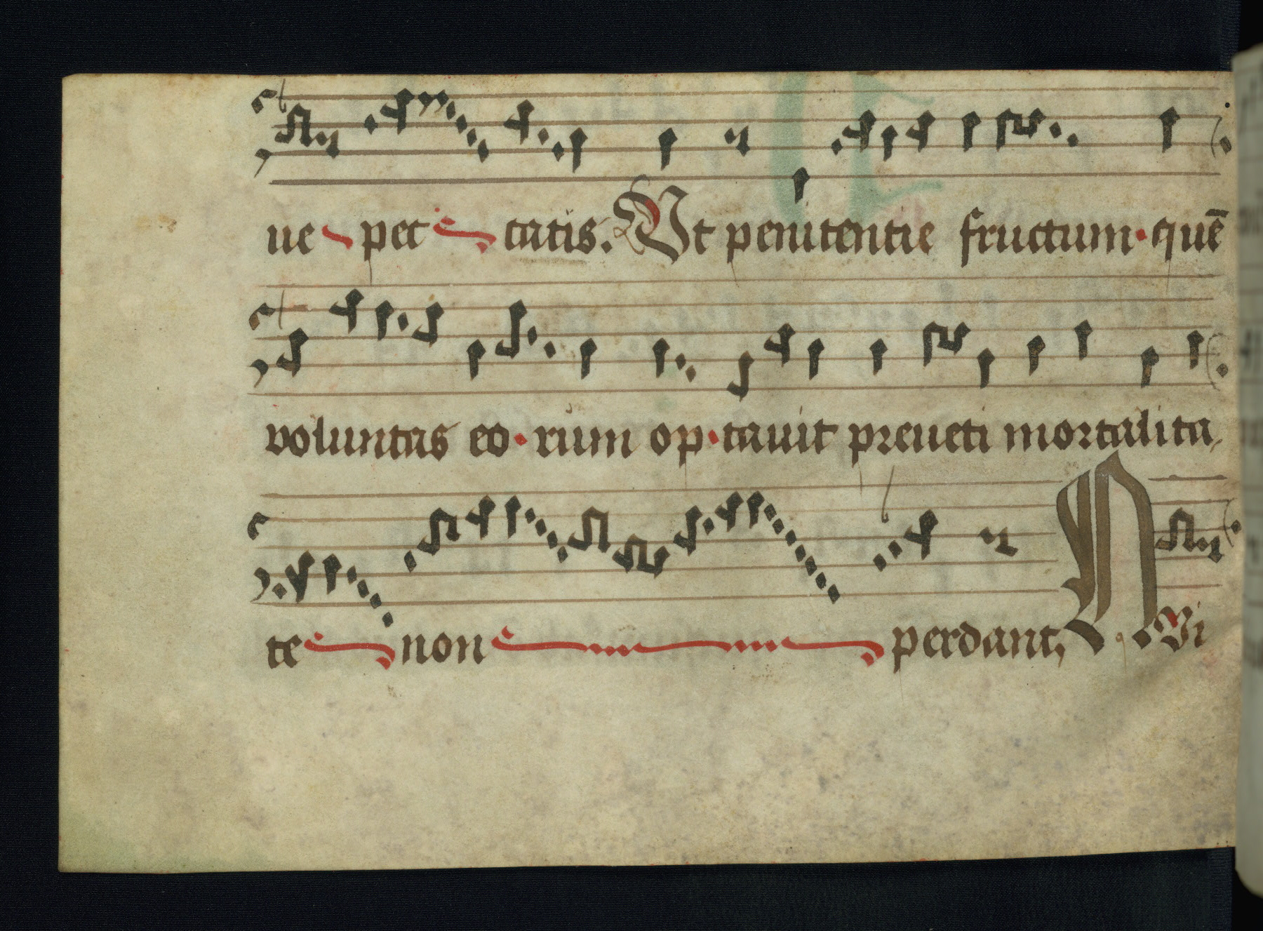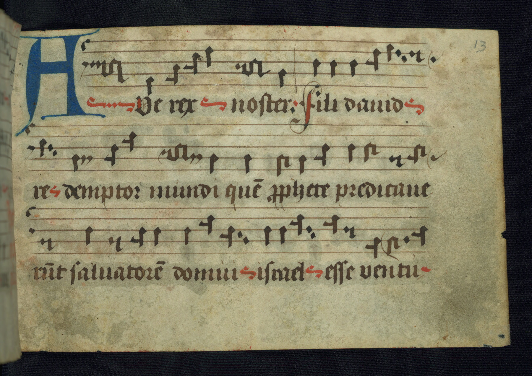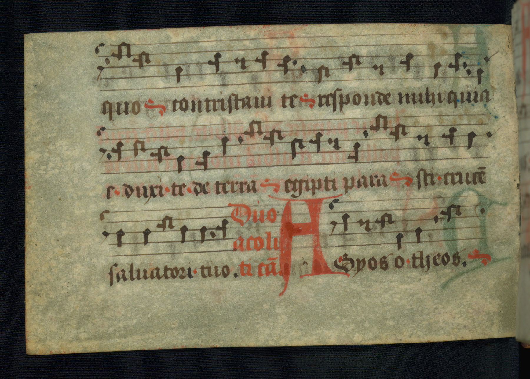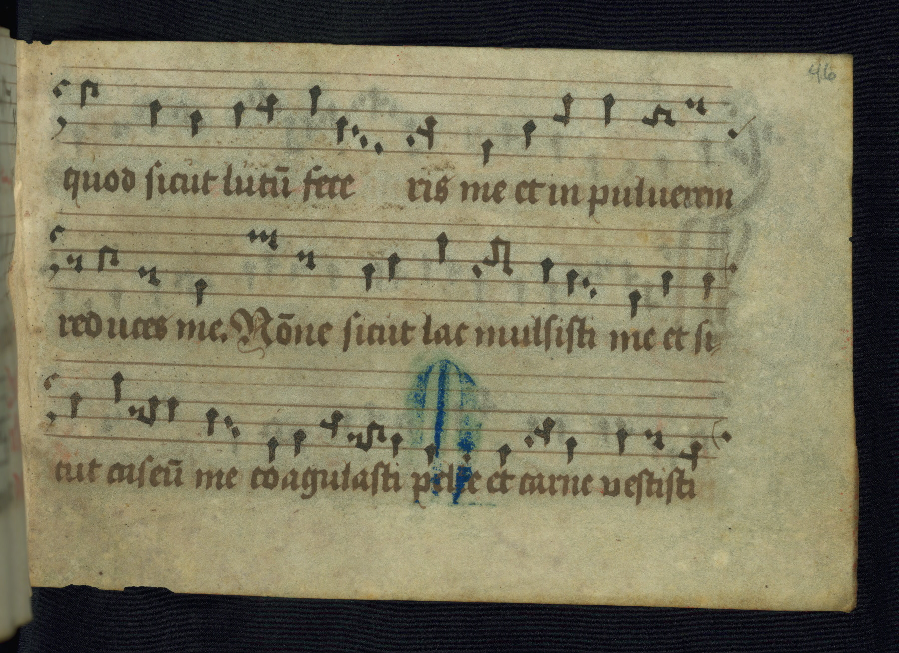 This manuscript contains liturgical music to be sung during processions. It is exceptional because of its "album" format (10 x 14.5 cm), which is in part the result of a severe cropping of the folios. The book was made in the late fifteenth or early sixteenth century in Germany. Its continued use is evident from the seventeenth- or eighteenth-century addition of paper folios containing prayers and music. Music is written in Gothic notation on three five-line staves per folio. The first folio is illuminated with a foliate initial for the Feast of the Purification of the Virgin.