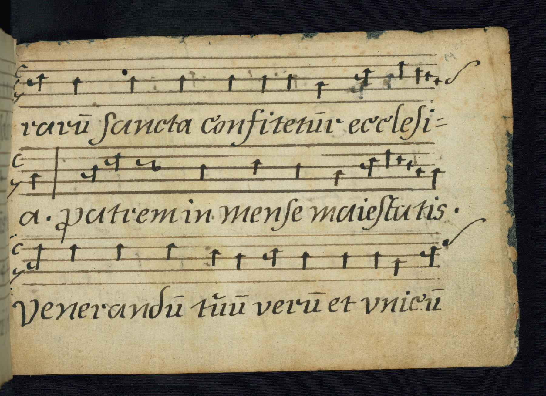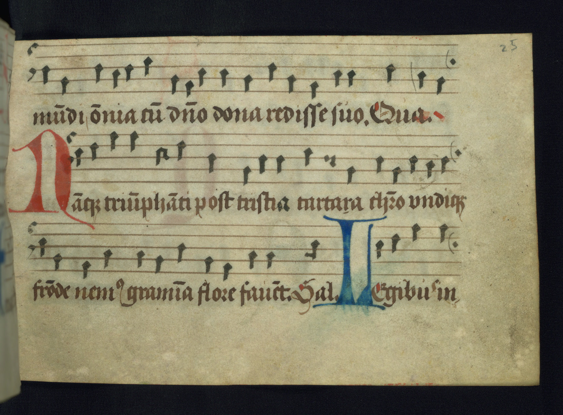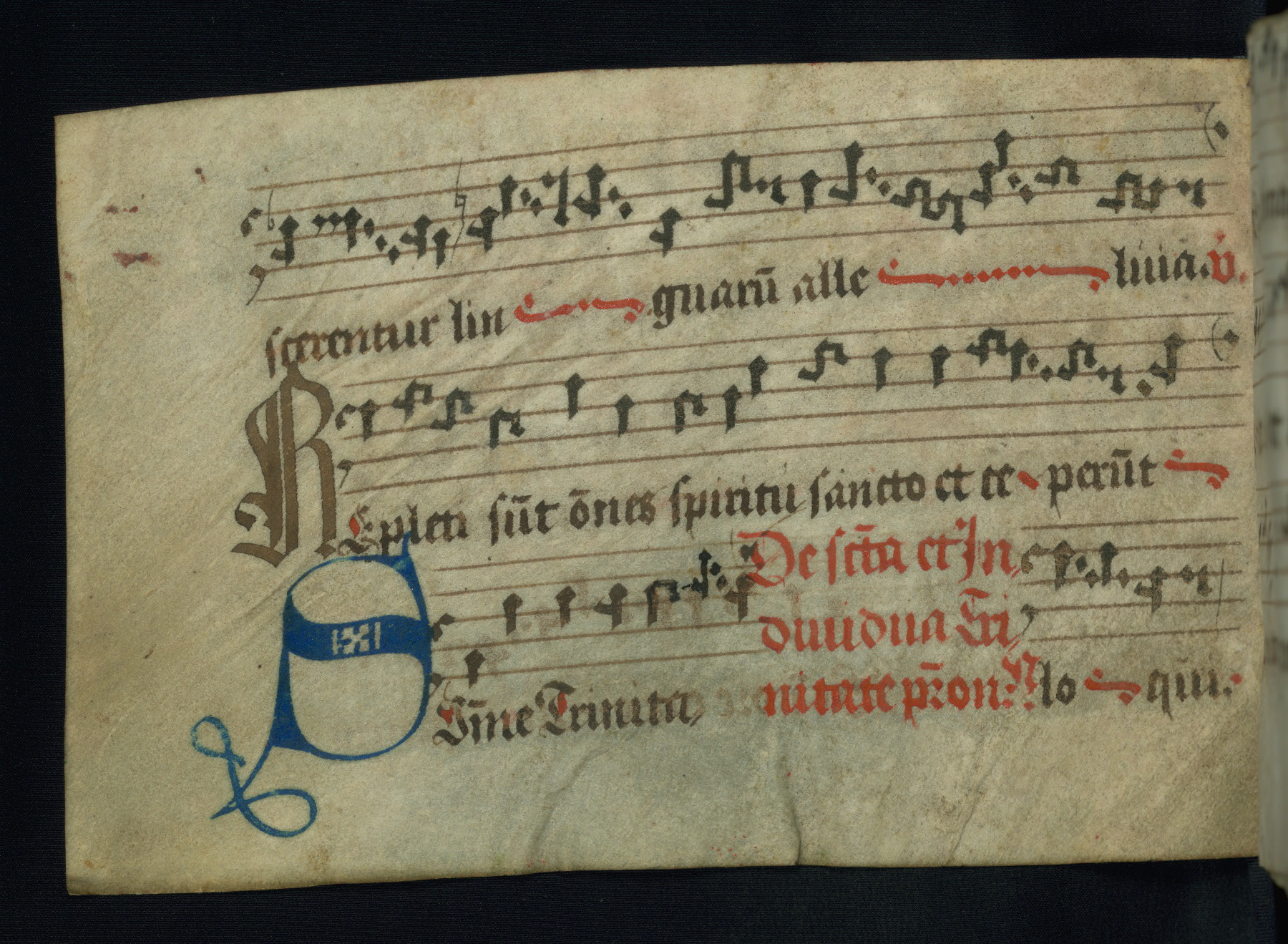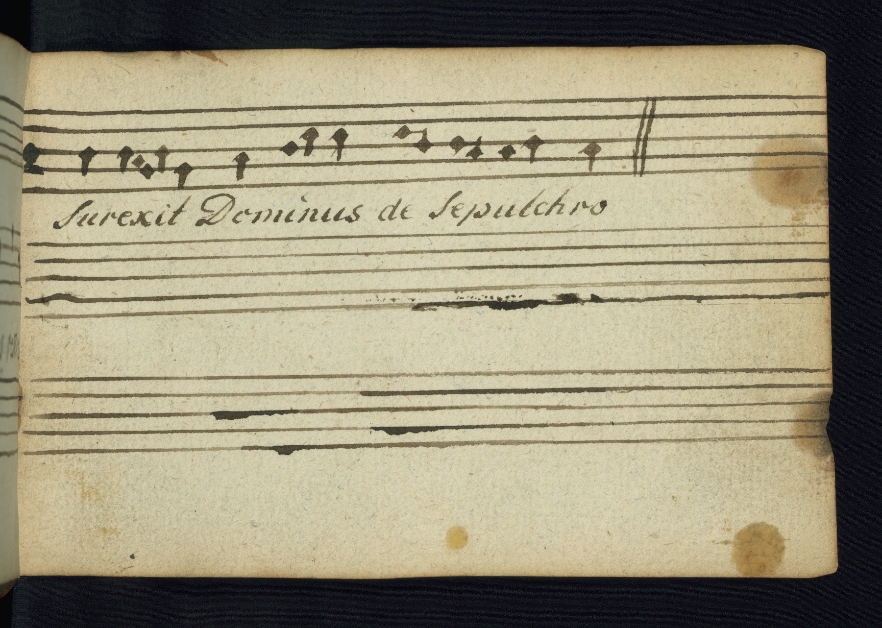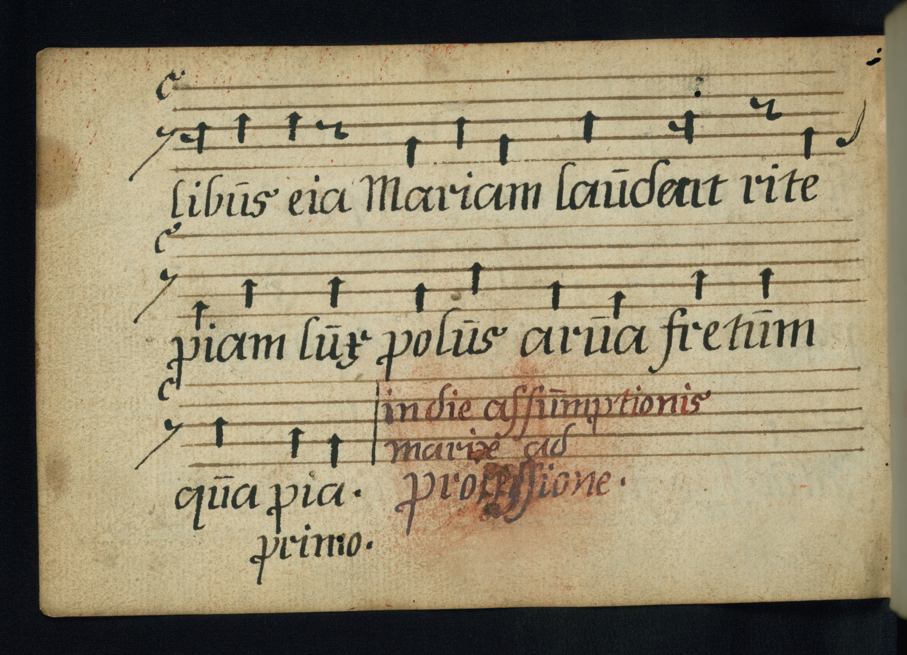 This manuscript contains liturgical music to be sung during processions. It is exceptional because of its "album" format (10 x 14.5 cm), which is in part the result of a severe cropping of the folios. The book was made in the late fifteenth or early sixteenth century in Germany. Its continued use is evident from the seventeenth- or eighteenth-century addition of paper folios containing prayers and music. Music is written in Gothic notation on three five-line staves per folio. The first folio is illuminated with a foliate initial for the Feast of the Purification of the Virgin.