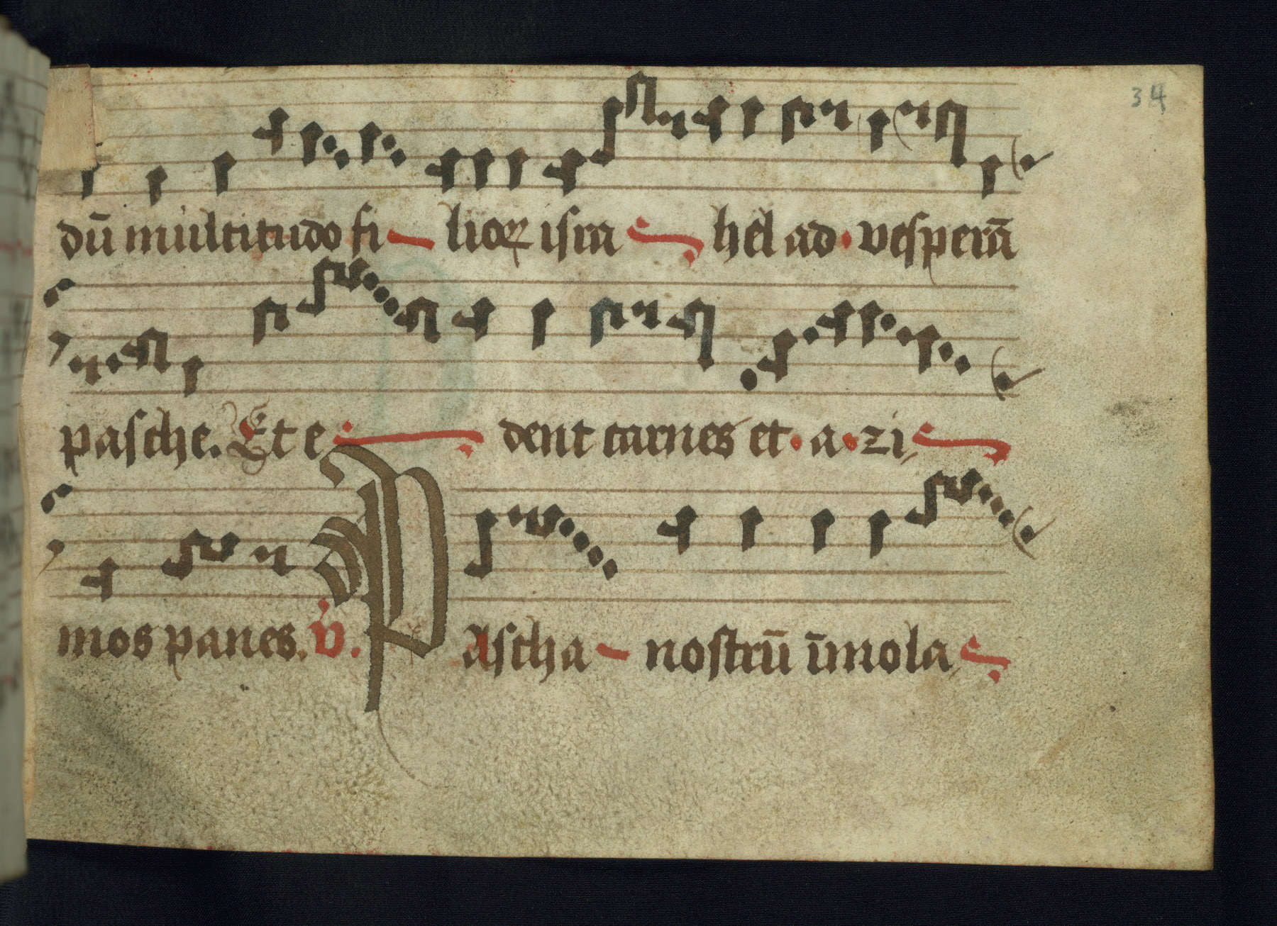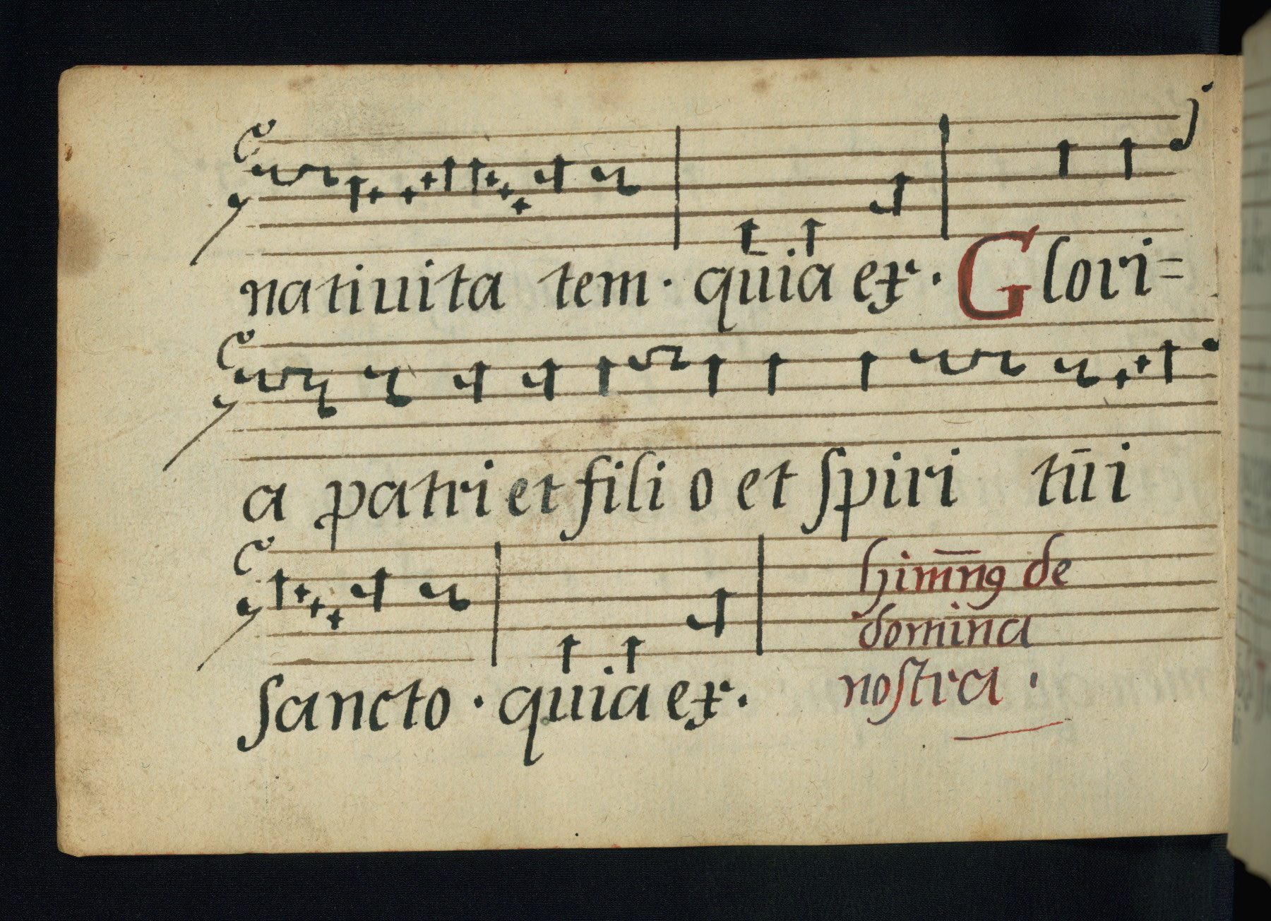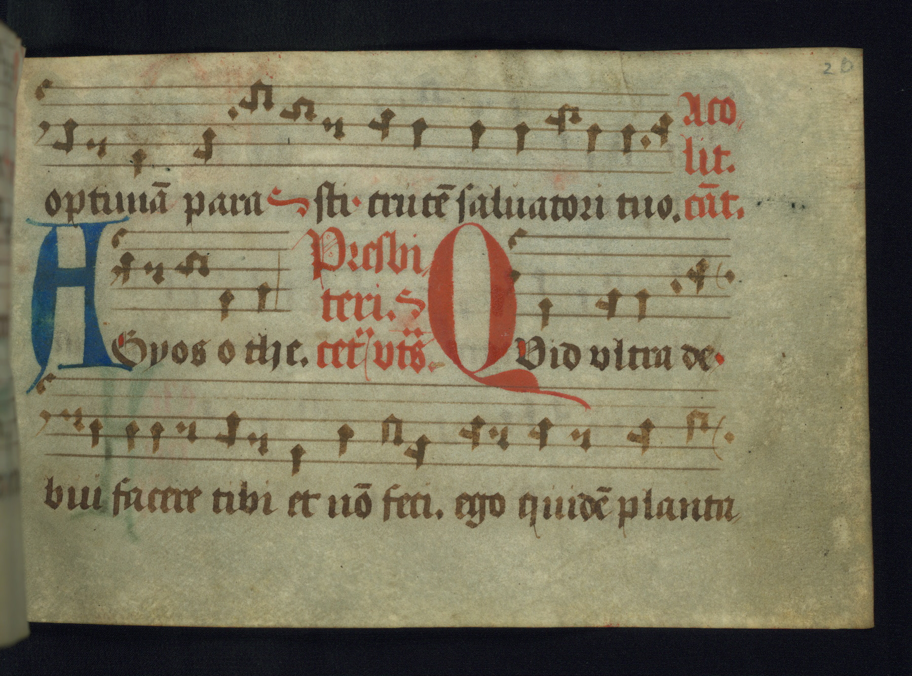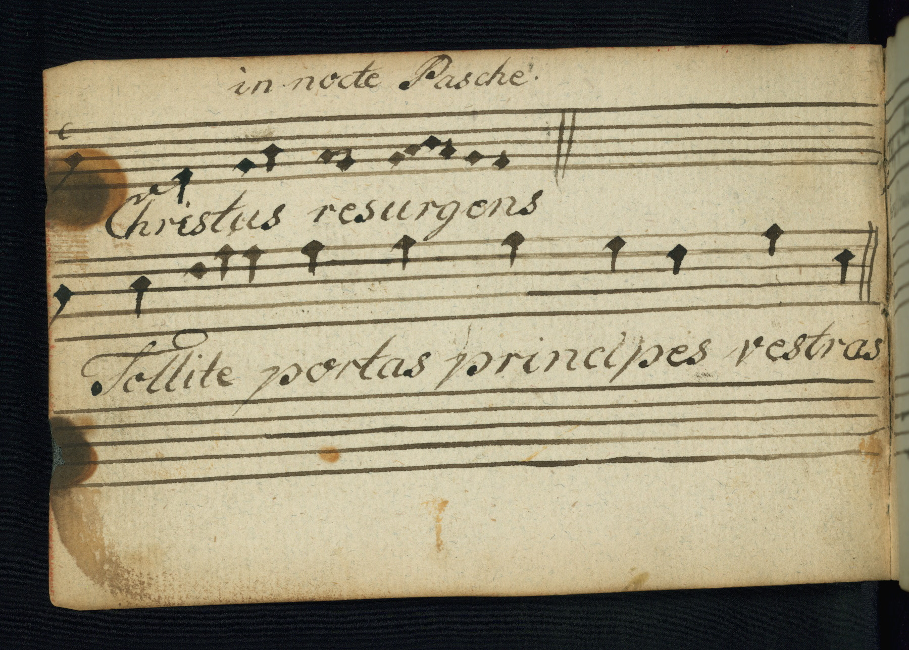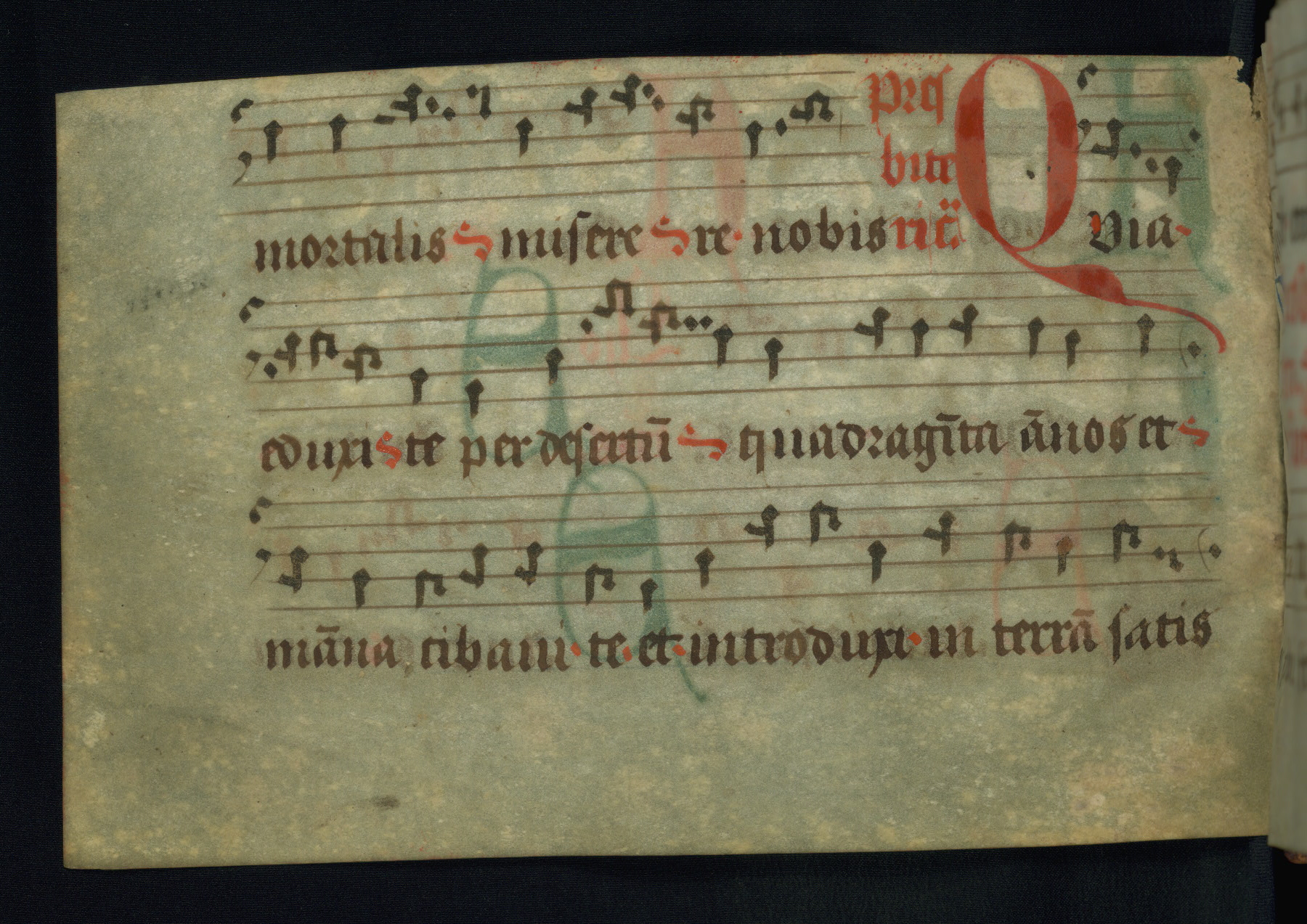 This manuscript contains liturgical music to be sung during processions. It is exceptional because of its "album" format (10 x 14.5 cm), which is in part the result of a severe cropping of the folios. The book was made in the late fifteenth or early sixteenth century in Germany. Its continued use is evident from the seventeenth- or eighteenth-century addition of paper folios containing prayers and music. Music is written in Gothic notation on three five-line staves per folio. The first folio is illuminated with a foliate initial for the Feast of the Purification of the Virgin.