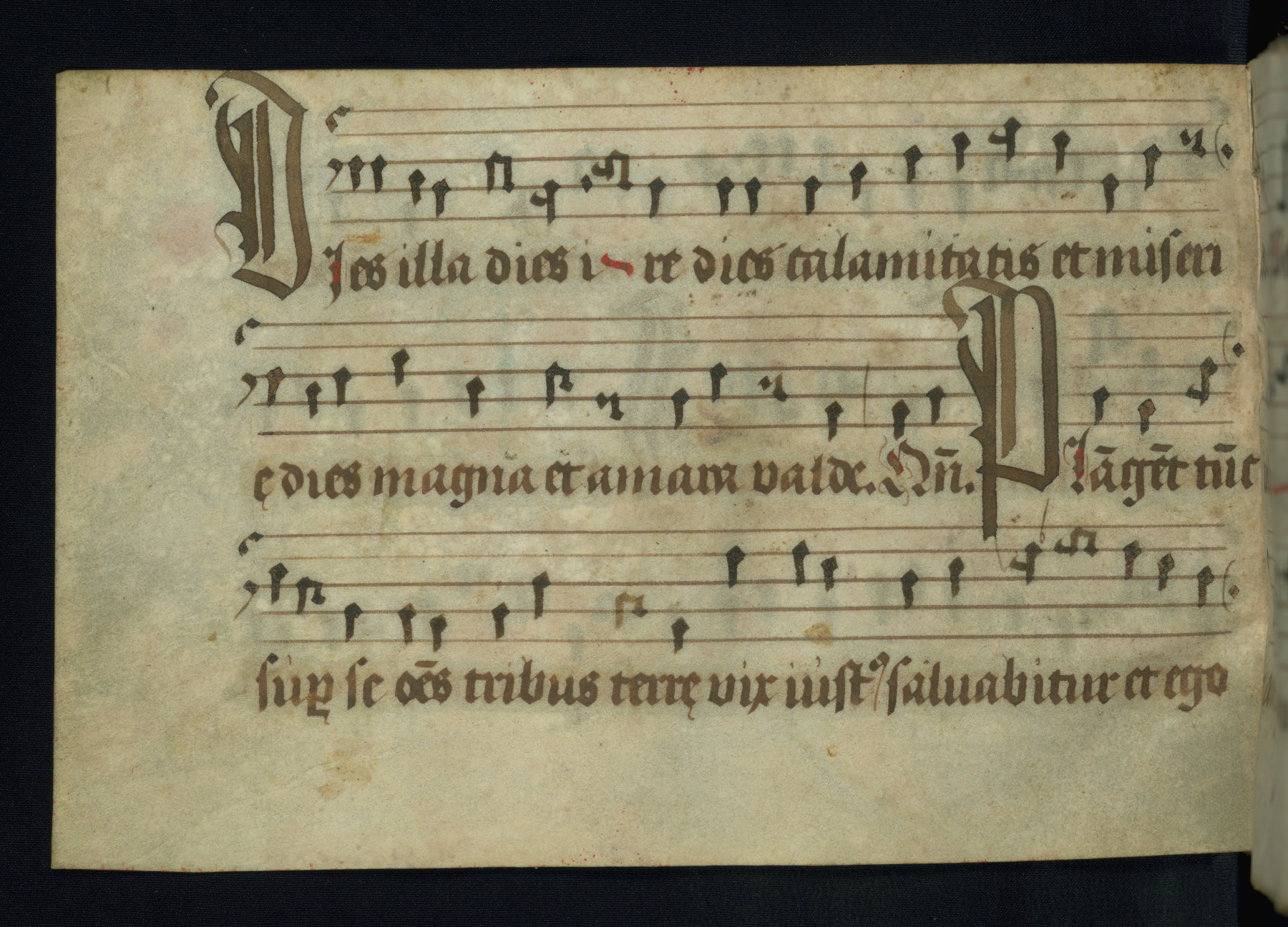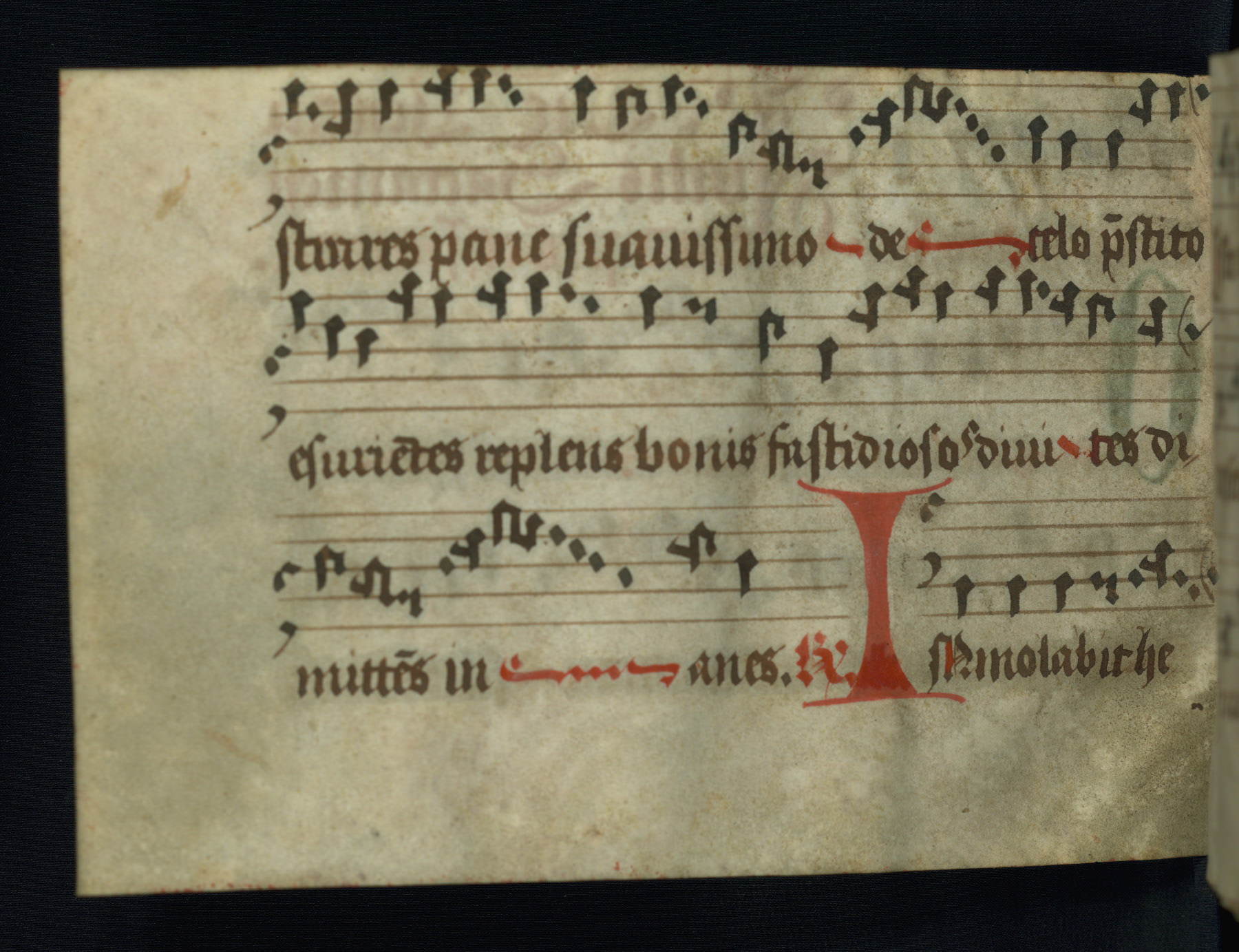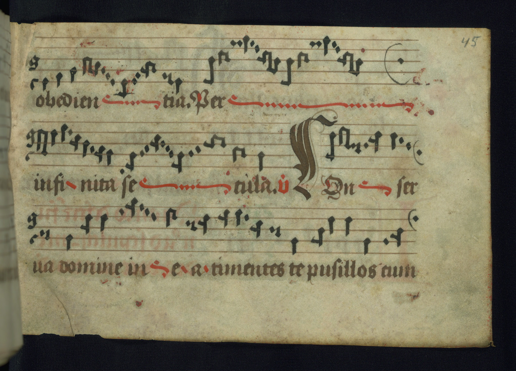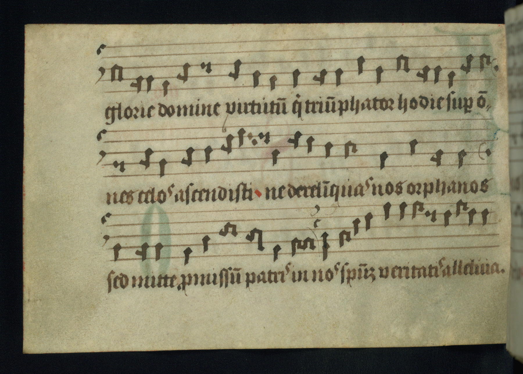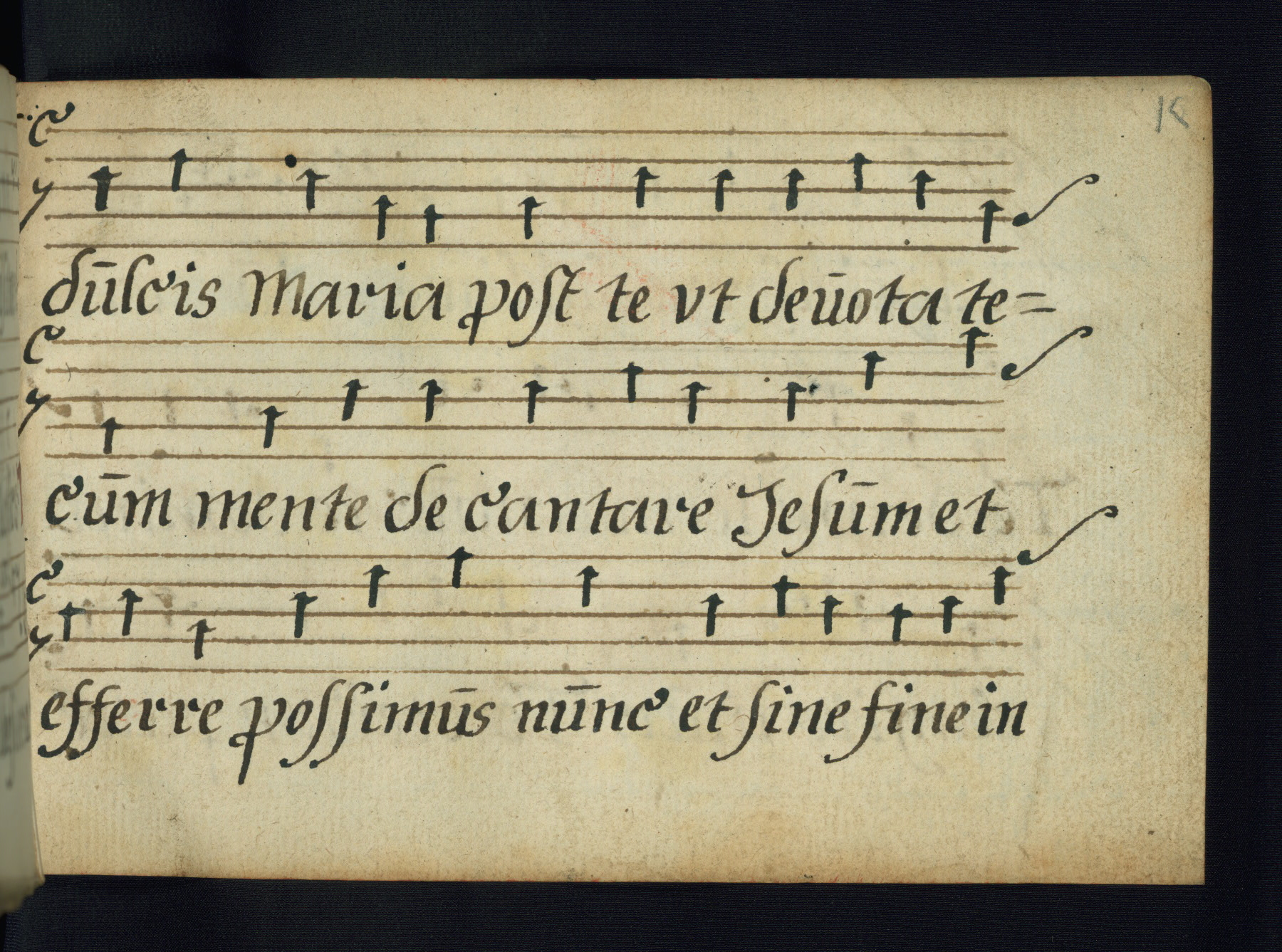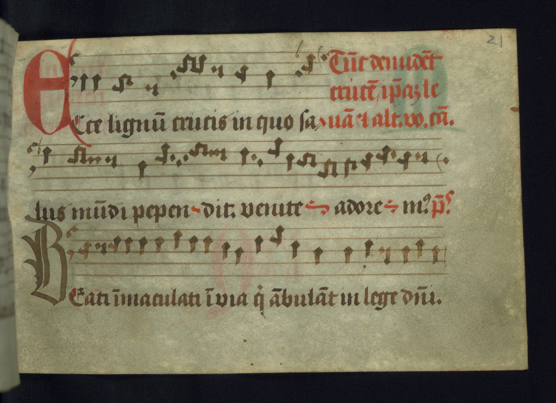 This manuscript contains liturgical music to be sung during processions. It is exceptional because of its "album" format (10 x 14.5 cm), which is in part the result of a severe cropping of the folios. The book was made in the late fifteenth or early sixteenth century in Germany. Its continued use is evident from the seventeenth- or eighteenth-century addition of paper folios containing prayers and music. Music is written in Gothic notation on three five-line staves per folio. The first folio is illuminated with a foliate initial for the Feast of the Purification of the Virgin.