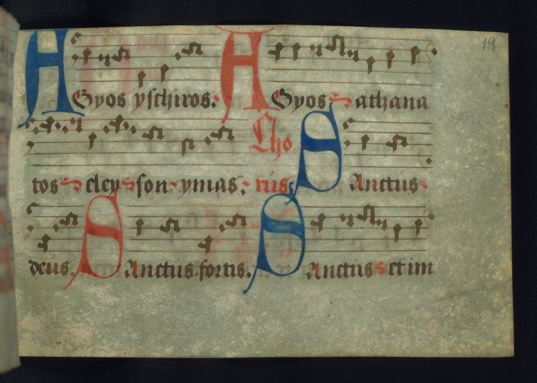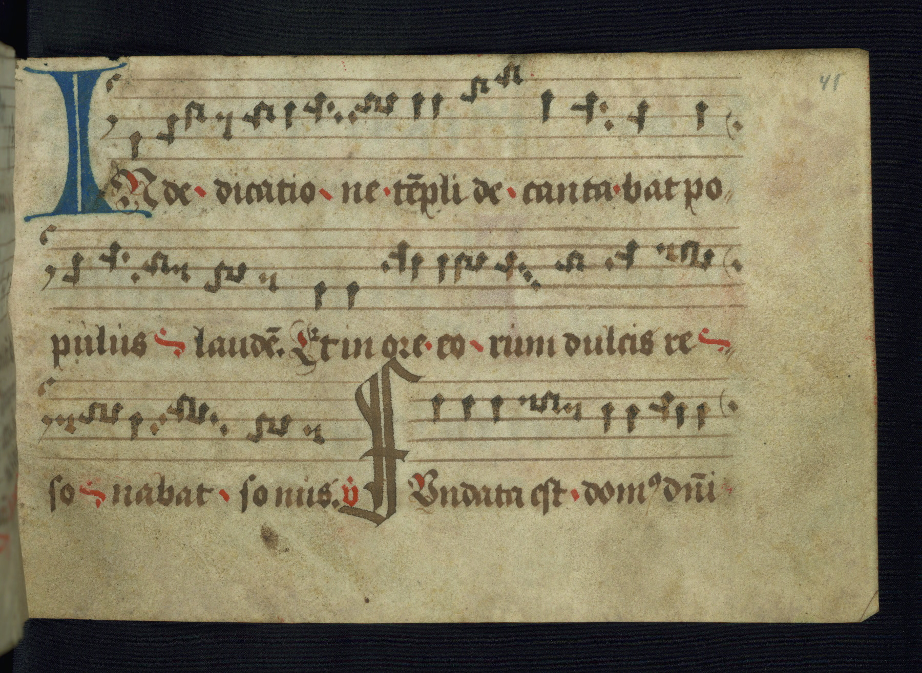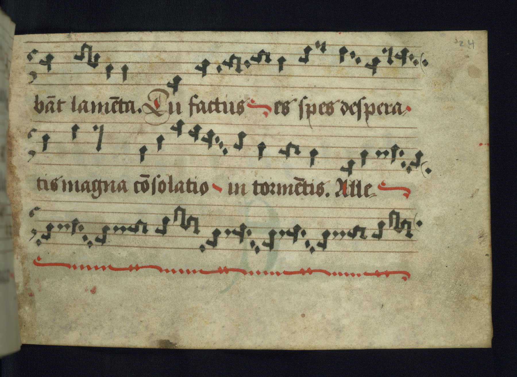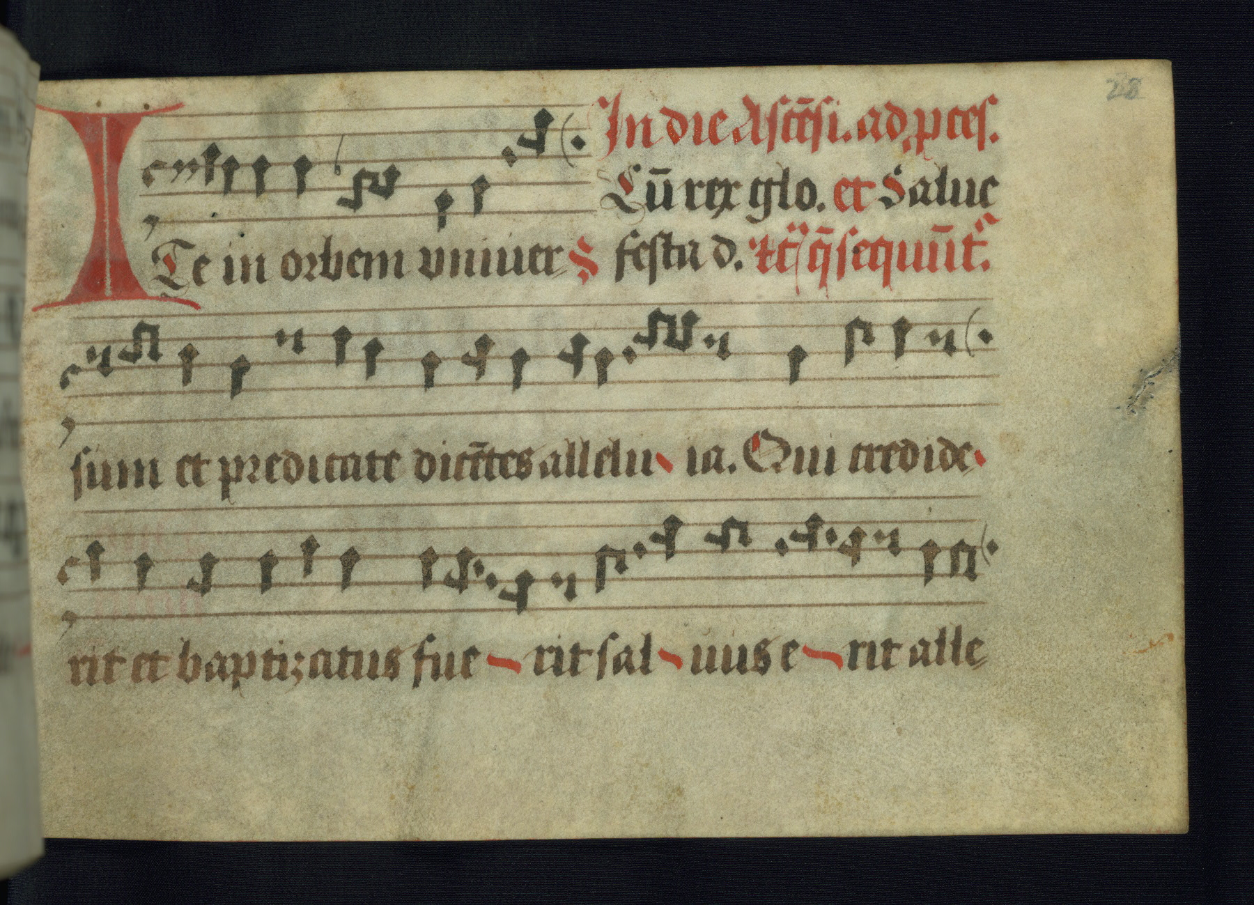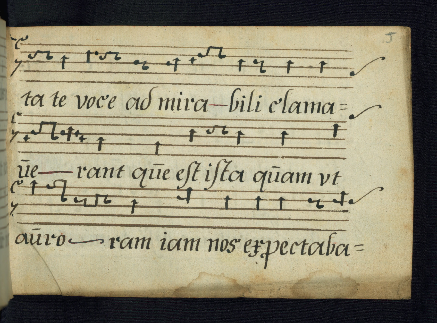 This manuscript contains liturgical music to be sung during processions. It is exceptional because of its "album" format (10 x 14.5 cm), which is in part the result of a severe cropping of the folios. The book was made in the late fifteenth or early sixteenth century in Germany. Its continued use is evident from the seventeenth- or eighteenth-century addition of paper folios containing prayers and music. Music is written in Gothic notation on three five-line staves per folio. The first folio is illuminated with a foliate initial for the Feast of the Purification of the Virgin.