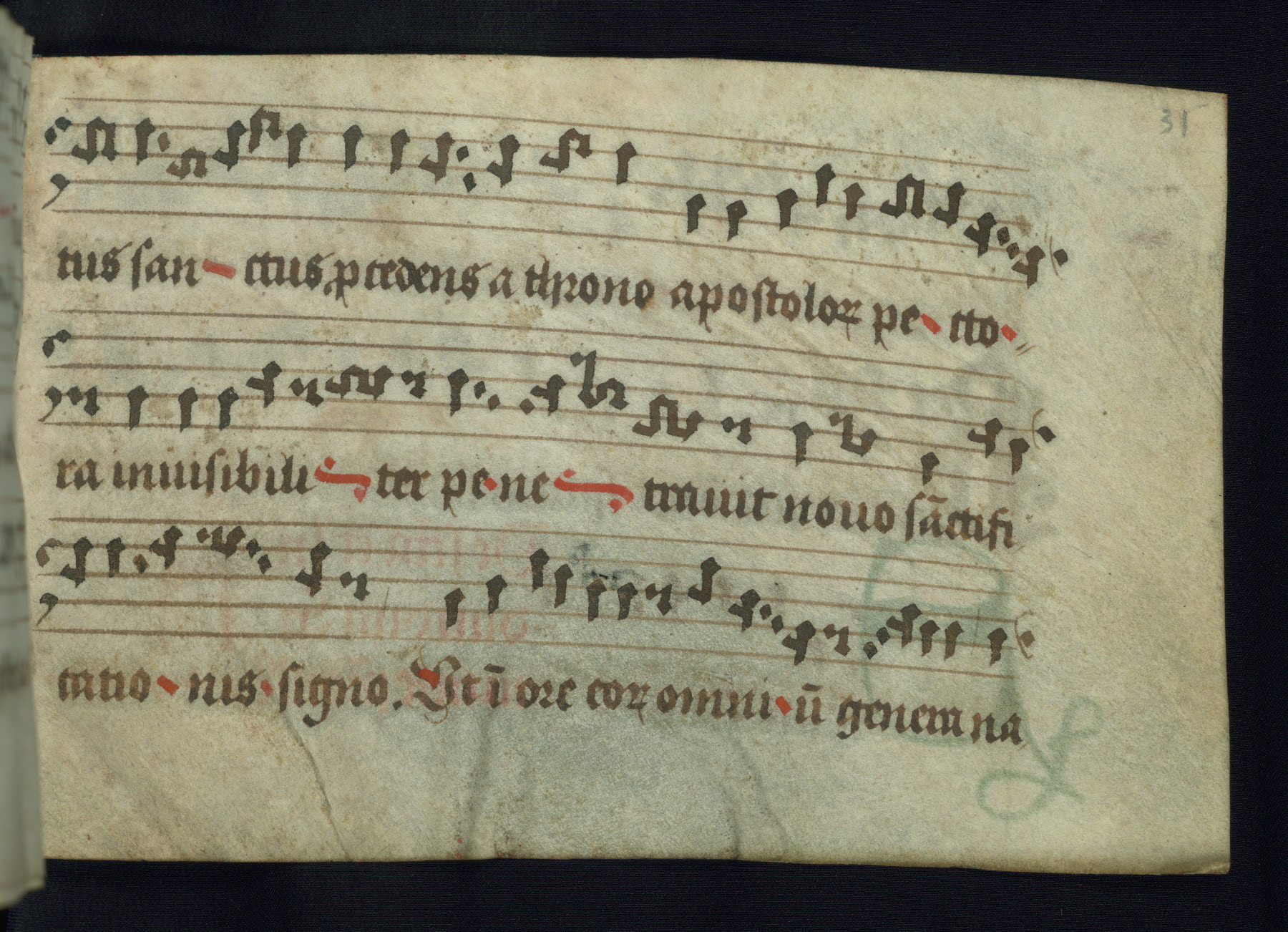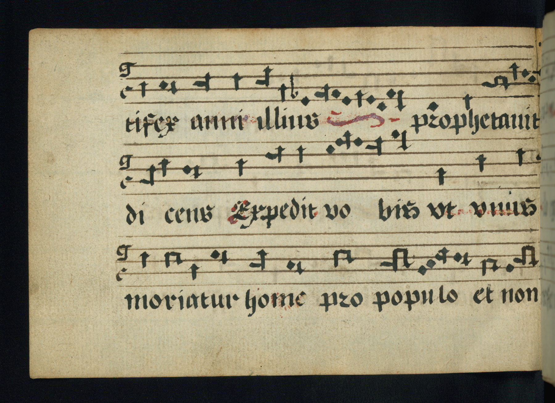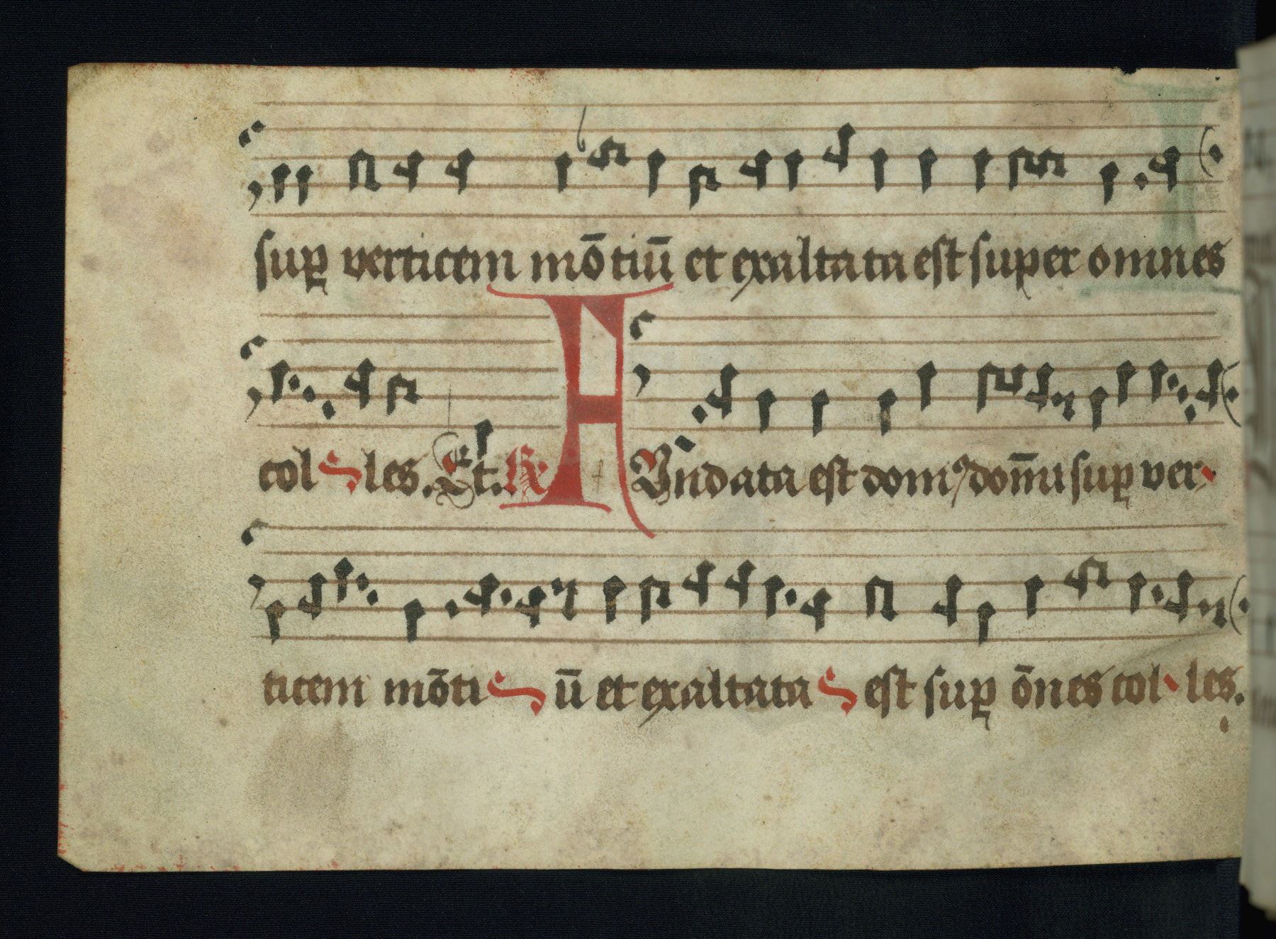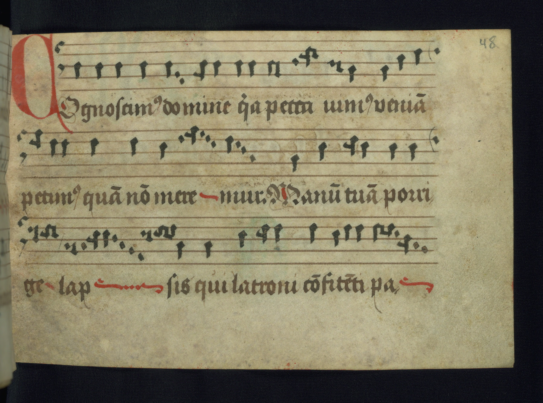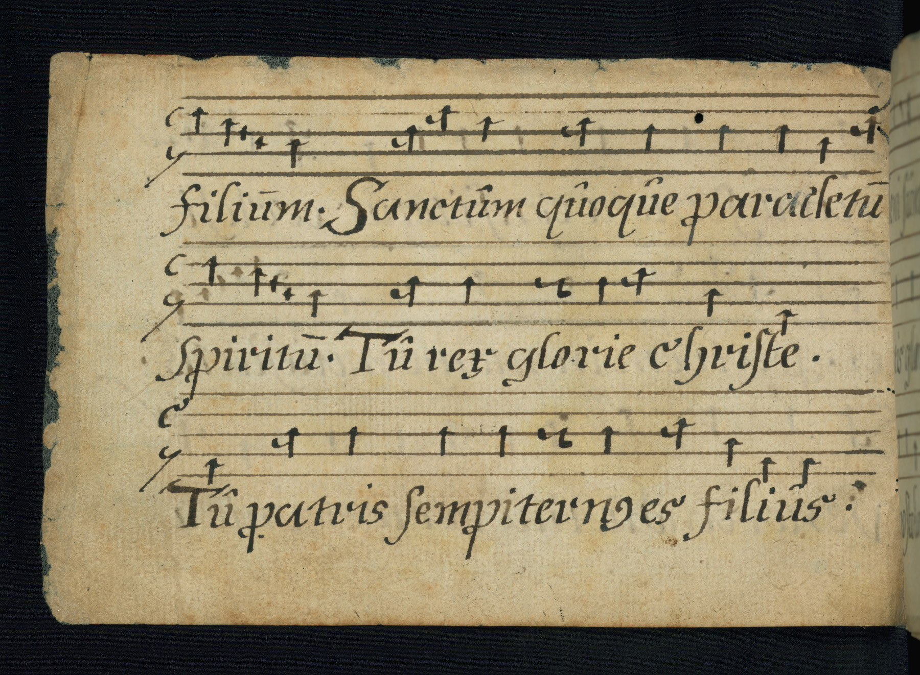 This manuscript contains liturgical music to be sung during processions. It is exceptional because of its "album" format (10 x 14.5 cm), which is in part the result of a severe cropping of the folios. The book was made in the late fifteenth or early sixteenth century in Germany. Its continued use is evident from the seventeenth- or eighteenth-century addition of paper folios containing prayers and music. Music is written in Gothic notation on three five-line staves per folio. The first folio is illuminated with a foliate initial for the Feast of the Purification of the Virgin.