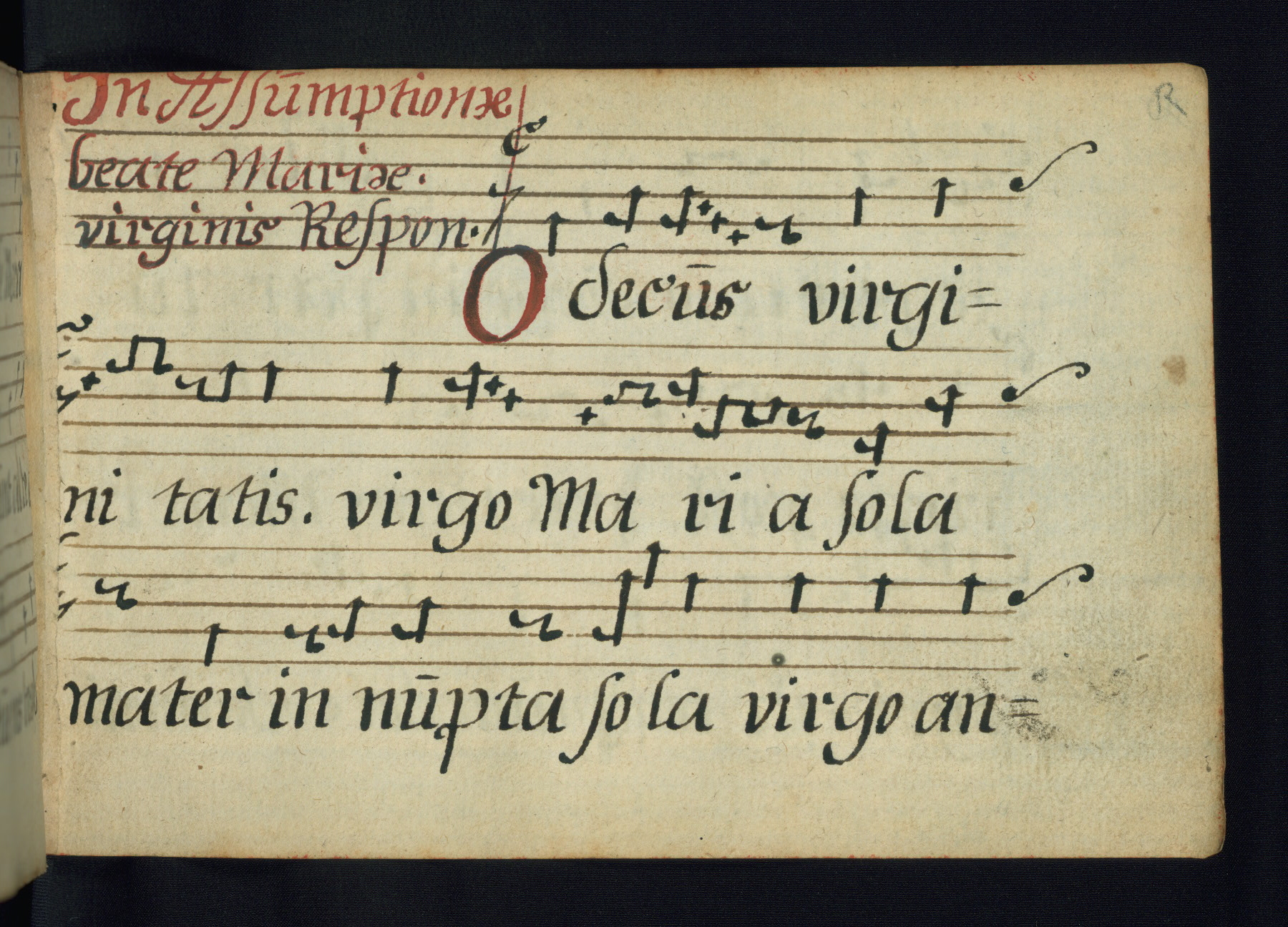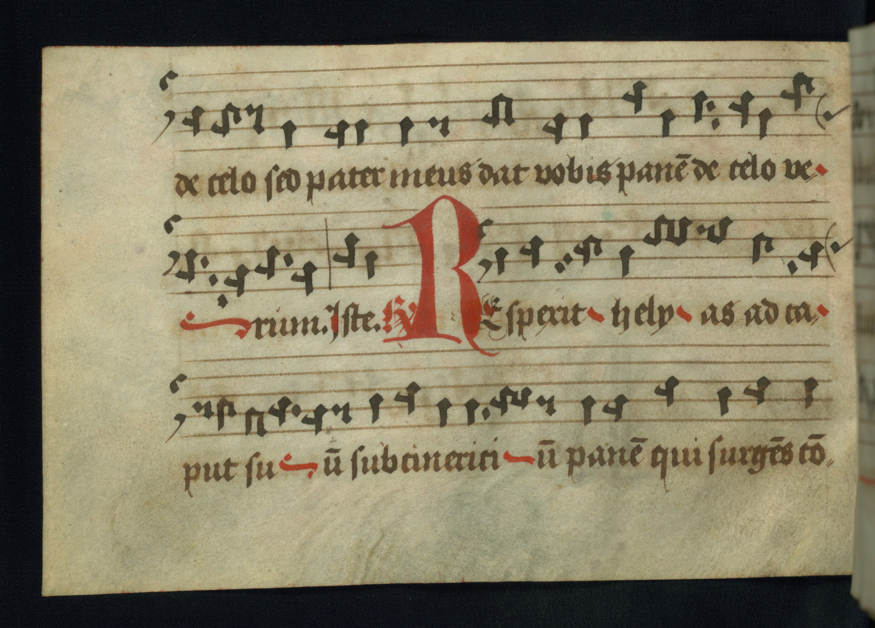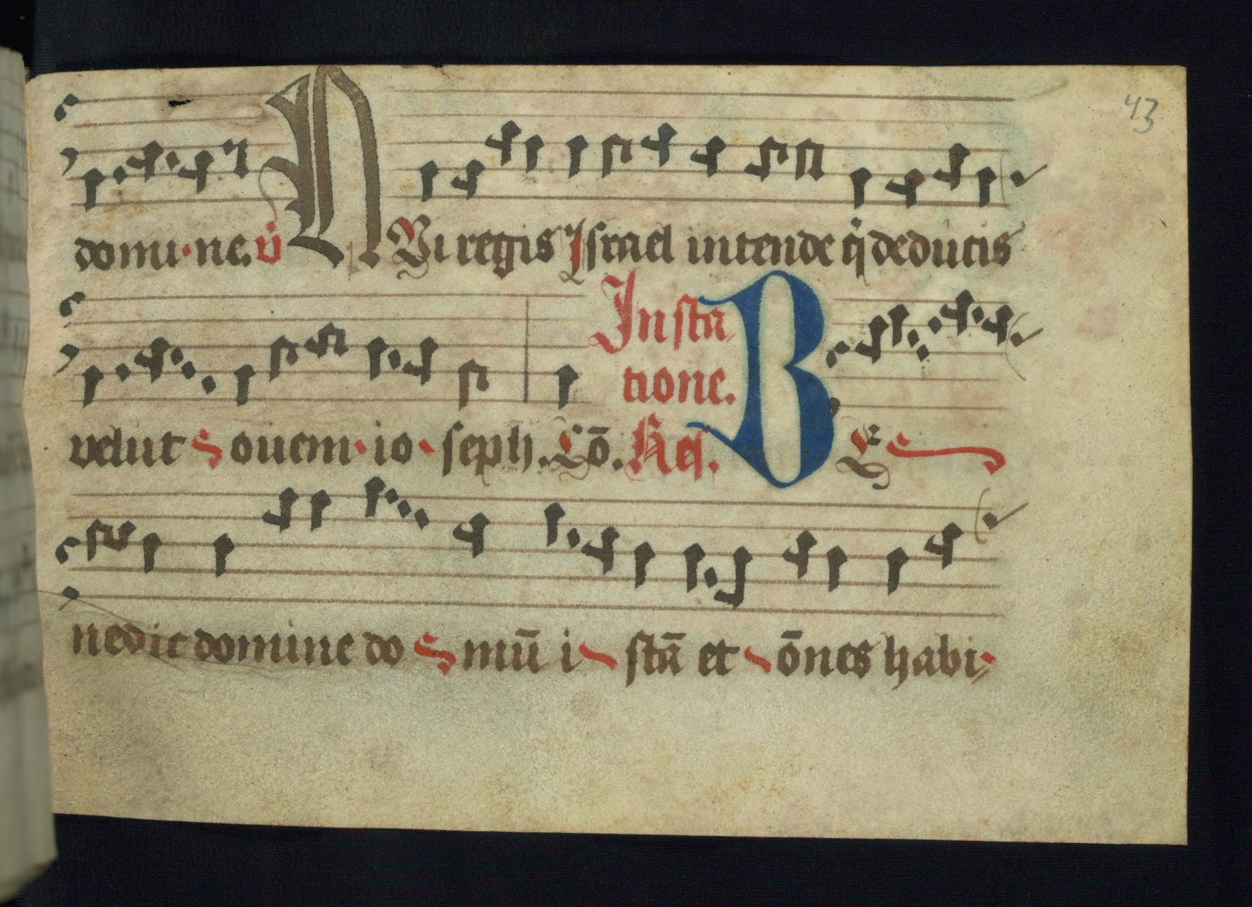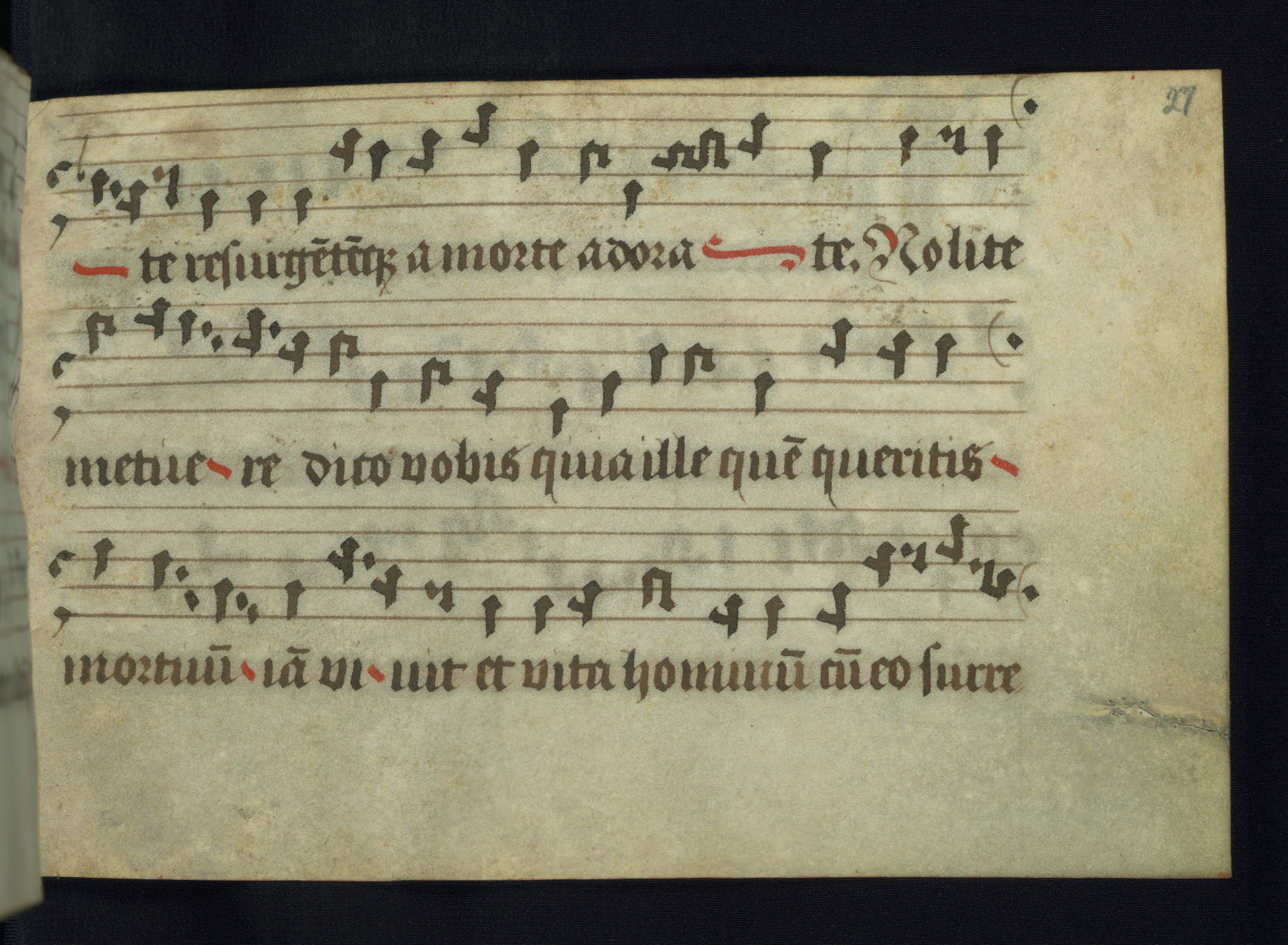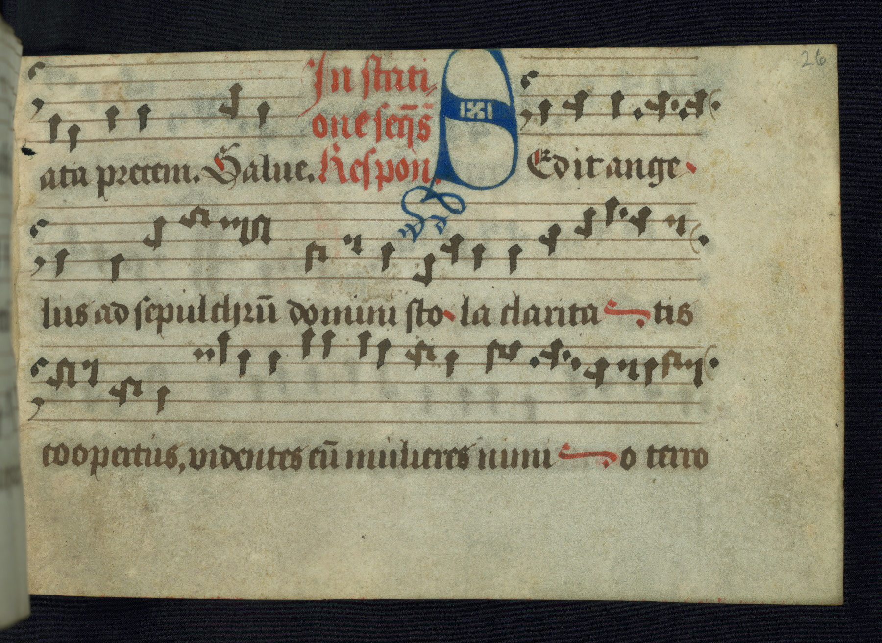 This manuscript contains liturgical music to be sung during processions. It is exceptional because of its "album" format (10 x 14.5 cm), which is in part the result of a severe cropping of the folios. The book was made in the late fifteenth or early sixteenth century in Germany. Its continued use is evident from the seventeenth- or eighteenth-century addition of paper folios containing prayers and music. Music is written in Gothic notation on three five-line staves per folio. The first folio is illuminated with a foliate initial for the Feast of the Purification of the Virgin.
