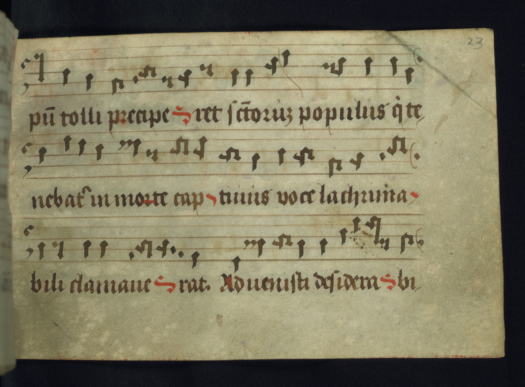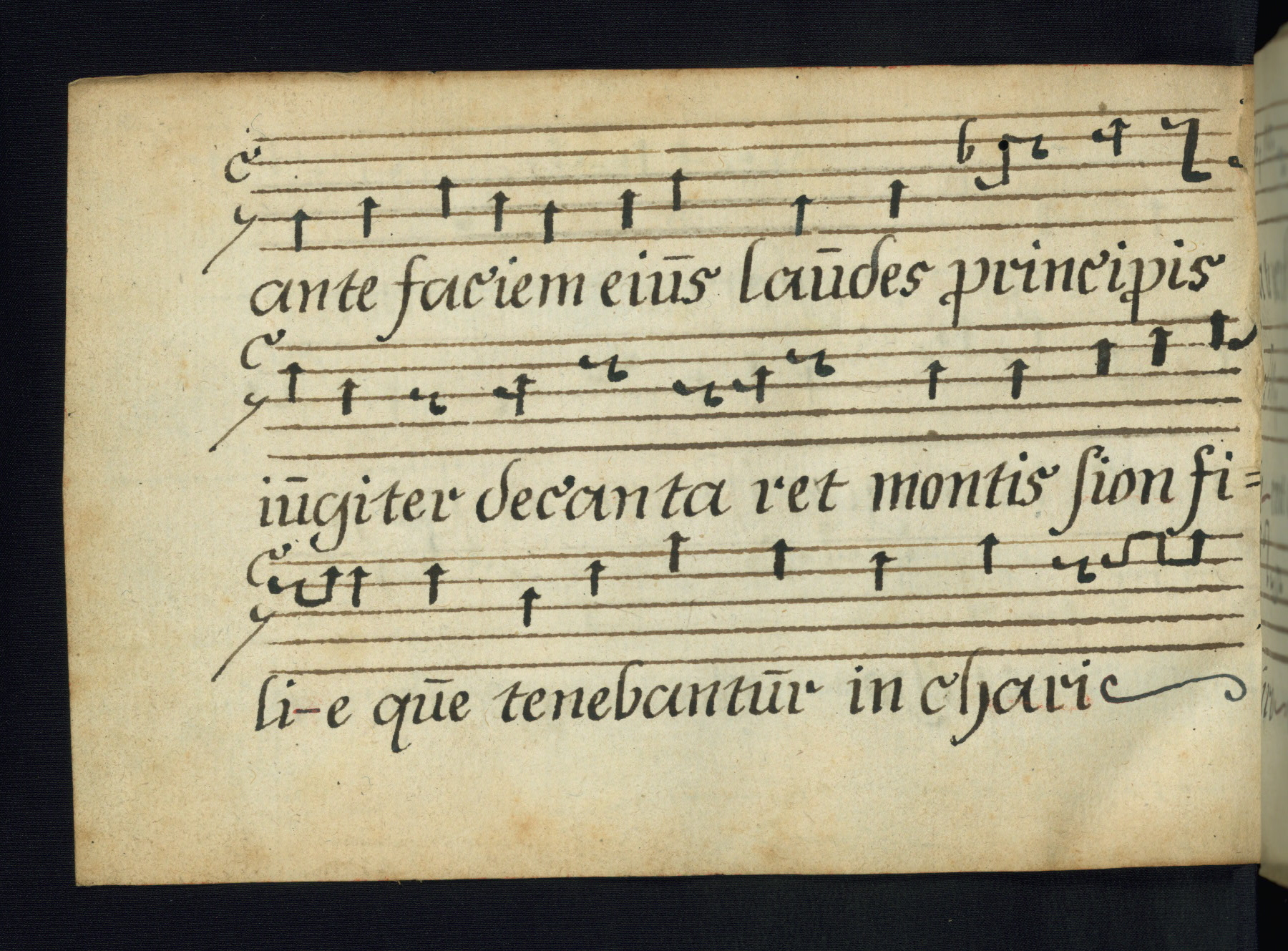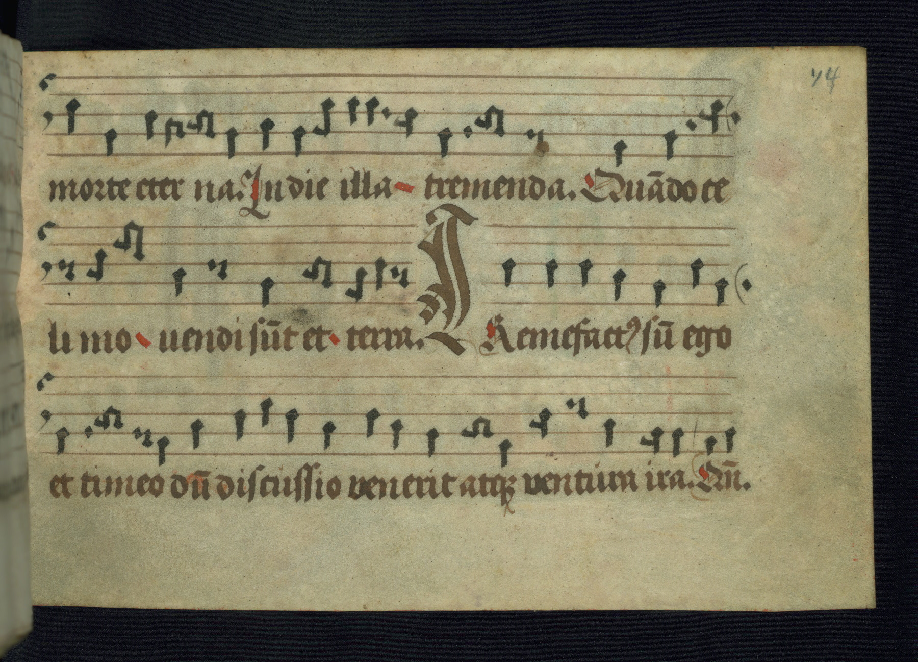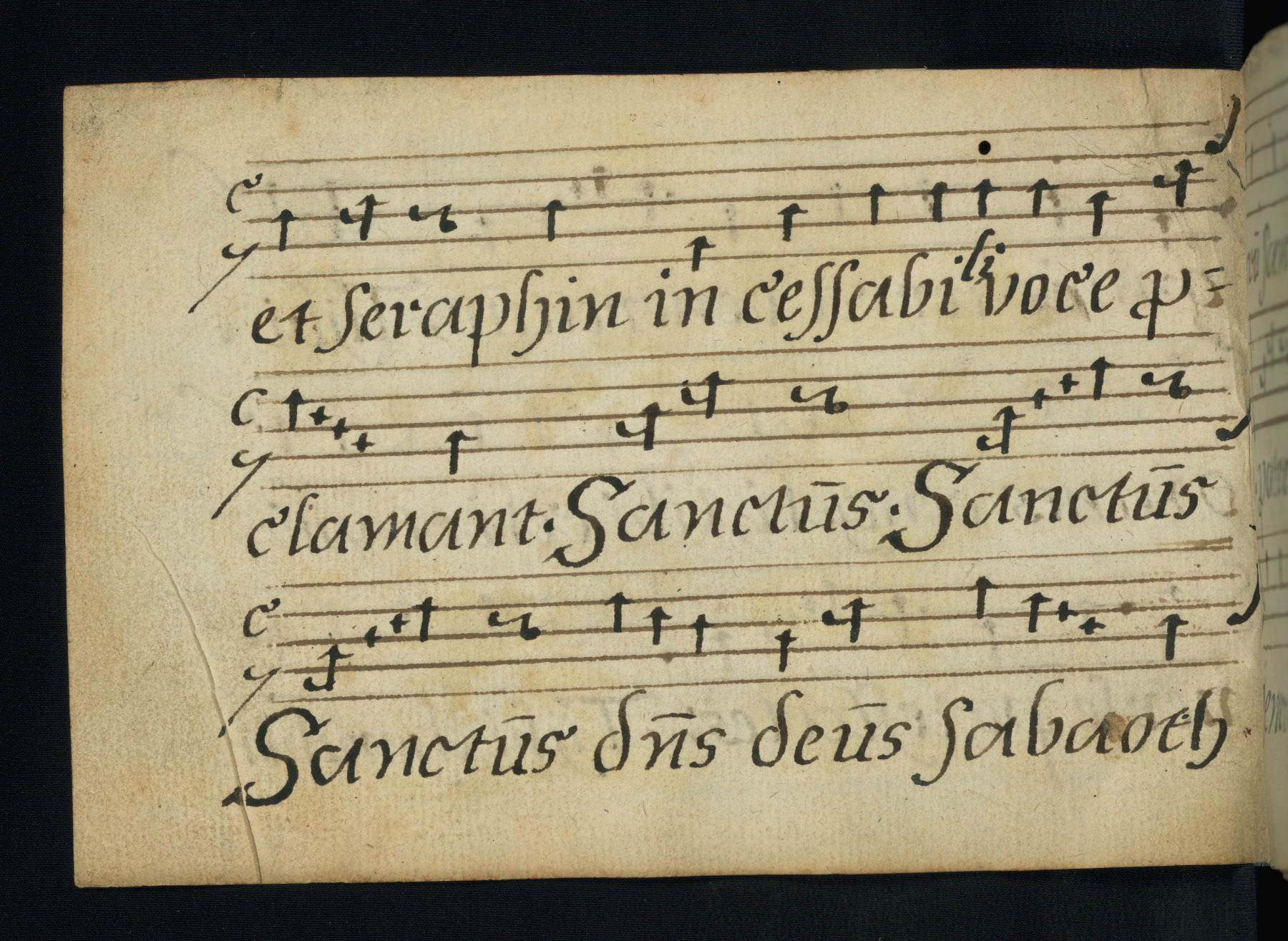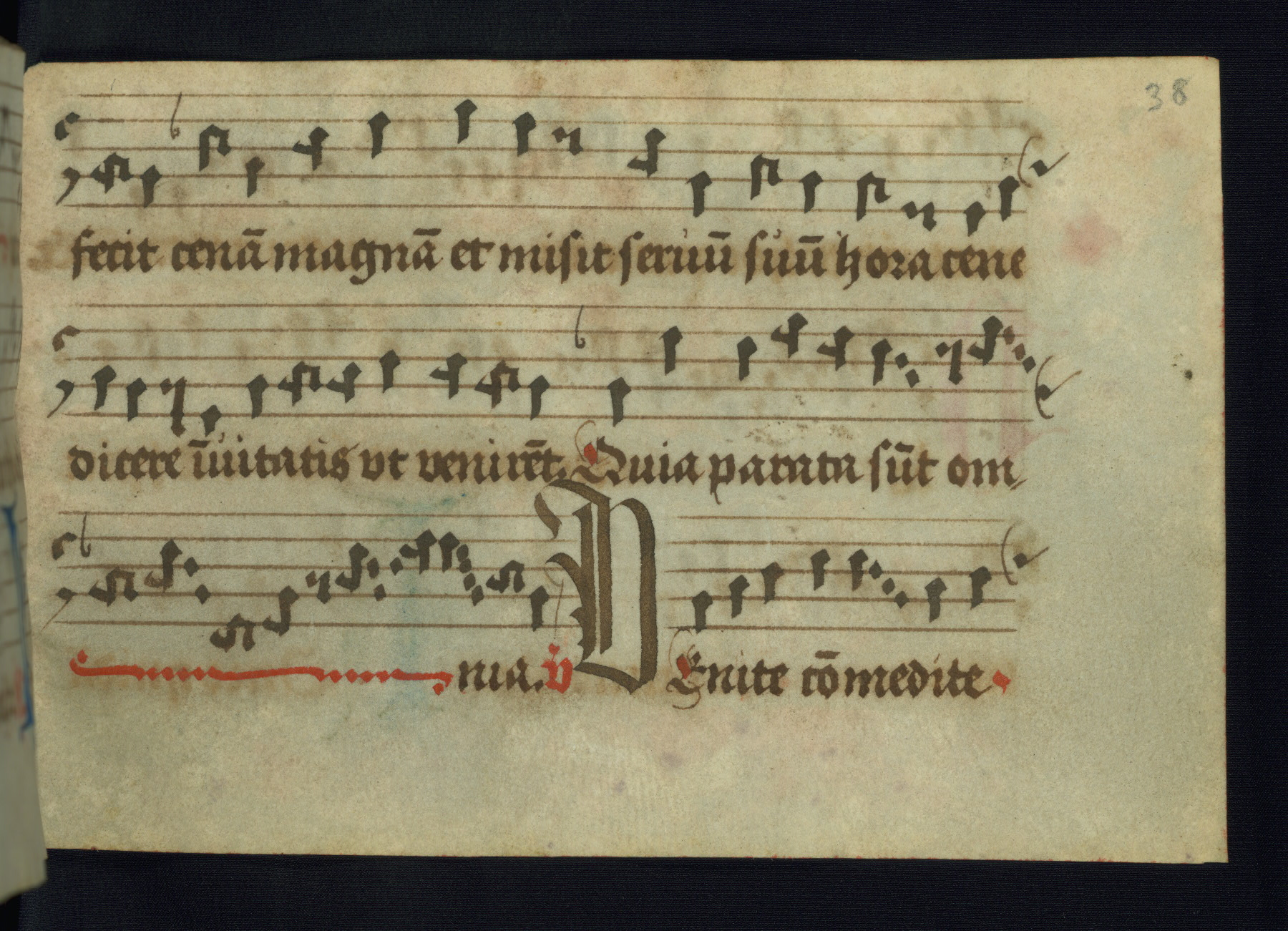 This manuscript contains liturgical music to be sung during processions. It is exceptional because of its "album" format (10 x 14.5 cm), which is in part the result of a severe cropping of the folios. The book was made in the late fifteenth or early sixteenth century in Germany. Its continued use is evident from the seventeenth- or eighteenth-century addition of paper folios containing prayers and music. Music is written in Gothic notation on three five-line staves per folio. The first folio is illuminated with a foliate initial for the Feast of the Purification of the Virgin.