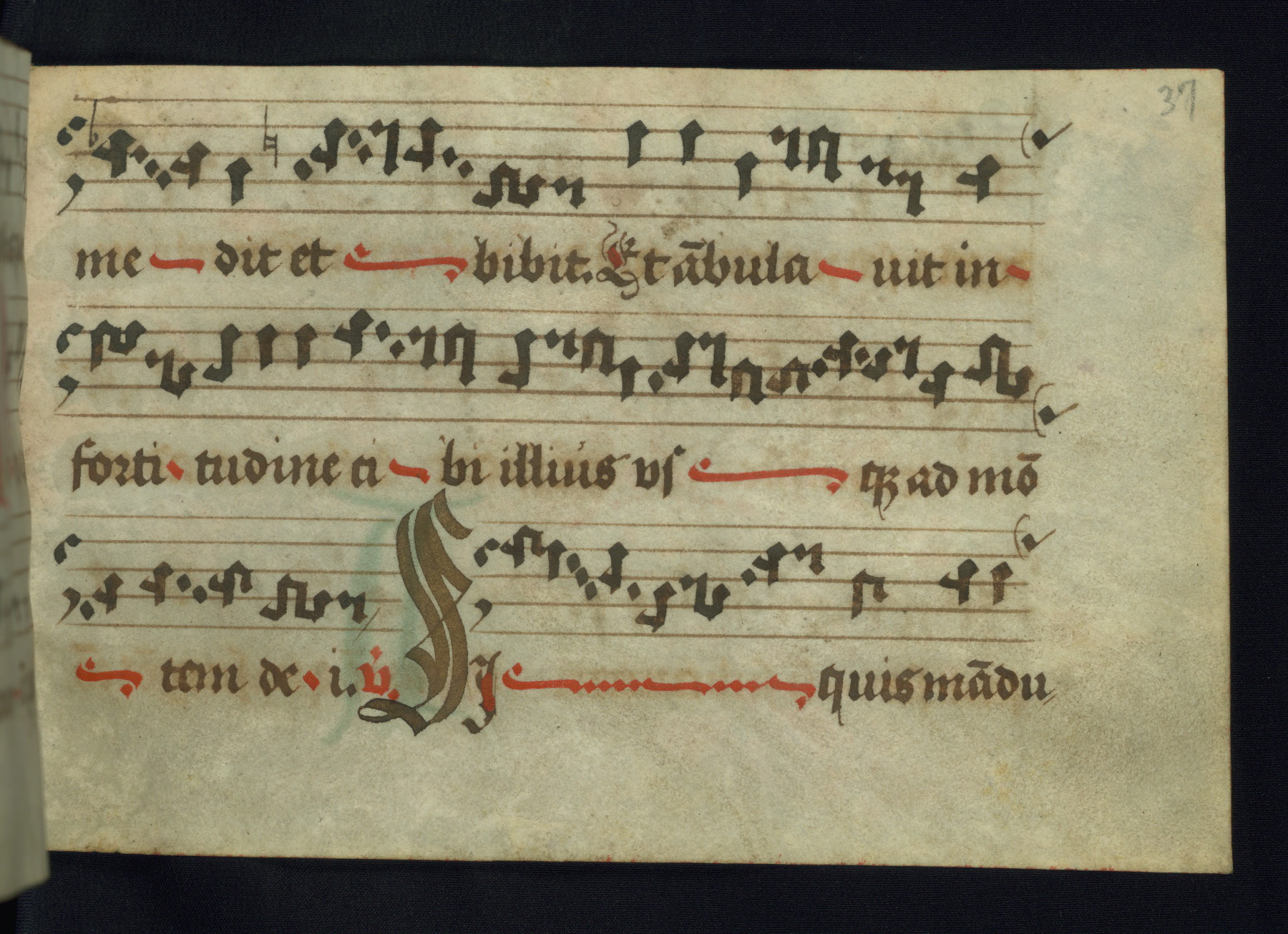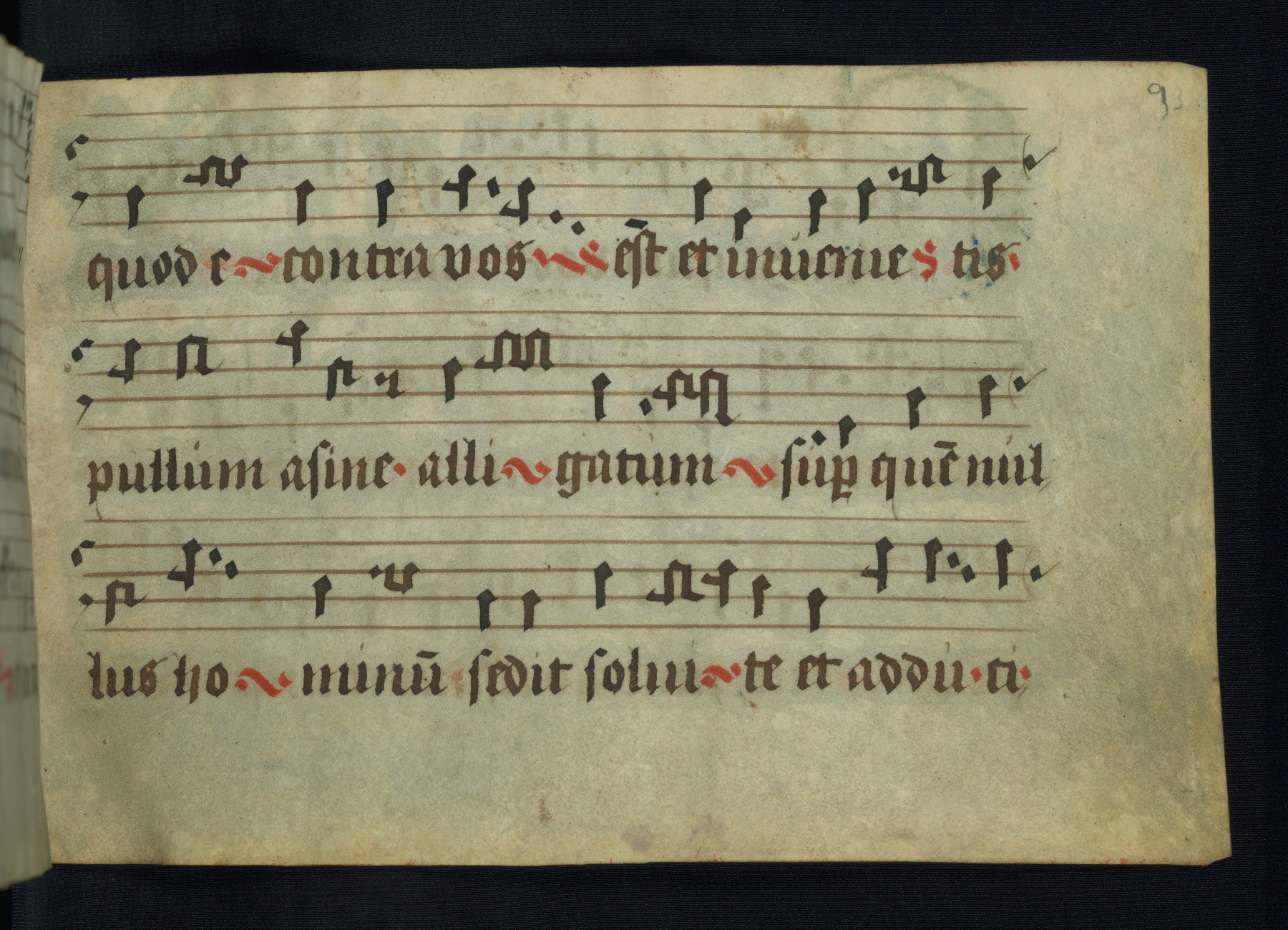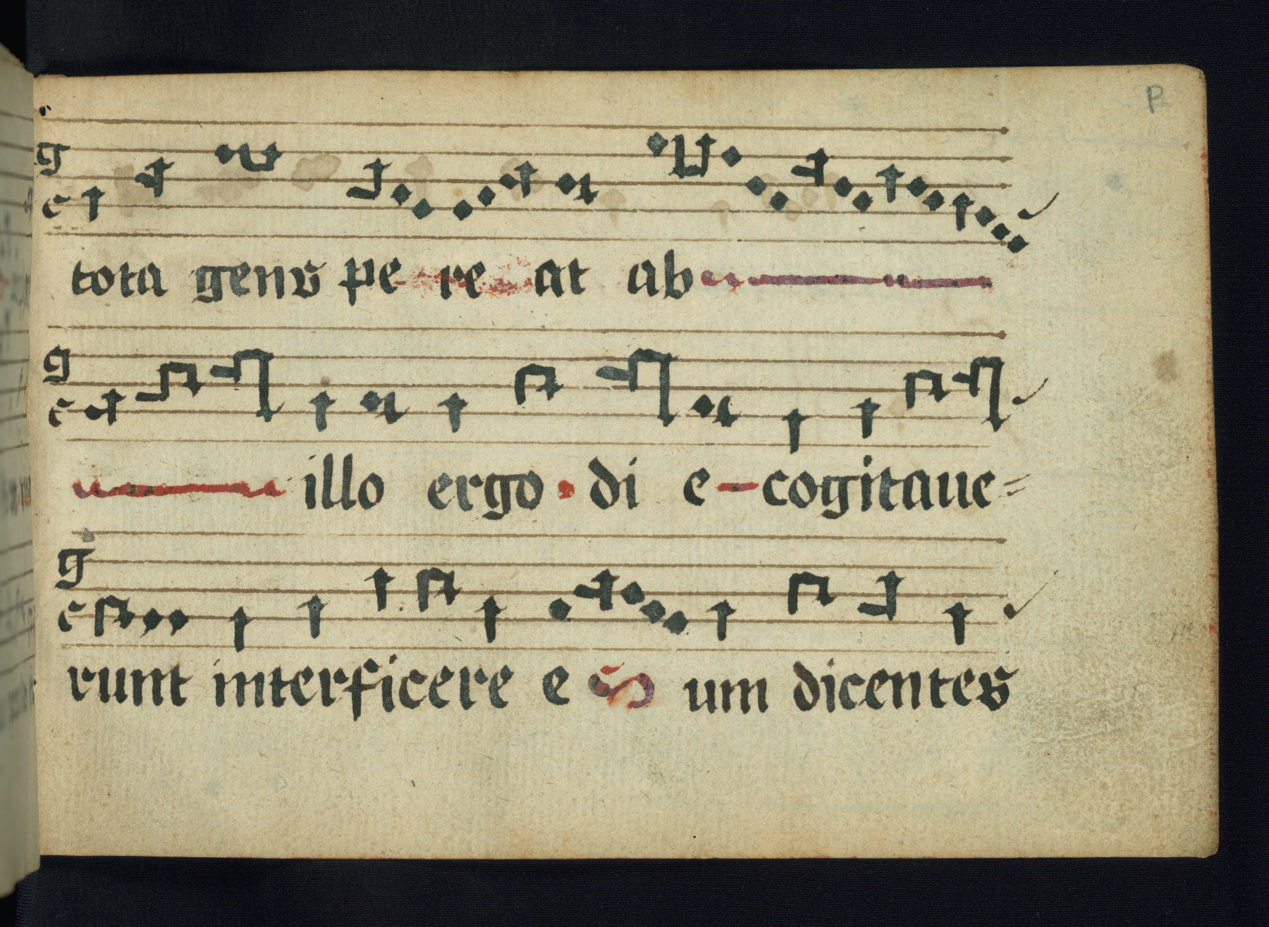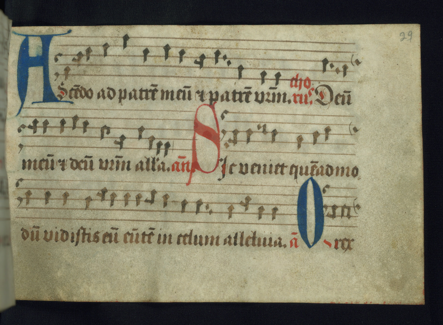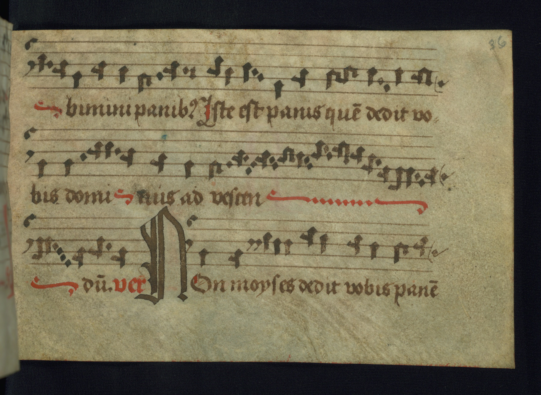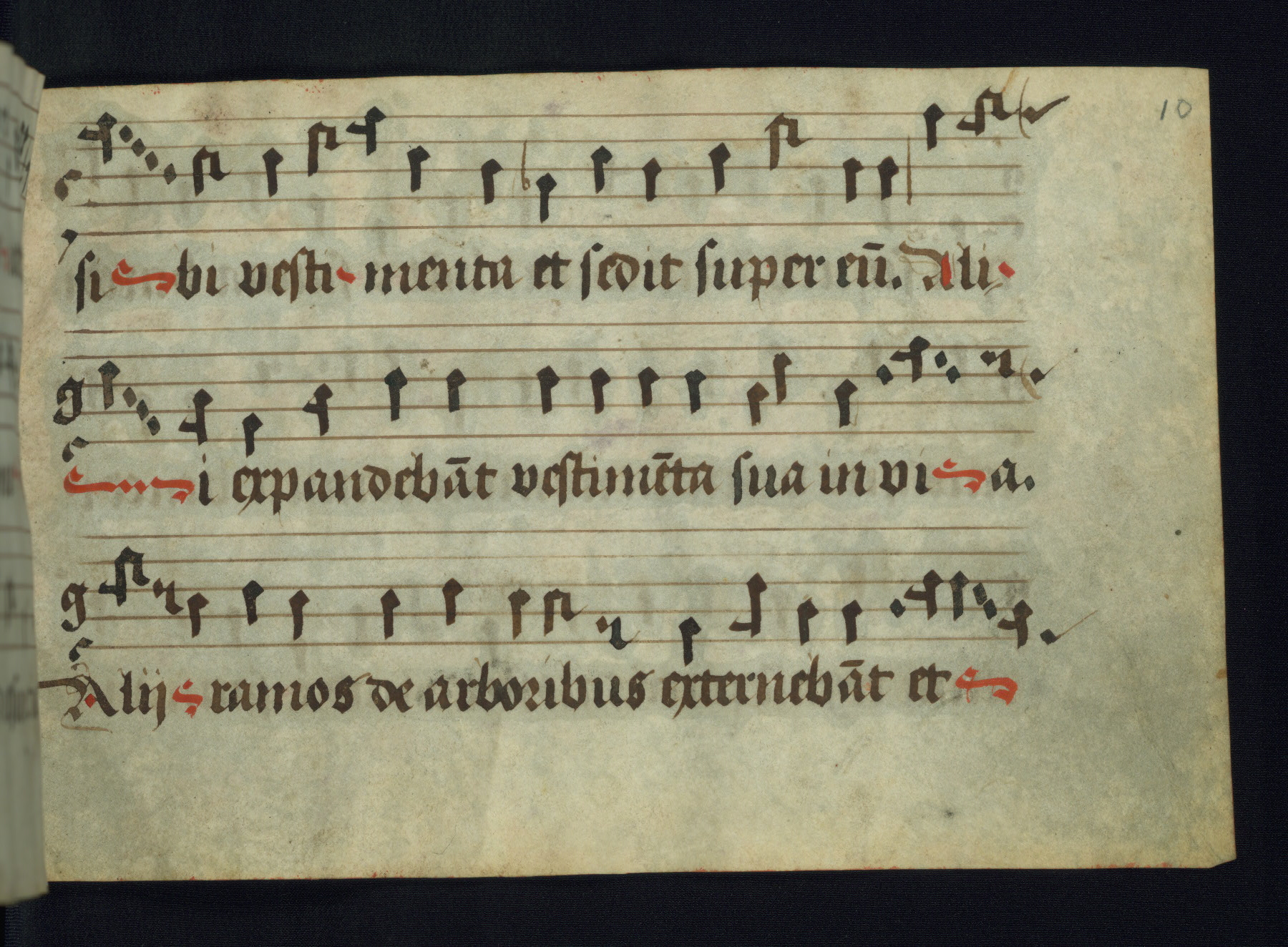 This manuscript contains liturgical music to be sung during processions. It is exceptional because of its "album" format (10 x 14.5 cm), which is in part the result of a severe cropping of the folios. The book was made in the late fifteenth or early sixteenth century in Germany. Its continued use is evident from the seventeenth- or eighteenth-century addition of paper folios containing prayers and music. Music is written in Gothic notation on three five-line staves per folio. The first folio is illuminated with a foliate initial for the Feast of the Purification of the Virgin.