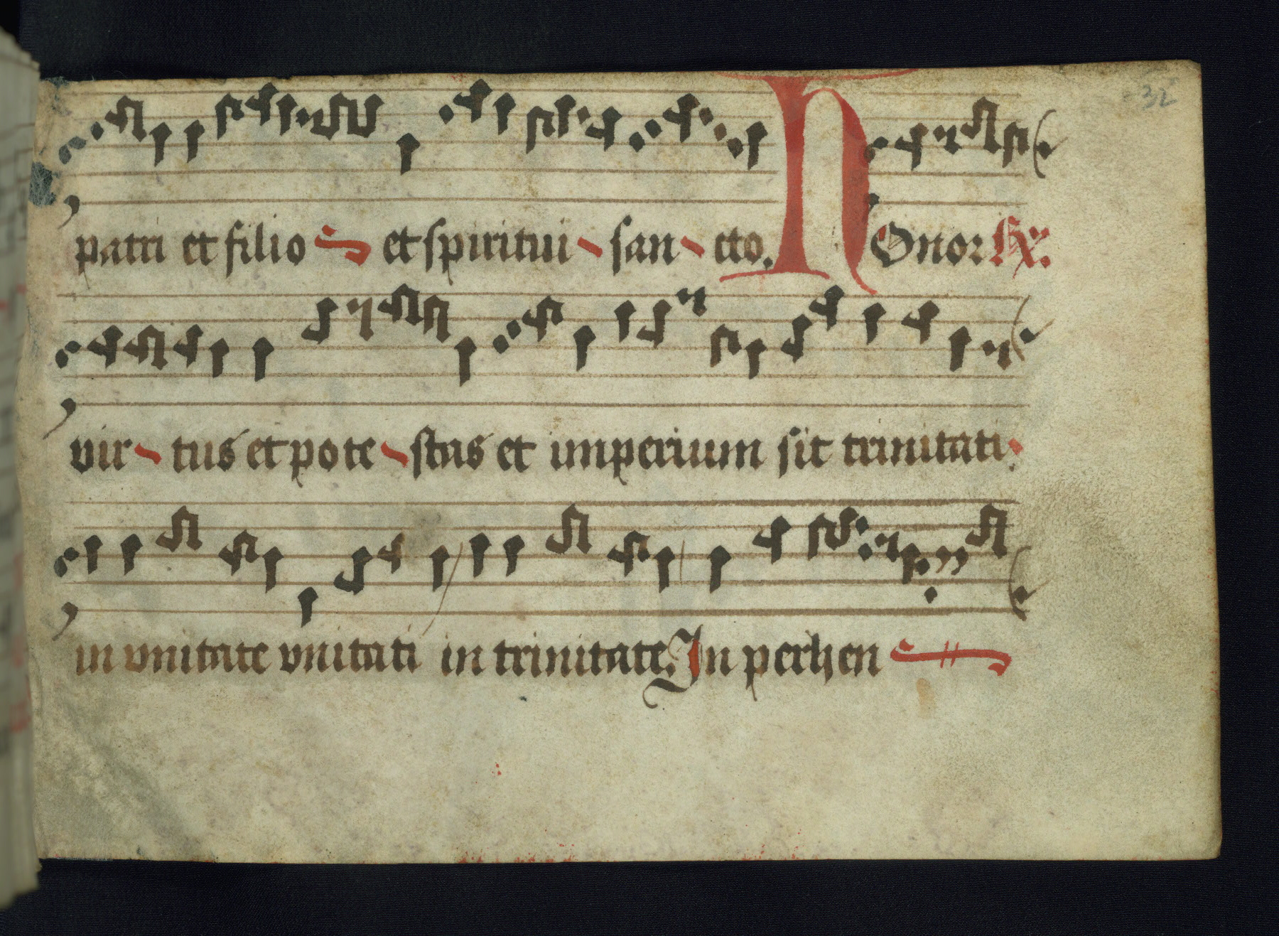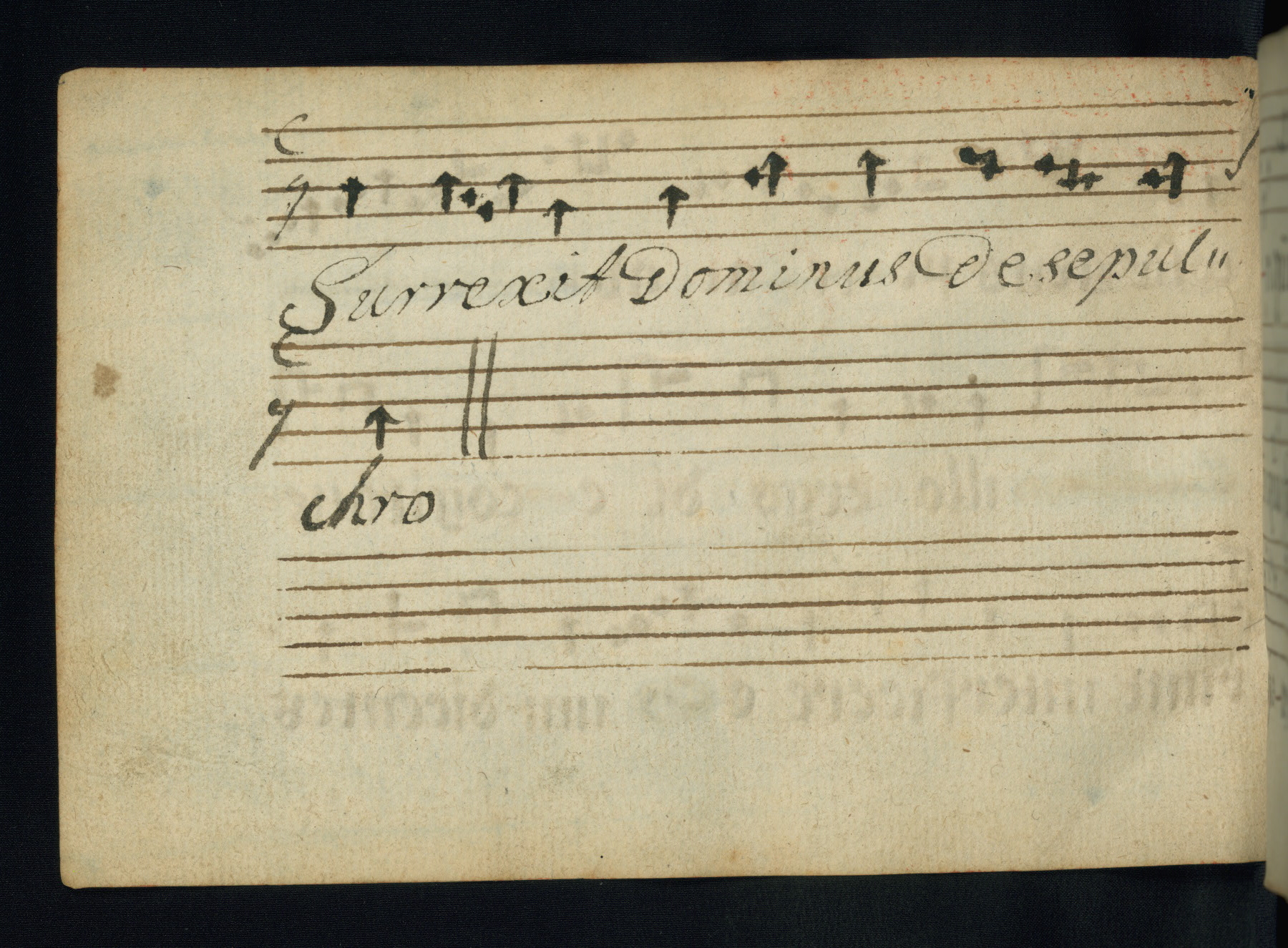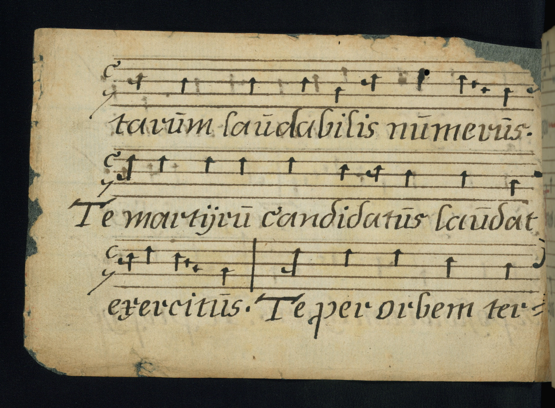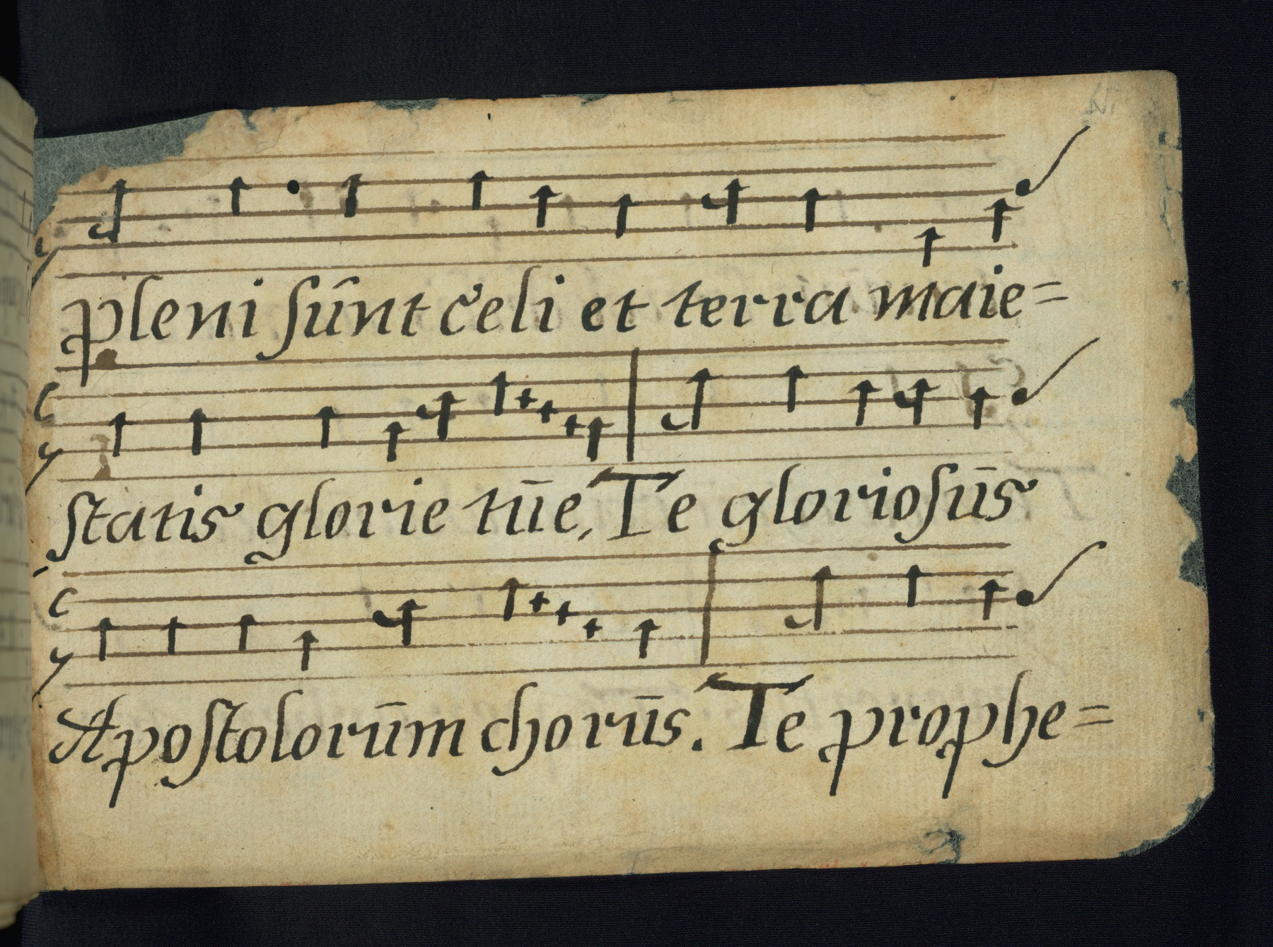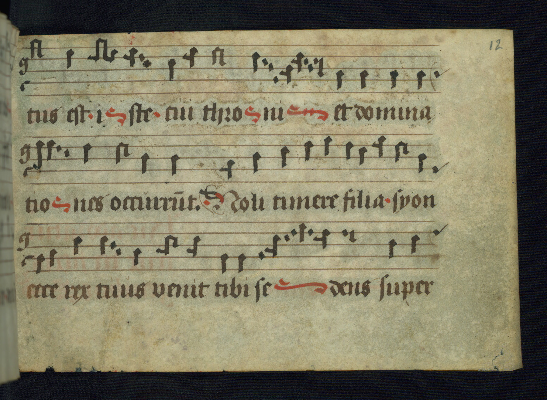 This manuscript contains liturgical music to be sung during processions. It is exceptional because of its "album" format (10 x 14.5 cm), which is in part the result of a severe cropping of the folios. The book was made in the late fifteenth or early sixteenth century in Germany. Its continued use is evident from the seventeenth- or eighteenth-century addition of paper folios containing prayers and music. Music is written in Gothic notation on three five-line staves per folio. The first folio is illuminated with a foliate initial for the Feast of the Purification of the Virgin.