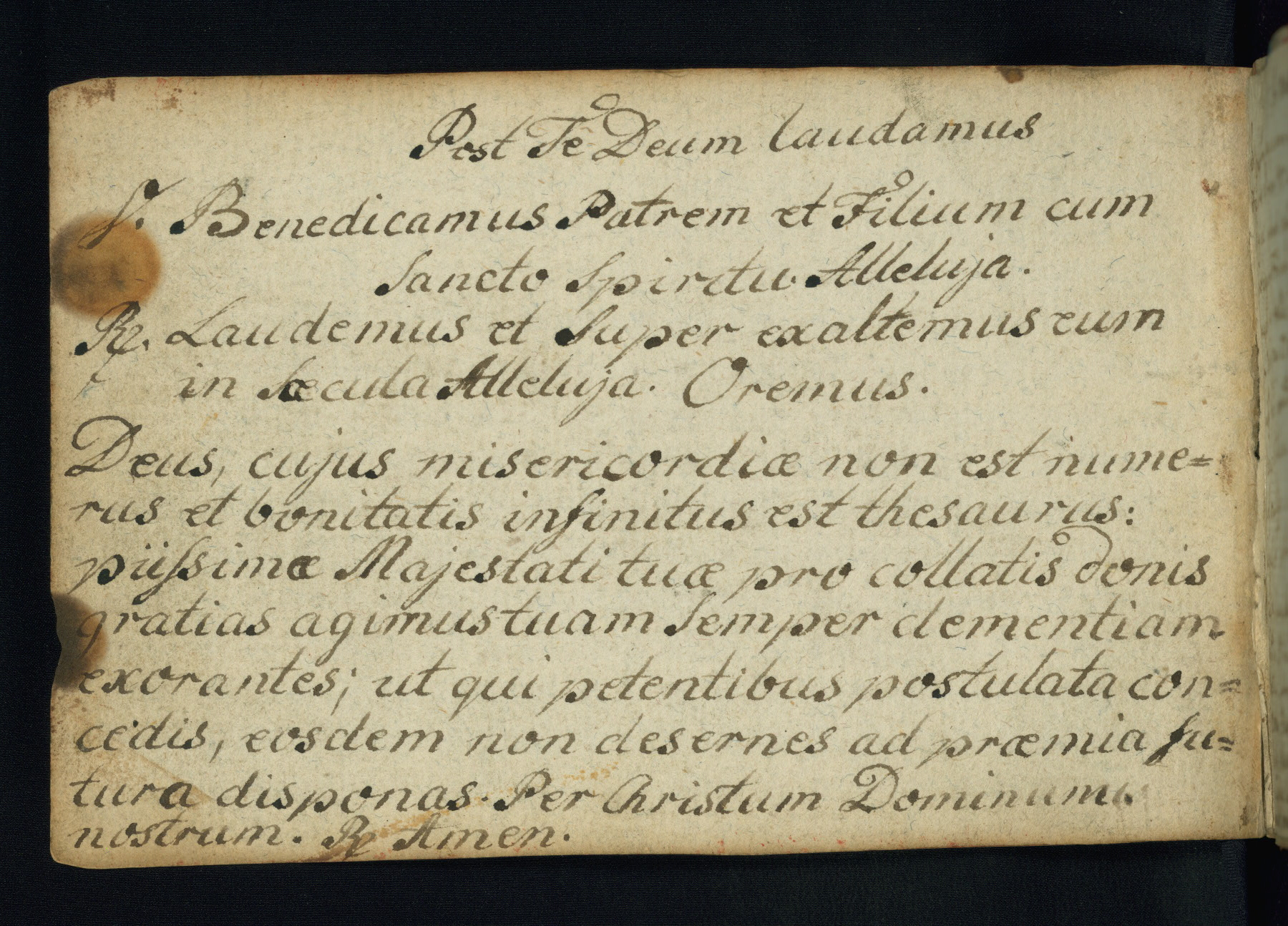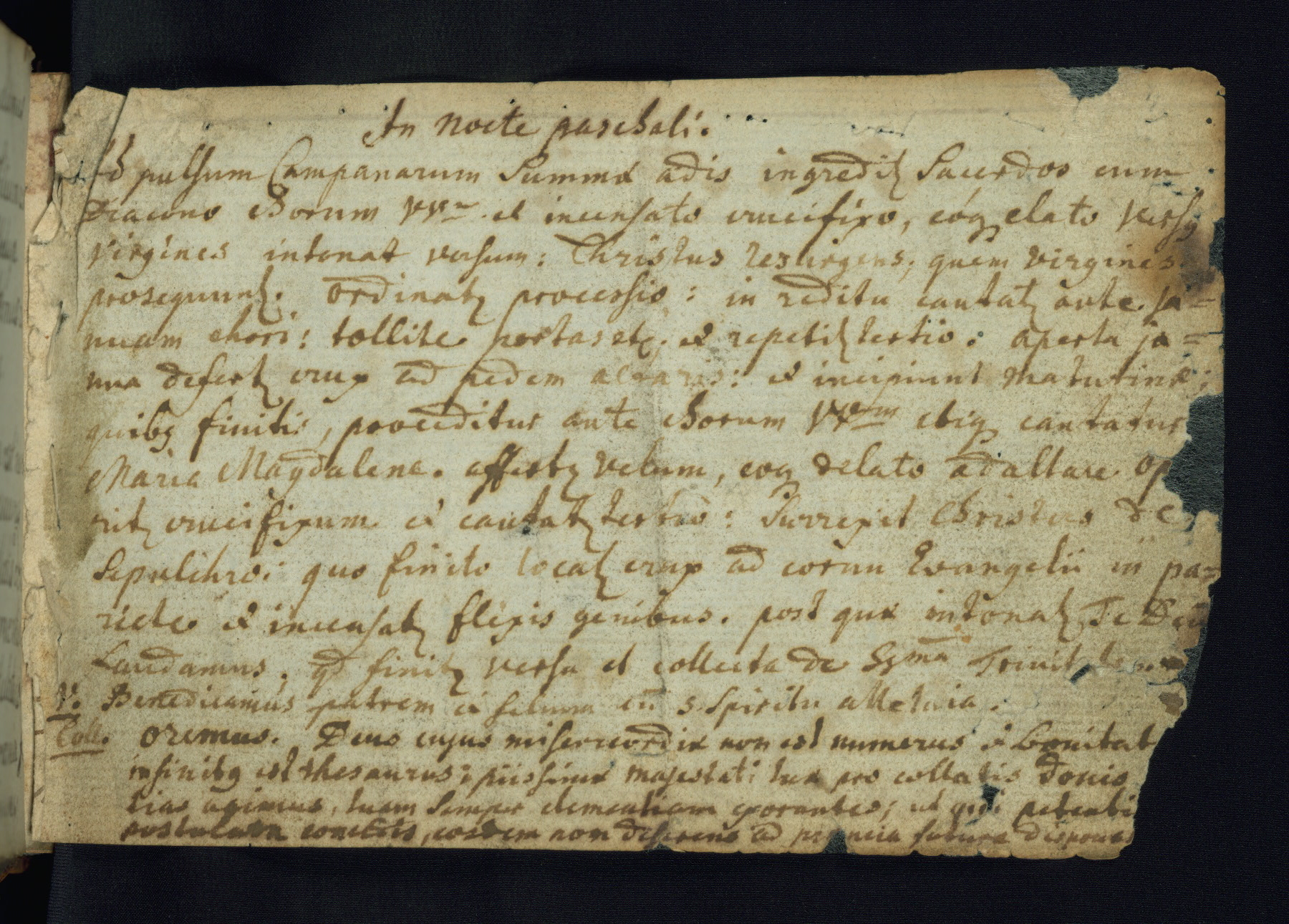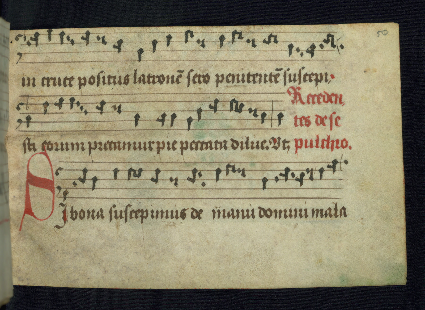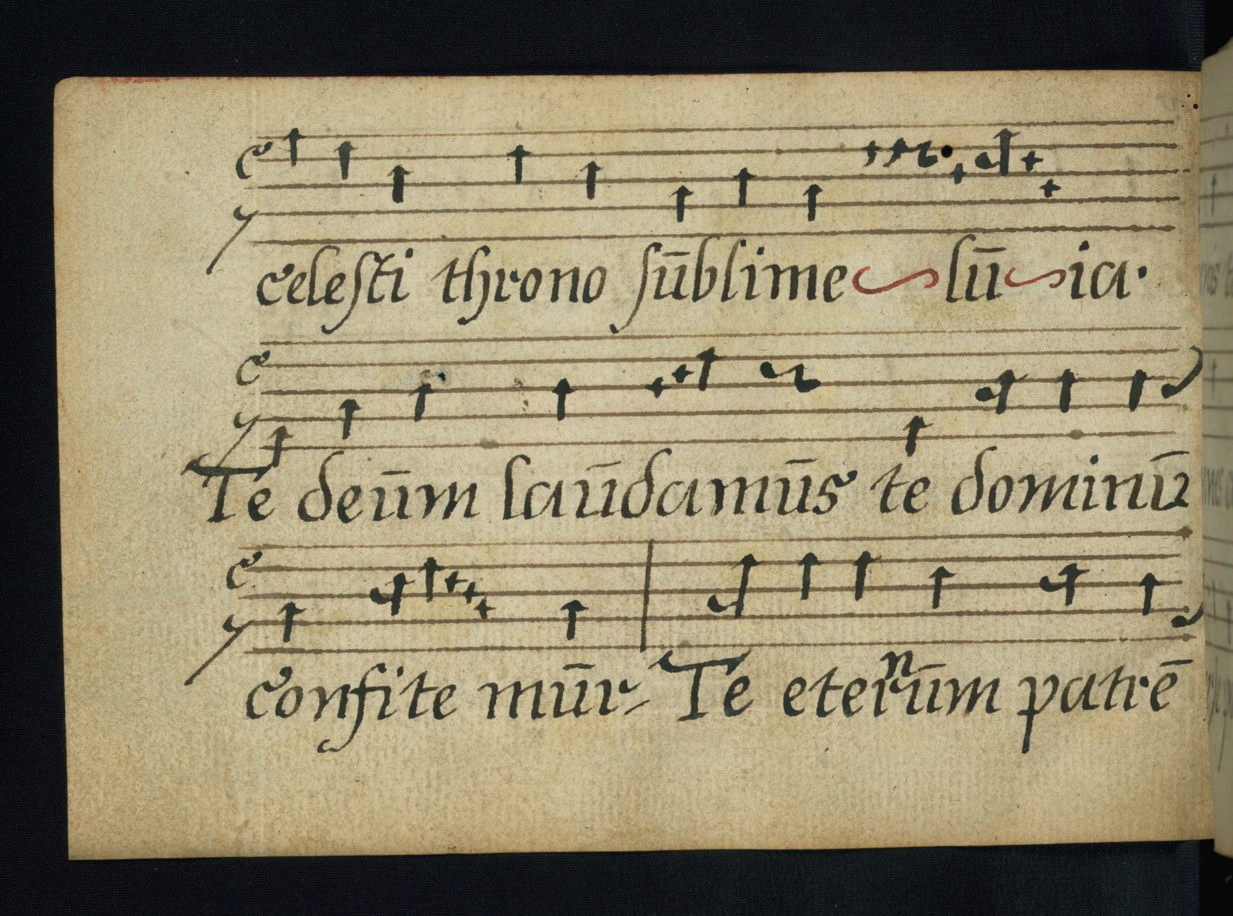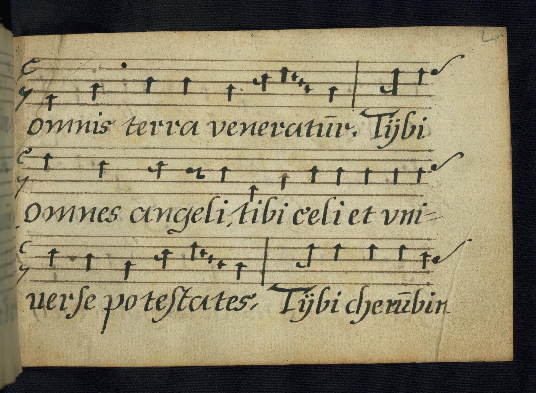 This manuscript contains liturgical music to be sung during processions. It is exceptional because of its "album" format (10 x 14.5 cm), which is in part the result of a severe cropping of the folios. The book was made in the late fifteenth or early sixteenth century in Germany. Its continued use is evident from the seventeenth- or eighteenth-century addition of paper folios containing prayers and music. Music is written in Gothic notation on three five-line staves per folio. The first folio is illuminated with a foliate initial for the Feast of the Purification of the Virgin.