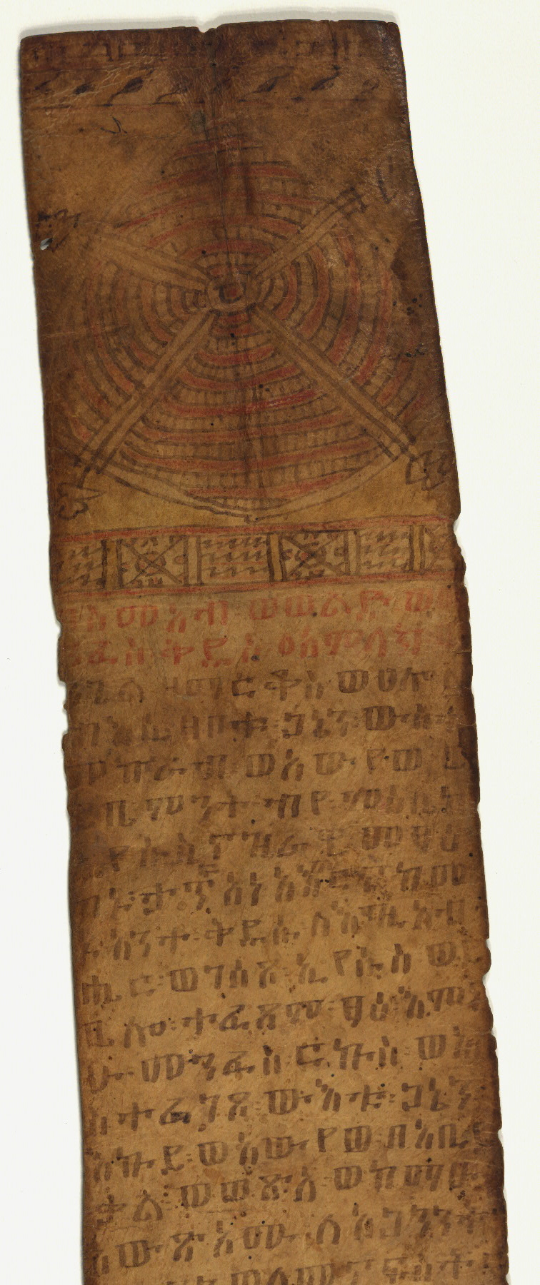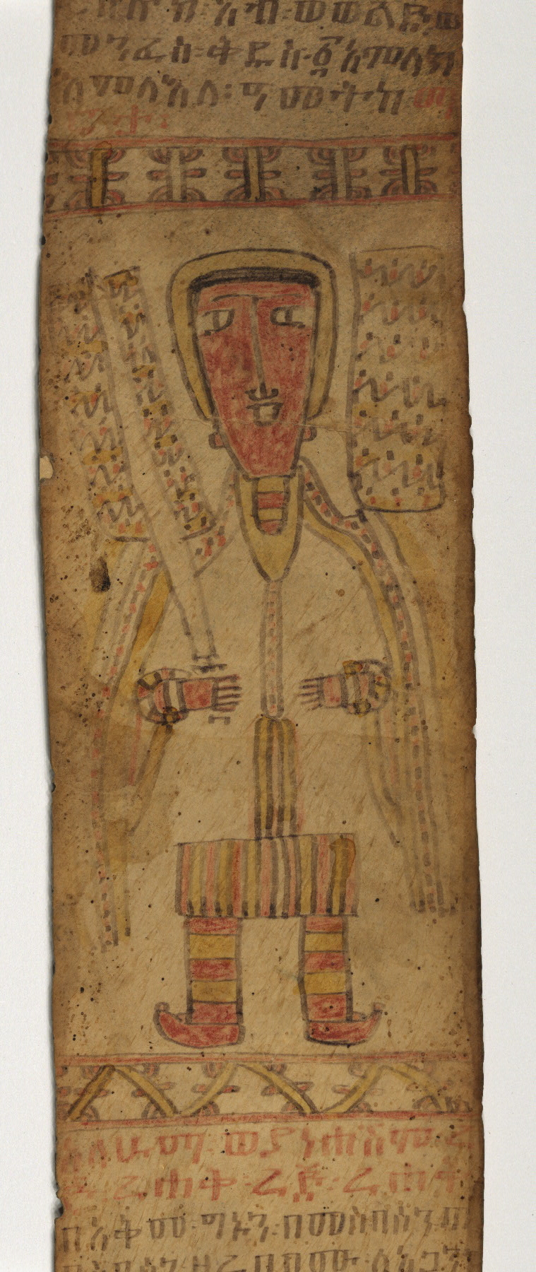 This scroll was created in the eighteenth century for a woman named Marta. Having once been possessed by a devil, she had this prayer scroll made as a way to ward off evil. Containing prayers against demons, as well as talismans and a depiction of a guardian angel (perhaps Phanuel, who is invoked in one of the prayers), the scroll was intended to be worn as an apotropaic device. Ethiopian prayer scrolls were made to be the length of the person who commissioned them, thereby protecting the owner from head to toe; this one is 165.7 cm, making Marta 5'5" tall.
