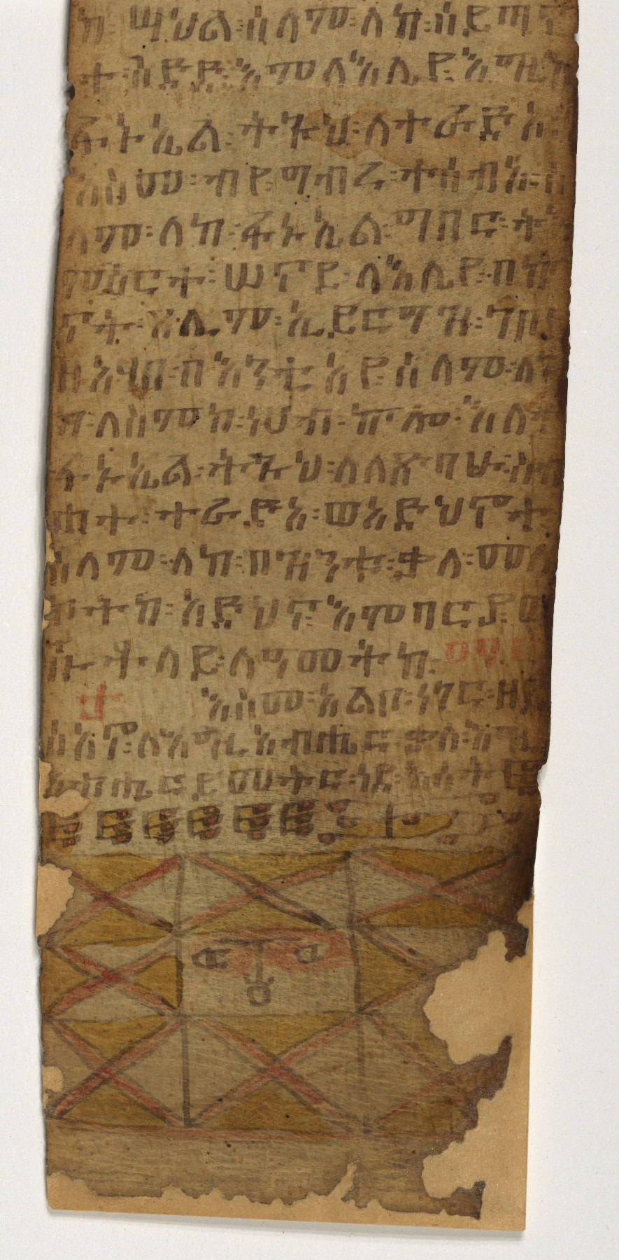 - Contents: Scroll contains a series of prayers, noted here by lines of text due to lack of folios; lines 1-18: Prayer to cast out demons, begins with quotation from Mark 1:23-27, incipit: በስመ፡ አብ፡ . . . [ወን]ጌል፡ ዘማርቆስ፡ ወሀሎ፡ ፩ብእሲ፡ ዘቦቱ፡ ጋኔን፡ . . . ; lines 19-63: Prayer against evil eye, includes the story of the Sea of Tiberia, incipit: ጸሎተ፡ ነደራ፡ ለዓይነተ፡ ምድር፡ ወእንዘ፡ የሐውር፡ እግዚእነ፡ ውስተ፡ ባሕረ፡ጥብርያዶስ፡ . . .and concludes with the secret names, asmat, found in the Homiliary, Dǝrsan, of the Archangel Michael, አክሶ፡ አሜአሌኪ፡ ኤንካዕ፡ . . .; lines 63-80: Prayer to cast out demons, incipit: በስመ፡ አብ፡ . . . አልፋ፡ አልፋ፡ አልፋ፡ ፃዕ፡ ፃዕ፡ ወፂዓከ፡ ኢትግባዕ፡ ይቤለከ፡ እግዚአብሔር፡ ወዝክረ፡ ስምከ፡ ይደምሰስ፡ ለዓለመ፡ ዓለም፡ አሜን፡ ያቁ፡ ወያቁ፡ አንተ፡ ሰይጣን፡ ወአንተ፡ ጋኔን፡ አንተ፡ ባርያ፡ ወአንተ፡ ትግሪዳ፡ አንተ፡ ነገርጋር፡ ዘትትመሰል፡ በብዚኅ፡ እፆታ፡ (sic) አህያ፡ ሸራህያ፡ . . .; lines 81-98: prayer for catching and binding demons, with the asmat of Solomon and some Arabic words in transliteration, incipit: አላሁማ፡ ወያነሐሽም፡ [. . .]ረሐቅ፡ ረጅ፡ ረሐቅ፡ በአቅመ፡ ግኑን፡ በመስበሶን፡ ወነስበሶን፡ ዘረበቦሙ፡ ለአጋንንት፡ ሎፍሐም፡ እስሮሙ በዝንቱ፡ አስማት፡ ወበዝንቱ፡ ቃላት፡ . . . ; lines 98-118: prayer for driving way demons, using the names (asmat) of the Homiliary, Dǝrsan, of the Archangel Michael, and of the cross, incipit: በስመ፡ አብ፡ . . . አዶናይ፡ ፔካ፡ ጼካ፡ ቤቃ፡ ተሰደድ፡ አንተ፡ ባርያ፡ ወአንተ፡ ጋኔን፡ . . . አውገዝኩከ፡ አንተ፡ ባርያ፡ በሳዶር፡ አላጎር፡ ዳናት፡ ስዴራ፡ ሮዳስ፡ . . .; lines 118-156: the Mystagogia, Tǝmǝhǝrtä Ḫǝbu’at, and the Salutation, Sälam, to the Archangel Phanuel, used as prayers to drive away demons; (lines 118-131) the Mystagogia, incipit: በእንተ፡ ትምህርተ፡ ሕቡአት፡ ቅድመ፡ ዘትትነገር፡ እምጵርስፎራ፡ ለምእመናን፡ . . .; (lines 131-155) the Salutation, Sälam, to the Archangel Phanuel, incipit: ሰላም፡ ለከ፡ ሰዳዴ፡ አጋንንት፡ ፋኑኤል፡ ለእግዚአብሔር፡ እምጽርሑ፡ . . .