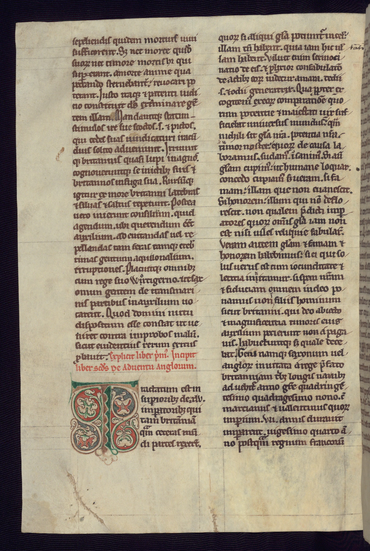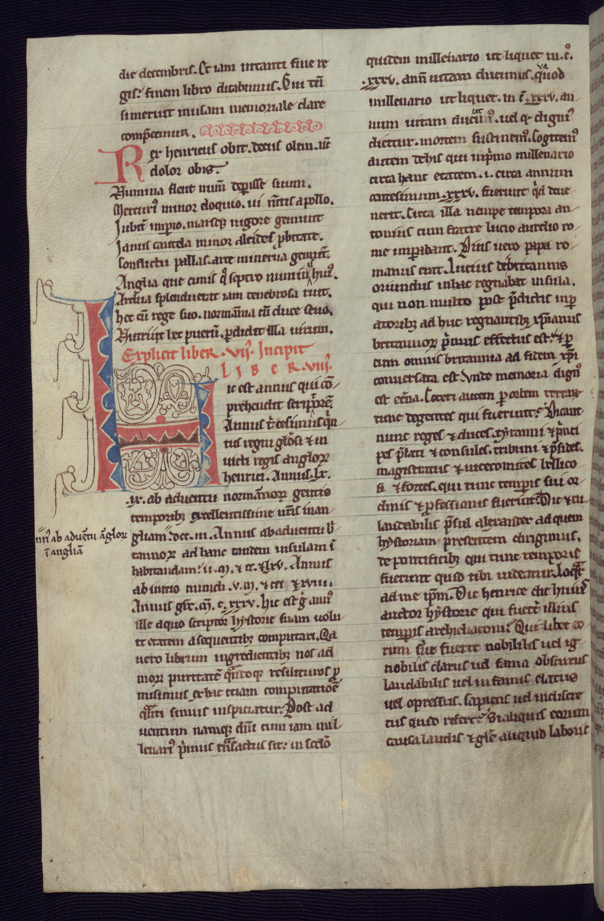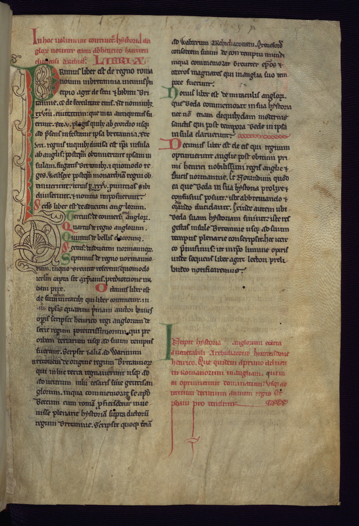 - Rubric: Incipit hystoria anglorum edita a venerabili archidiacono huntendone henrico. Que quidem a primo adventu romanorum in angliam. qui in ea optinuerunt dominatum: usque ad tercium decimum annum regis stephani pro tenditur