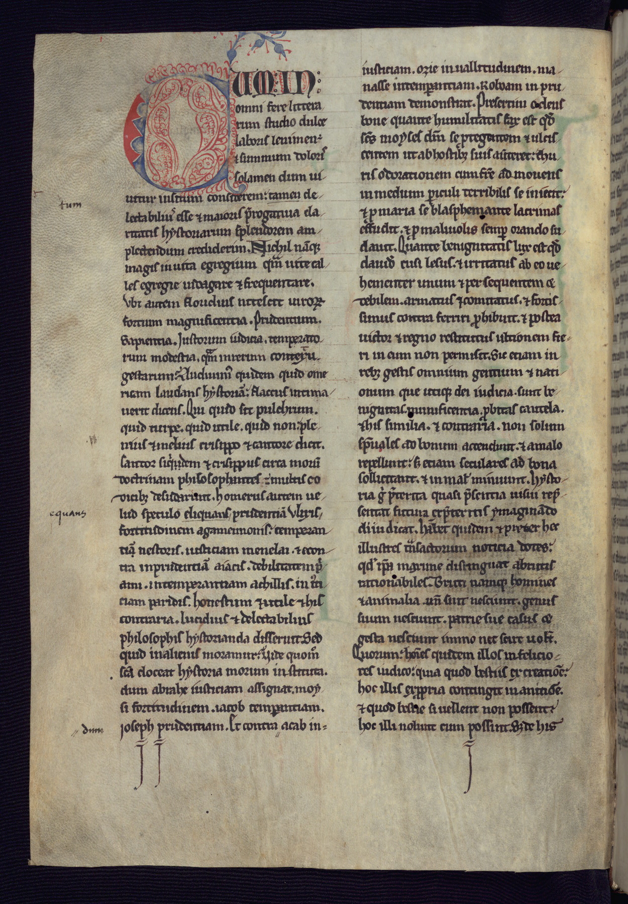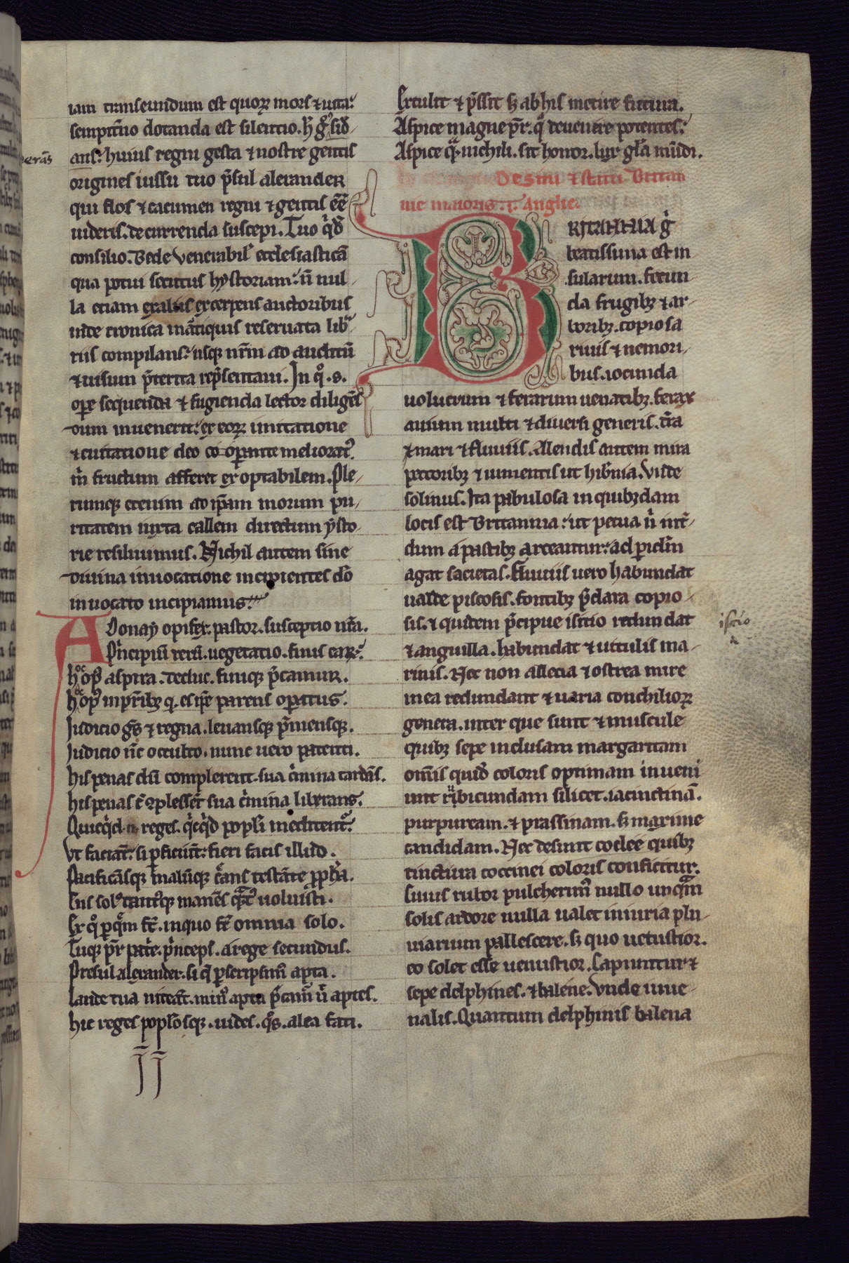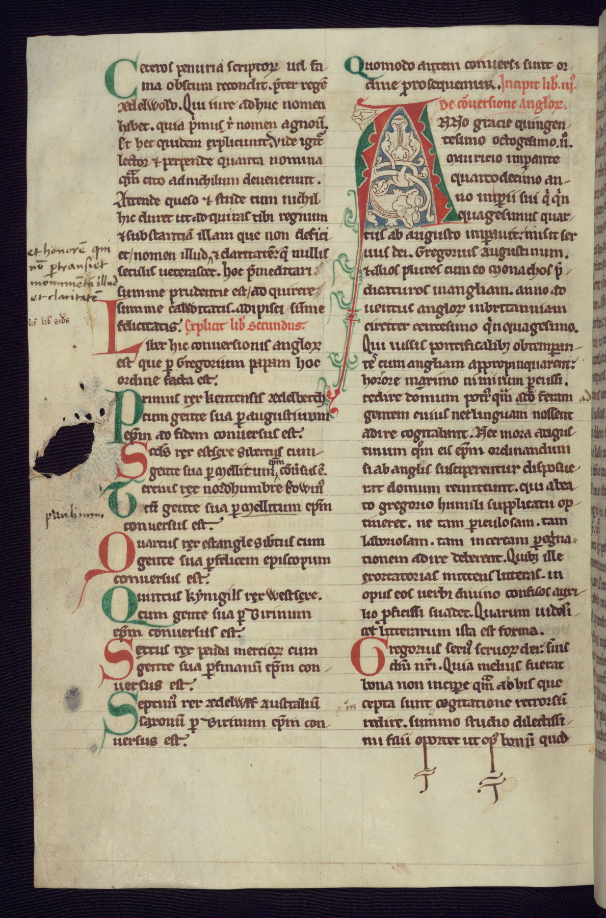 - Decoration note: Large initials (6 to 7 lines) at the beginning of major text divisions (Preface, Prologue, Books 1-3, 7, 8) in red, blue, and green ink filled with foliage and calligraphic flourishes ending in hairpin loops; red initials with green pen flourishes (2-3 lines); lower line text with decorative descenders (4 to 11 lines); brown ink drawing (fol. 105r); Nigel Morgan suggests that the artist of the line drawing is also responsible for a Bestiary, Cambridge, University Library Ms. Ii.4.26, and the Guthlac Roll, London, British Library Harley Ms. Roll Y.6.
