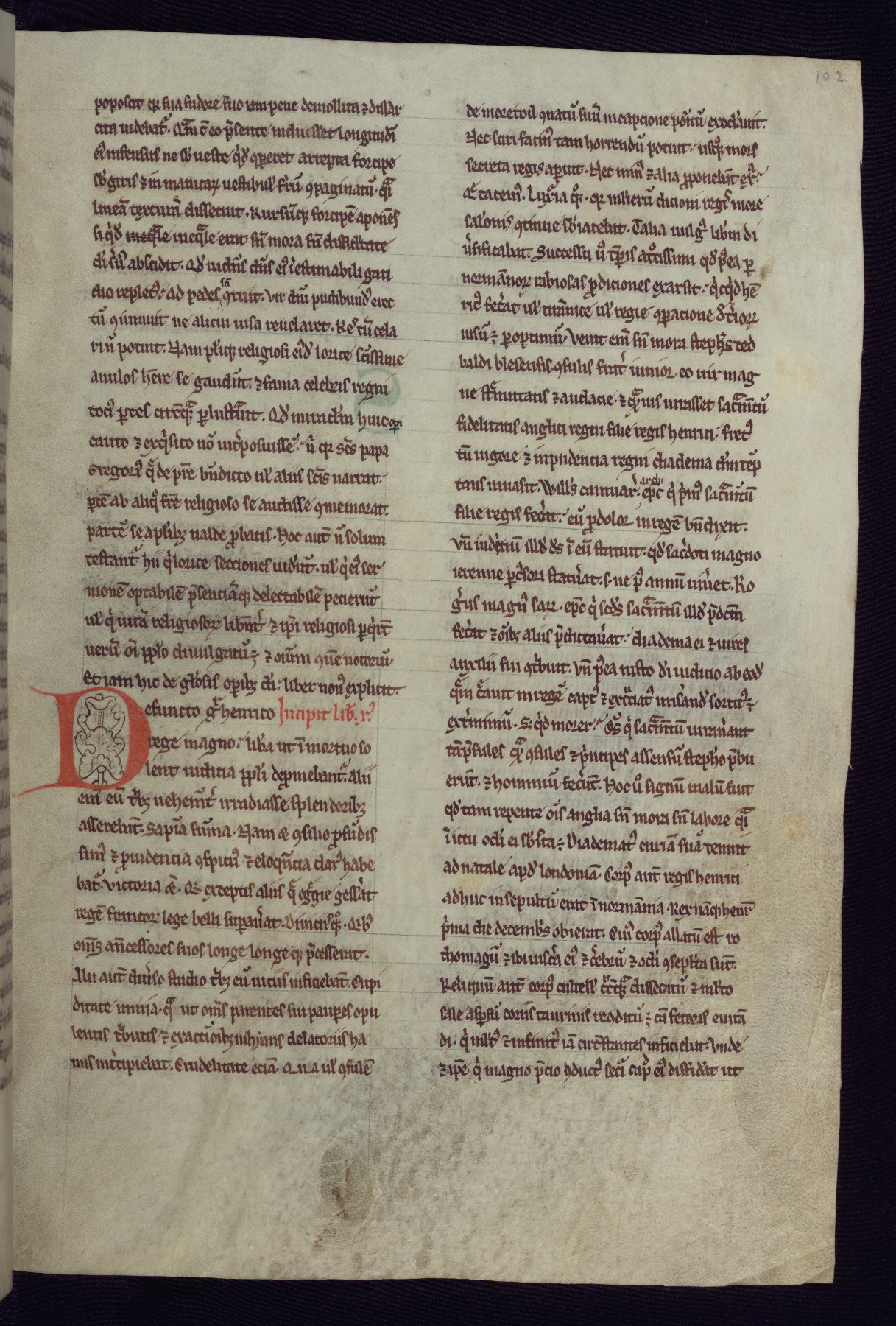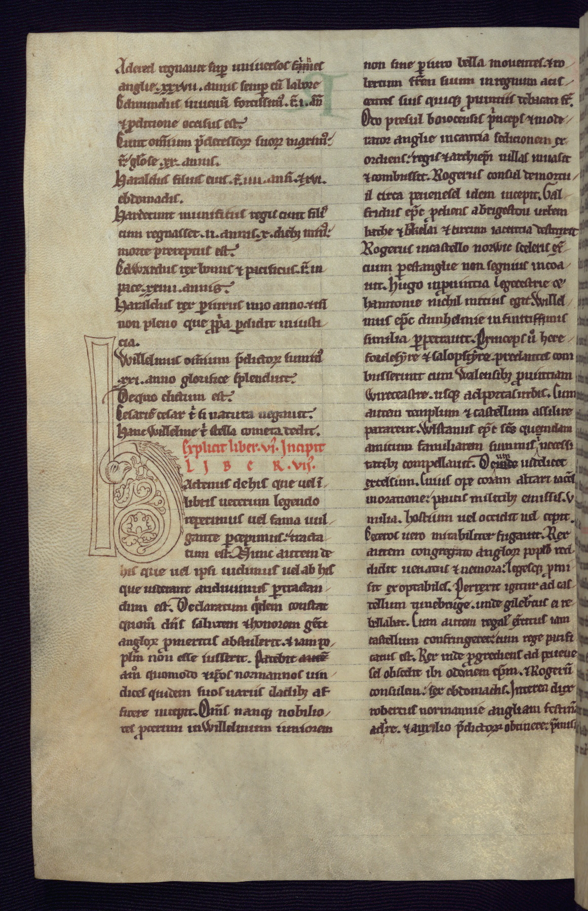- Contents: Incomplete; two leaves from quire VIII are absent (between fols. 73 and 74 and between fols. 75 and 76); text comprises a Preface (fol. 1r), Prologue addressed to Bishop Alexander of Lincoln (fols. 1v-2r), Book 1 (fols. 2r-13v), Book 2 (fols. 13v-23v), Book 3 (fols. 23v-37r), Book 4 (fols. 37r-47r), Book 5 (fols. 47r-57v), Book 6 (fols. 57v-68v), Book 7 (fols. 68v-77v), Book 8 (fols. 77v-93r), Book 9 (fols. 93r-102r), Book 10 (fols. 102r-107v), letters to Henry I (fol. 78v-86r), Warinus (fol. 86r-89v), and Walter, Archdeacon of Oxford (fol. 89v-93r); contemporary corrections and annotations in red or brown ink including two registers of English kings: one in the margins (fols. 106v-107v) and one added to the text block (fol. 107v); later corrections, annotations, and marginal pointing hand sketches in brown ink; main text probably copied from a manuscript containing the same text in the British Library (Arundel MS 48)