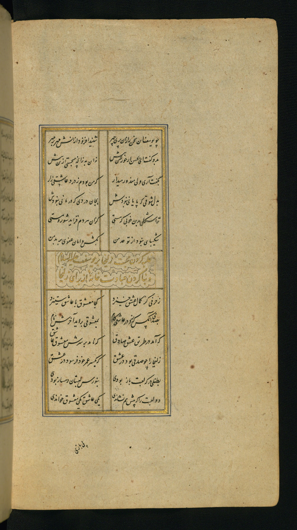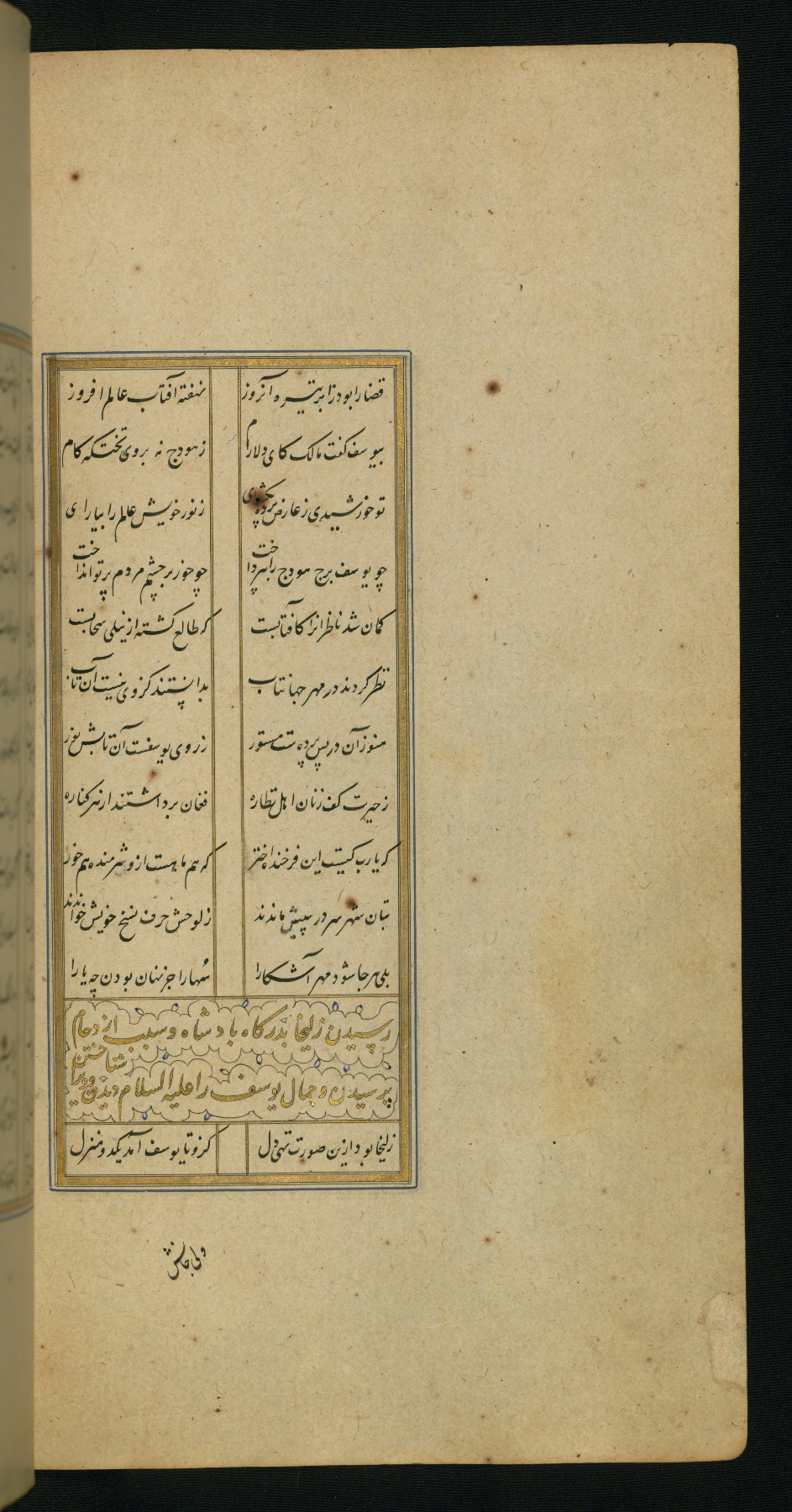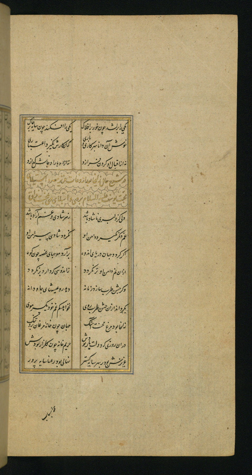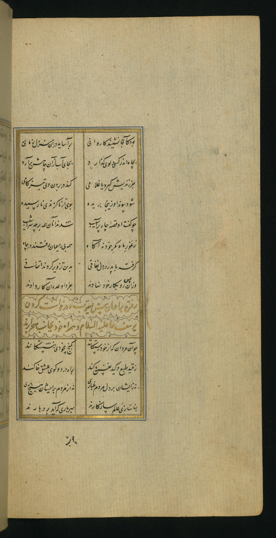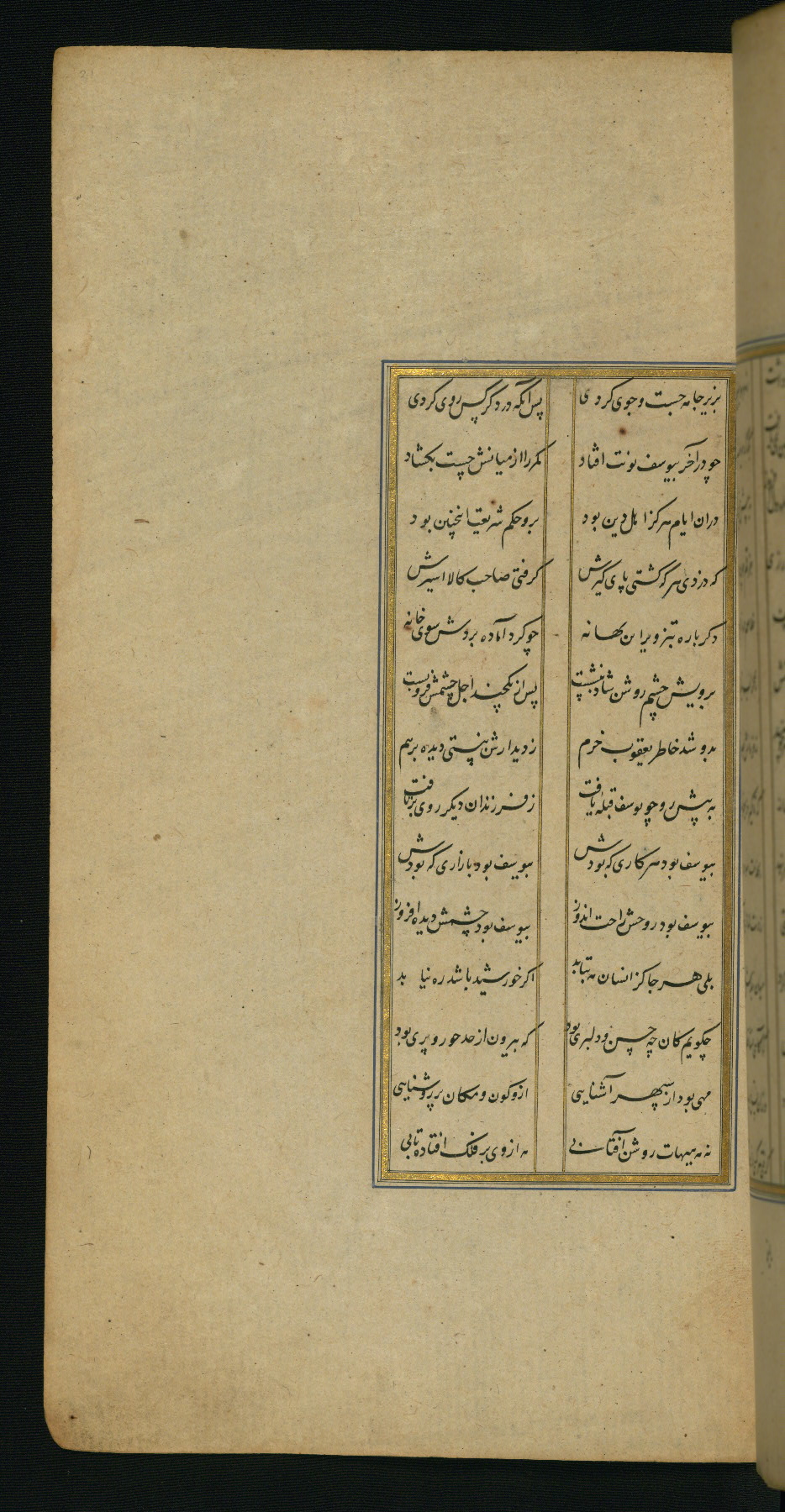 This is an illustrated and illuminated Safavid copy of Joseph (Yūsuf) and Zulaykhā by Nūr al-Dīn Jāmī (d. 898 AH / 1492 CE), executed in Iran in the early tenth century AH / sixteenth CE. The codex opens with a double-page illuminated incipit (fols. 1b-2a) containing the first verses of the work, the title, and the author's name. There are eight paintings illustrating the text. The binding is slightly later than the manuscript.