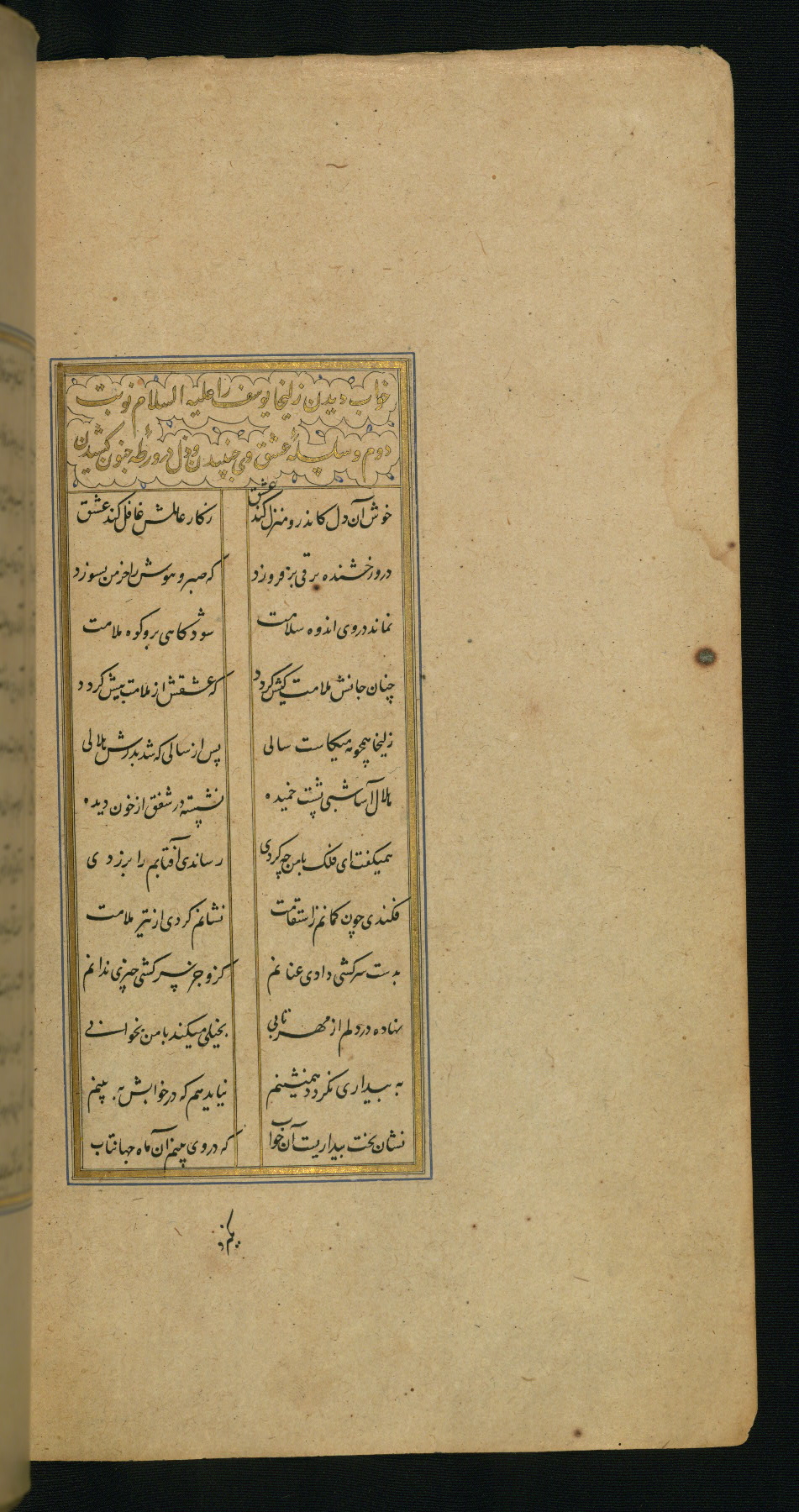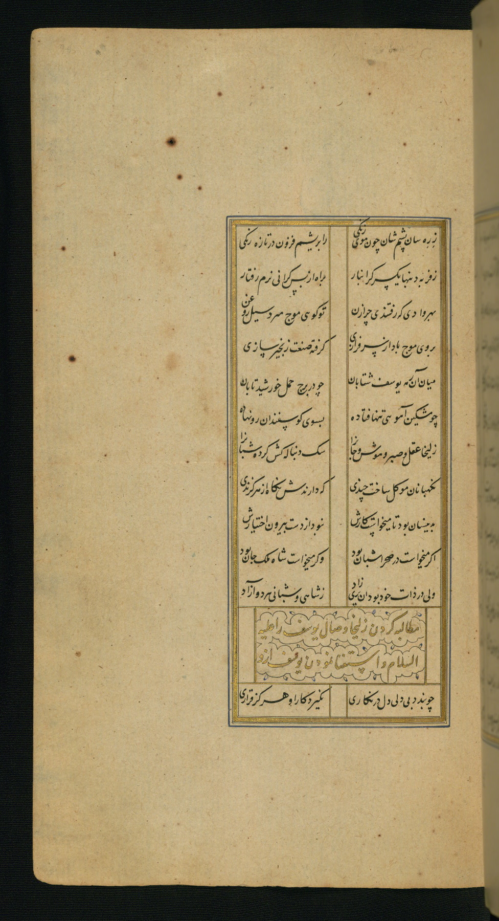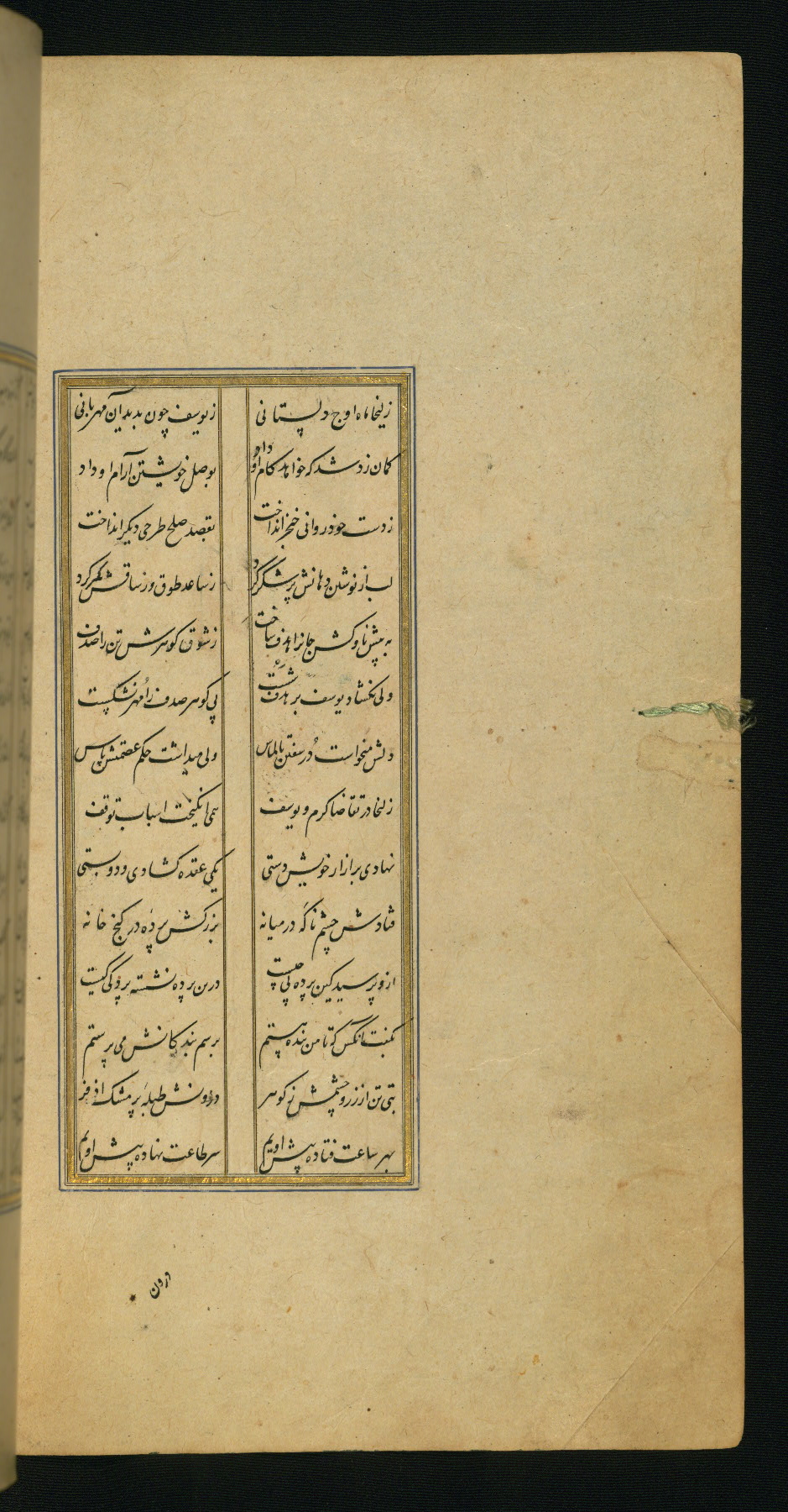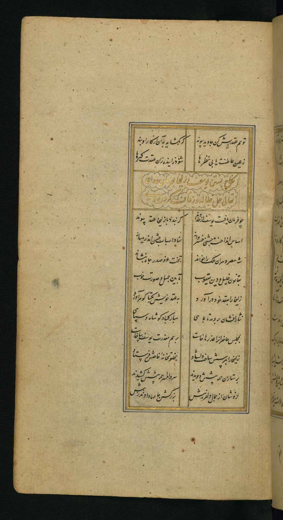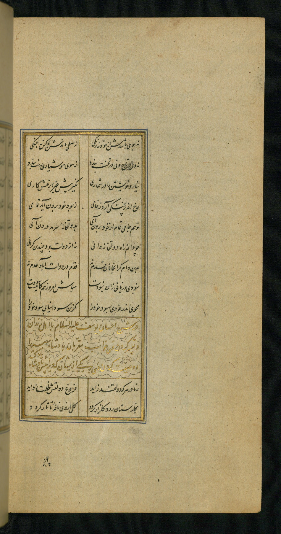 This is an illustrated and illuminated Safavid copy of Joseph (Yūsuf) and Zulaykhā by Nūr al-Dīn Jāmī (d. 898 AH / 1492 CE), executed in Iran in the early tenth century AH / sixteenth CE. The codex opens with a double-page illuminated incipit (fols. 1b-2a) containing the first verses of the work, the title, and the author's name. There are eight paintings illustrating the text. The binding is slightly later than the manuscript.